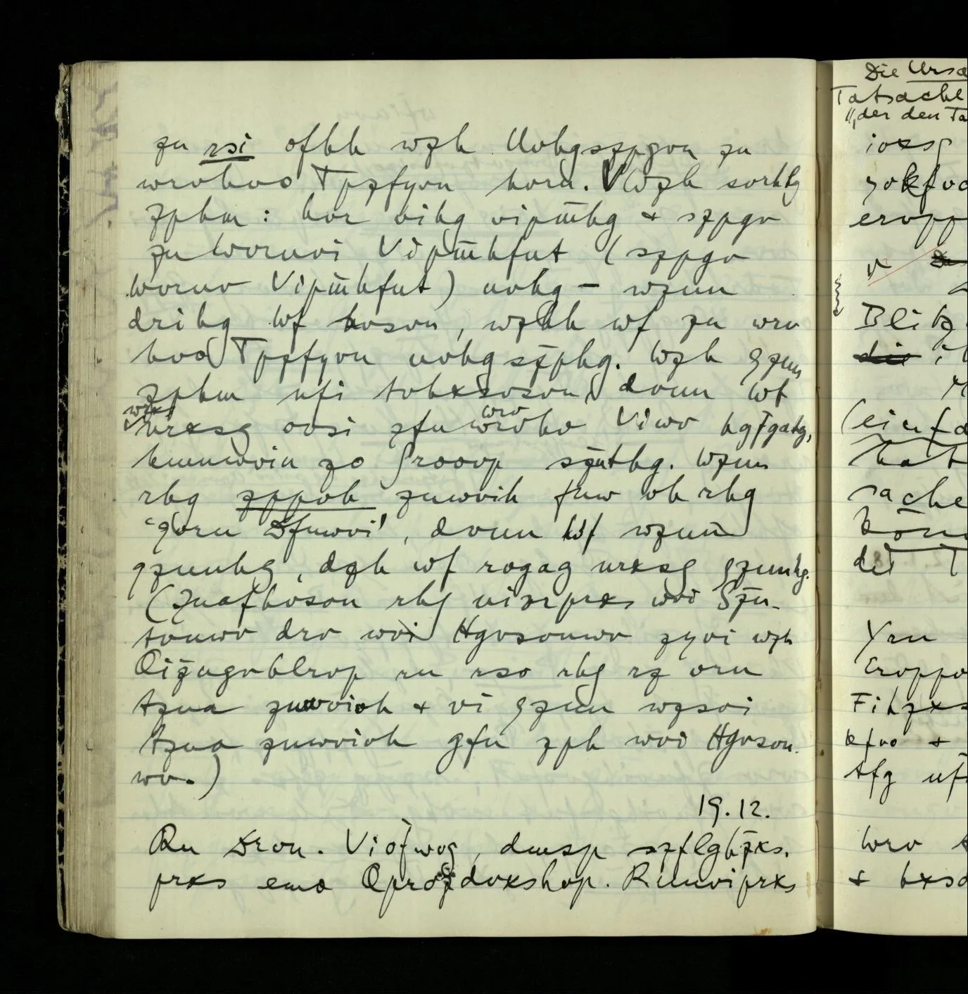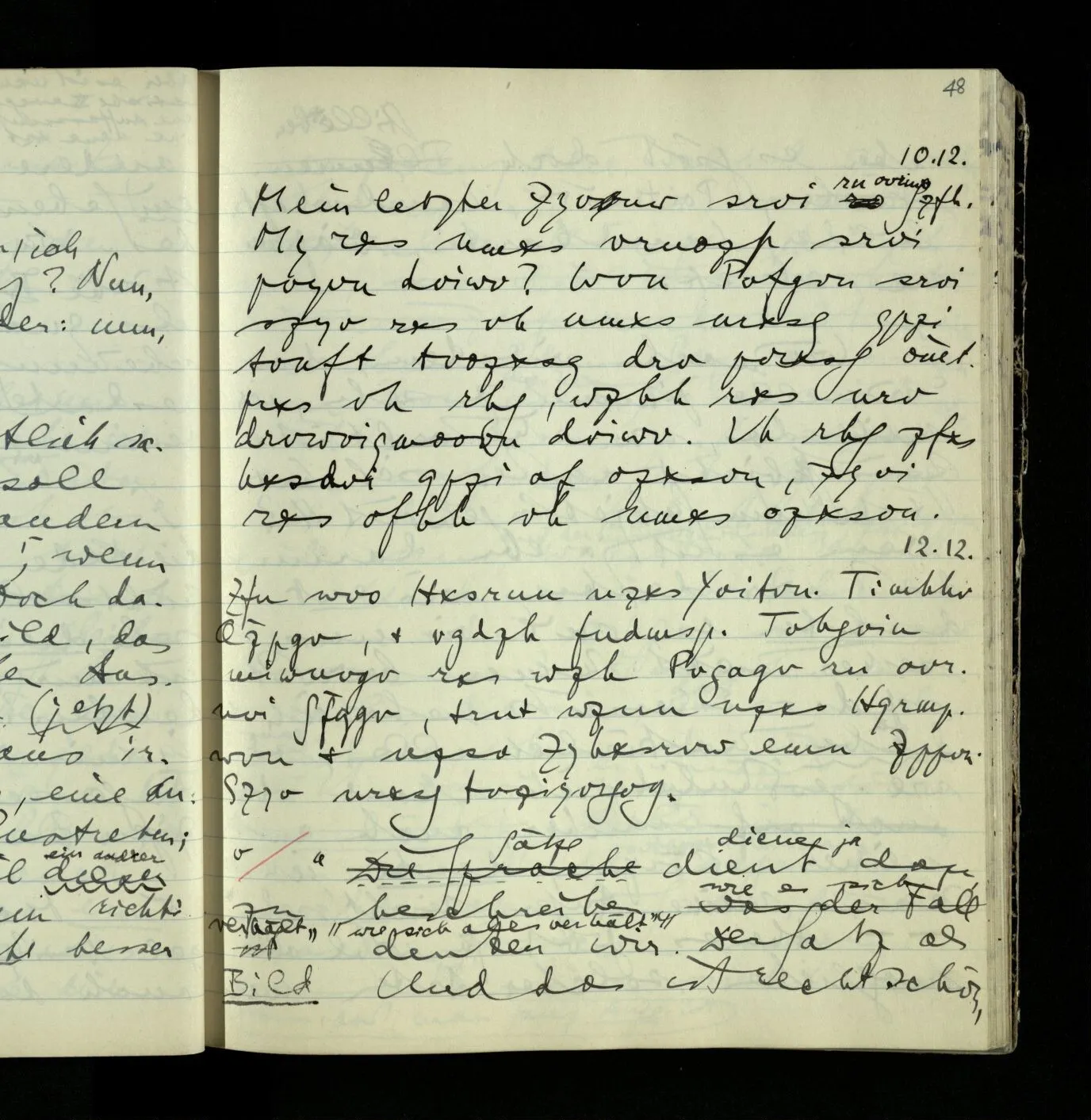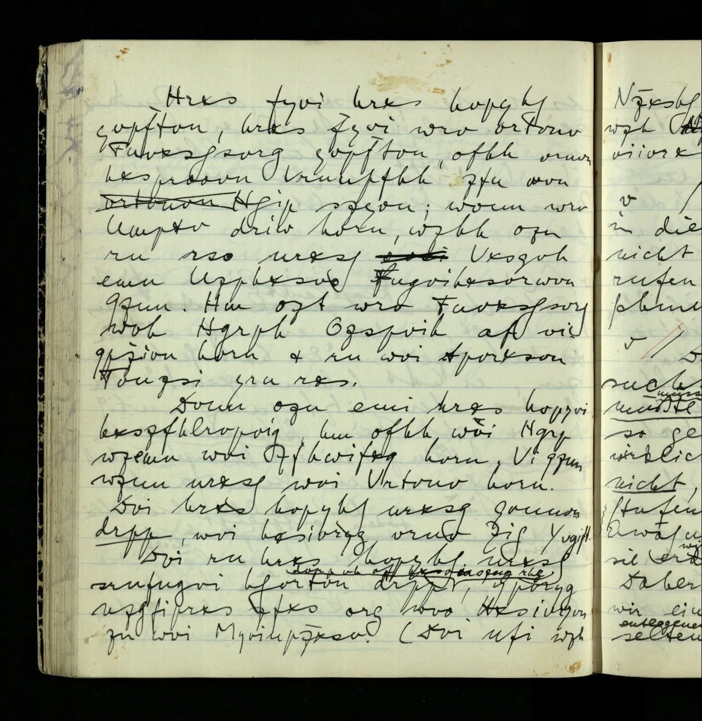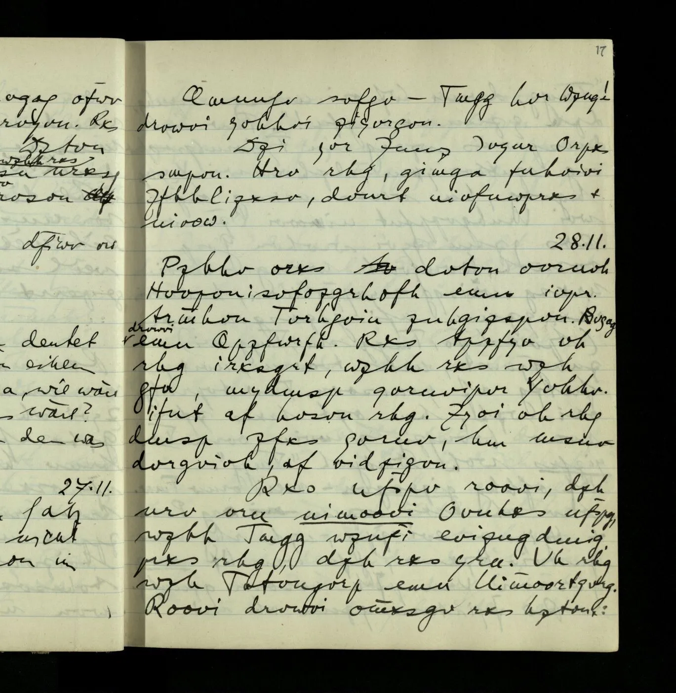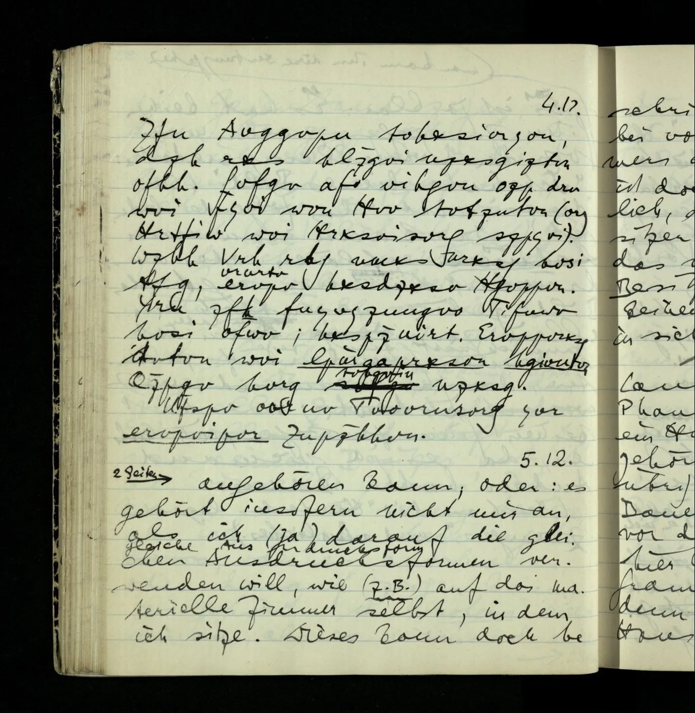20.11.1937 Bin durch die Sache mit Anna Rebni beunruhigt. (Bei den Eintragungen in das Tagebuch denke ich oft, ob das auch ein gutes Licht auf mich werfen wird.) Bin, auf einen Einfall hin, zu Anna Rebni gegangen& habe ihr einige Kuchen mitgebracht. Ich sagte ihr, daß ich Friede mit ihr haben wolle; & noch einiges Andre. Wir gingen – gut auseinander. – Fühle mich nicht zur Arbeit fähig. Meine Gedanken sind in dieser Richtung wie ausgelöscht. Ob das vorübergehend ist oder auf lange Zeit – oder ganz – weiß ich nicht.