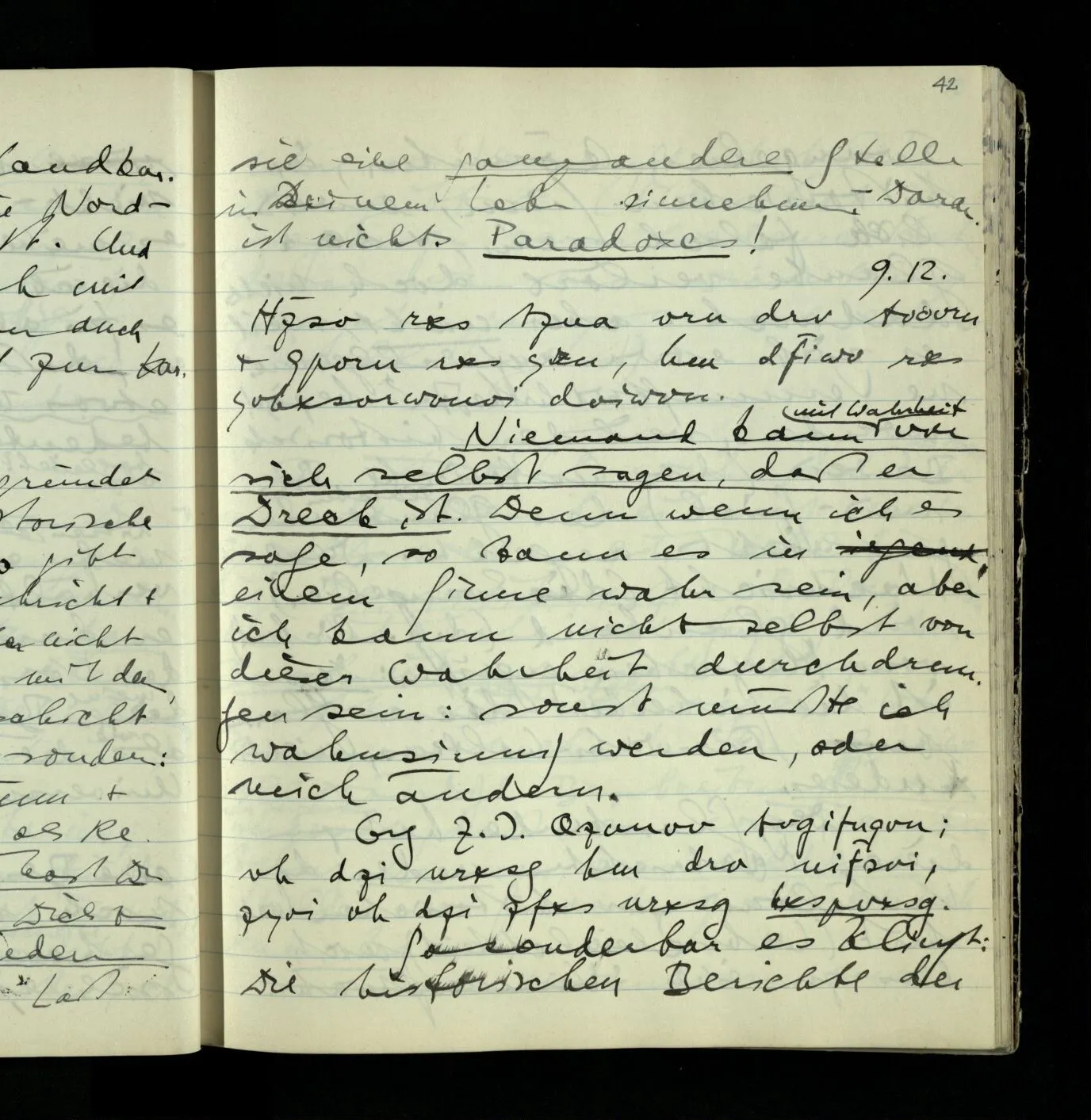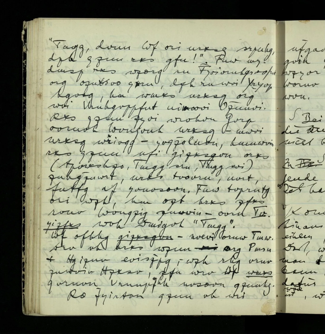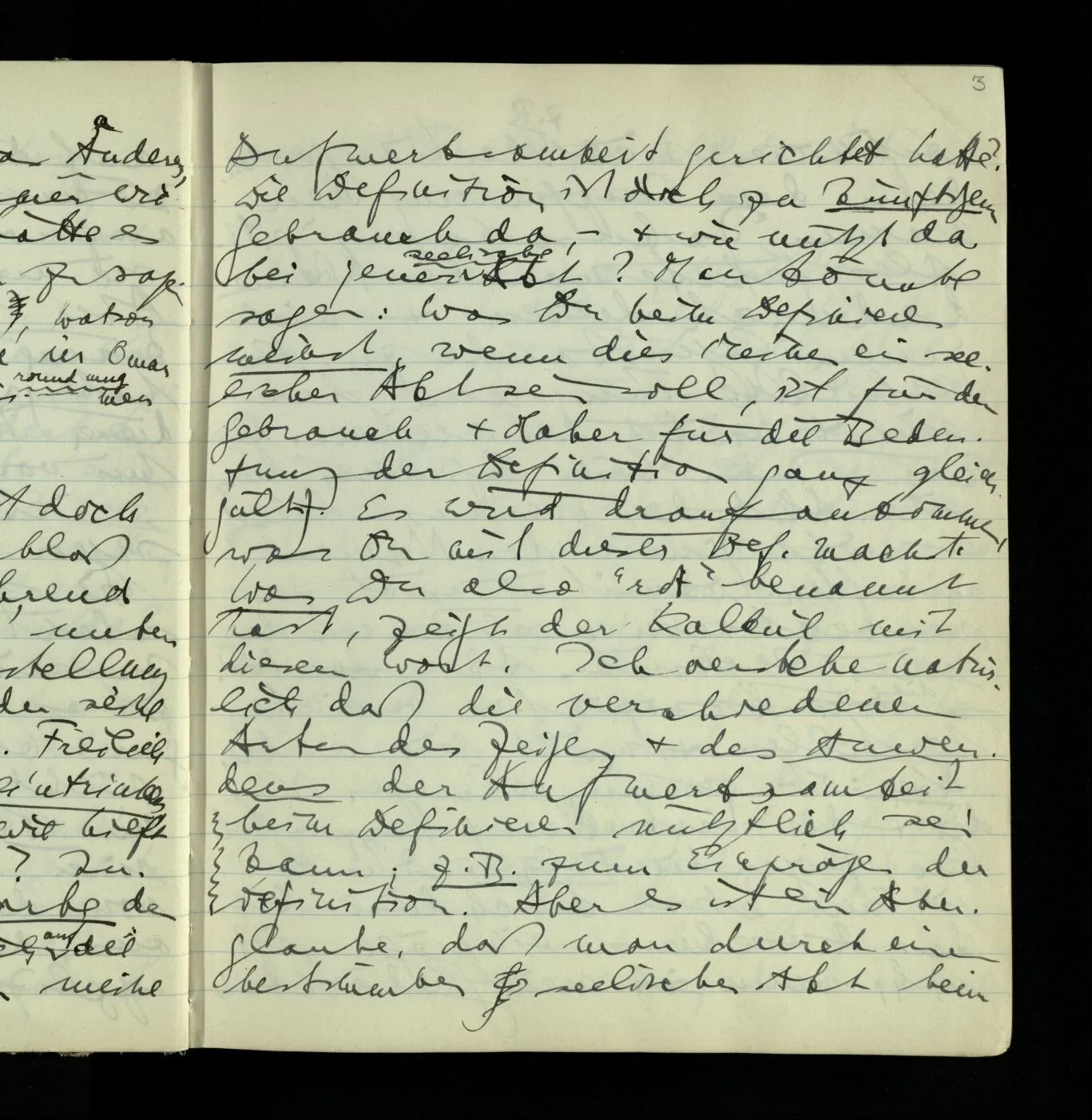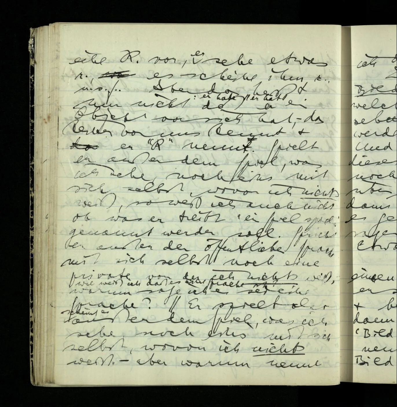 20.11.1937 Bin durch die Sache mit Anna Rebni beunruhigt. (Bei den Eintragungen in das Tagebuch denke ich oft, ob das auch ein gutes Licht auf mich werfen wird.) Bin, auf einen Einfall hin, zu Anna Rebni gegangen& habe ihr einige Kuchen mitgebracht. Ich sagte ihr, daß ich Friede mit ihr haben wolle; & noch einiges Andre. Wir gingen – gut auseinander. – Fühle mich nicht zur Arbeit fähig. Meine Gedanken sind in dieser Richtung wie ausgelöscht. Ob das vorübergehend ist oder auf lange Zeit – oder ganz – weiß ich nicht.