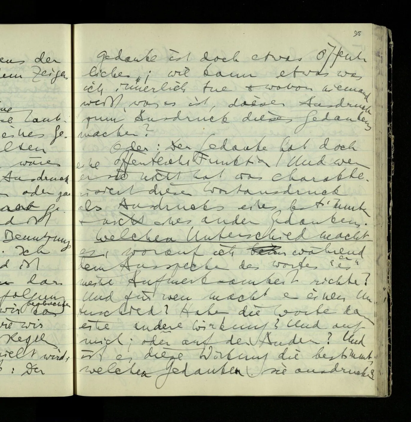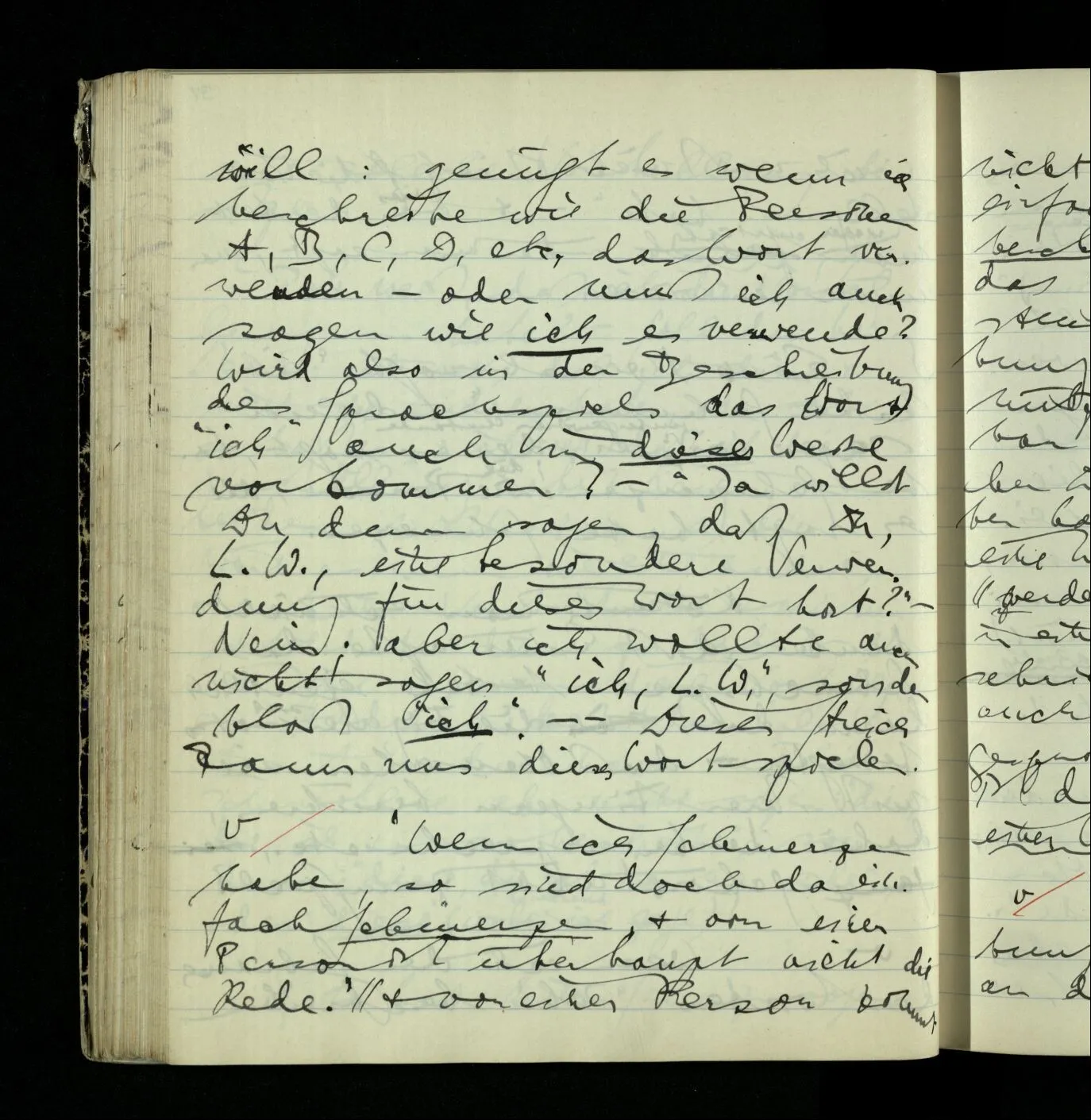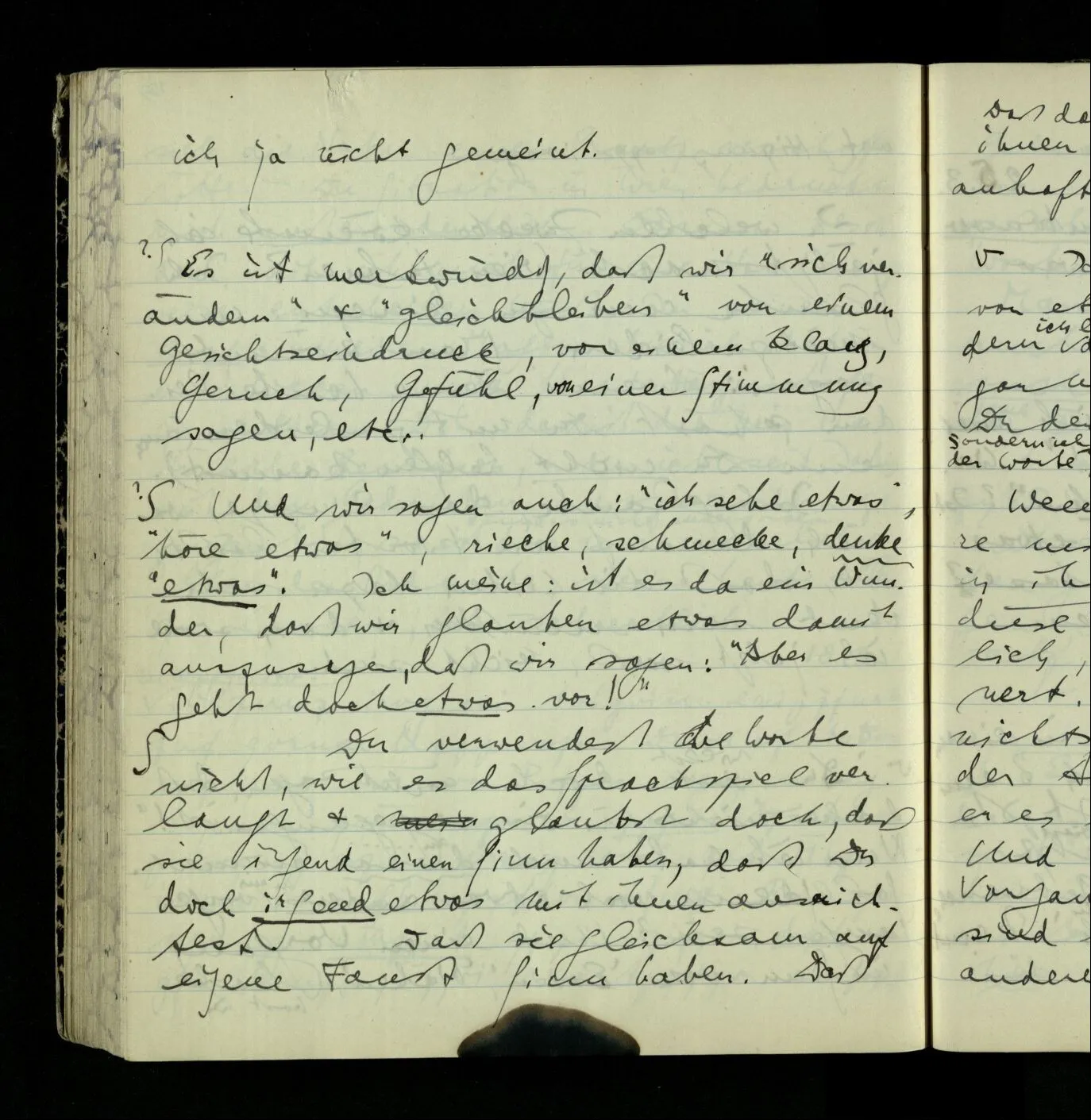 Und, wenn ich sage: “Ich habe ein Erinnerungsbild vor mir” – wie weißt Du, was ich erlebe? Du kannst ja – wie man sagt – nicht in mich hineinschauen (das kann nur ich). Aber erinnere Dich, wie ich & Du dies Wort haben gebrauchen lernen! Also mache ich mir wohl eigentlich nur selbst eine Mitteilung nicht dem Andern. Aber wie teilt es mir etwas mit, bei oder nach einem Erlebnis Laute auszustoßen? (etwa den Satz: ich habe ein – – –)