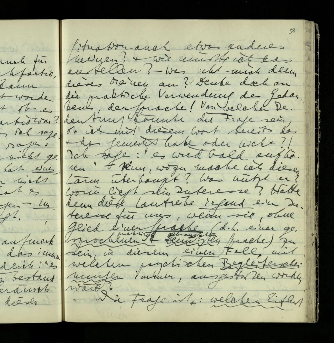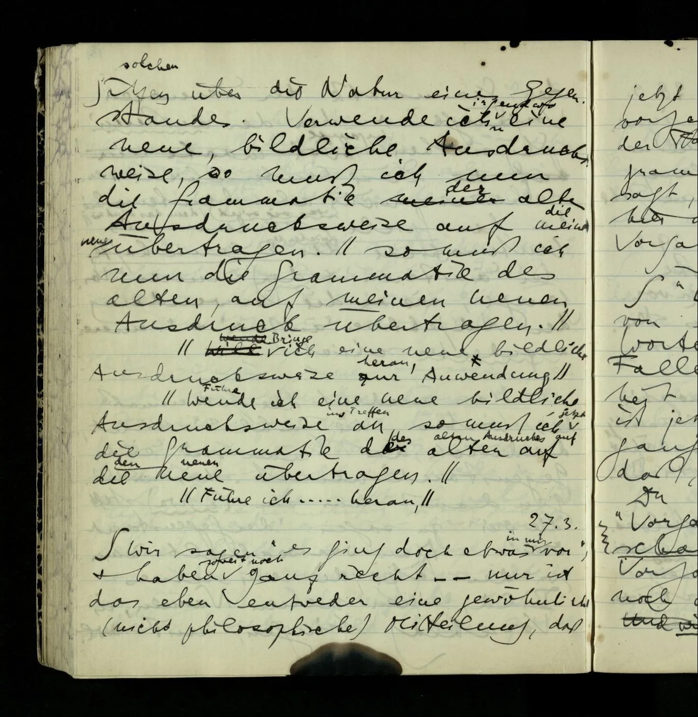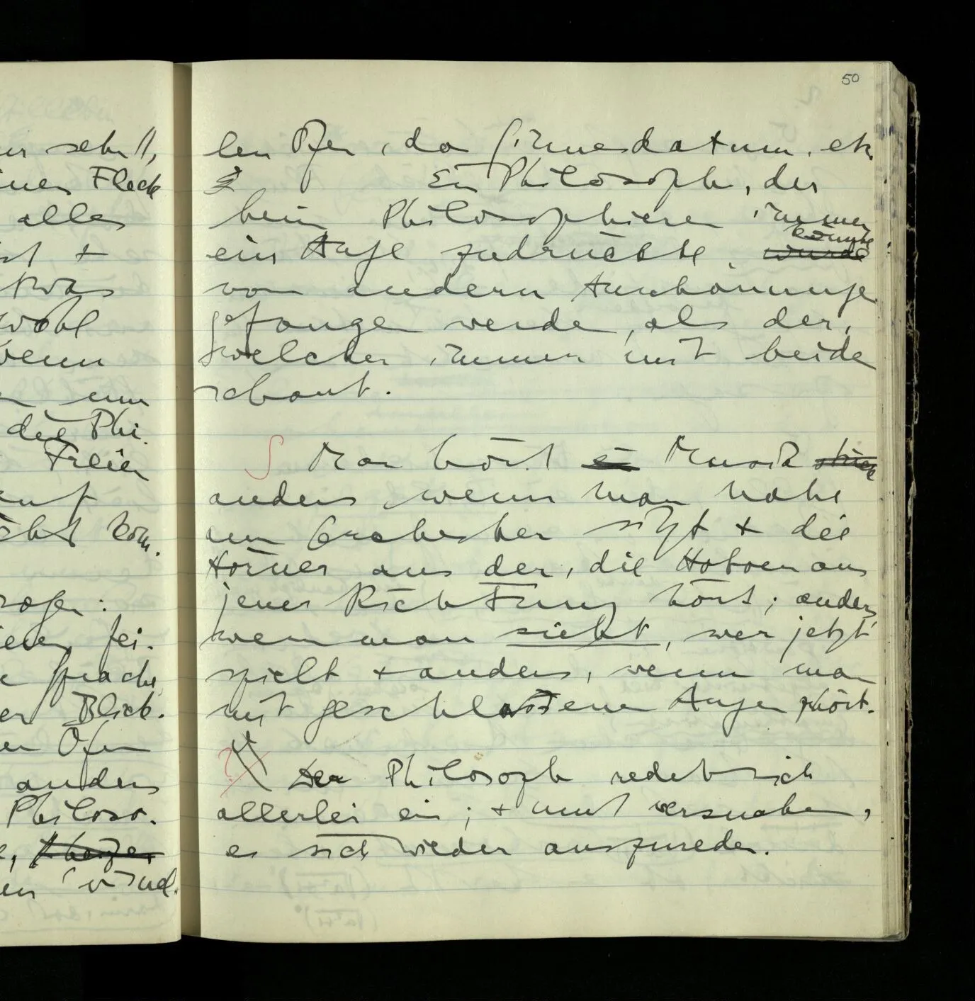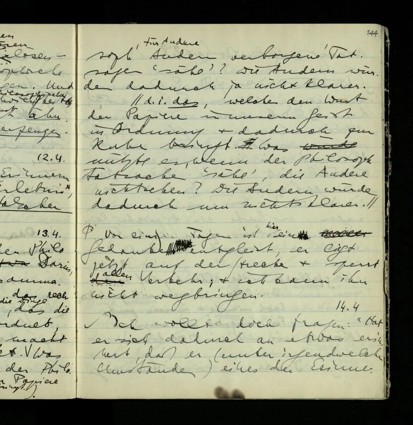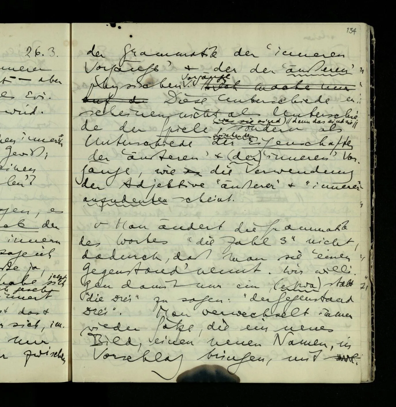 13.04.1938 Worin besteht es, daß der Philosoph etwas ‘sieht’? Darin, daß ihm die rechte grammatische Tatsache einfällt, das rechte Bild, d.h., das Bild, das die Dinge in unserm Geist ordnet, sie leicht zugänglich macht & den Geist so entlastet. (Das Bild welches den Wust der Papiere in unserm Geist ordnet.) Was würde es nützen, wenn der PhilosophAndern verborgene Tatsachen ‘sähe’? Die Andern würden dadurch ja nicht klarer.