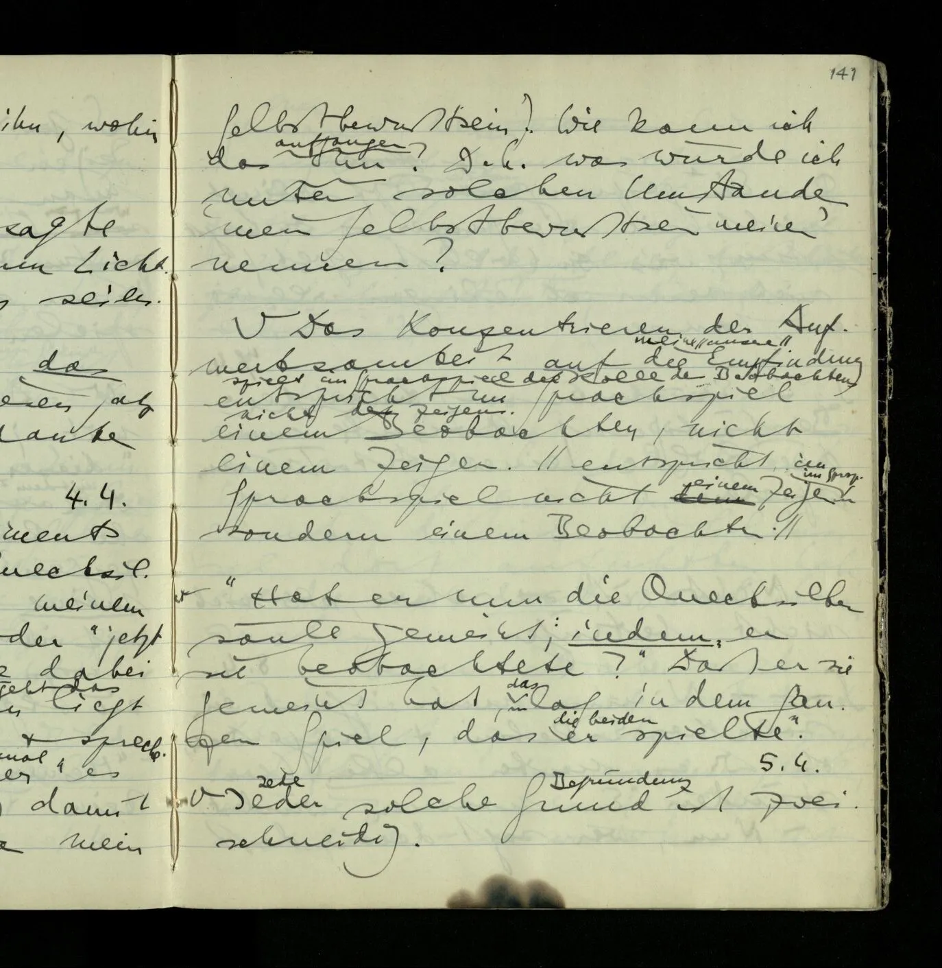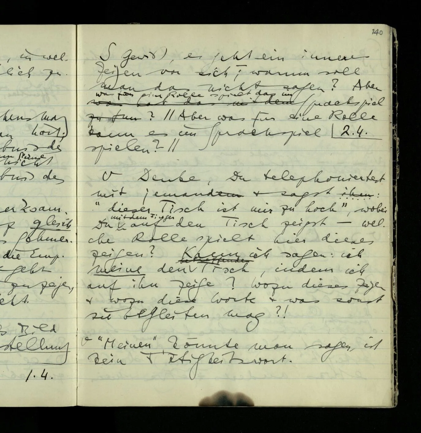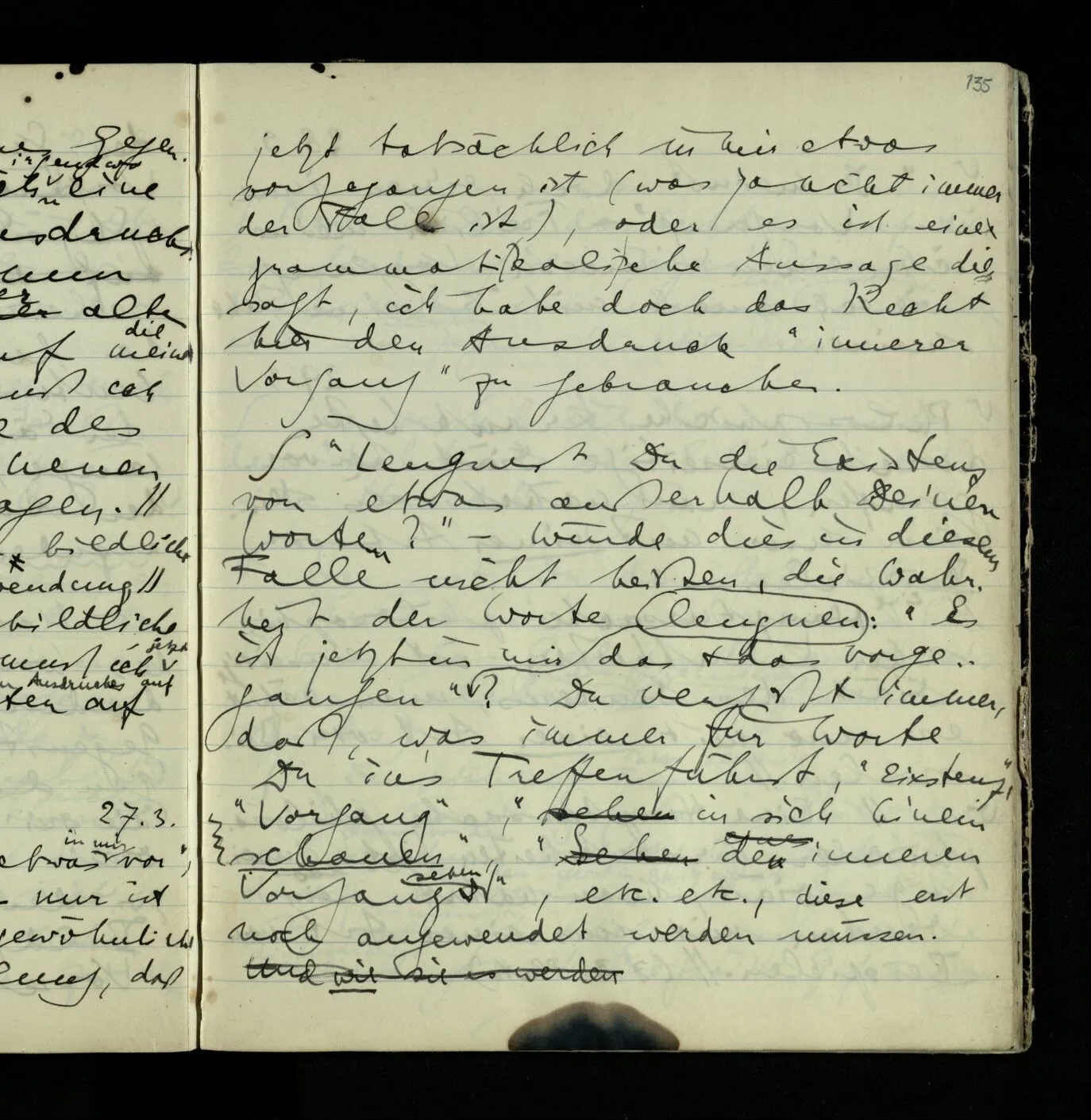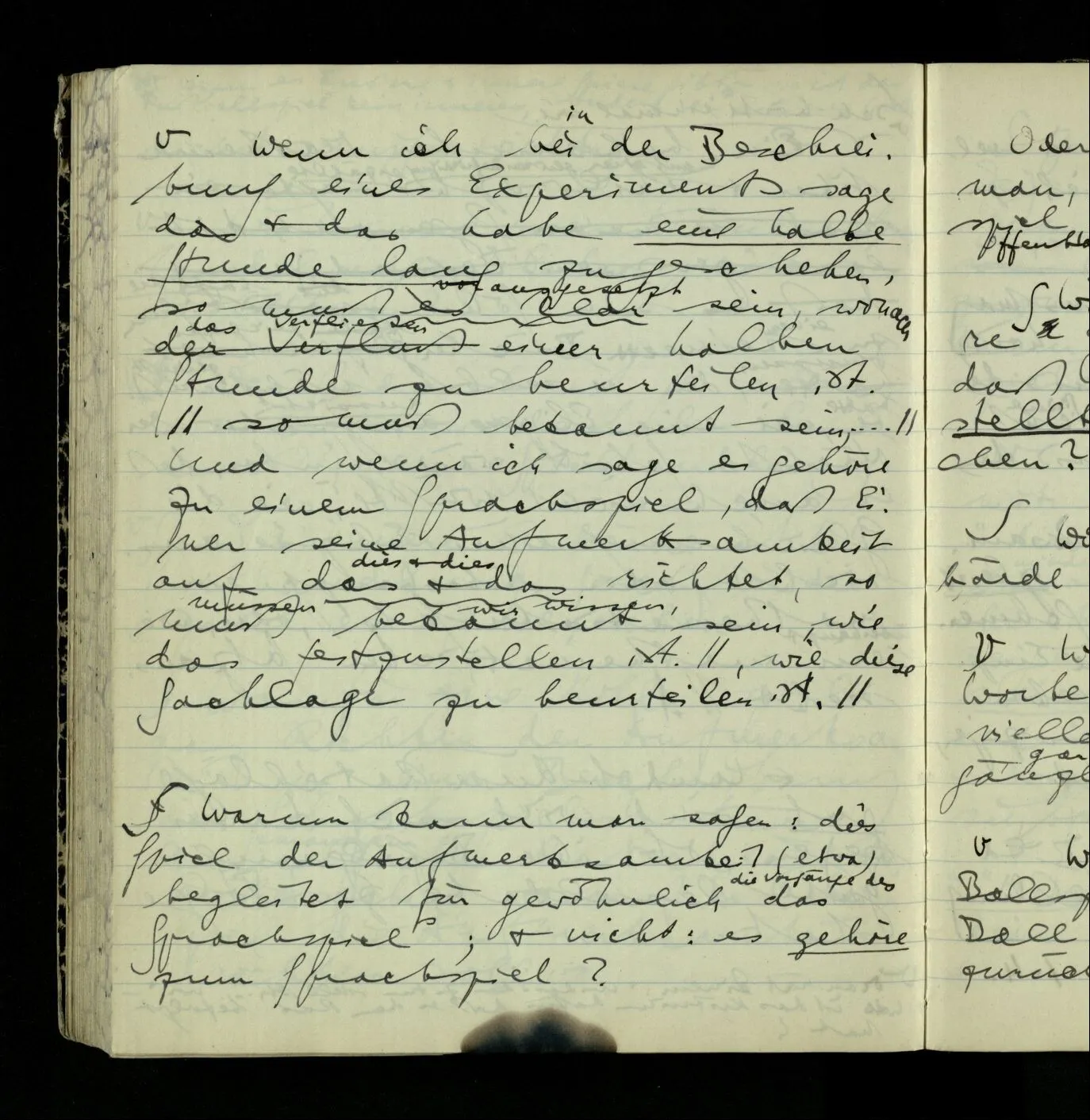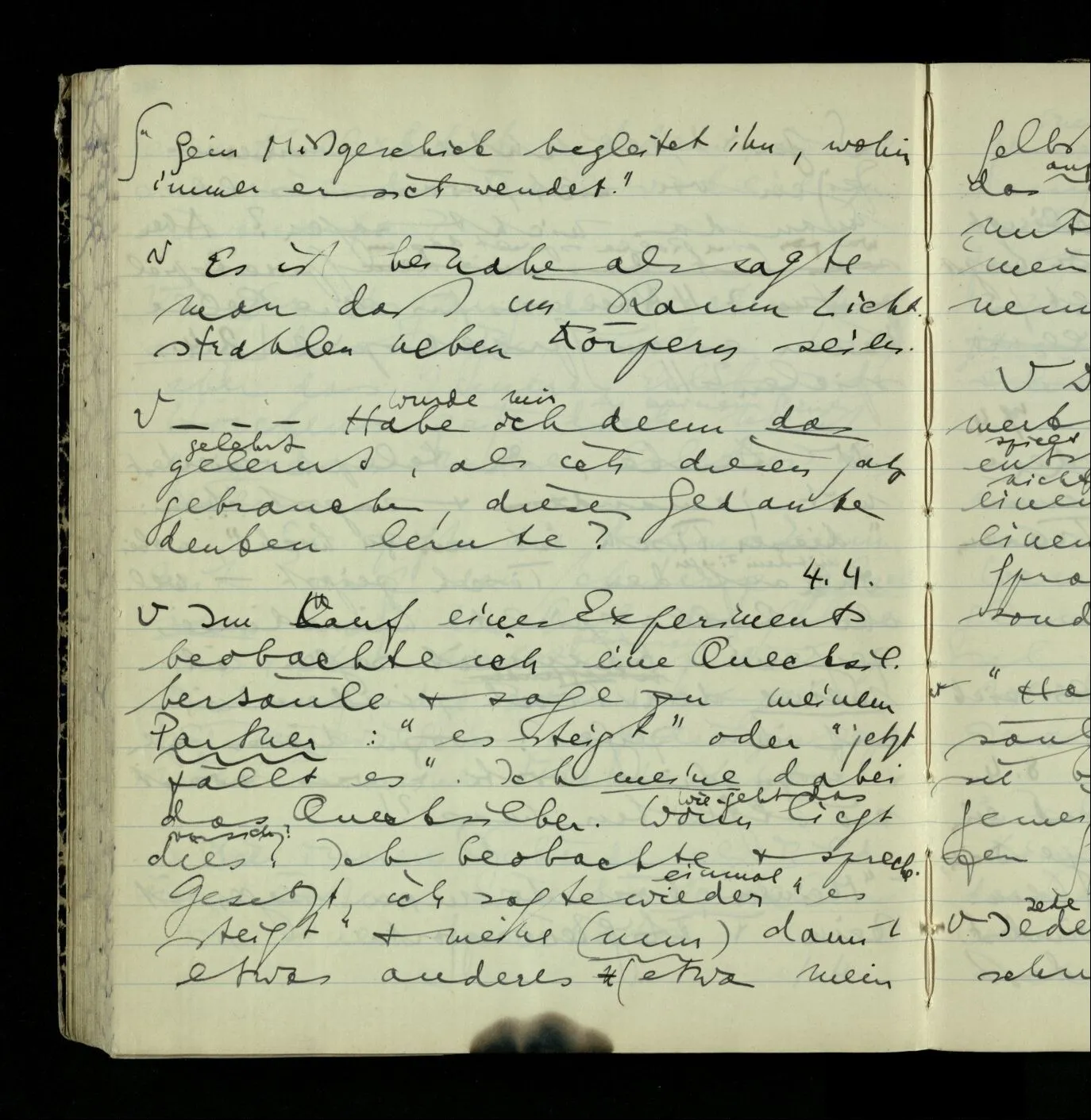 04.04.1938 Im Lauf eines Experiments beobachte ich eine Quecksilbersäule & sage zu meinem Partner: “es steigt” oder “jetzt fällt es”. Ich meine dabei das Quecksilber. Worin liegt dies? Ich beobachte & spreche. Gesetzt, ich sagte wieder “es steigt” & meine (nun) damit etwas anderes (etwa mein Selbstbewußtsein). Wie kann ich das tun? D.h. was würde ich unter solchen Umständen ‘mein Selbstbewußtsein meinen’ nennen?