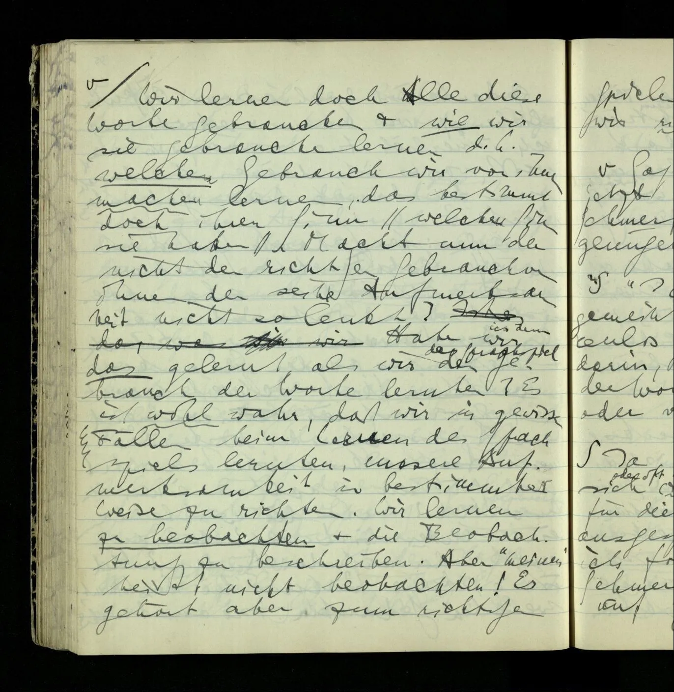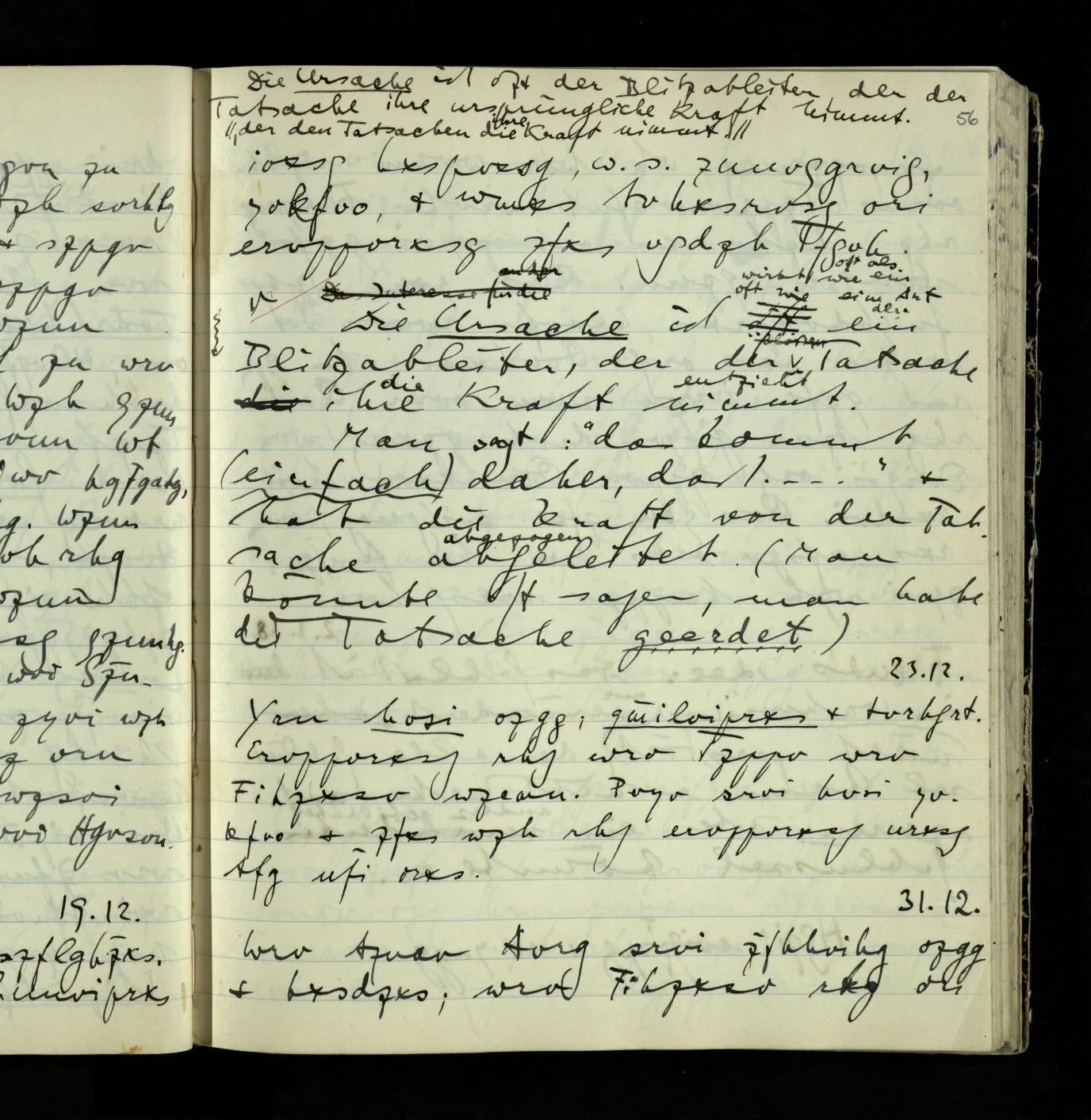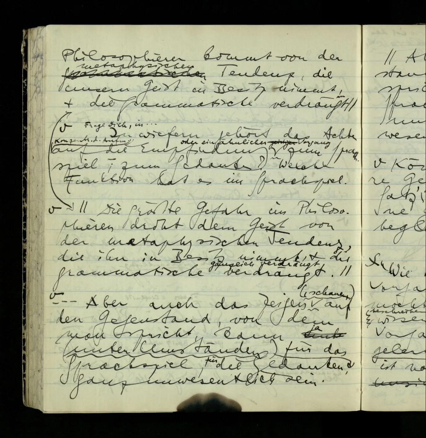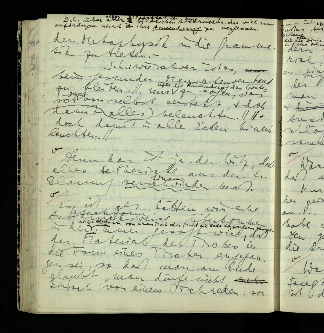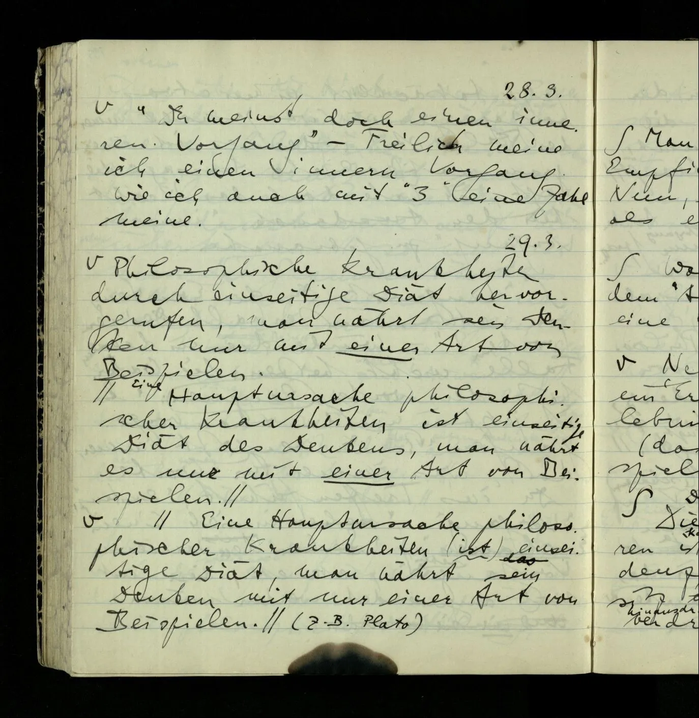 Wenn ich nicht ein richtigeres Denken, sondern eine andere Gedankenbewegung lehren will, so ist mein Zweck eine ‘Umwertung von Werten’ & ich komme auf Nietzsche, sowie auch dadurch, daß meiner Ansicht nach, der Philosoph ein Dichter sein sollte.