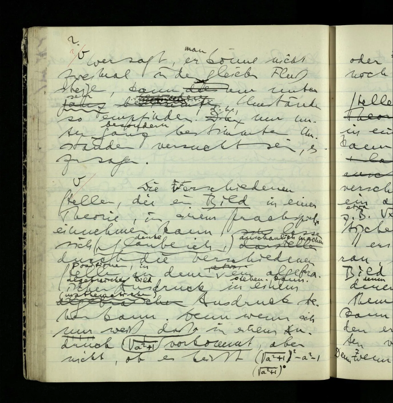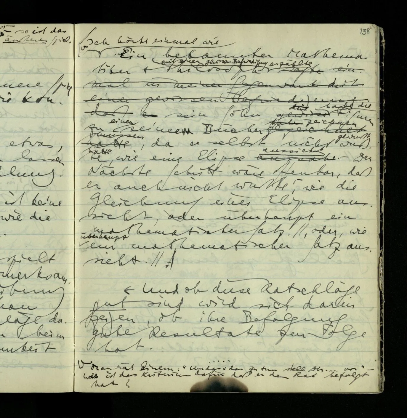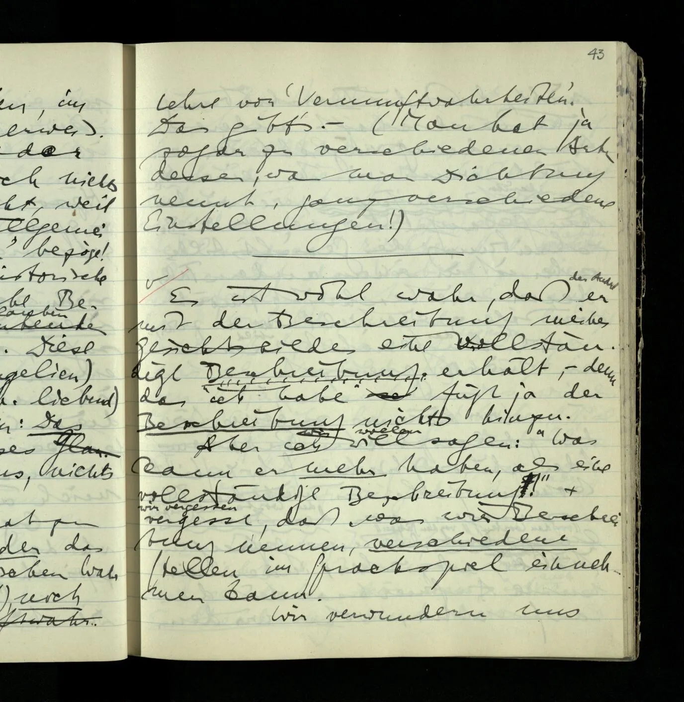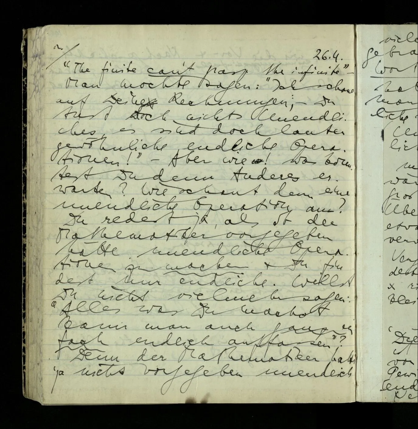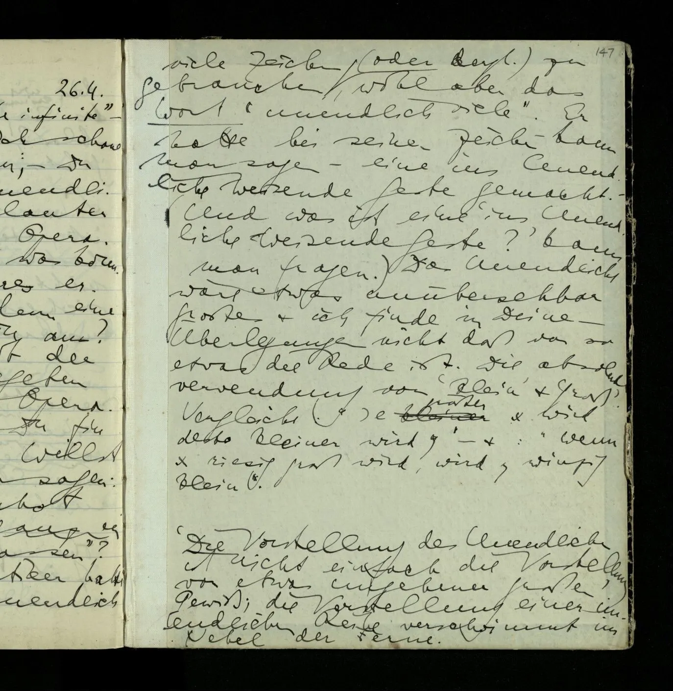 26.04.1938 “The finite can’t grasp the infinite.” – Man möchte sagen: “Ich schaue auf Deine Rechnungen, – Du tust doch nichts Unendliches, es sind doch lauter gewöhnliche endliche Operationen!” – Aber wie! was konntest Du denn Anderes erwarten? Wie schaut denn eine unendliche Operation aus? Du redest ja, als ob der Mathematiker vorgegeben hätte unendliche Operationen zu machen & Du findest nur endliche. Willst Du nicht vielmehr sagen: “Alles was Du machst kann man auch ganz einfach endlich auffassen”? Denn der Mathematiker hatte ja nicht vorgegeben unendlich viele Zeichen zu gebrauchen (oder dergl.), wohl aber das Wort “unendlich viele”. Er hatte bei seinen Zeichen – kann man sagen – eine ins Unendliche weisende Geste gemacht. – (Und was ist eine ‘ins Unendliche weisende Geste?’ kann man fragen.) Das Unendliche wäre etwas unübersehbar großes & ich finde in Deinen Überlegungen nicht daß von so etwas die Rede ist. Die absolute Verwendung von ‘klein’ & ‘groß’. Vergleiche: “Je größer x wird desto kleiner wird y” – &: “Wenn x riesig groß wird, wird y winzig klein”.