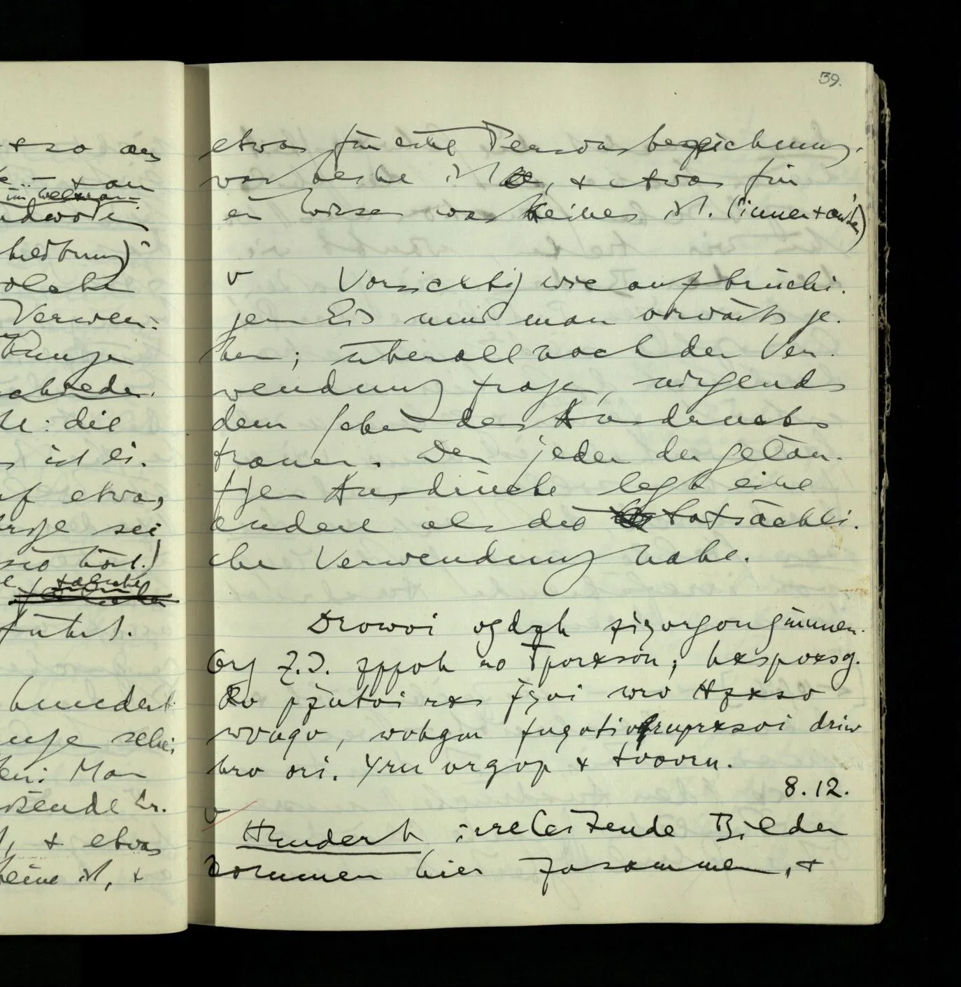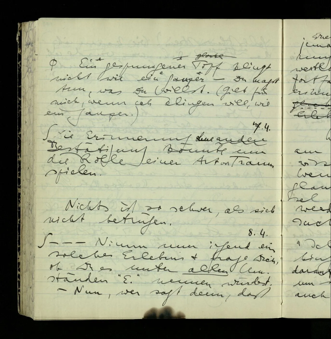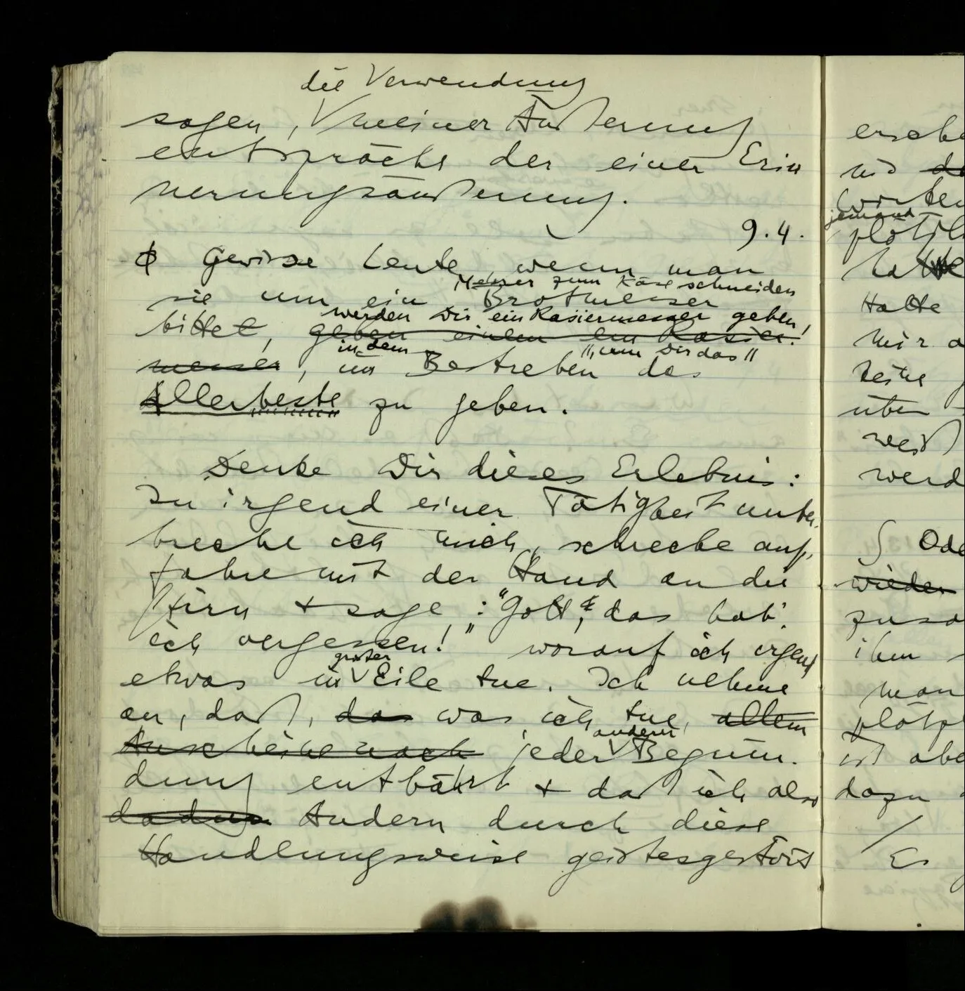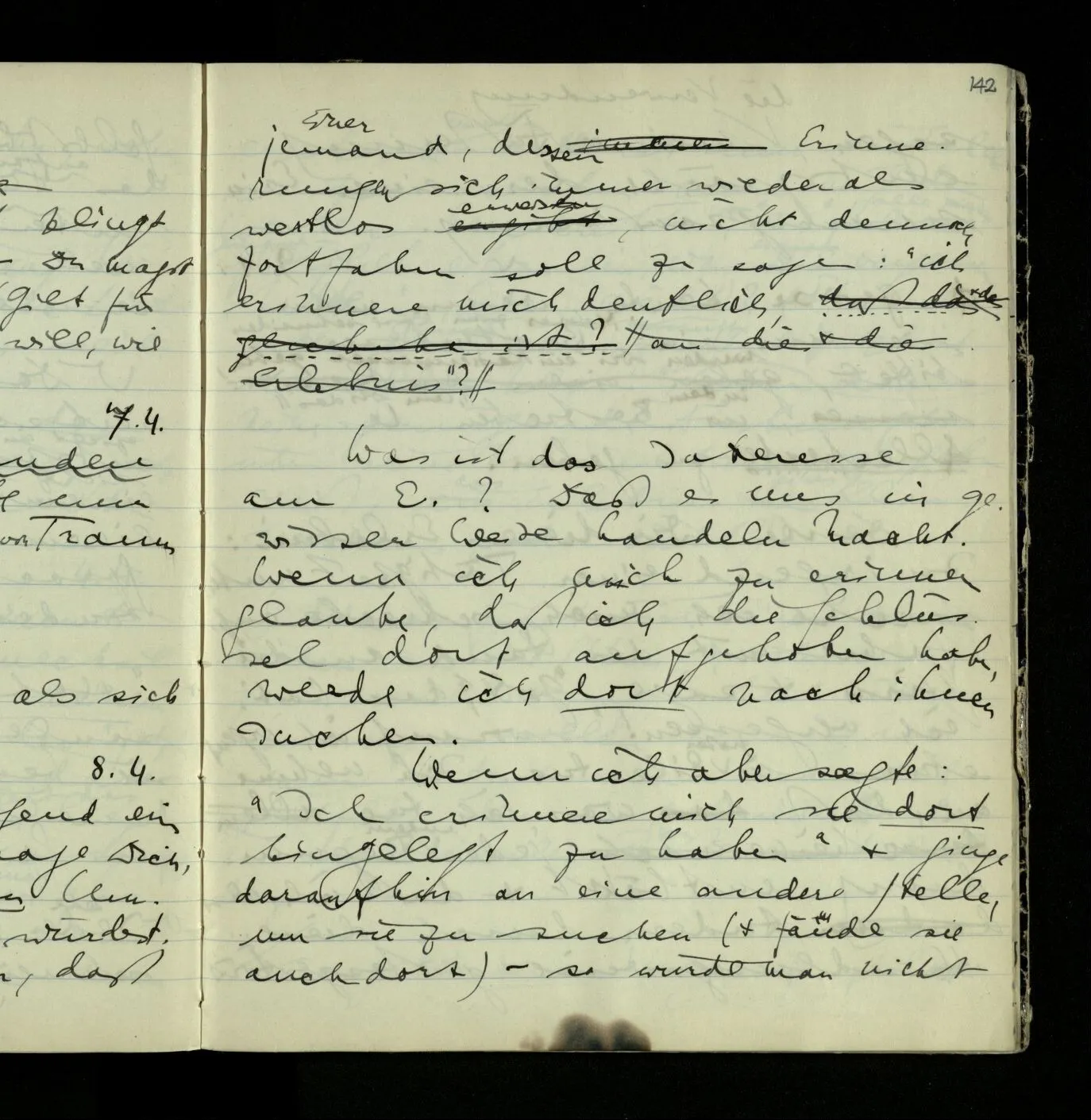 08.04.1938 – – – Nimm nun irgend ein solches Erlebnis & frage Dich, ob Du es unter allen Umständen “Erlebnis” nennen würdest. – Nun, wer sagt denn, daß jemand, dessen Erinnerungen sich immer wieder als wertlos erweisen, nicht dennoch fortfahren soll zu sagen: “ich erinnere mich deutlich, daß das & das geschehen ist”?