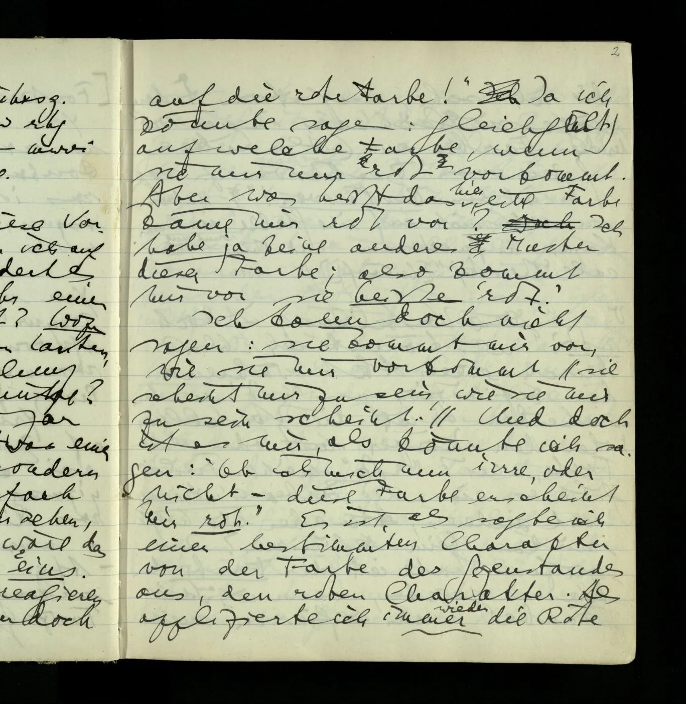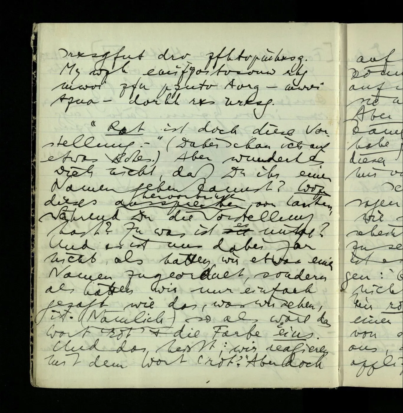 “Rot ist doch diese Vorstellung. –” (Dabei schau ich auf etwas Rotes.) Aber wundert es Dich nicht, daß Du ihr einen Namen geben kannst? Wozu dieses Aussprechen von Lauten, während Du die Vorstellung hast? Zu was ist es nütze? Und es ist uns dabei gar nicht, als hätten wir etwas einen Namen zugeordnet, sondern als hätten wir nur einfach gesagt wie das, was wir sehen, ist. (Nämlich) so als wäre das Wort ‘rot’ und die Farbe eins. Und das heißt, wir reagieren mit dem Wort ‘rot’. “Aber doch auf die rote Farbe!” Ja ich könnte sagen: gleichgültig auf welche Farbe, wenn sie mir nur rot vorkommt. Aber was heißt das hier, eine Farbe käme mir rot vor? Ich habe ja keine anderen Muster dieser Farbe; also kommt mir vor sie heiße ‘rot’. Ich kann doch nicht sagen: sie kommt mir vor, wie sie mir vorkommt. Und doch ist es mir, als könnte ich sagen: “Ob ich mich nun irre, oder nicht – diese Farbe erscheint mir rot.” Es ist, als sagte ich einen bestimmten Charakter von der Farbe des Gegenstandes aus, den roten Charakter. Als applizierte ich immer wieder die Röte die ich sehe, auf etwas Anderes, zöge sie gleichsam immer wieder der Farbe an. (Als hätte es Sinn von Beethoven zu sagen “er ist ein Beethoven!”, Watson machte mich auf eine Stelle in Omar Kayam aufmerksam “and this … men call ‘the sky’” .)