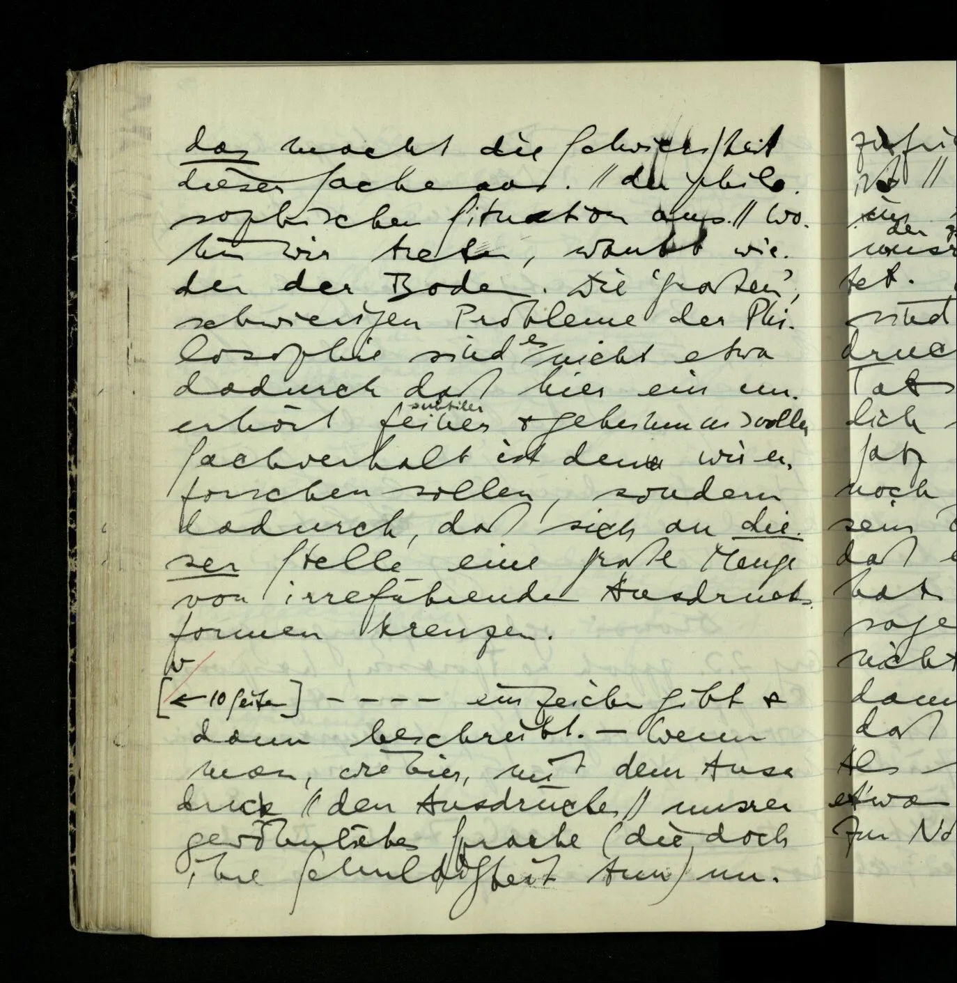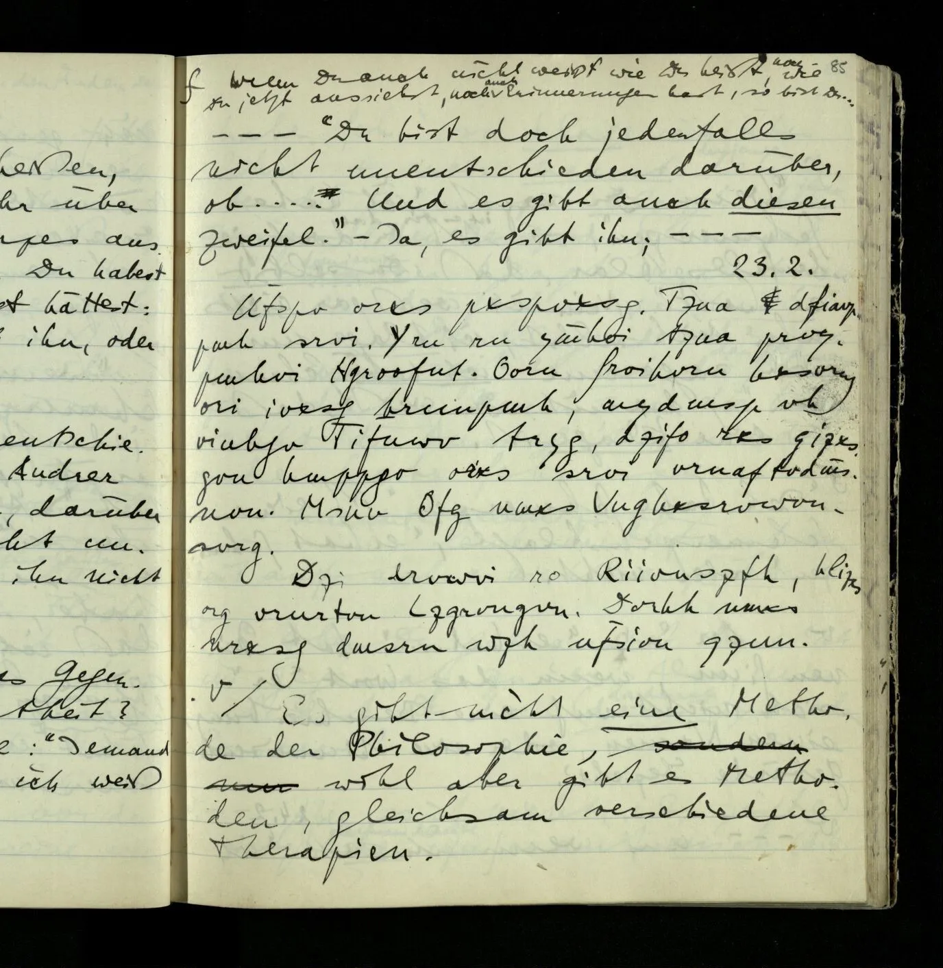 10.04.1938 Es gibt einen Vorgang: philosophische Schwierigkeiten zu lösen – & einen andern: philosophische Schwierigkeiten zu erzeugen. Und eine der Methoden, eine philosophische Schwierigkeit aufzulösen ist die, zuerst ähnliche Schwierigkeiten zu erzeugen.
