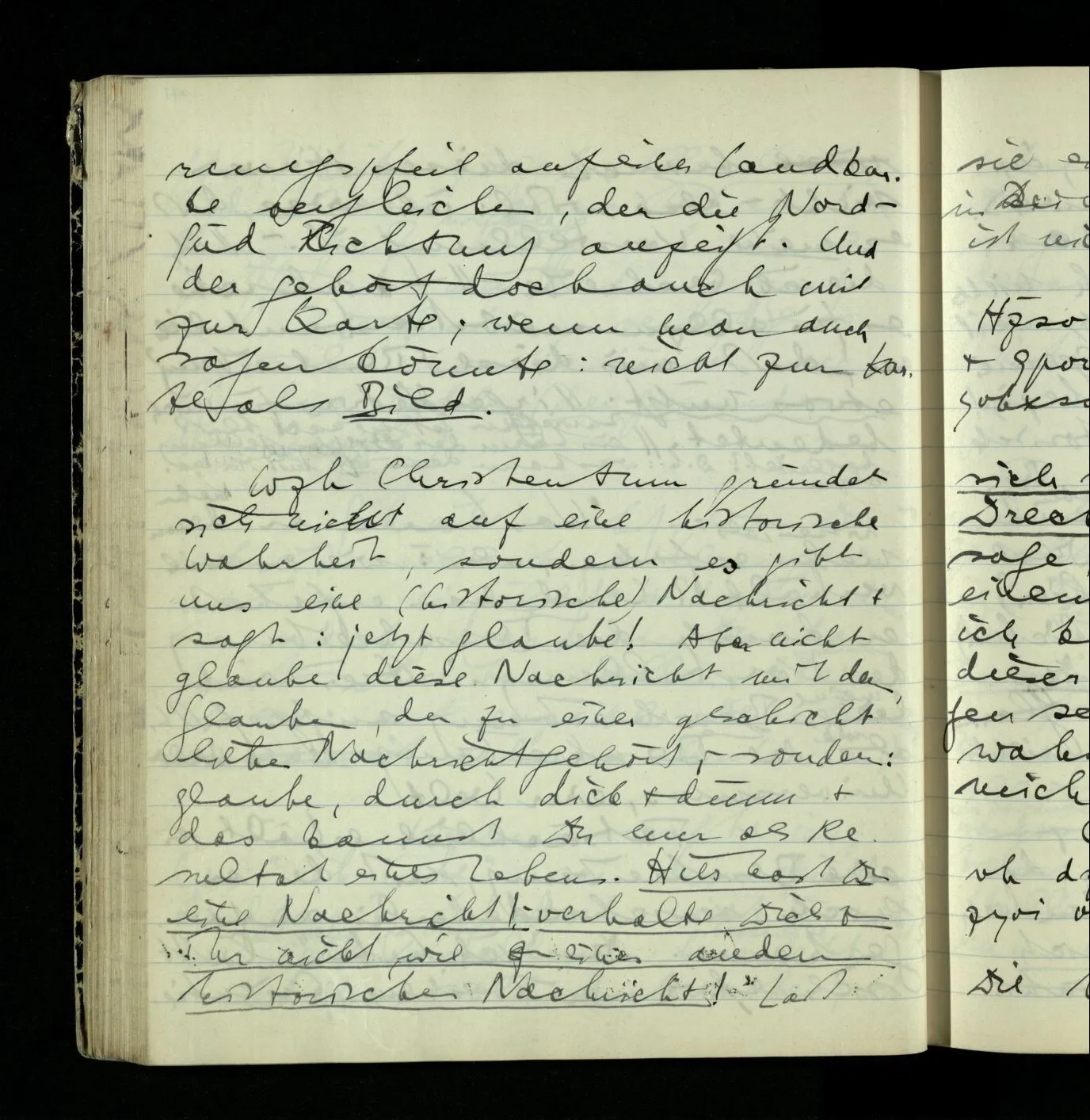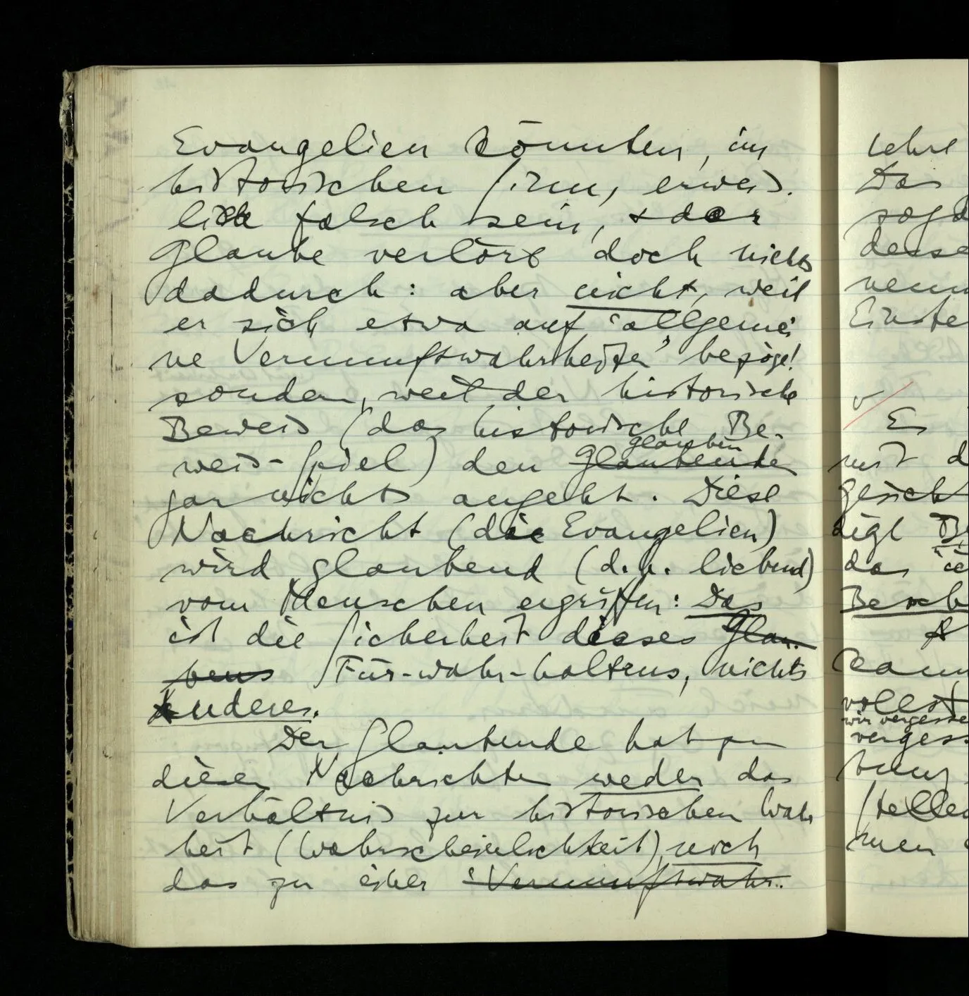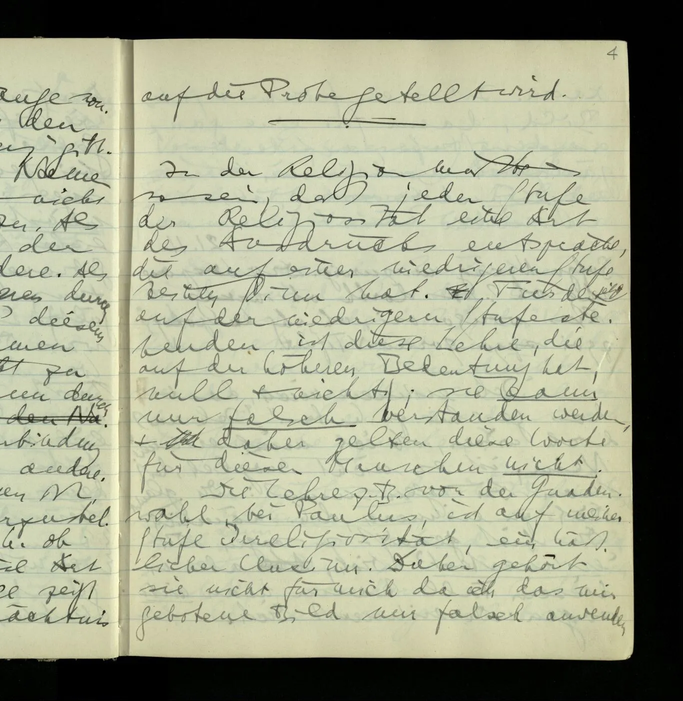In der Religion müßte es so sein, daß jeder Stufe der Religiosität eine Art des Ausdrucks entspräche, die auf einer niedrigeren Stufe keinen Sinn hat. Für den jetzt auf der niedrigern Stufe Stehenden ist diese Lehre, die auf der höheren Bedeutung hat, null & nichtig; sie kann nur falsch verstanden werden, & daher gelten diese Worte für diesen Menschen nicht. Die Lehre z.B. von der Gnadenwahl, bei Paulus, ist auf meiner Stufe Irreligiosität, ein häßlicher Unsinn. Daher gehört sie nicht für mich da ich das mir gebotene Bild nur falsch anwenden kann. Ist es ein frommes & gutes Bild, dann für eine ganz andere Stufe, auf der es gänzlich anders im Leben muß angewandt werden, als ich es anwenden könnte.