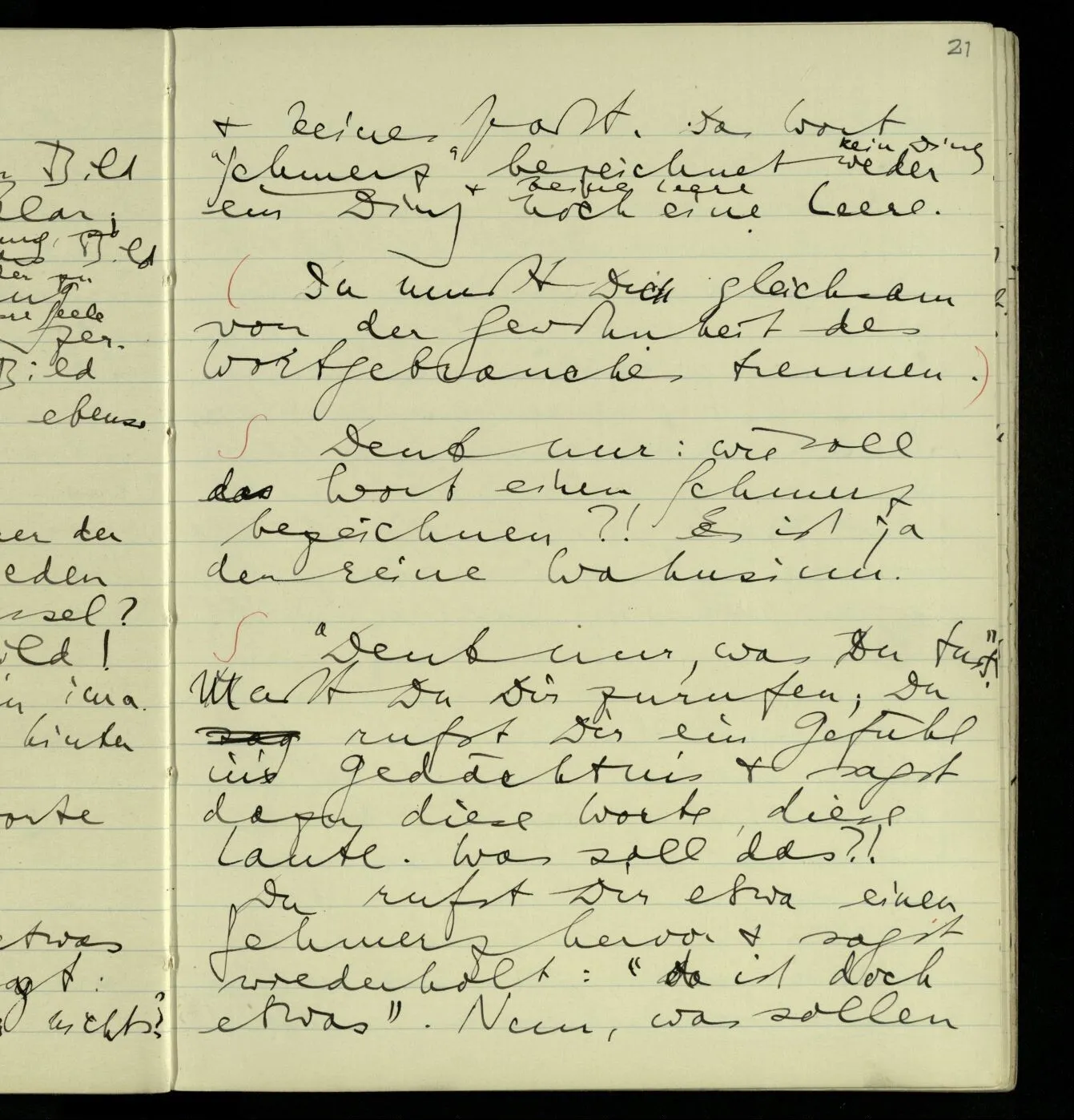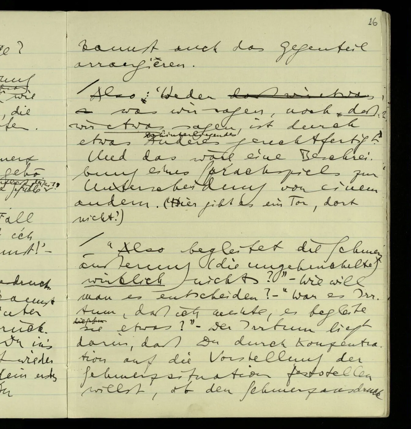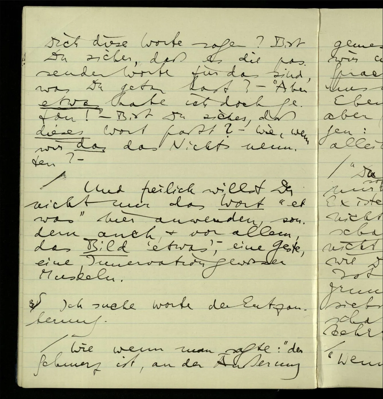 “Aber ich bin doch geneigt den Ausdruck ‘ich habe’ zu gebrauchen, eben weil ich etwas merke!’ – Und warum bist Du geneigt den Ausdruck ‘Etwas’ zu gebrauchen? Ist es also so: ich greife immer nach etwas, & es ist nichts da? – Aber warum soll ich nicht sagen, es ist etwas da? indem ich allerdings die greifende Bewegung als Kriterium dafür nehme, daß ‘etwas da ist’.