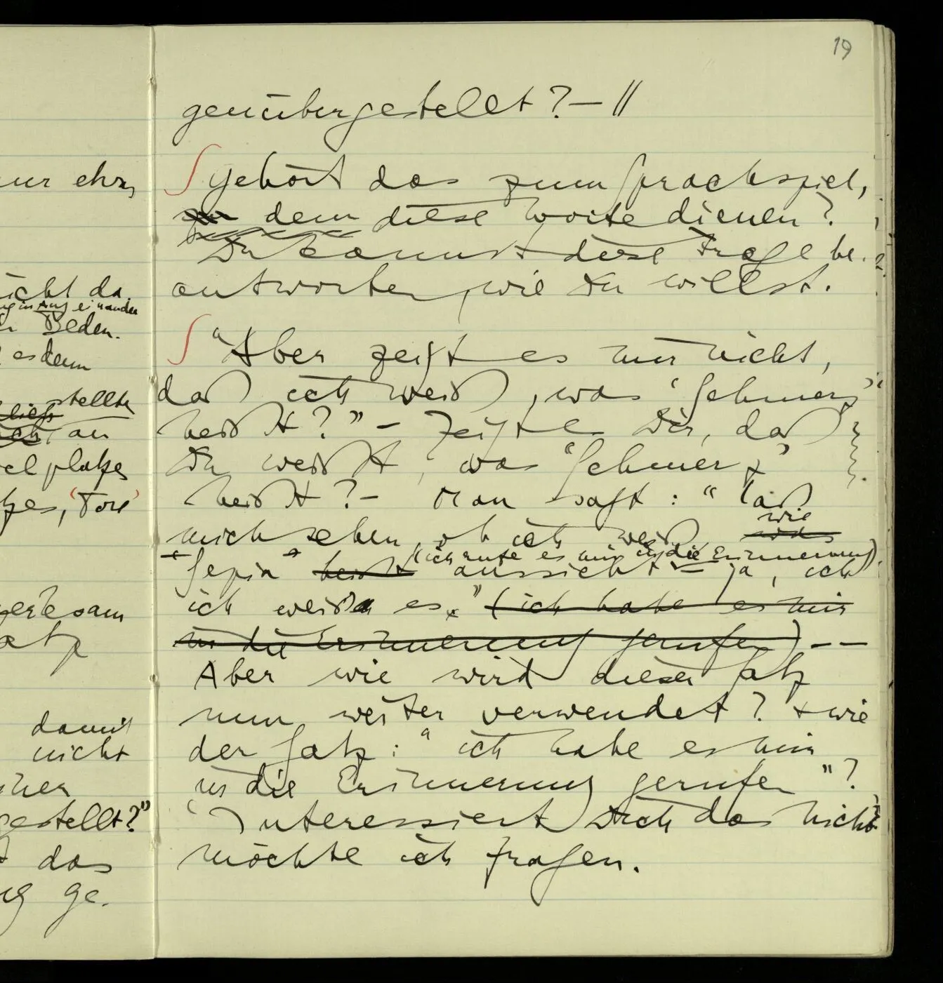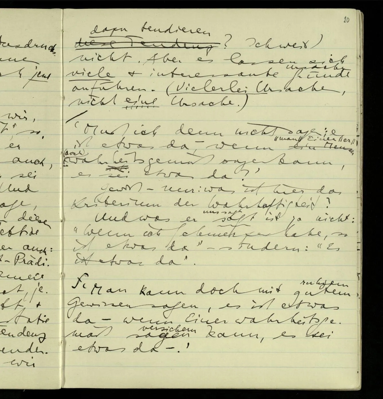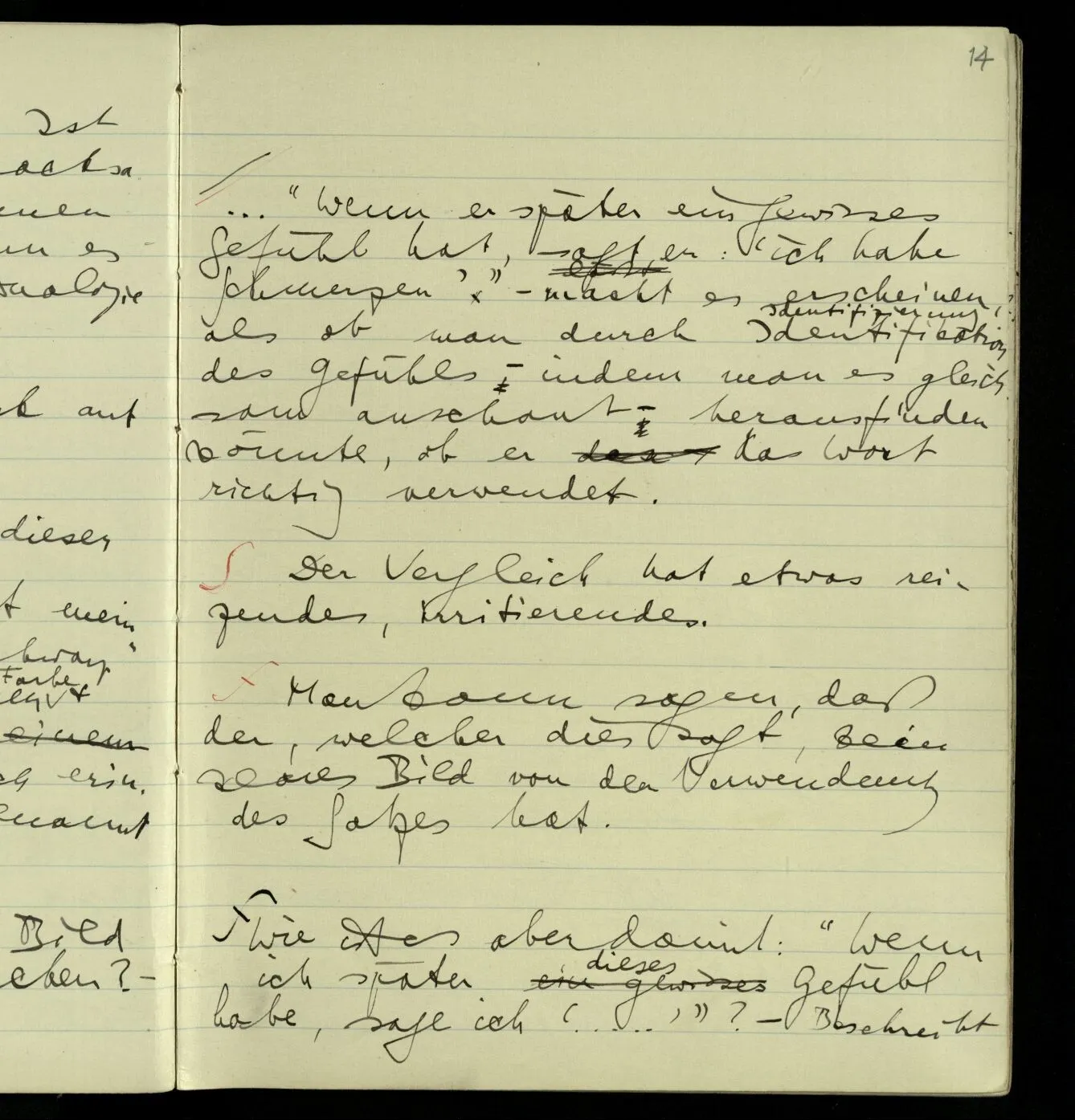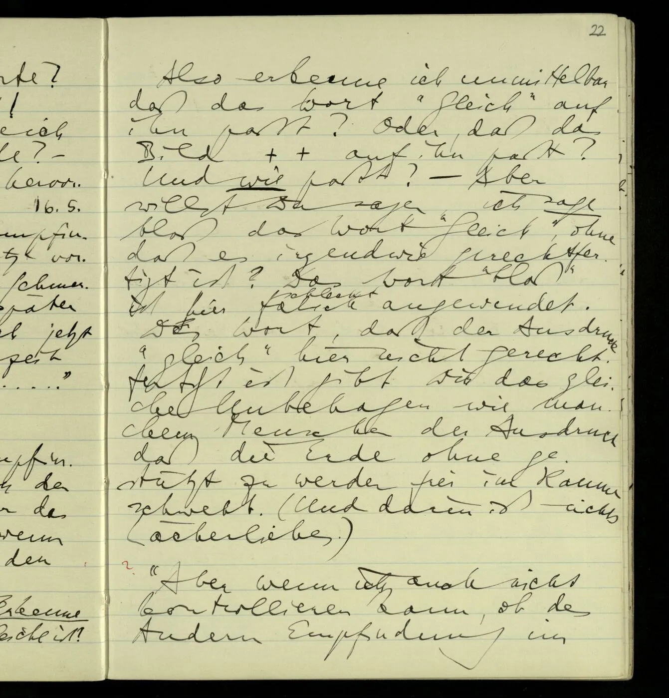 “Aber ich bin doch geneigt den Ausdruck ‘ich habe’ zu gebrauchen, eben weil ich etwas merke!’ – Und warum bist Du geneigt den Ausdruck ‘Etwas’ zu gebrauchen? Ist es also so: ich greife immer nach etwas, & es ist nichts da? – Aber warum soll ich nicht sagen, es ist etwas da? indem ich allerdings die greifende Bewegung als Kriterium dafür nehme, daß ‘etwas da ist’.