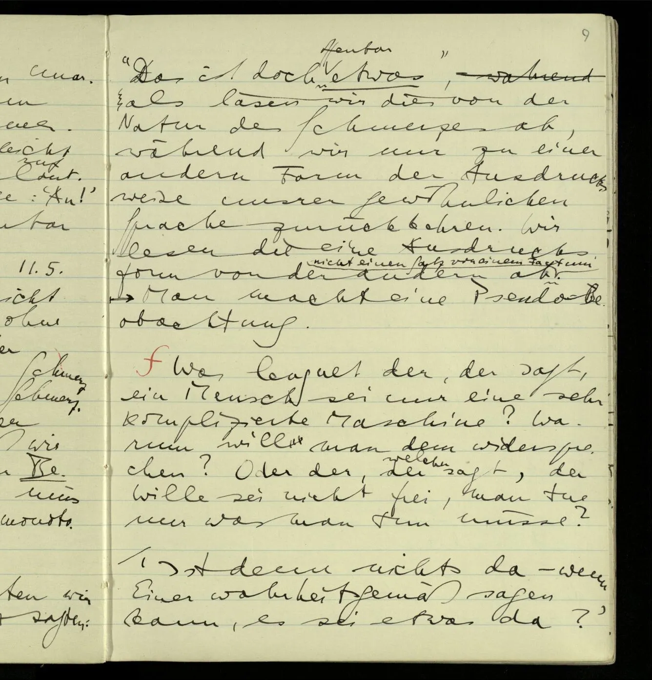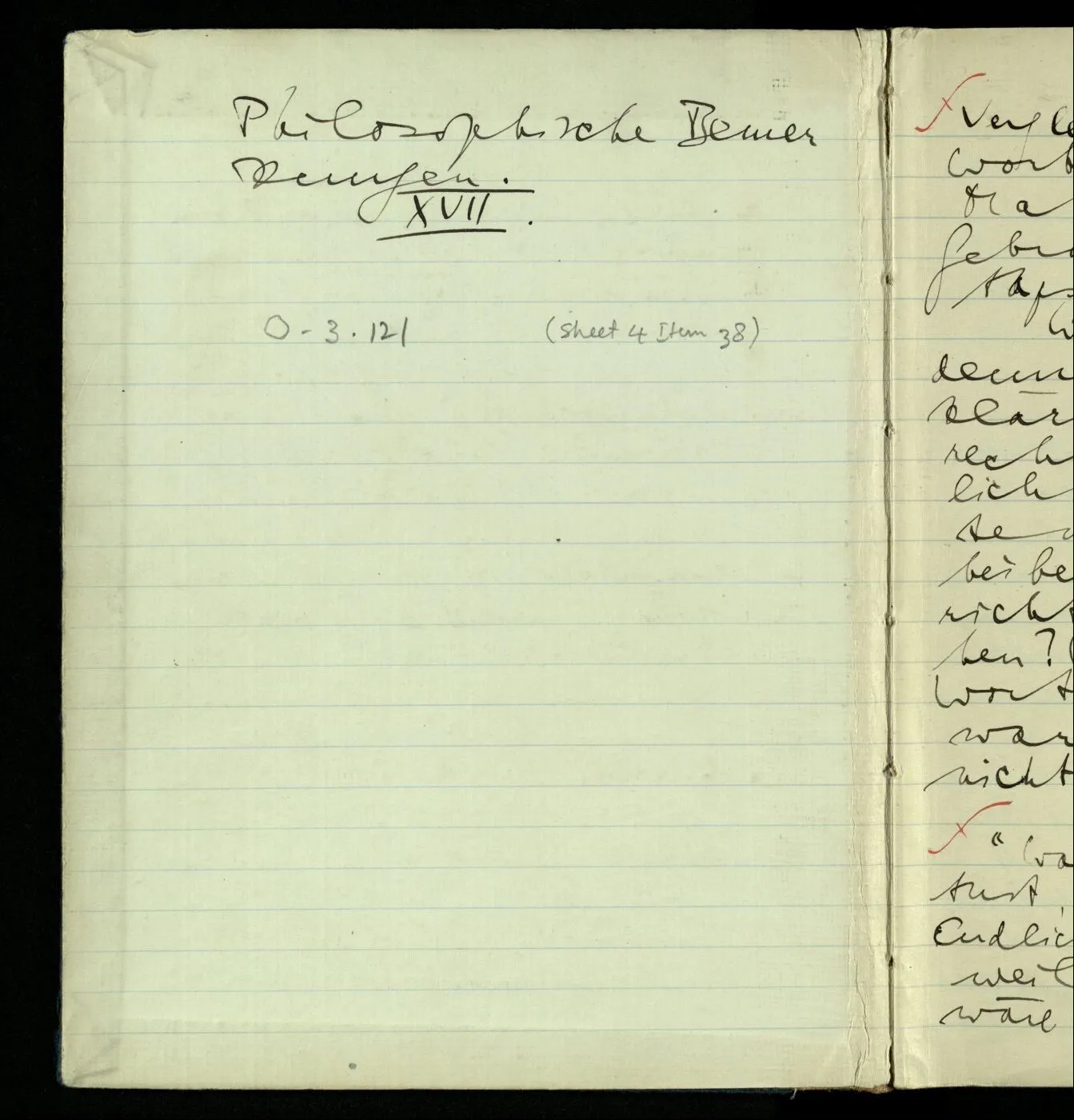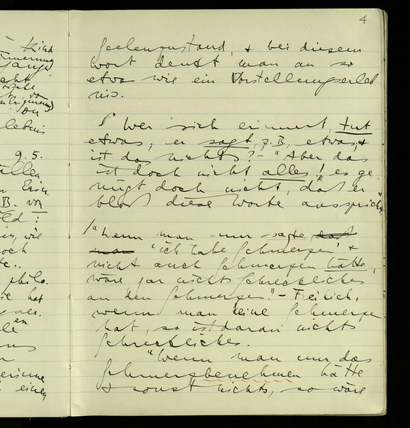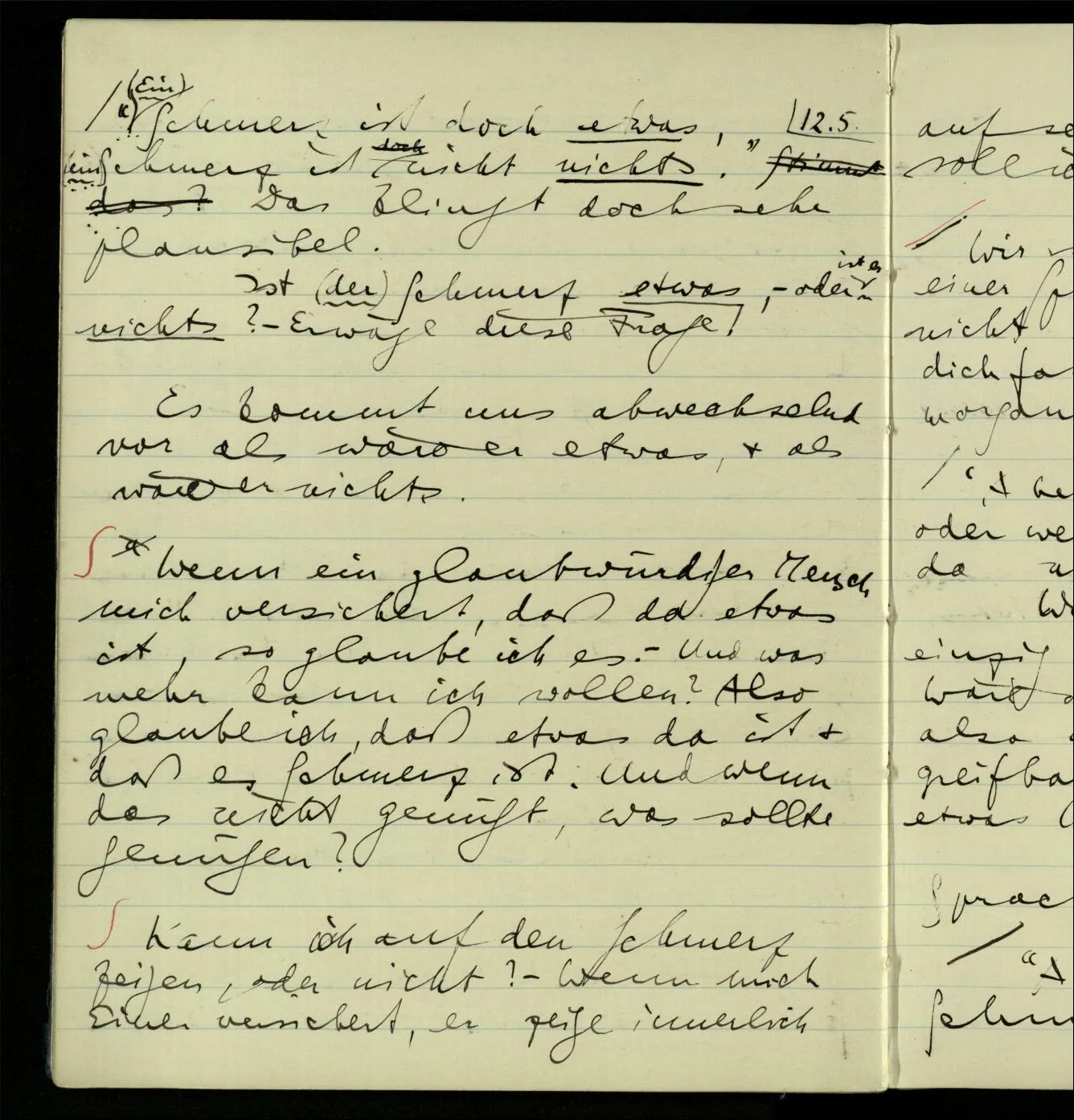 12.05.1938 “(Ein) Schmerz ist doch etwas, (ein) Schmerz ist nicht nichts.” Das klingt doch sehr plausibel. Ist (der) Schmerz etwas, – oder ist er nichts? – Erwäge diese Frage!