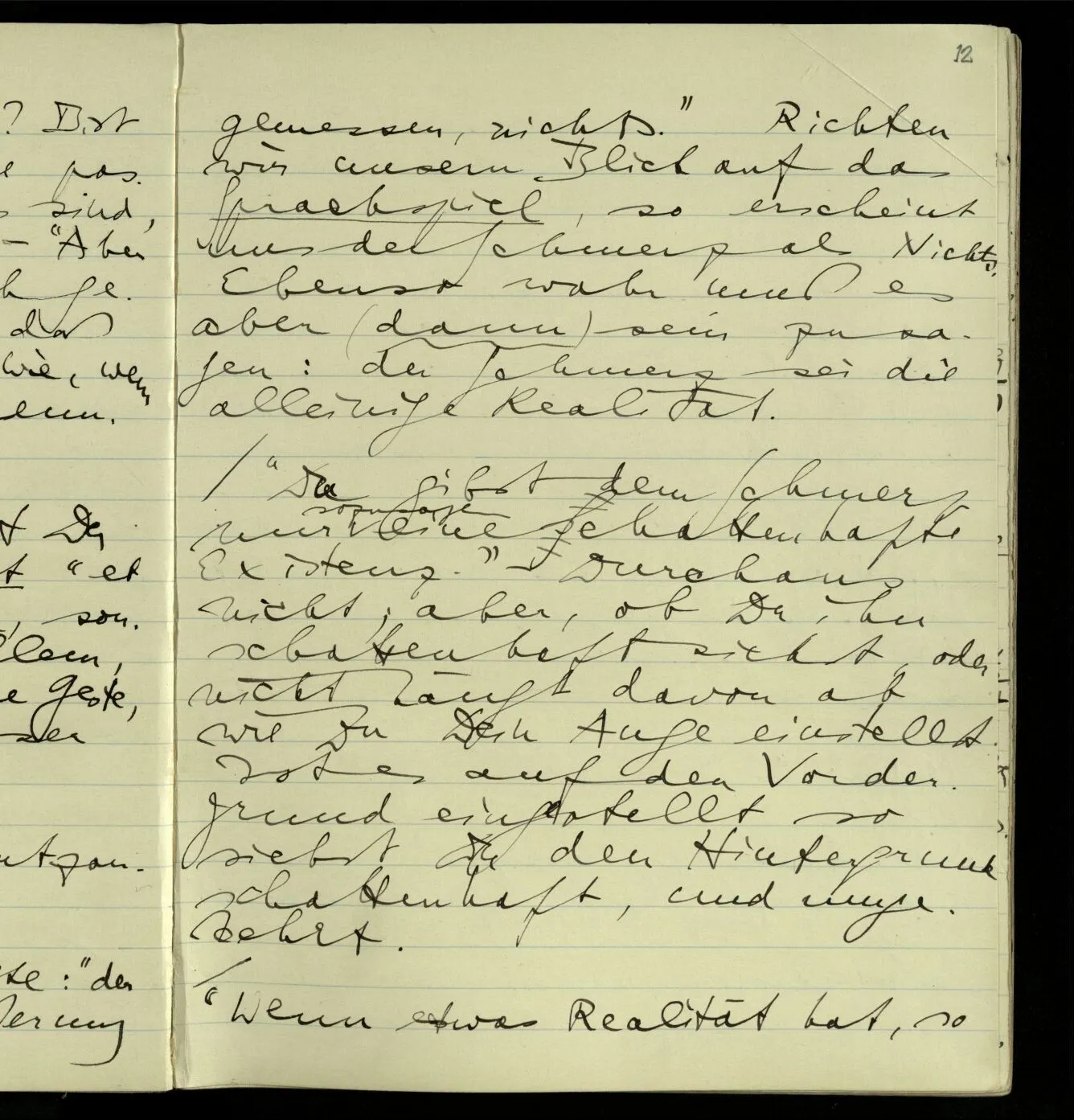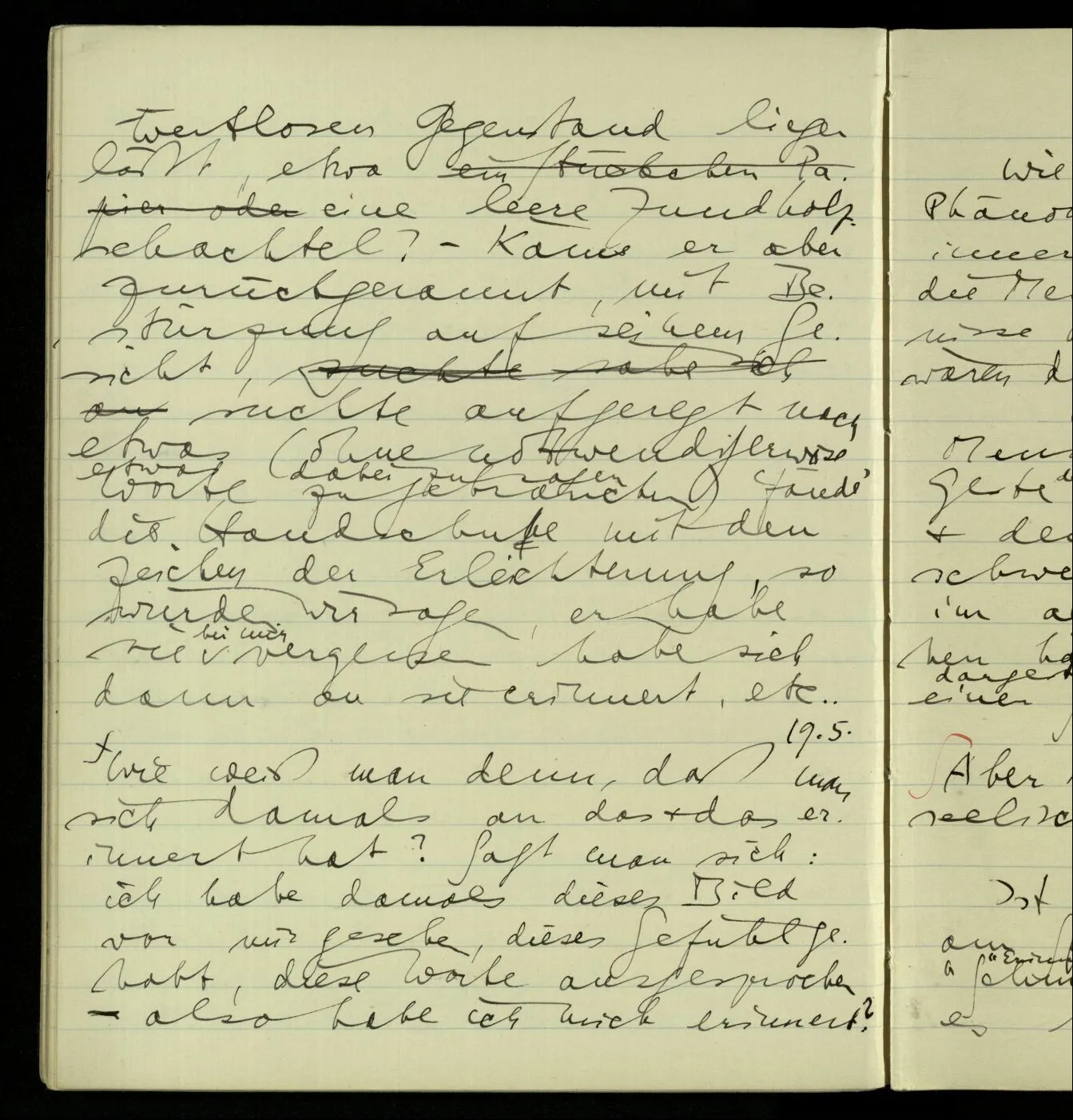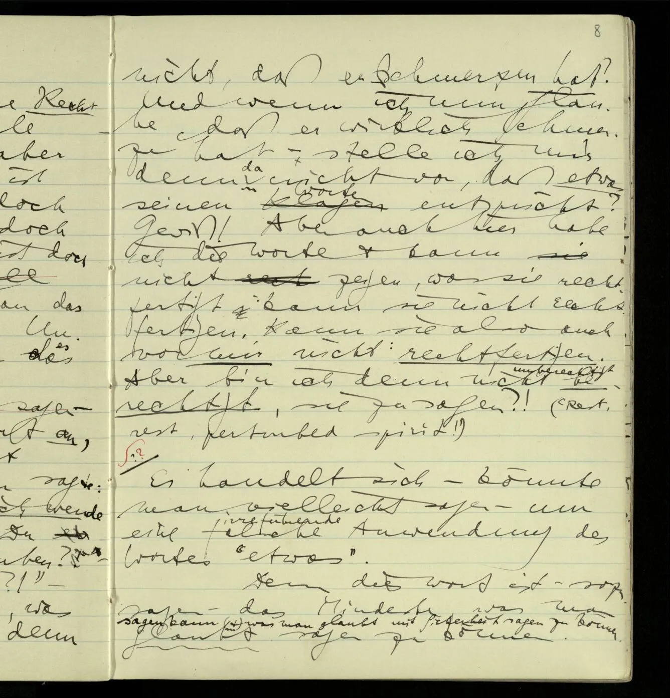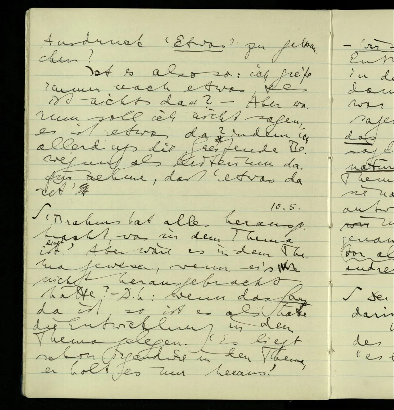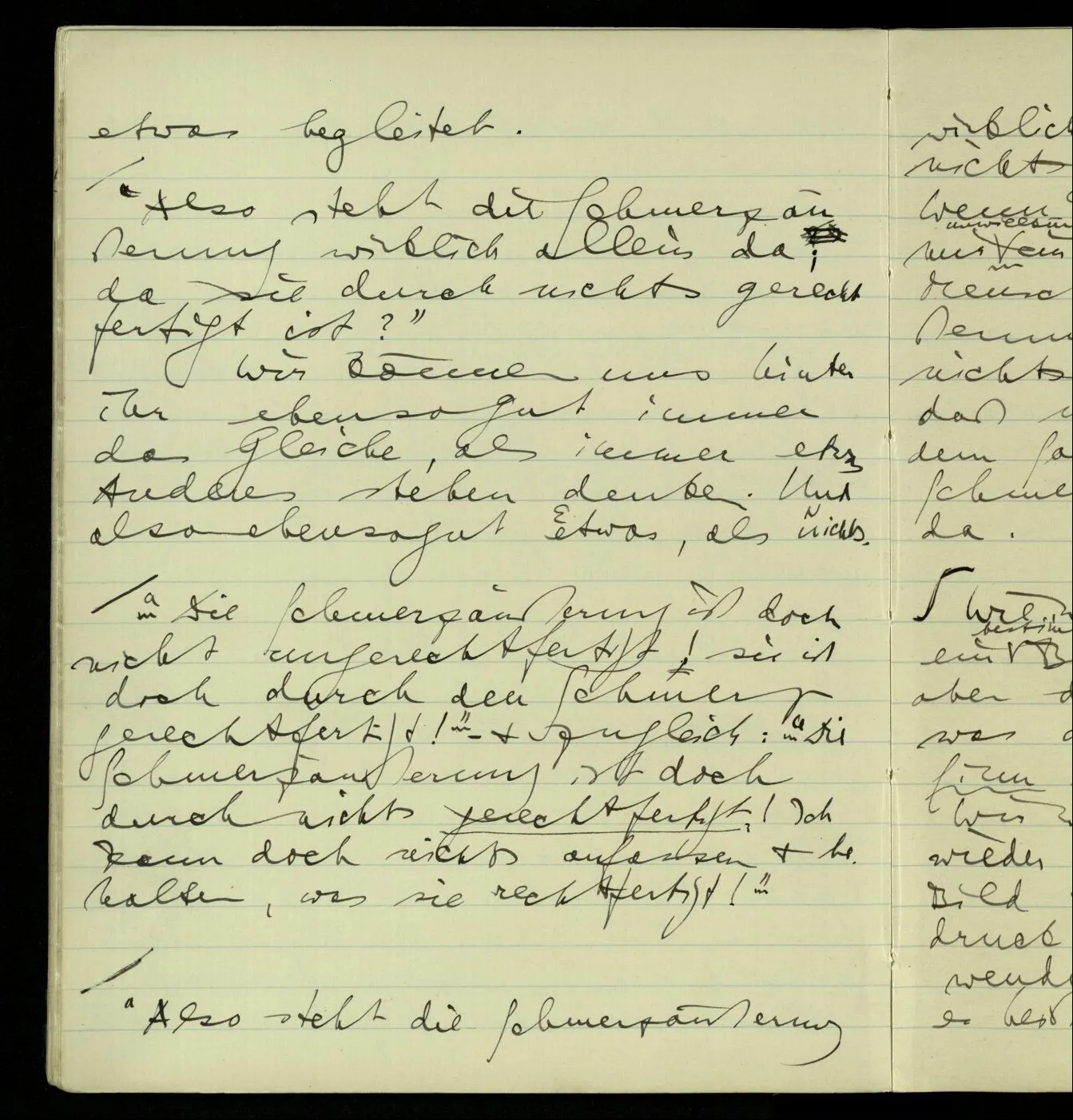 12.05.1938 “(Ein) Schmerz ist doch etwas, (ein) Schmerz ist nicht nichts.” Das klingt doch sehr plausibel. Ist (der) Schmerz etwas, – oder ist er nichts? – Erwäge diese Frage!