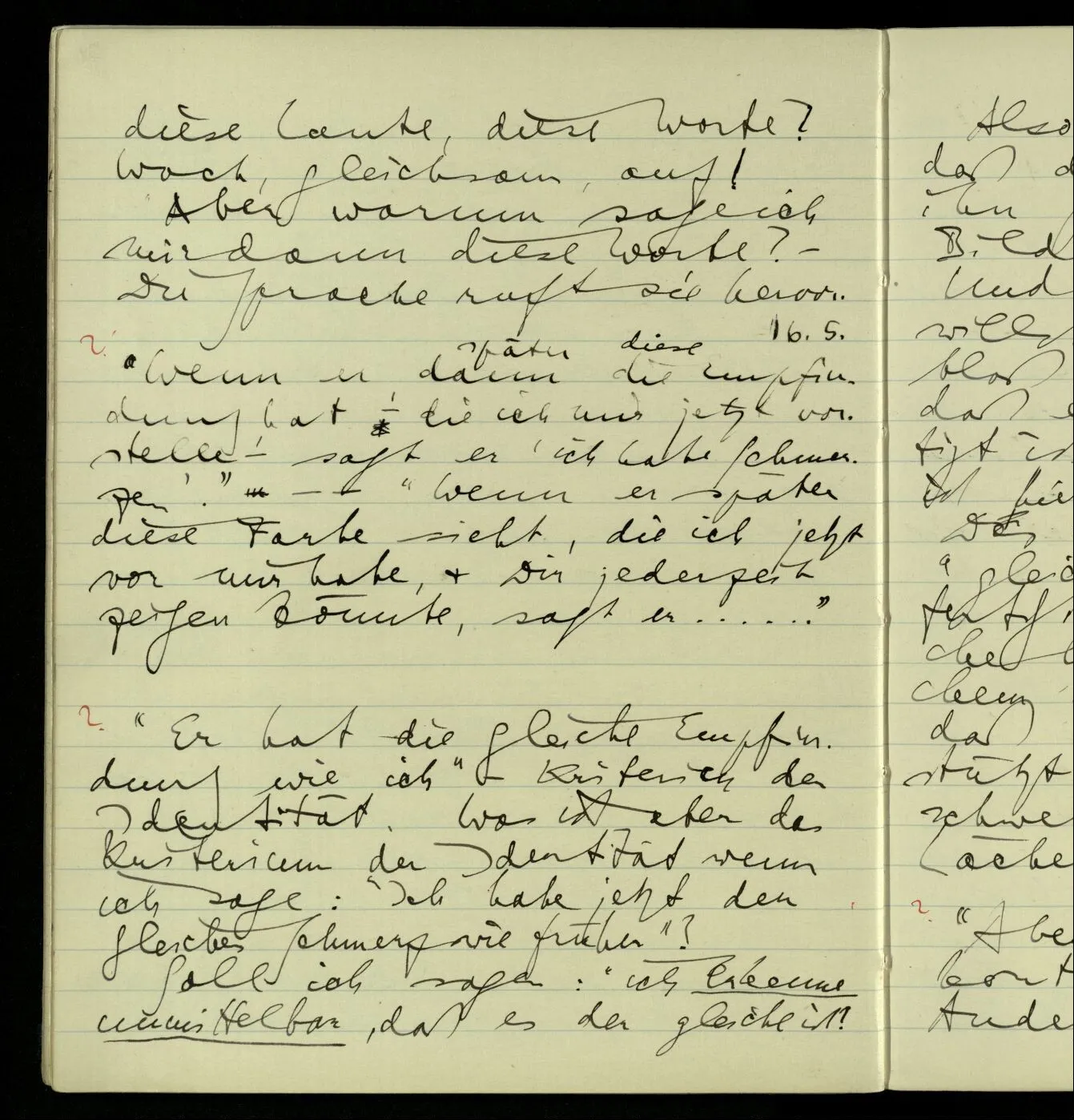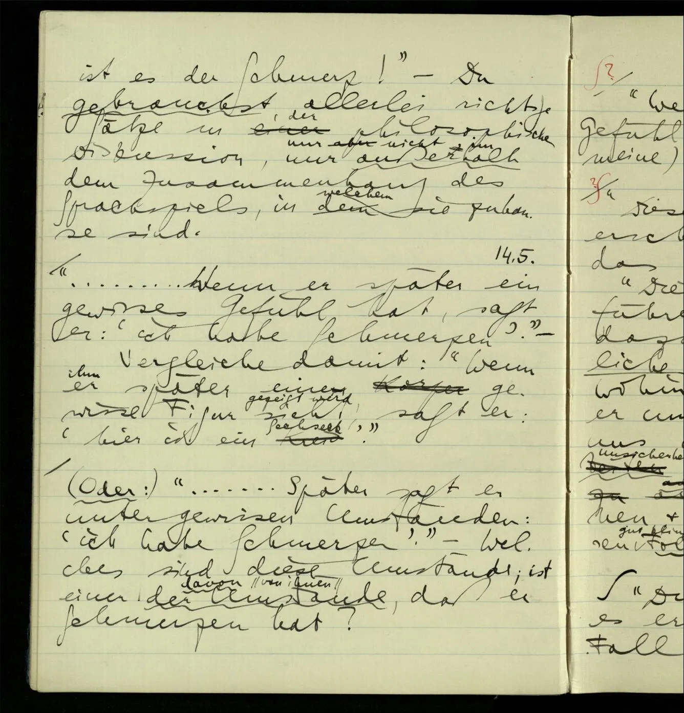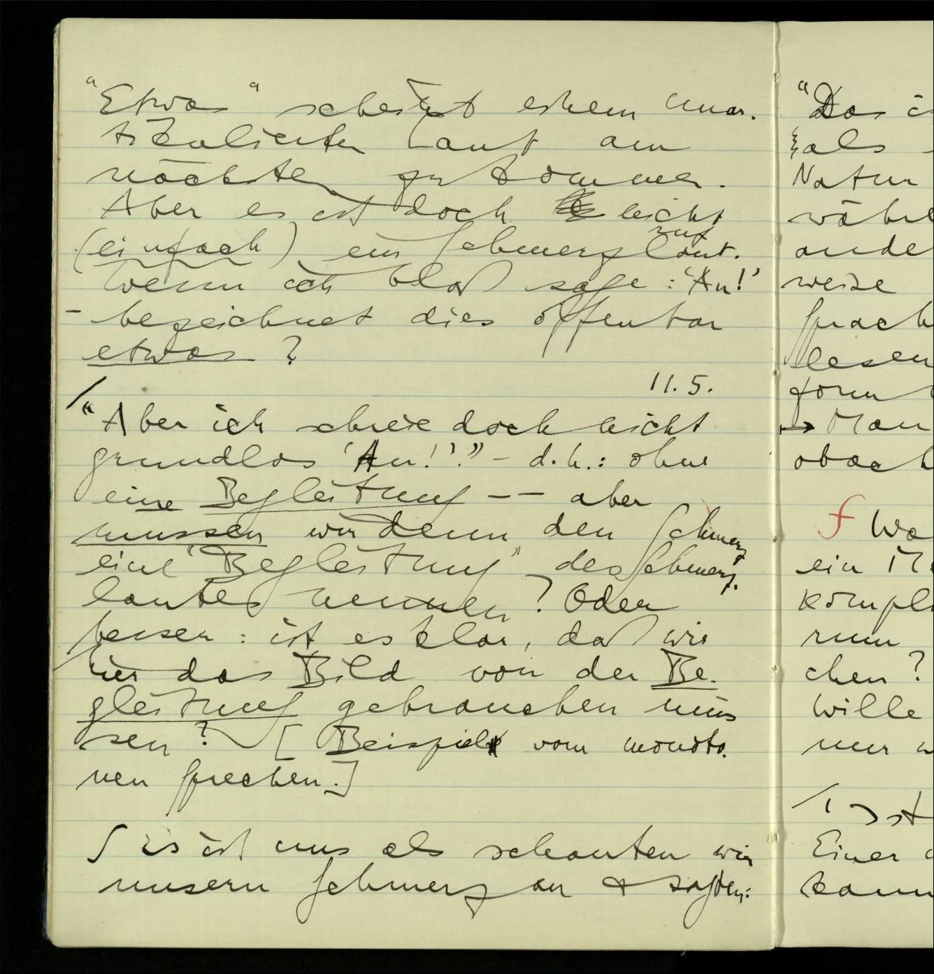11.05.1938 “Aber ich schreie doch nicht grundlos ‘Au!’” – d.h.: ohne eine Begleitung ‒ ‒ aber müssen wir denn den Schmerz eine “Begleitung” des Schmerzlautes nennen? Oder besser: ist es klar, daß wir hier das Bild von der Begleitung gebrauchen müssen?