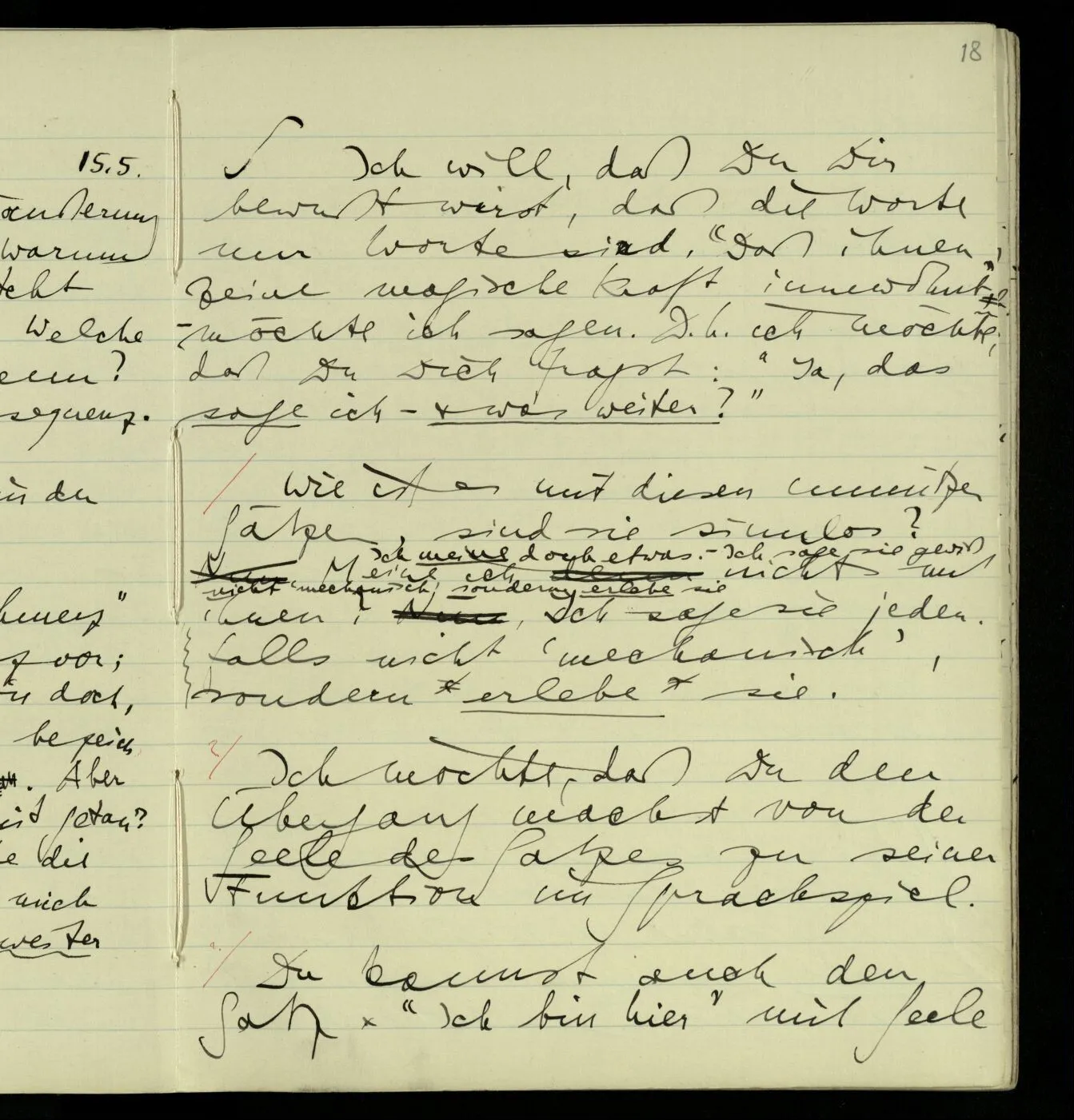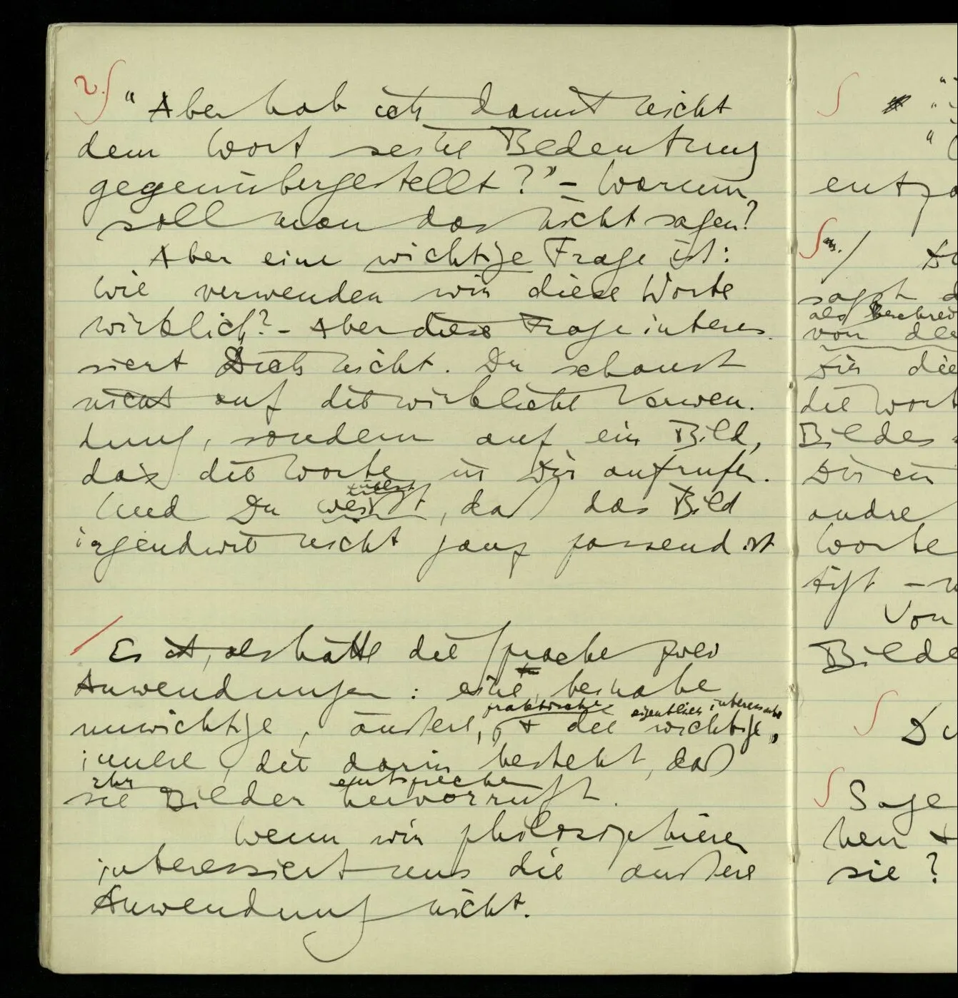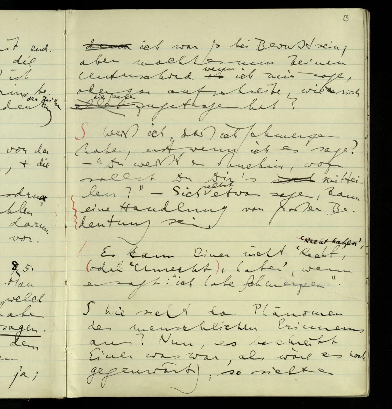 11.05.1938 “Aber ich schreie doch nicht grundlos ‘Au!’” – d.h.: ohne eine Begleitung ‒ ‒ aber müssen wir denn den Schmerz eine “Begleitung” des Schmerzlautes nennen? Oder besser: ist es klar, daß wir hier das Bild von der Begleitung gebrauchen müssen?