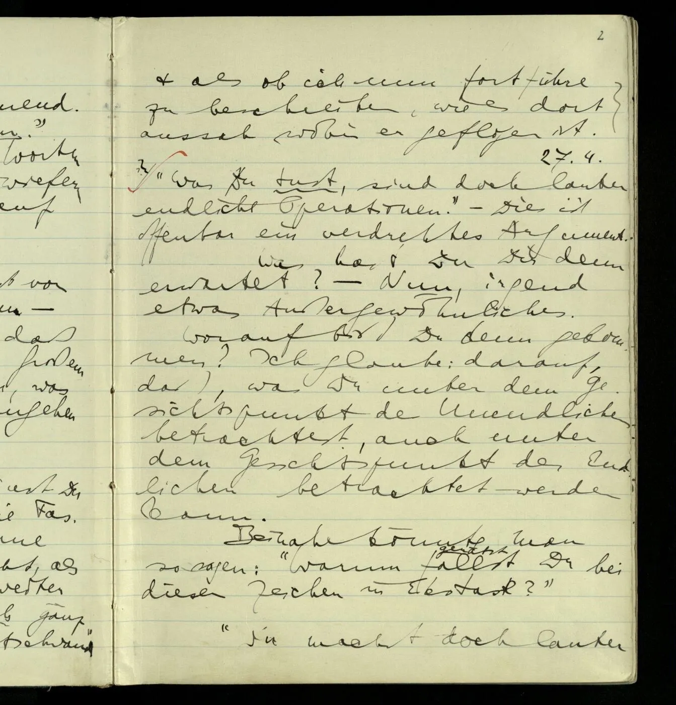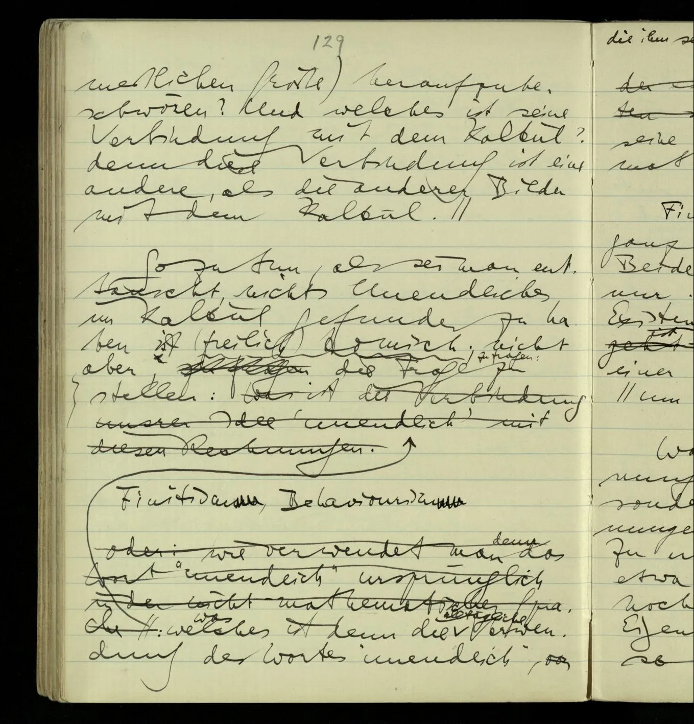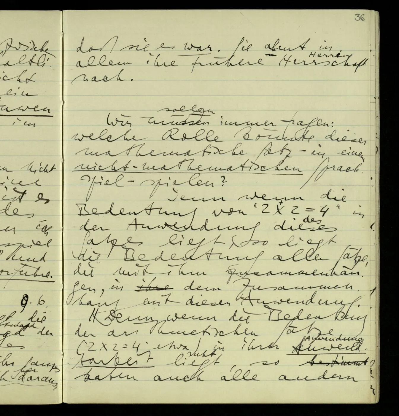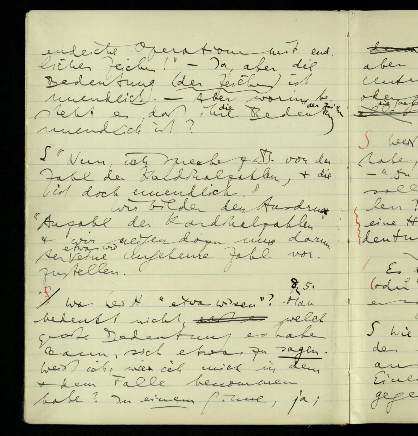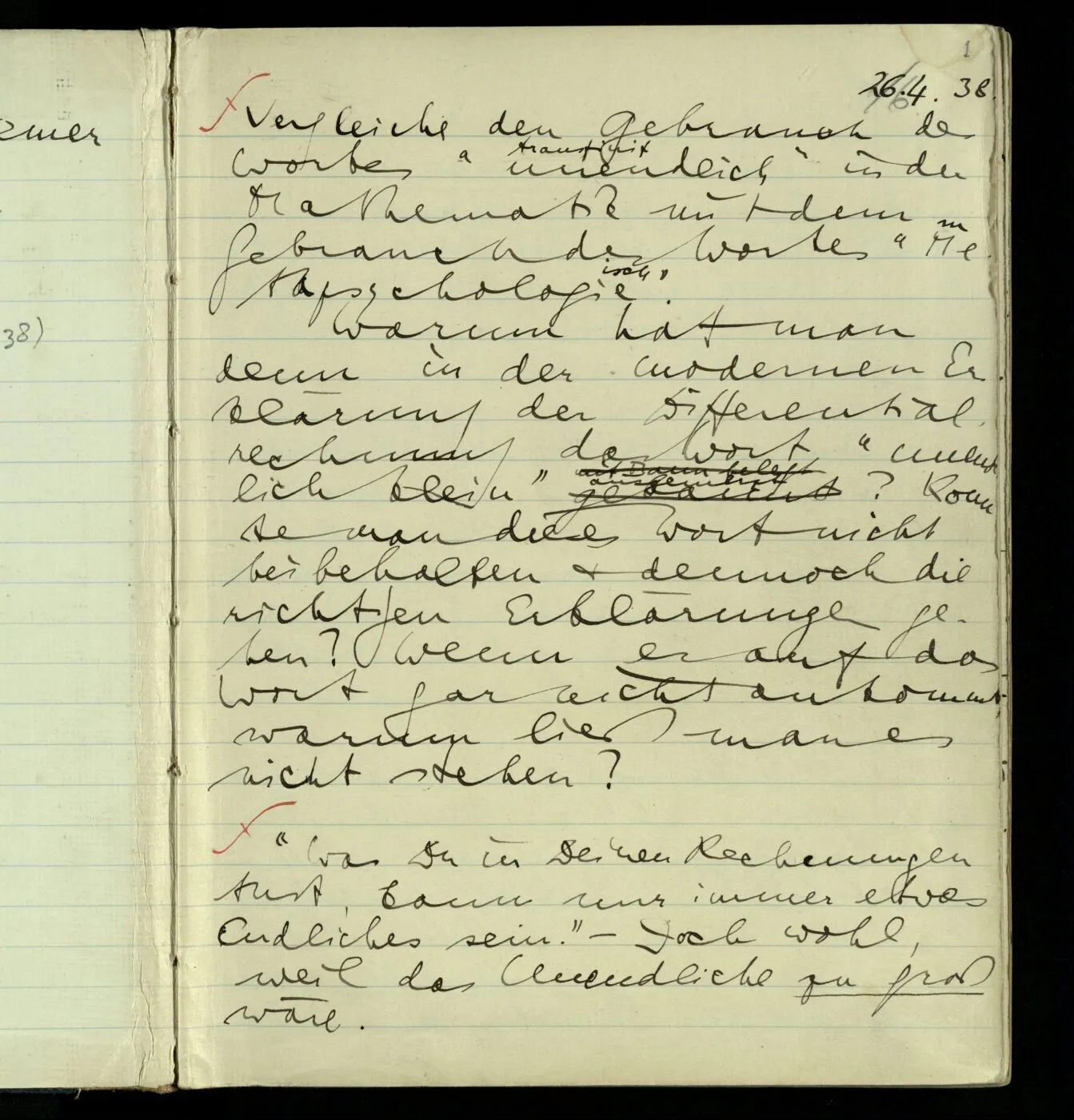 27.04.1938 “Was Du tust, sind doch lauter endliche Operationen.” – Dies ist offenbar ein verdrehtes Argument. Was hast Du Dir denn erwartet? – Nun, irgend etwas Außergewöhnliches. Worauf bist Du denn gekommen? Ich glaube: darauf, daß, was Du unter dem Gesichtspunkt des Unendlichen betrachtest, auch unter dem Gesichtspunkt des Endlichen betrachtet werden kann. Beinahe könnte man so sagen: “Warum fällst Du bei diesen Zeichen in Ekstase?”