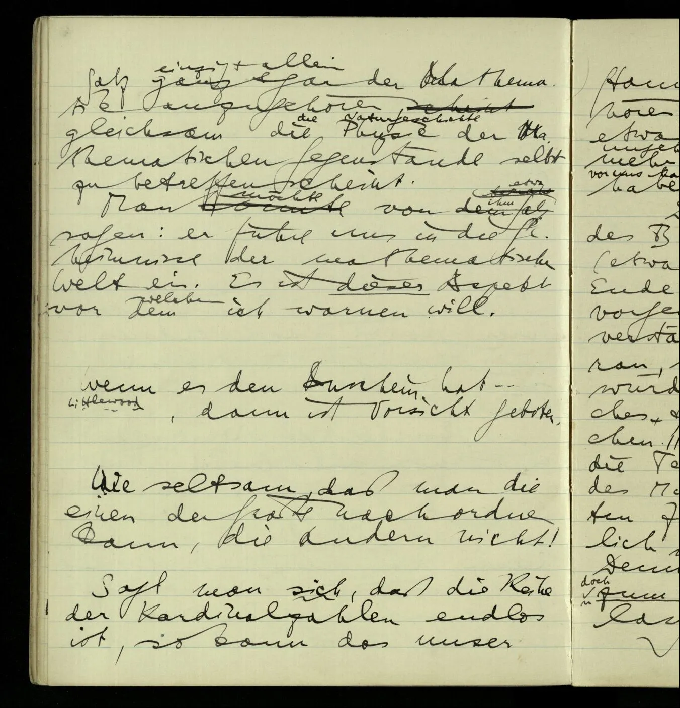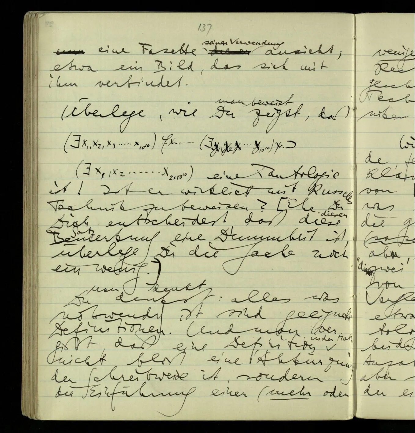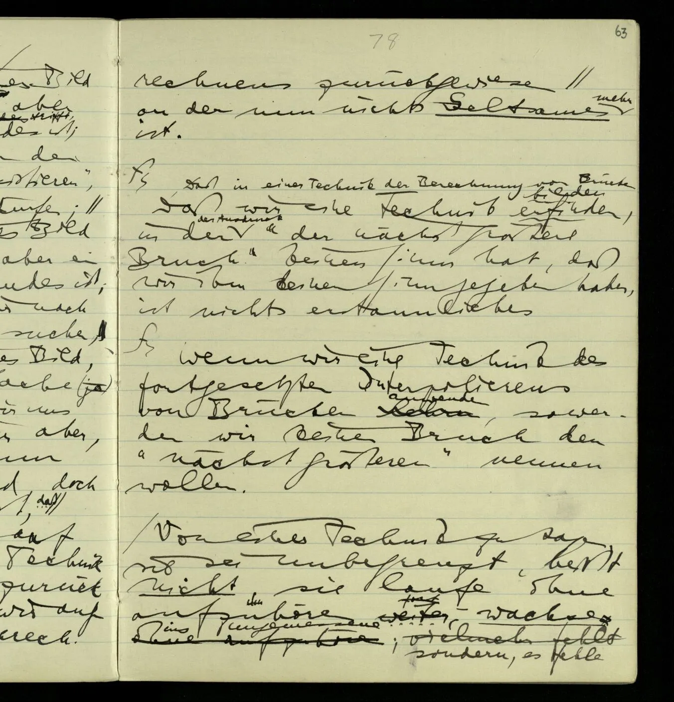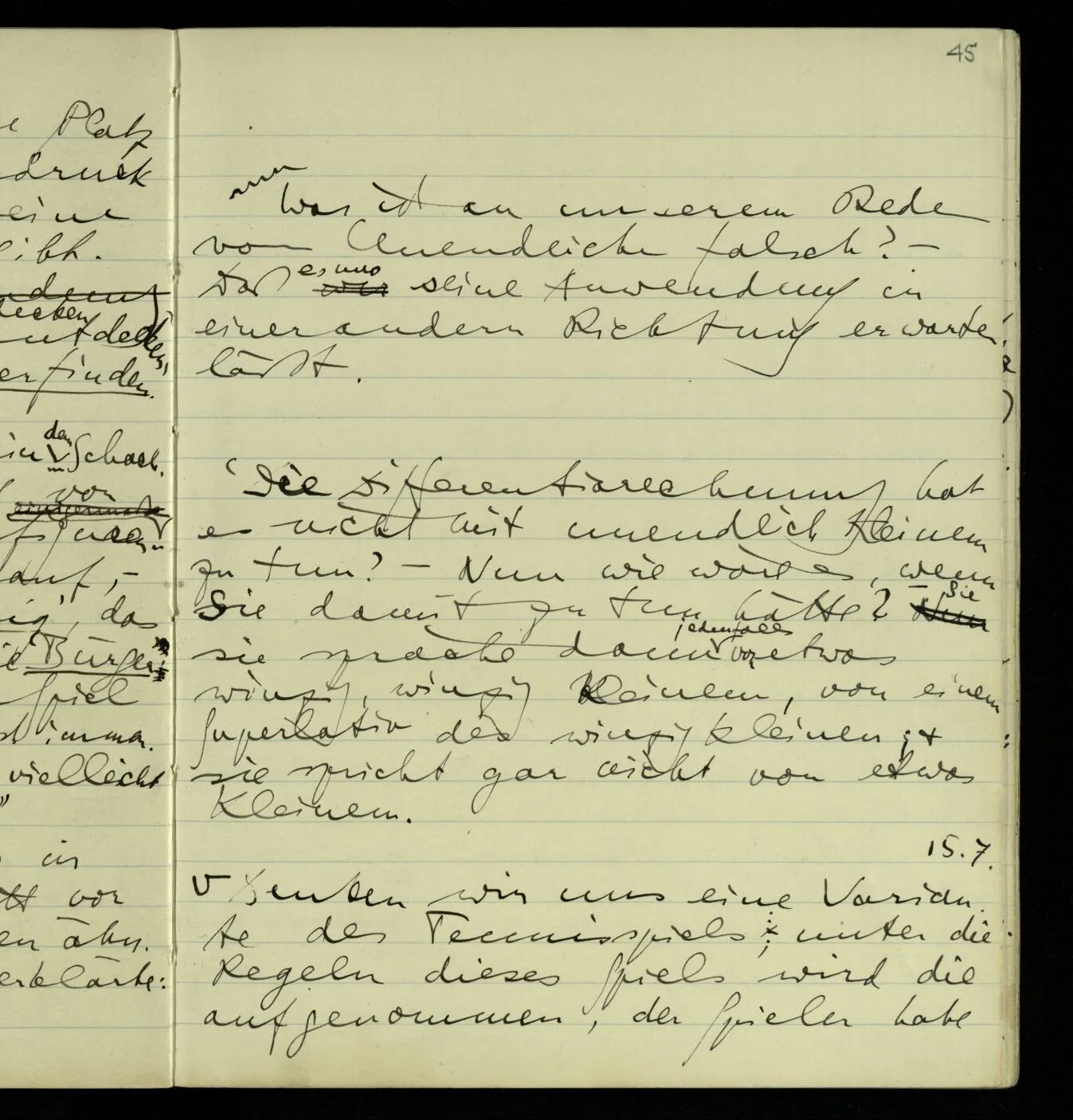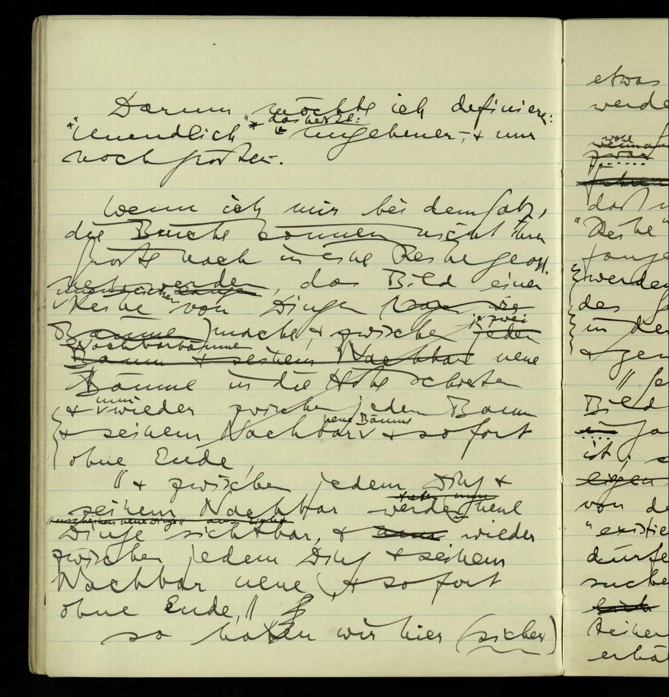 27.04.1938 “Was Du tust, sind doch lauter endliche Operationen.” – Dies ist offenbar ein verdrehtes Argument. Was hast Du Dir denn erwartet? – Nun, irgend etwas Außergewöhnliches. Worauf bist Du denn gekommen? Ich glaube: darauf, daß, was Du unter dem Gesichtspunkt des Unendlichen betrachtest, auch unter dem Gesichtspunkt des Endlichen betrachtet werden kann. Beinahe könnte man so sagen: “Warum fällst Du bei diesen Zeichen in Ekstase?”
