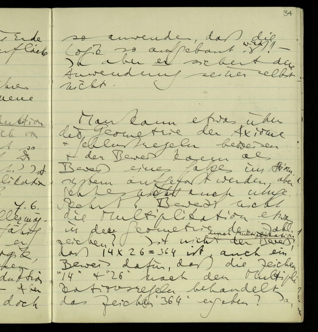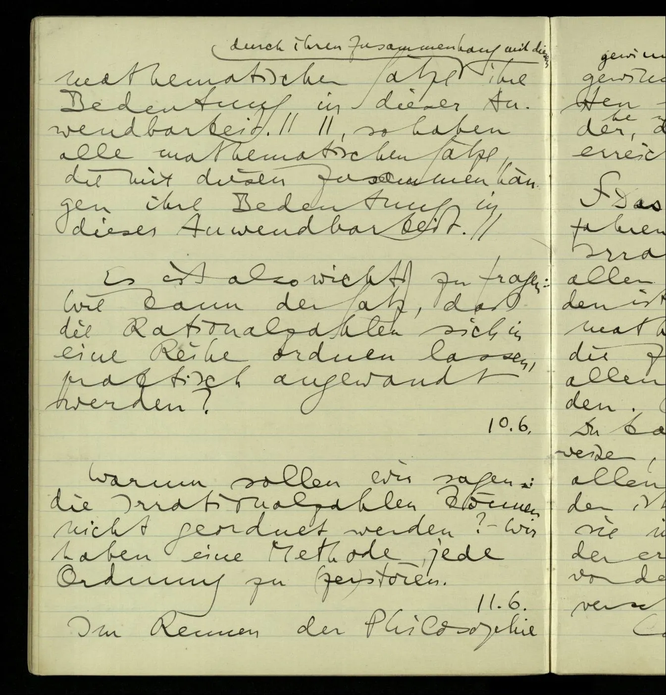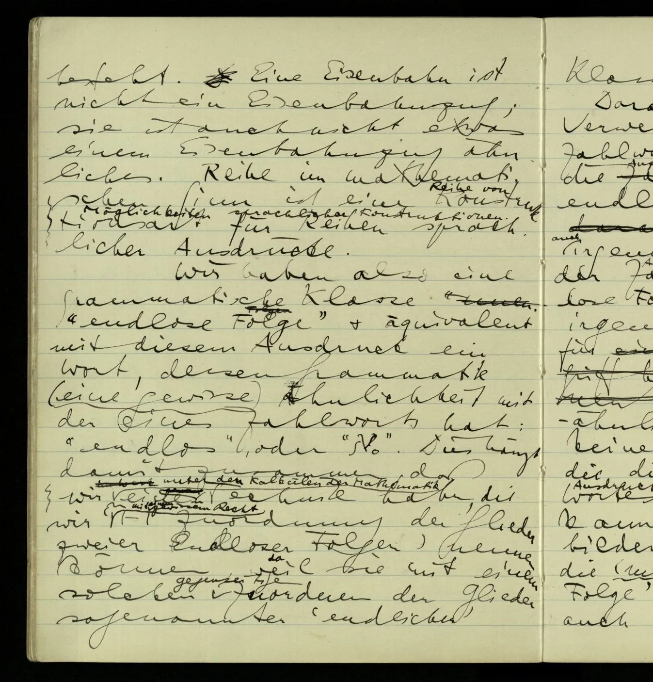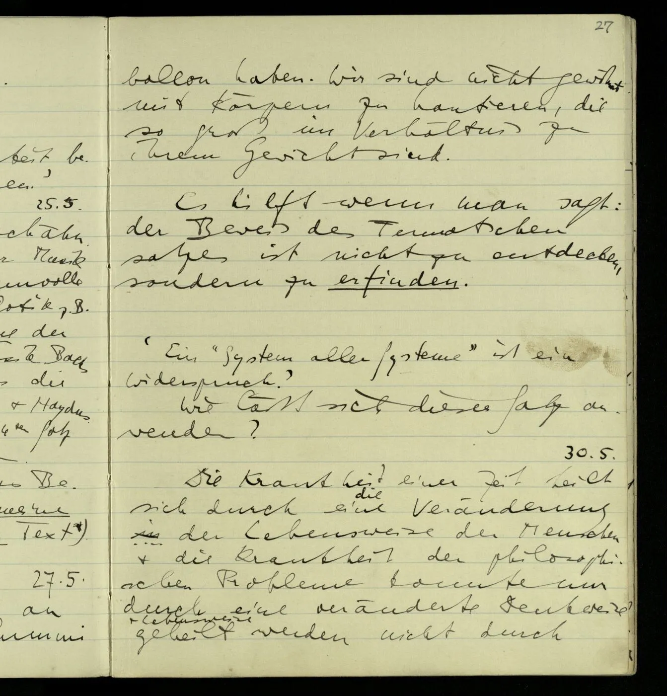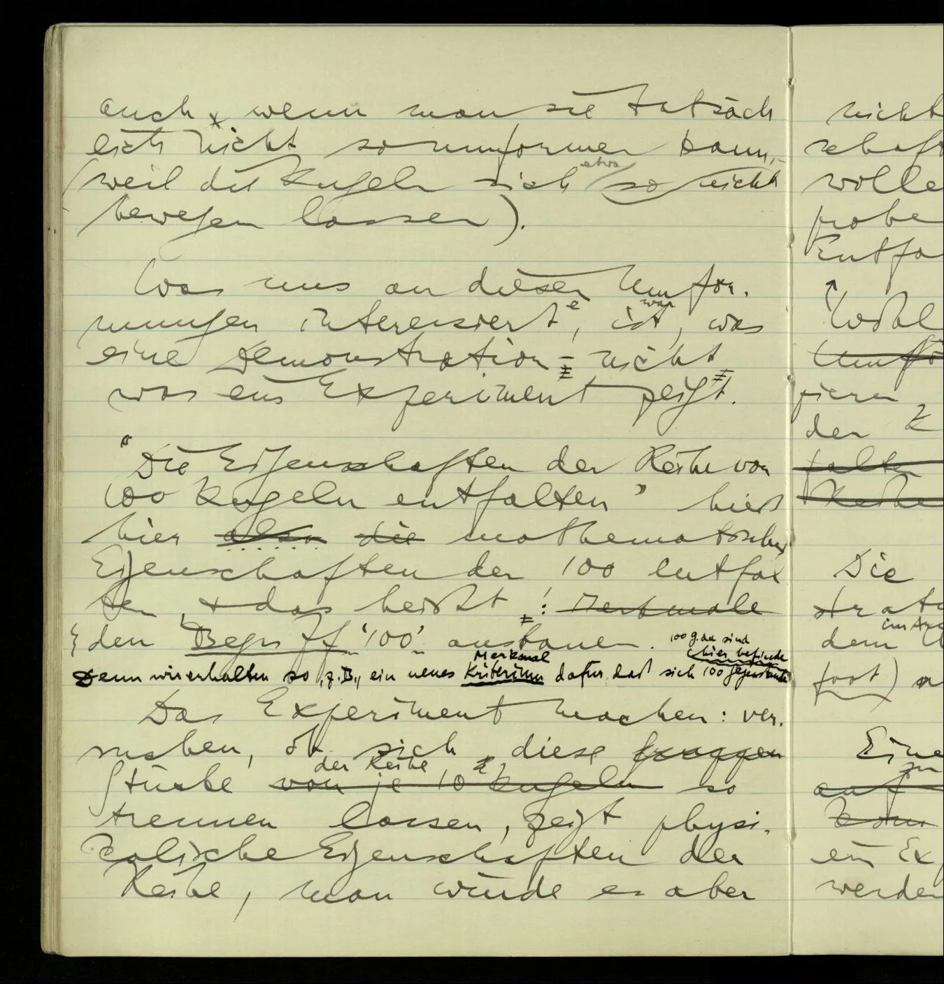 27.04.1938 “Was Du tust, sind doch lauter endliche Operationen.” – Dies ist offenbar ein verdrehtes Argument. Was hast Du Dir denn erwartet? – Nun, irgend etwas Außergewöhnliches. Worauf bist Du denn gekommen? Ich glaube: darauf, daß, was Du unter dem Gesichtspunkt des Unendlichen betrachtest, auch unter dem Gesichtspunkt des Endlichen betrachtet werden kann. Beinahe könnte man so sagen: “Warum fällst Du bei diesen Zeichen in Ekstase?”