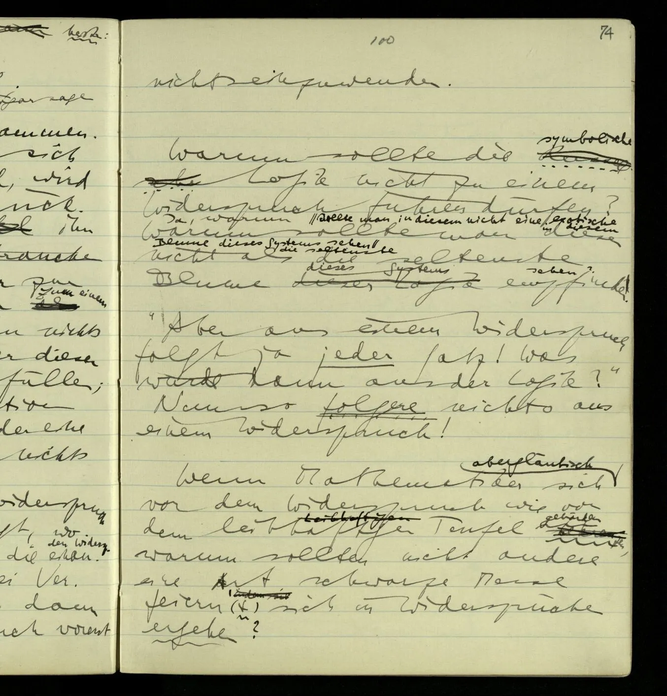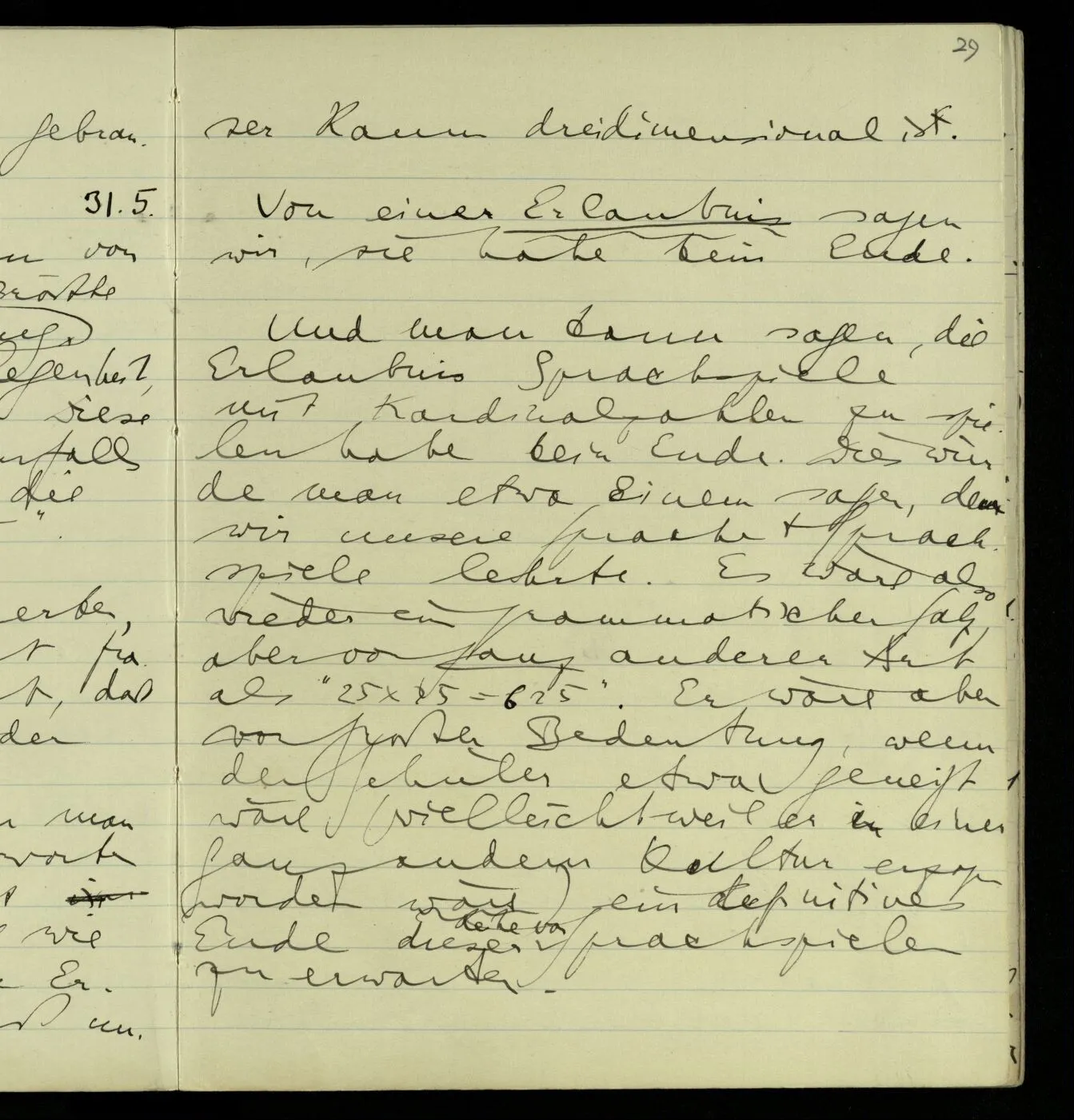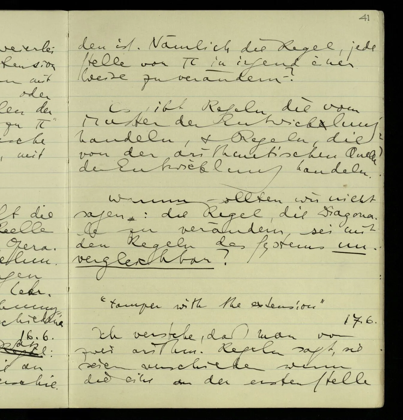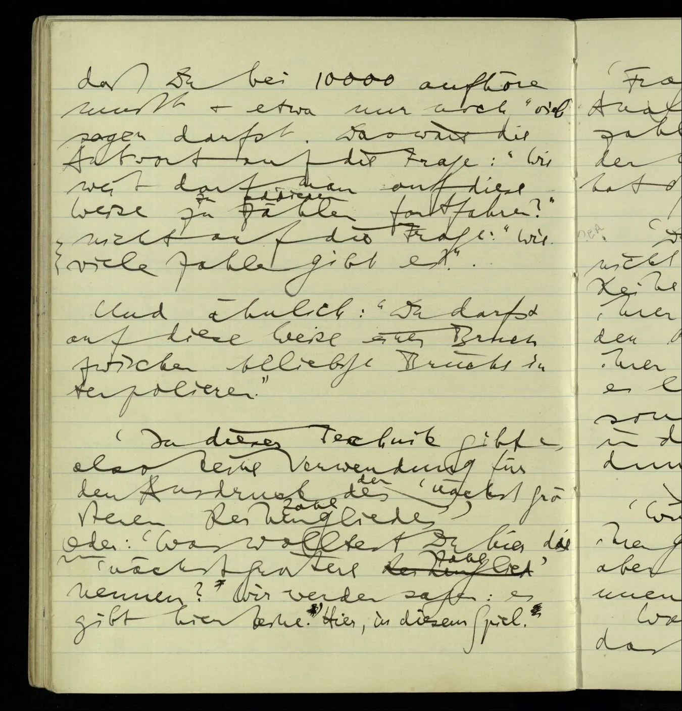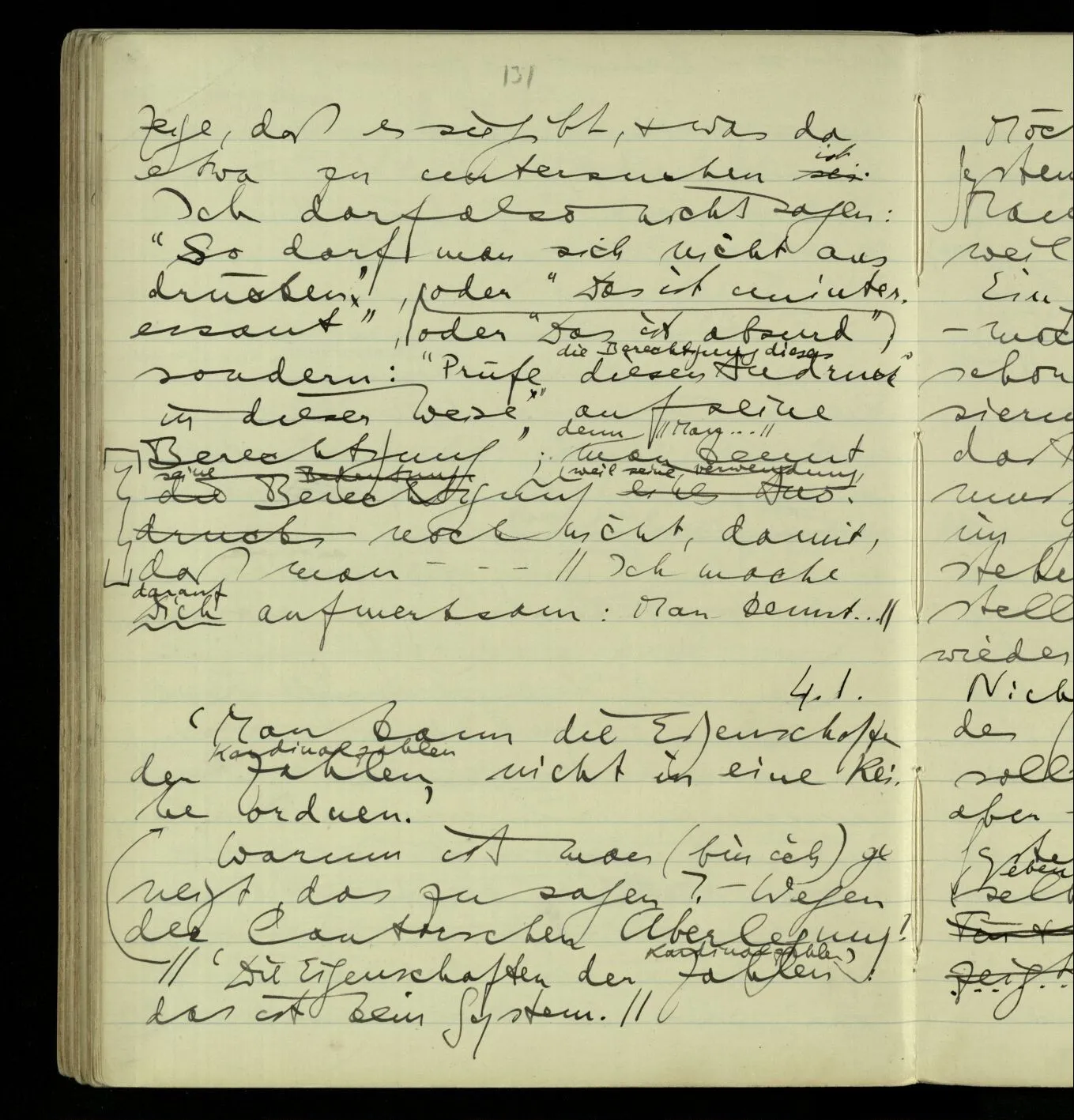 27.04.1938 “Was Du tust, sind doch lauter endliche Operationen.” – Dies ist offenbar ein verdrehtes Argument. Was hast Du Dir denn erwartet? – Nun, irgend etwas Außergewöhnliches. Worauf bist Du denn gekommen? Ich glaube: darauf, daß, was Du unter dem Gesichtspunkt des Unendlichen betrachtest, auch unter dem Gesichtspunkt des Endlichen betrachtet werden kann. Beinahe könnte man so sagen: “Warum fällst Du bei diesen Zeichen in Ekstase?”