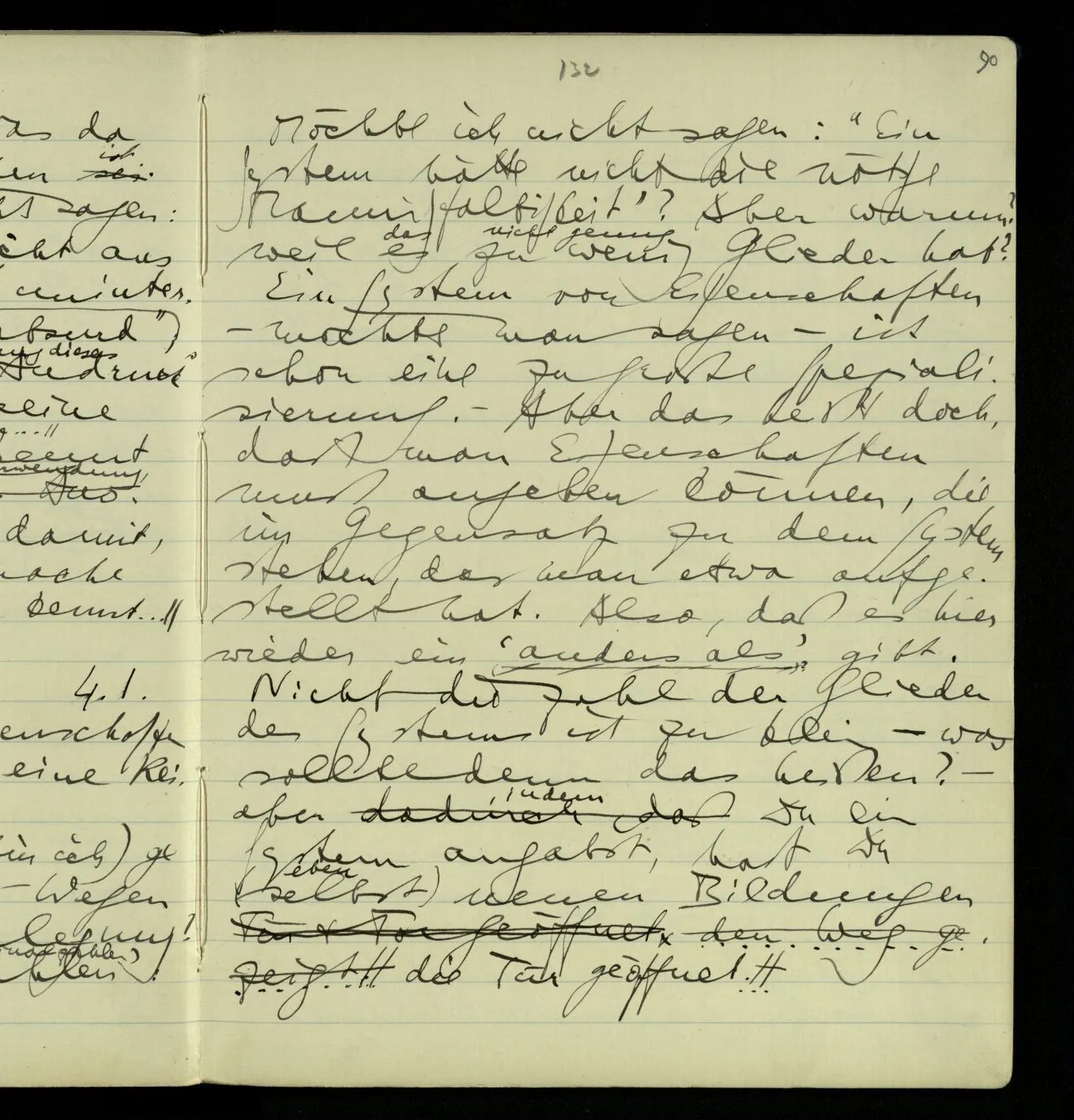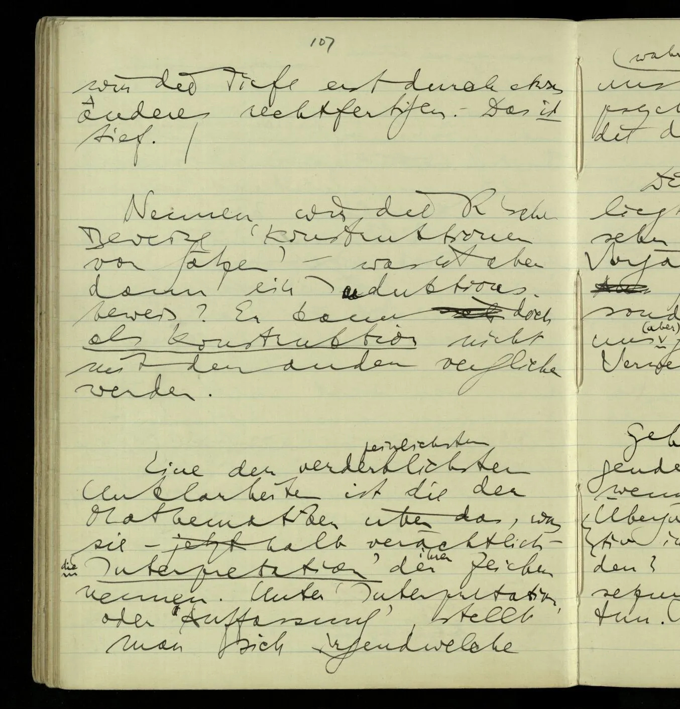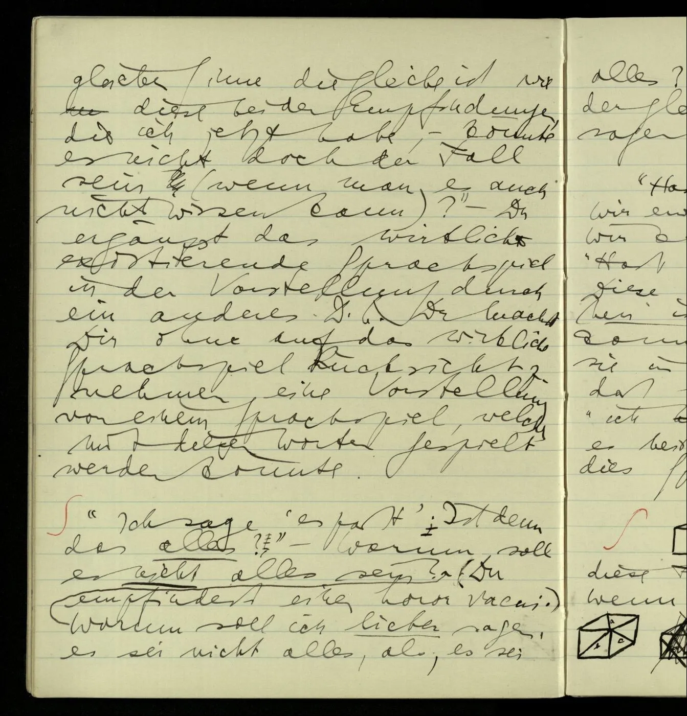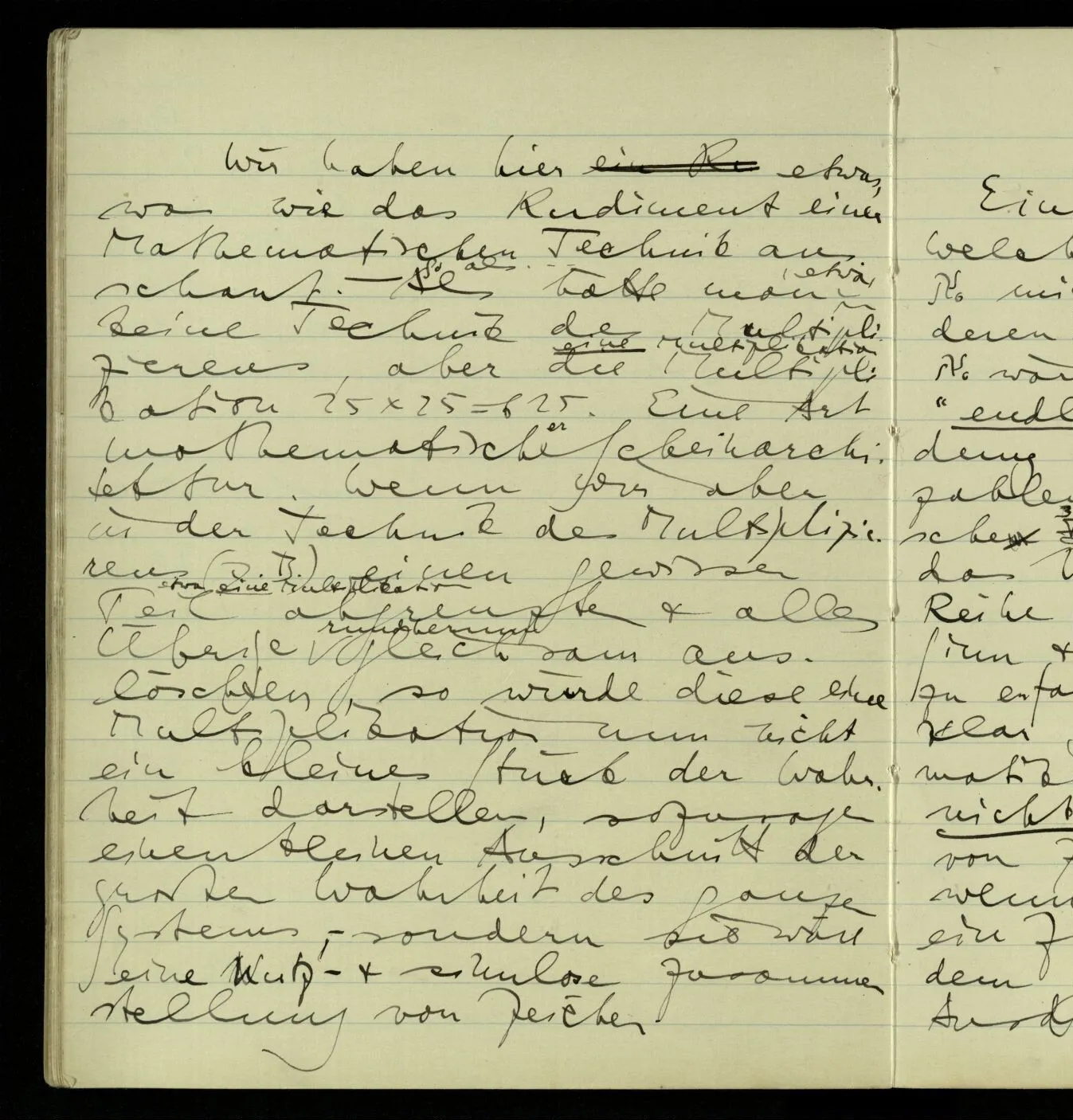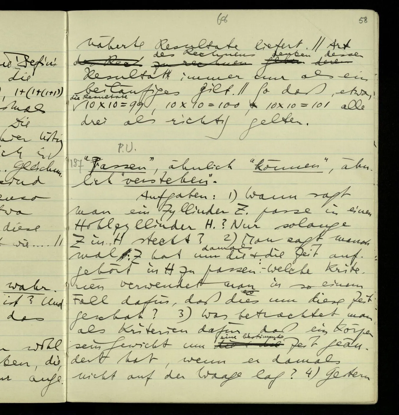 27.04.1938 “Was Du tust, sind doch lauter endliche Operationen.” – Dies ist offenbar ein verdrehtes Argument. Was hast Du Dir denn erwartet? – Nun, irgend etwas Außergewöhnliches. Worauf bist Du denn gekommen? Ich glaube: darauf, daß, was Du unter dem Gesichtspunkt des Unendlichen betrachtest, auch unter dem Gesichtspunkt des Endlichen betrachtet werden kann. Beinahe könnte man so sagen: “Warum fällst Du bei diesen Zeichen in Ekstase?”
