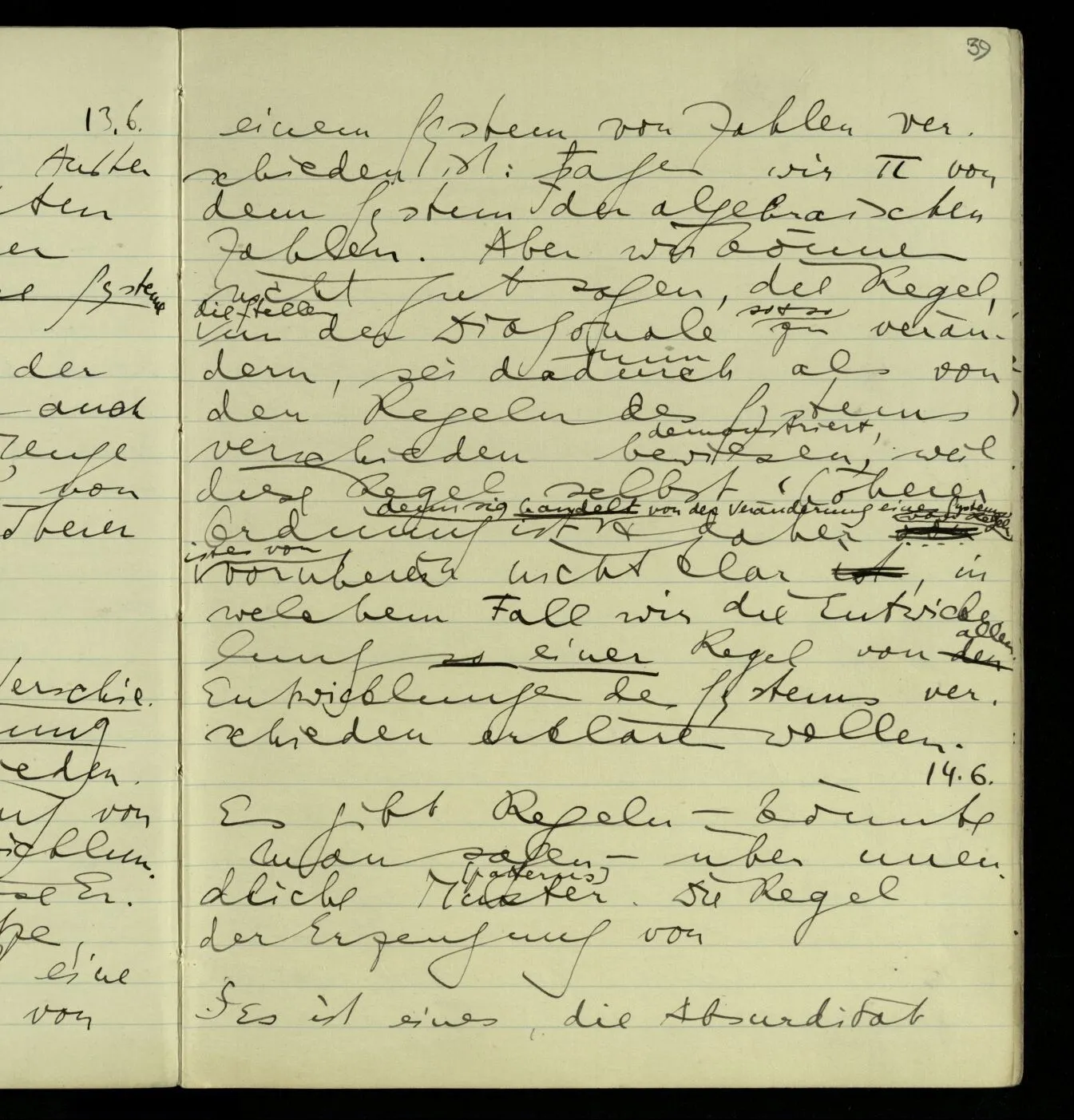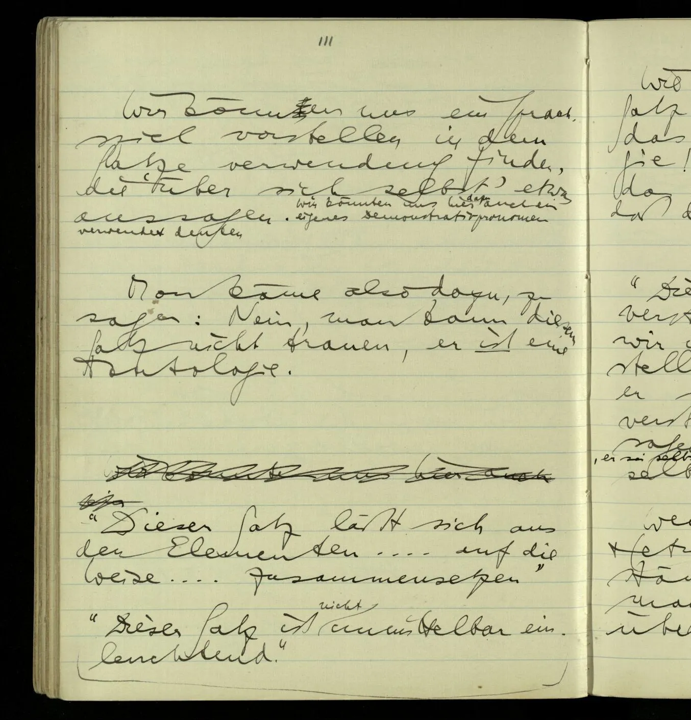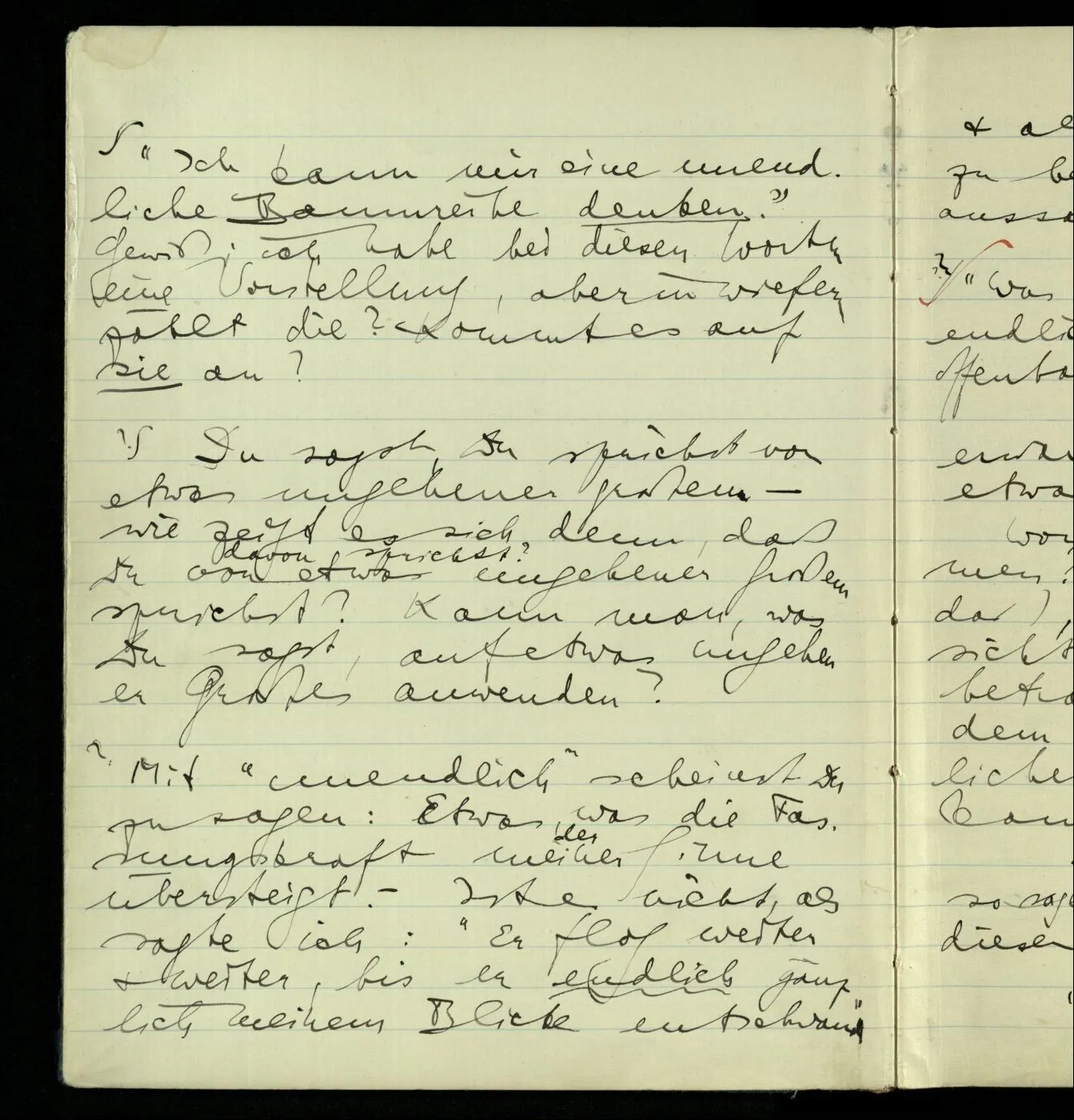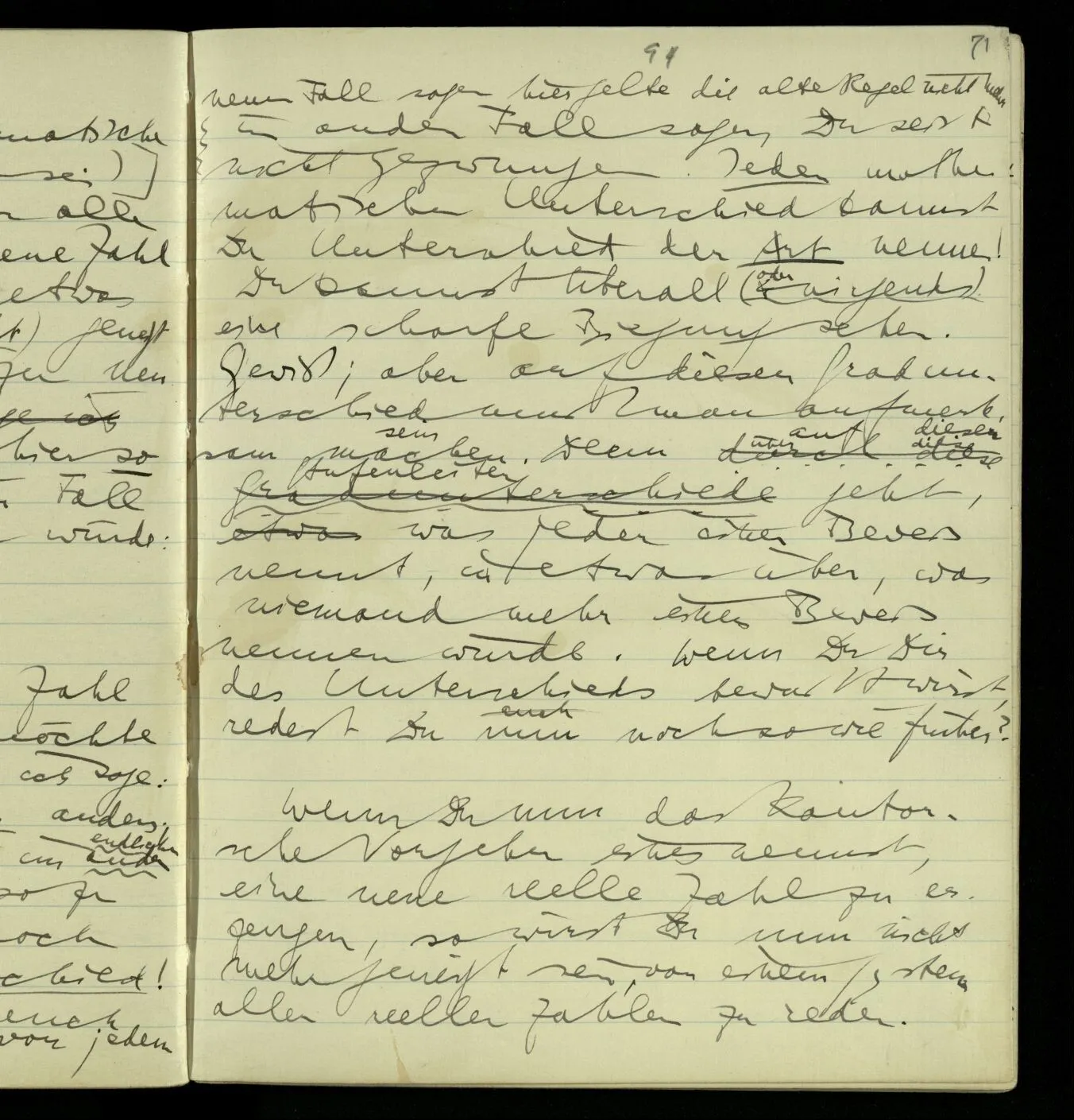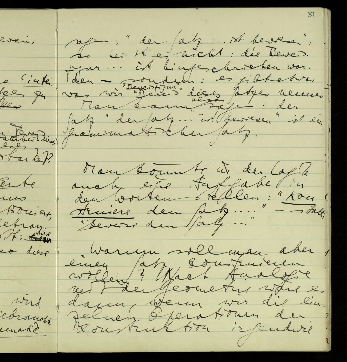 27.04.1938 “Was Du tust, sind doch lauter endliche Operationen.” – Dies ist offenbar ein verdrehtes Argument. Was hast Du Dir denn erwartet? – Nun, irgend etwas Außergewöhnliches. Worauf bist Du denn gekommen? Ich glaube: darauf, daß, was Du unter dem Gesichtspunkt des Unendlichen betrachtest, auch unter dem Gesichtspunkt des Endlichen betrachtet werden kann. Beinahe könnte man so sagen: “Warum fällst Du bei diesen Zeichen in Ekstase?”