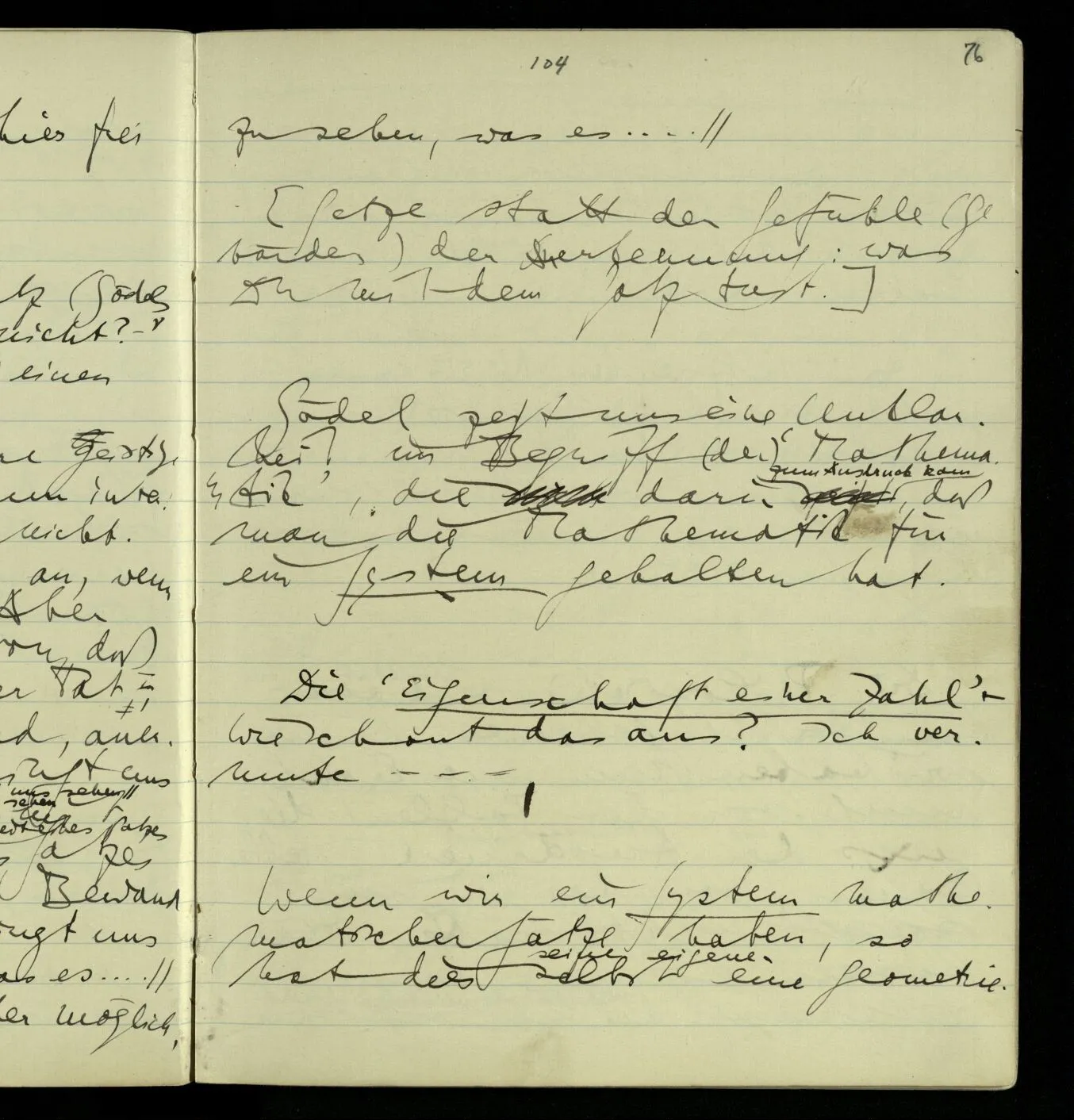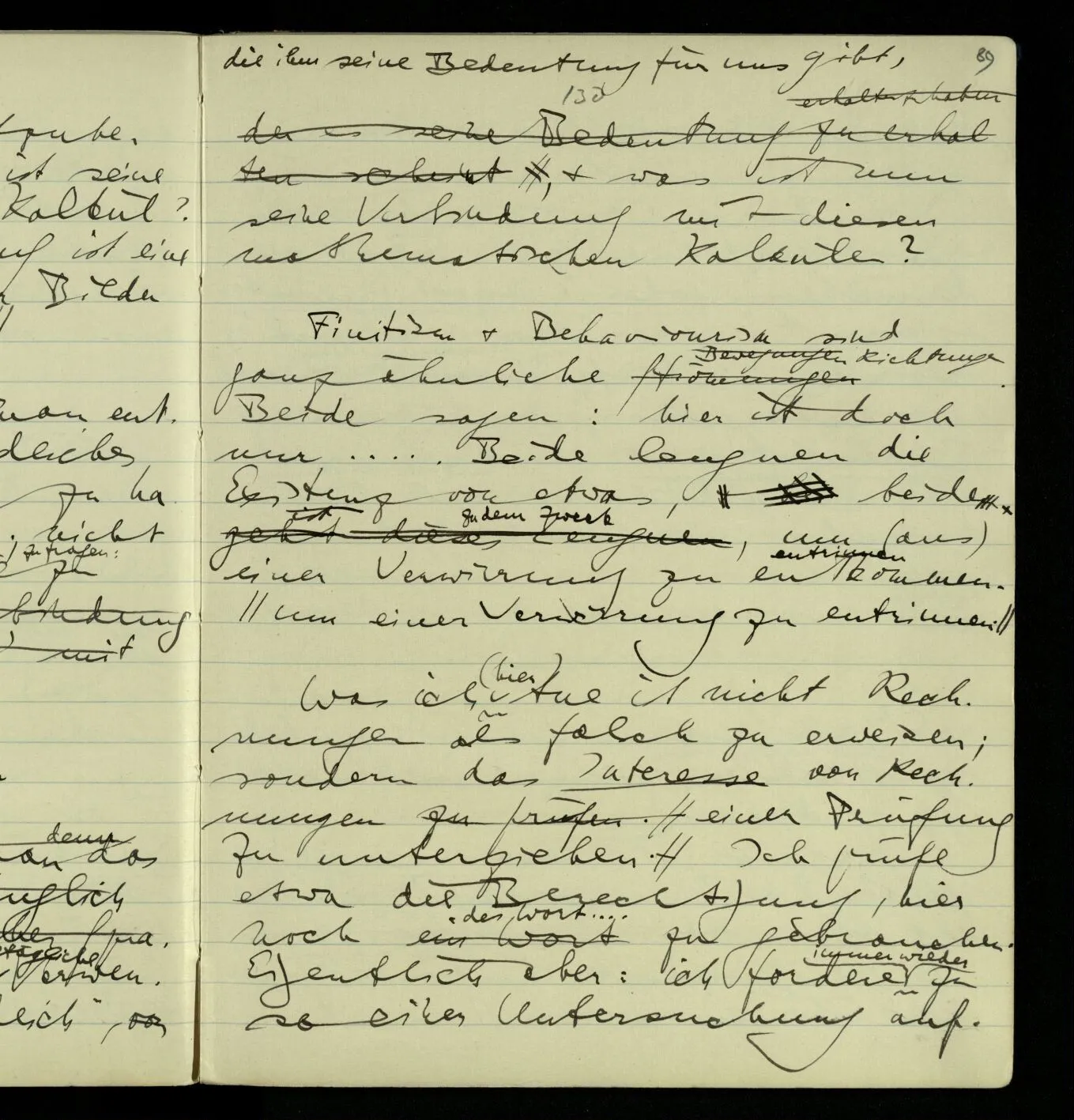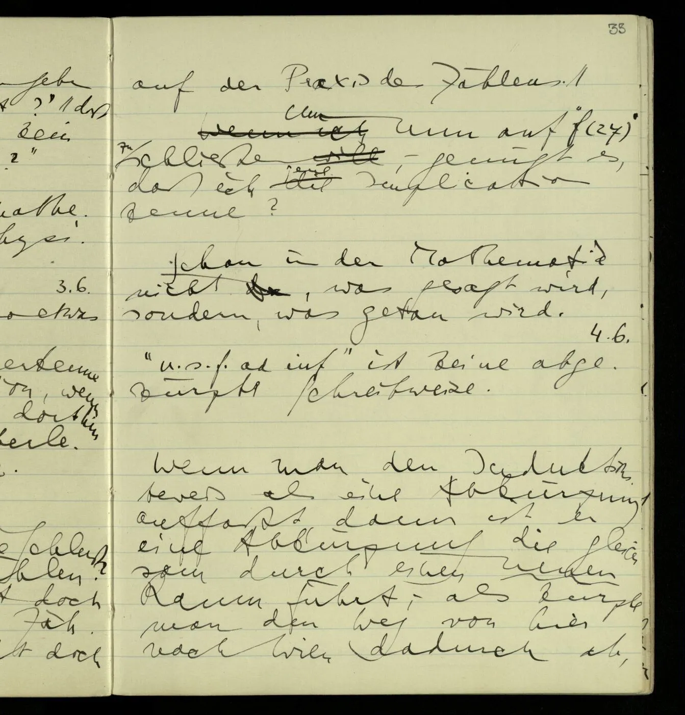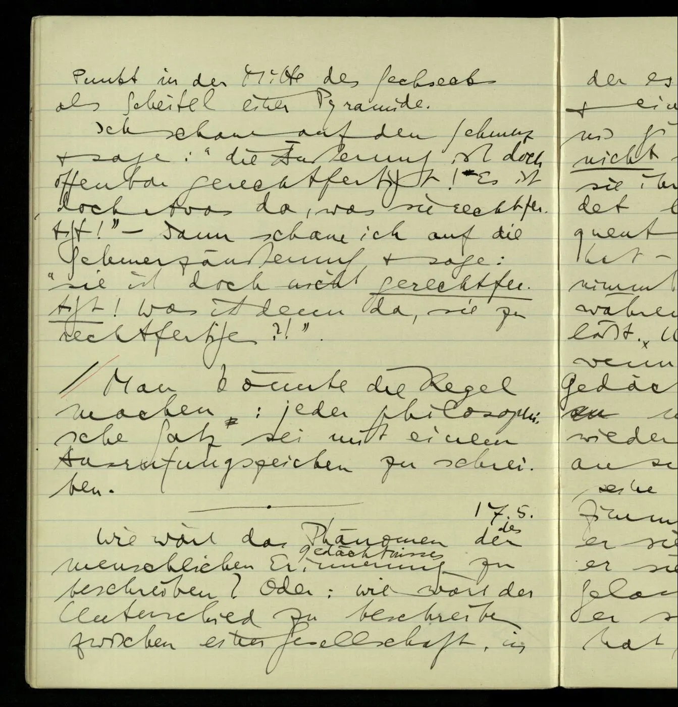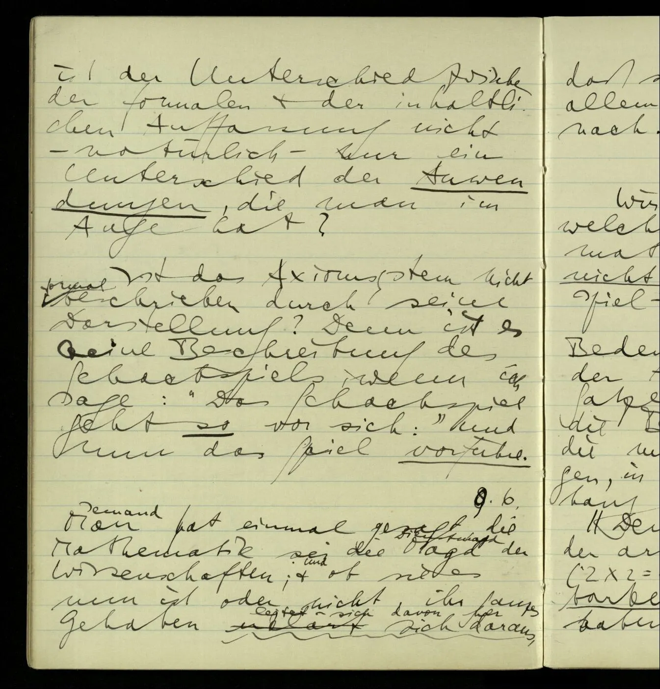 27.04.1938 “Was Du tust, sind doch lauter endliche Operationen.” – Dies ist offenbar ein verdrehtes Argument. Was hast Du Dir denn erwartet? – Nun, irgend etwas Außergewöhnliches. Worauf bist Du denn gekommen? Ich glaube: darauf, daß, was Du unter dem Gesichtspunkt des Unendlichen betrachtest, auch unter dem Gesichtspunkt des Endlichen betrachtet werden kann. Beinahe könnte man so sagen: “Warum fällst Du bei diesen Zeichen in Ekstase?”