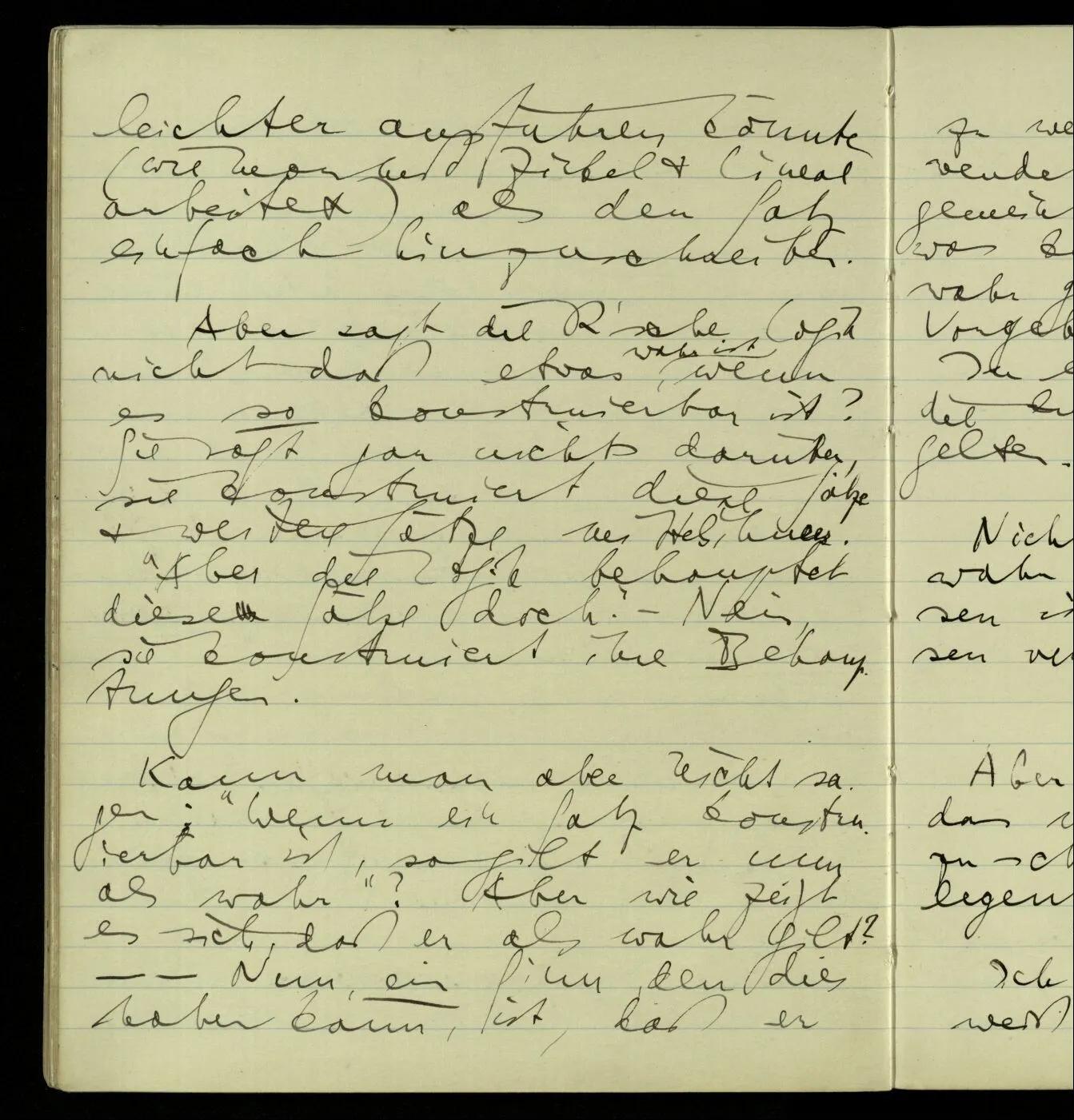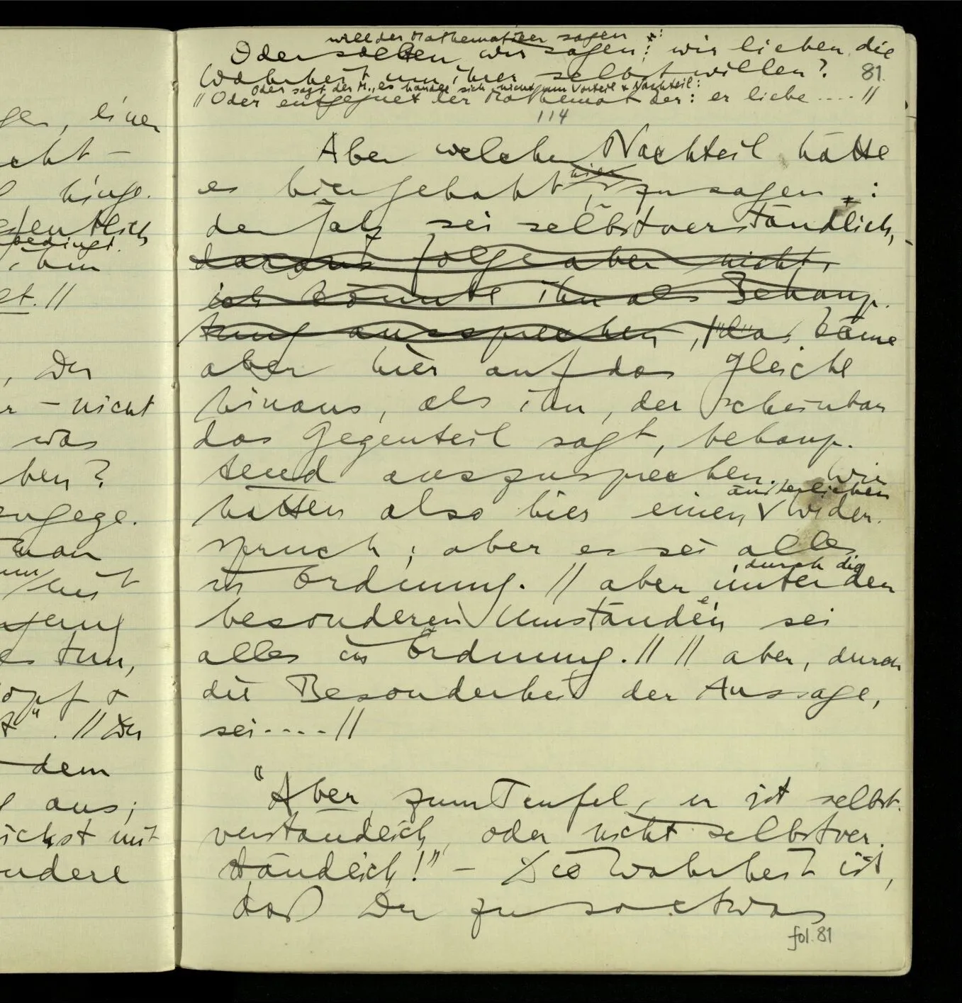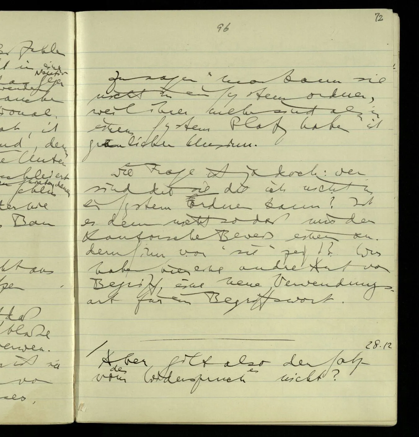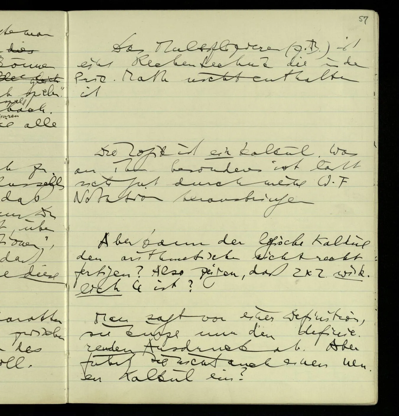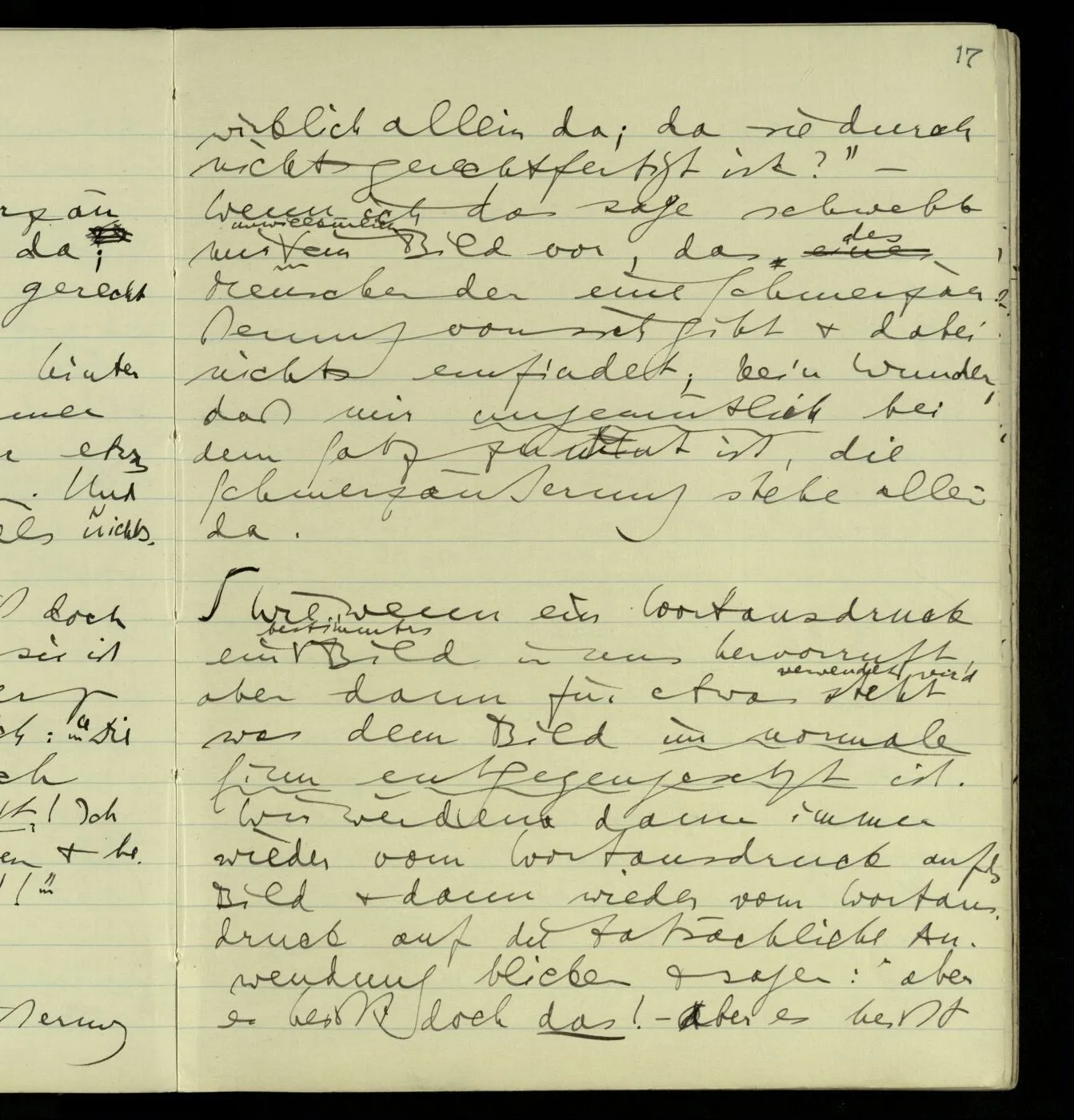 27.04.1938 “Was Du tust, sind doch lauter endliche Operationen.” – Dies ist offenbar ein verdrehtes Argument. Was hast Du Dir denn erwartet? – Nun, irgend etwas Außergewöhnliches. Worauf bist Du denn gekommen? Ich glaube: darauf, daß, was Du unter dem Gesichtspunkt des Unendlichen betrachtest, auch unter dem Gesichtspunkt des Endlichen betrachtet werden kann. Beinahe könnte man so sagen: “Warum fällst Du bei diesen Zeichen in Ekstase?”