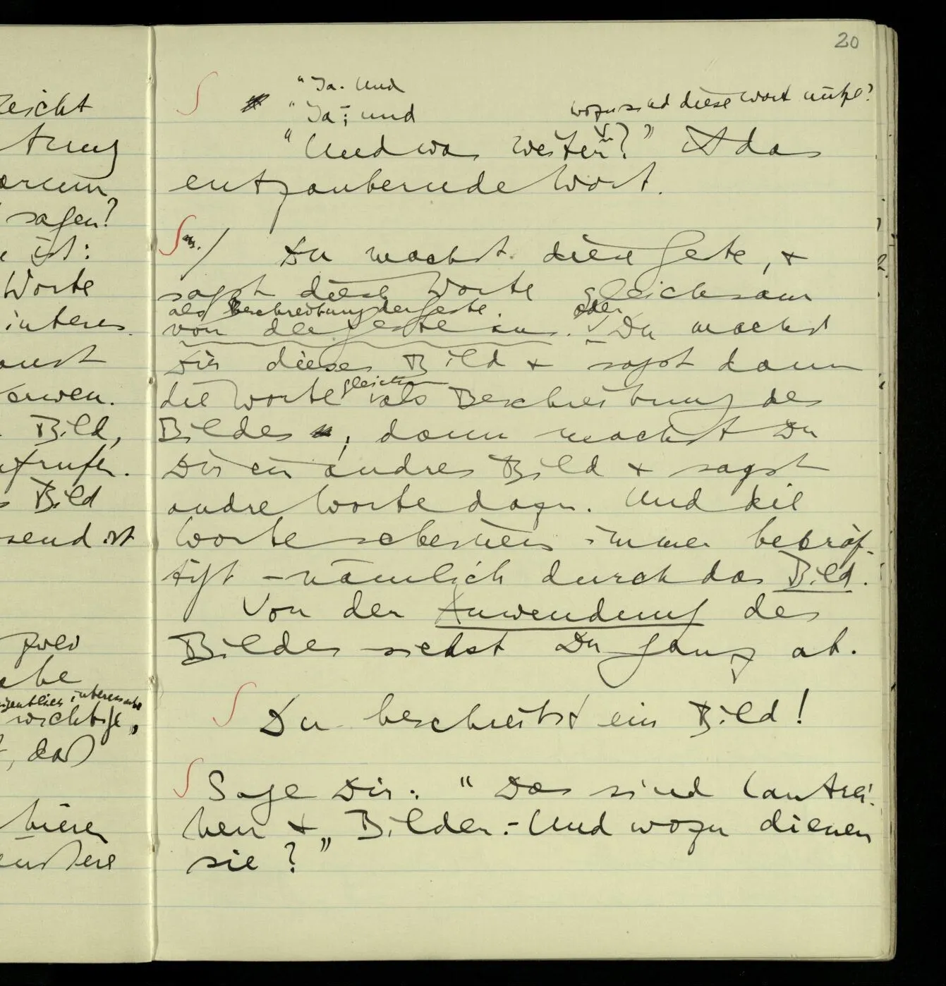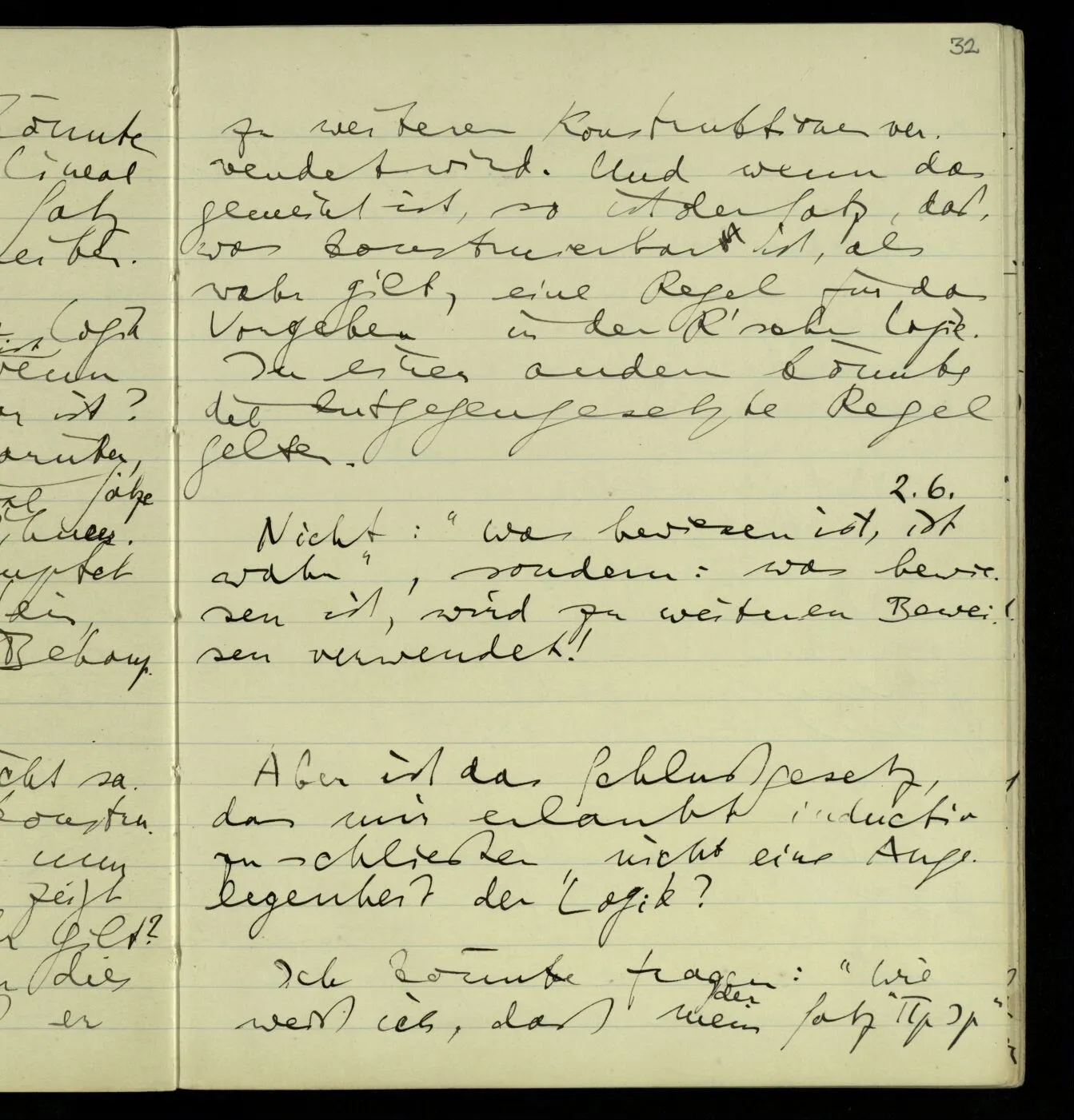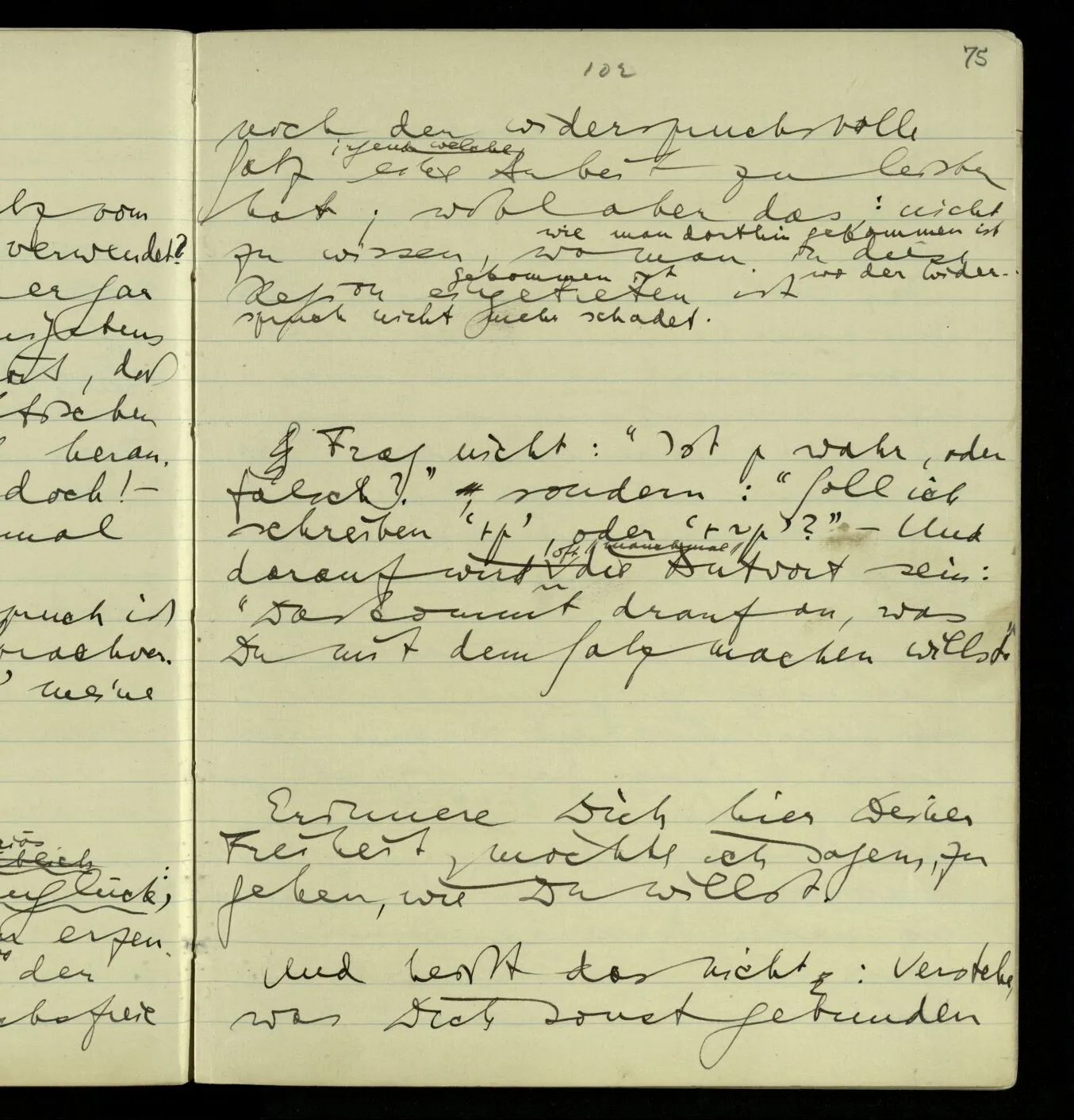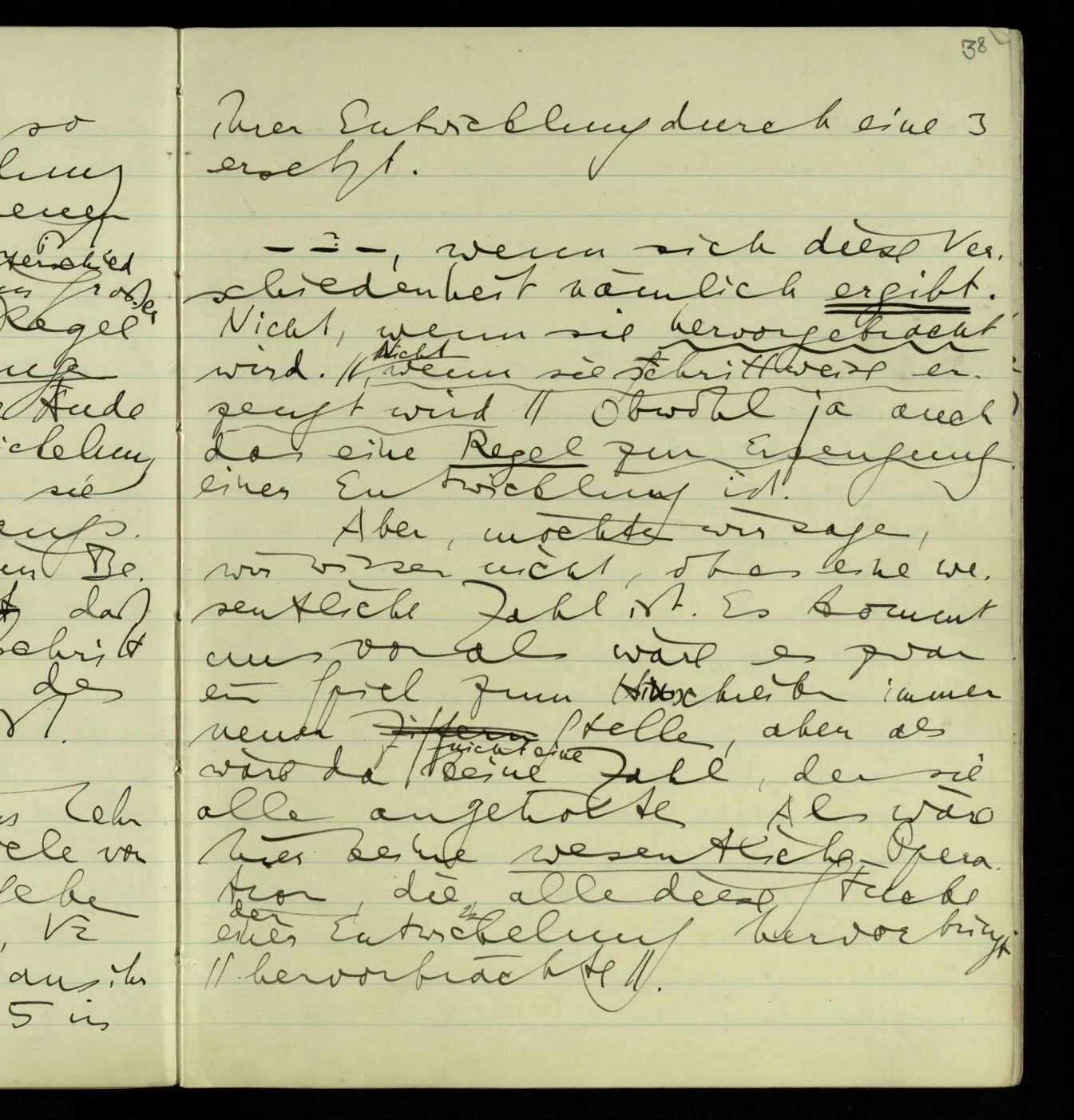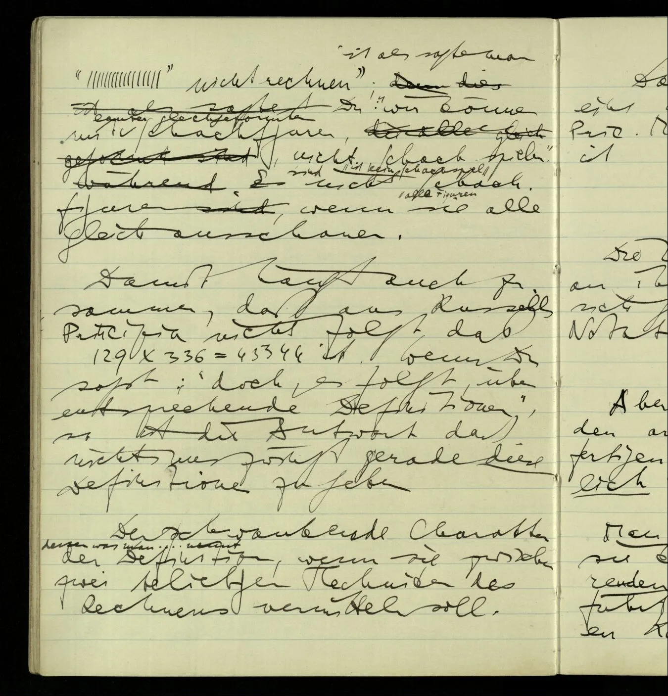 27.04.1938 “Was Du tust, sind doch lauter endliche Operationen.” – Dies ist offenbar ein verdrehtes Argument. Was hast Du Dir denn erwartet? – Nun, irgend etwas Außergewöhnliches. Worauf bist Du denn gekommen? Ich glaube: darauf, daß, was Du unter dem Gesichtspunkt des Unendlichen betrachtest, auch unter dem Gesichtspunkt des Endlichen betrachtet werden kann. Beinahe könnte man so sagen: “Warum fällst Du bei diesen Zeichen in Ekstase?”