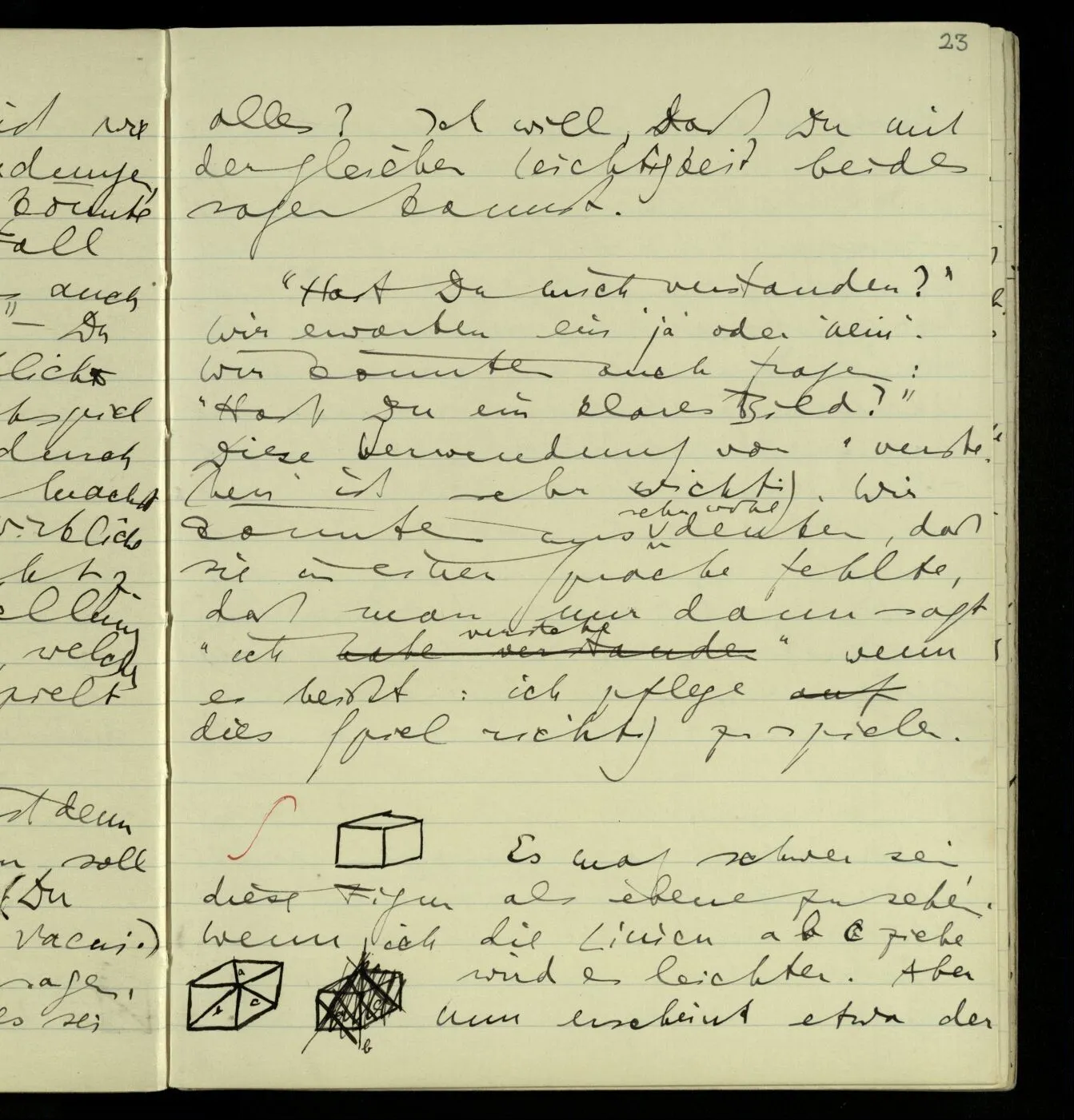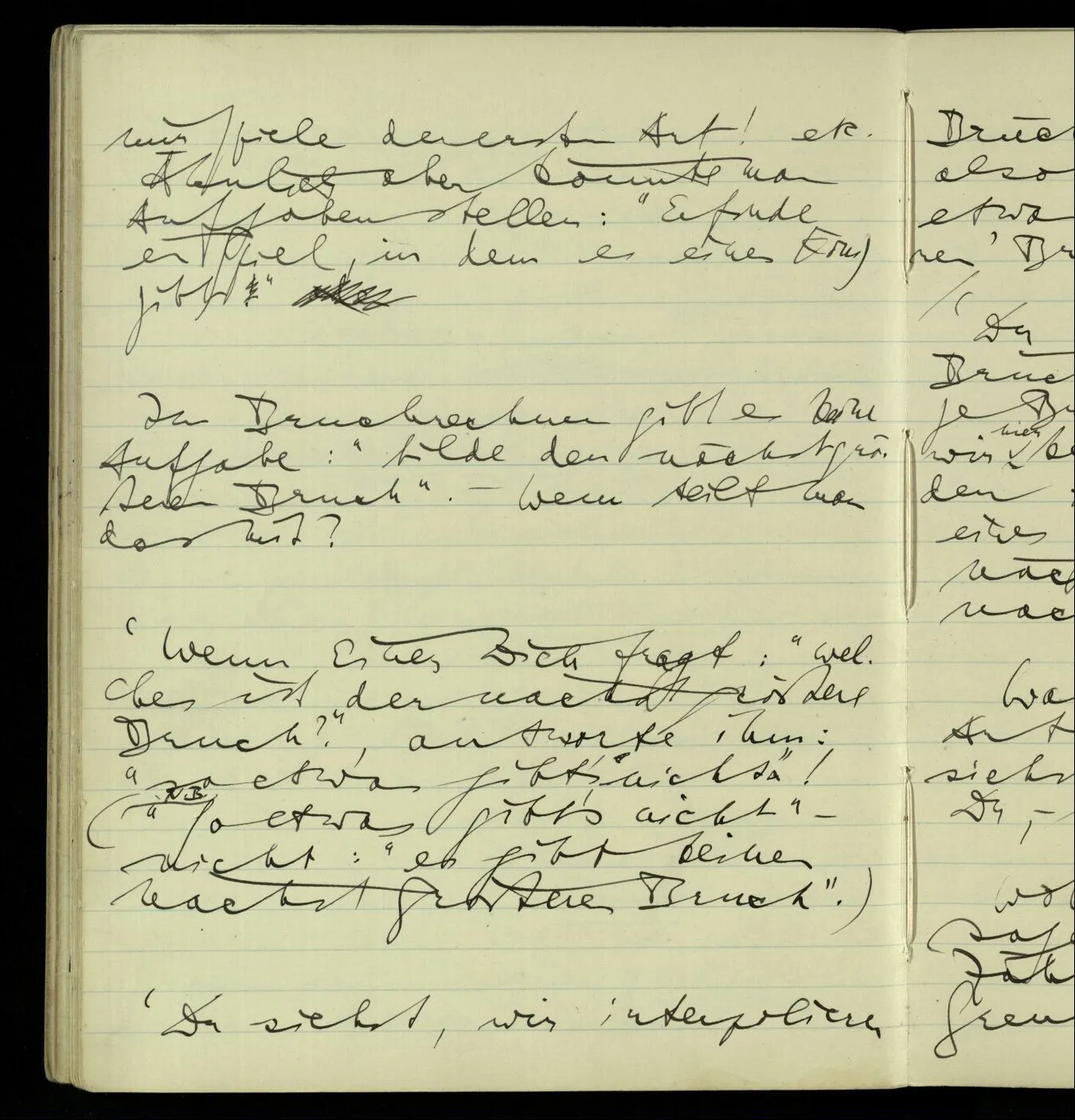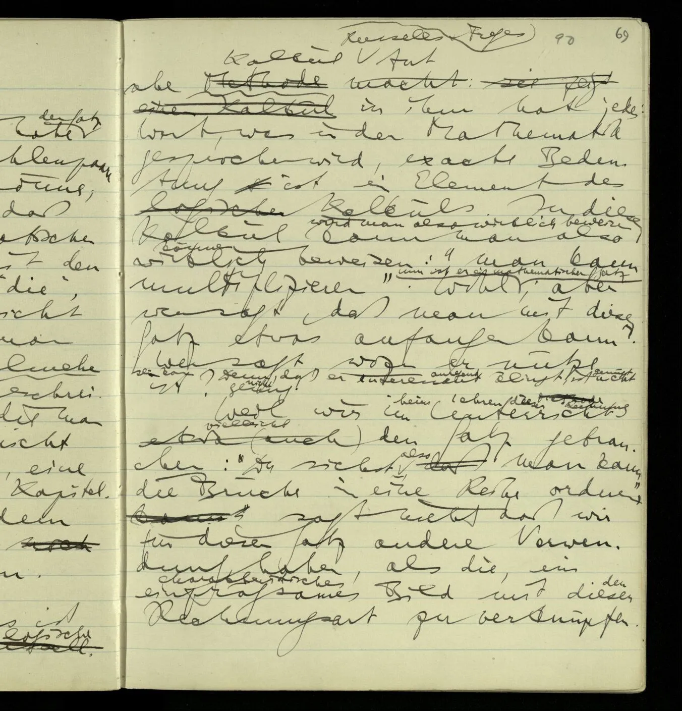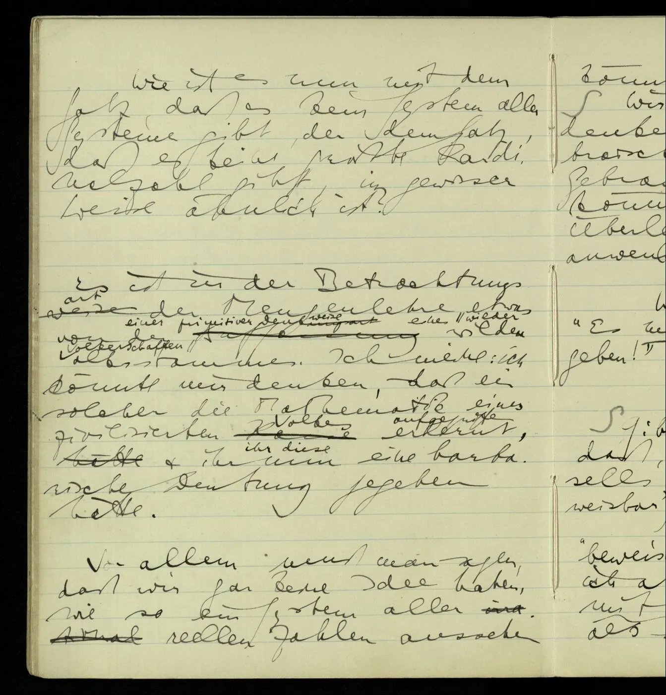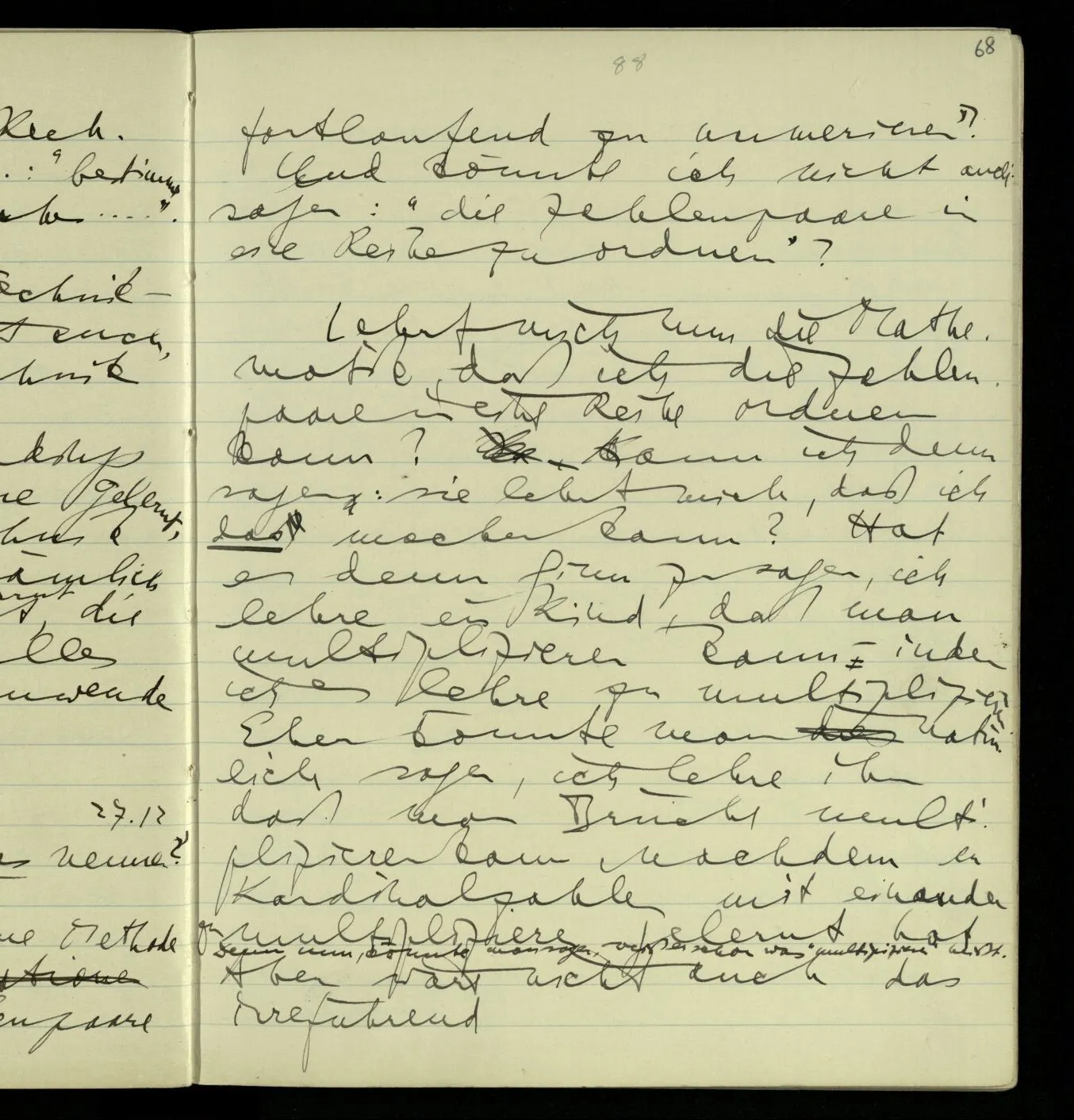 27.04.1938 “Was Du tust, sind doch lauter endliche Operationen.” – Dies ist offenbar ein verdrehtes Argument. Was hast Du Dir denn erwartet? – Nun, irgend etwas Außergewöhnliches. Worauf bist Du denn gekommen? Ich glaube: darauf, daß, was Du unter dem Gesichtspunkt des Unendlichen betrachtest, auch unter dem Gesichtspunkt des Endlichen betrachtet werden kann. Beinahe könnte man so sagen: “Warum fällst Du bei diesen Zeichen in Ekstase?”