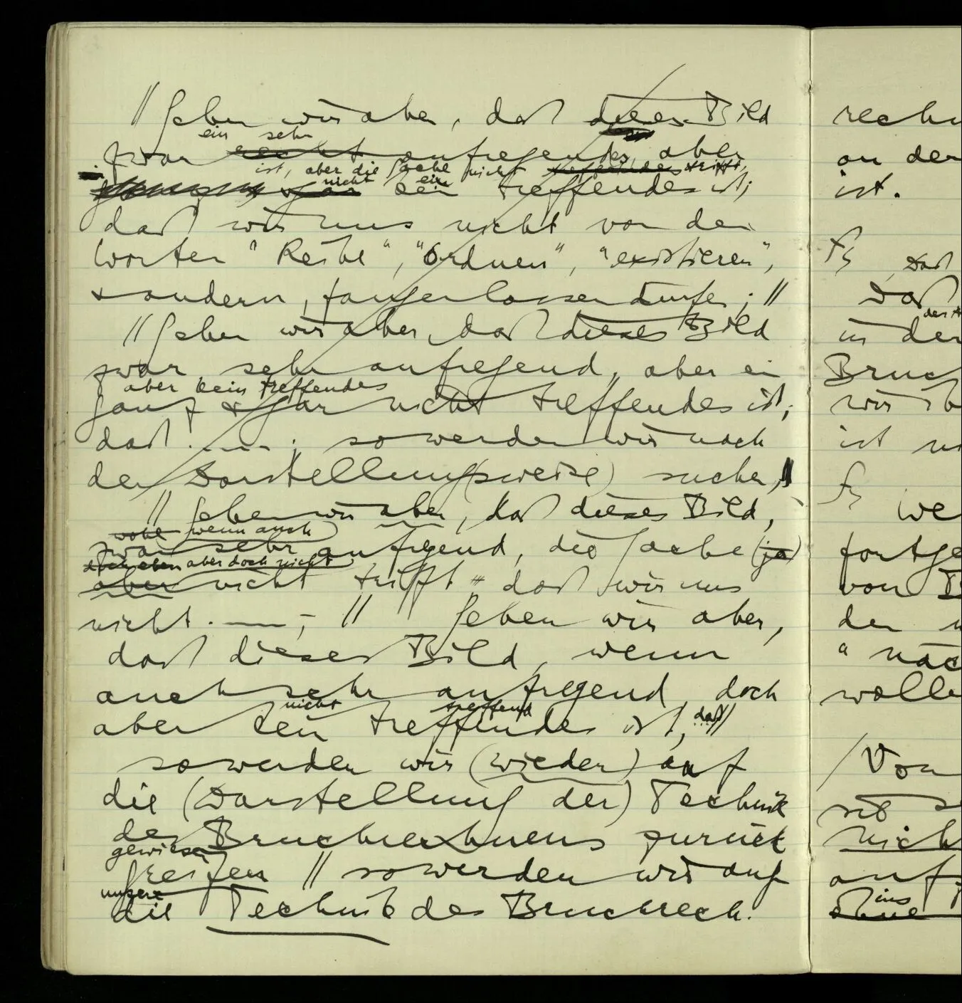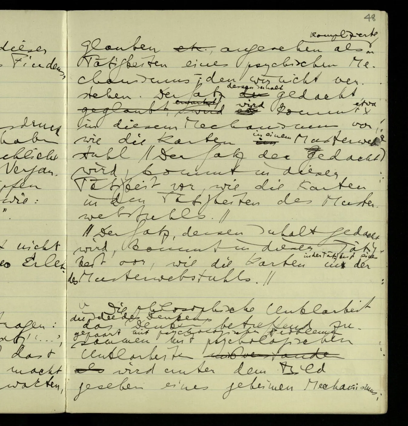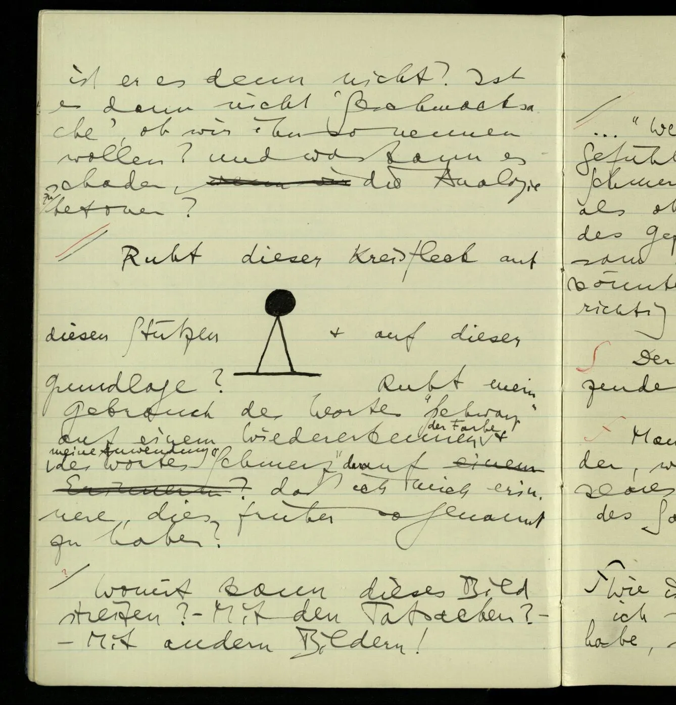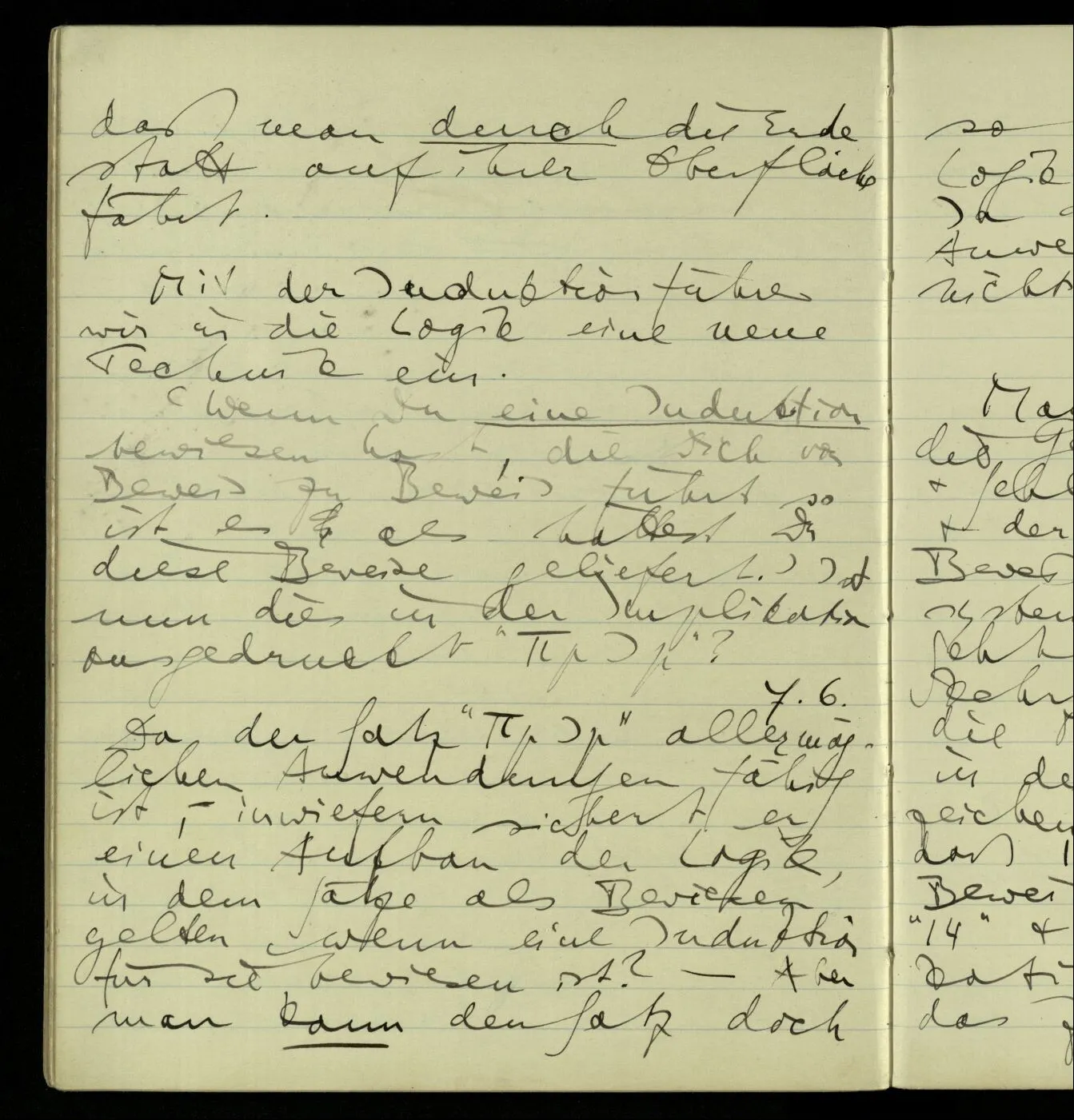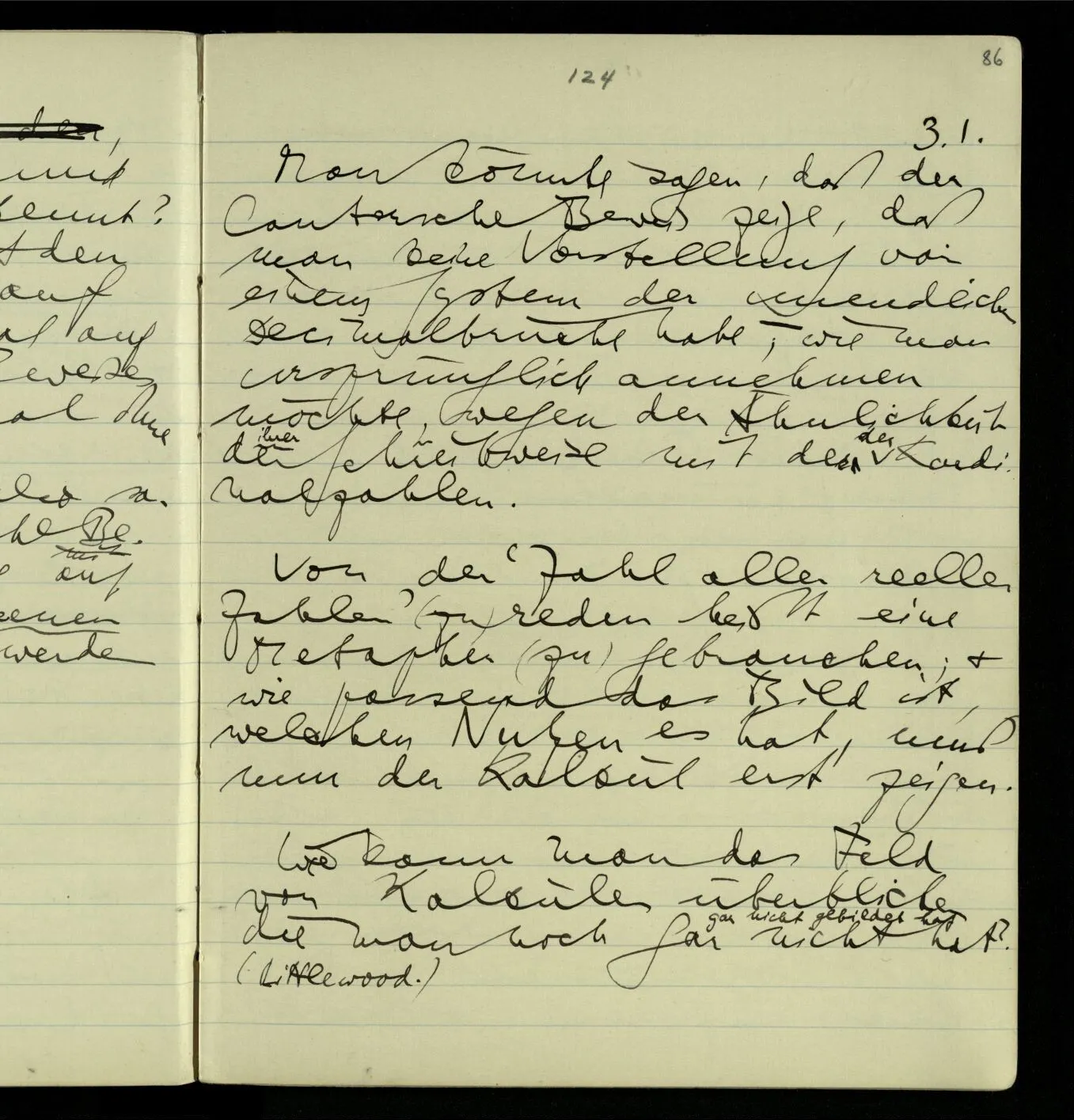 27.04.1938 “Was Du tust, sind doch lauter endliche Operationen.” – Dies ist offenbar ein verdrehtes Argument. Was hast Du Dir denn erwartet? – Nun, irgend etwas Außergewöhnliches. Worauf bist Du denn gekommen? Ich glaube: darauf, daß, was Du unter dem Gesichtspunkt des Unendlichen betrachtest, auch unter dem Gesichtspunkt des Endlichen betrachtet werden kann. Beinahe könnte man so sagen: “Warum fällst Du bei diesen Zeichen in Ekstase?”