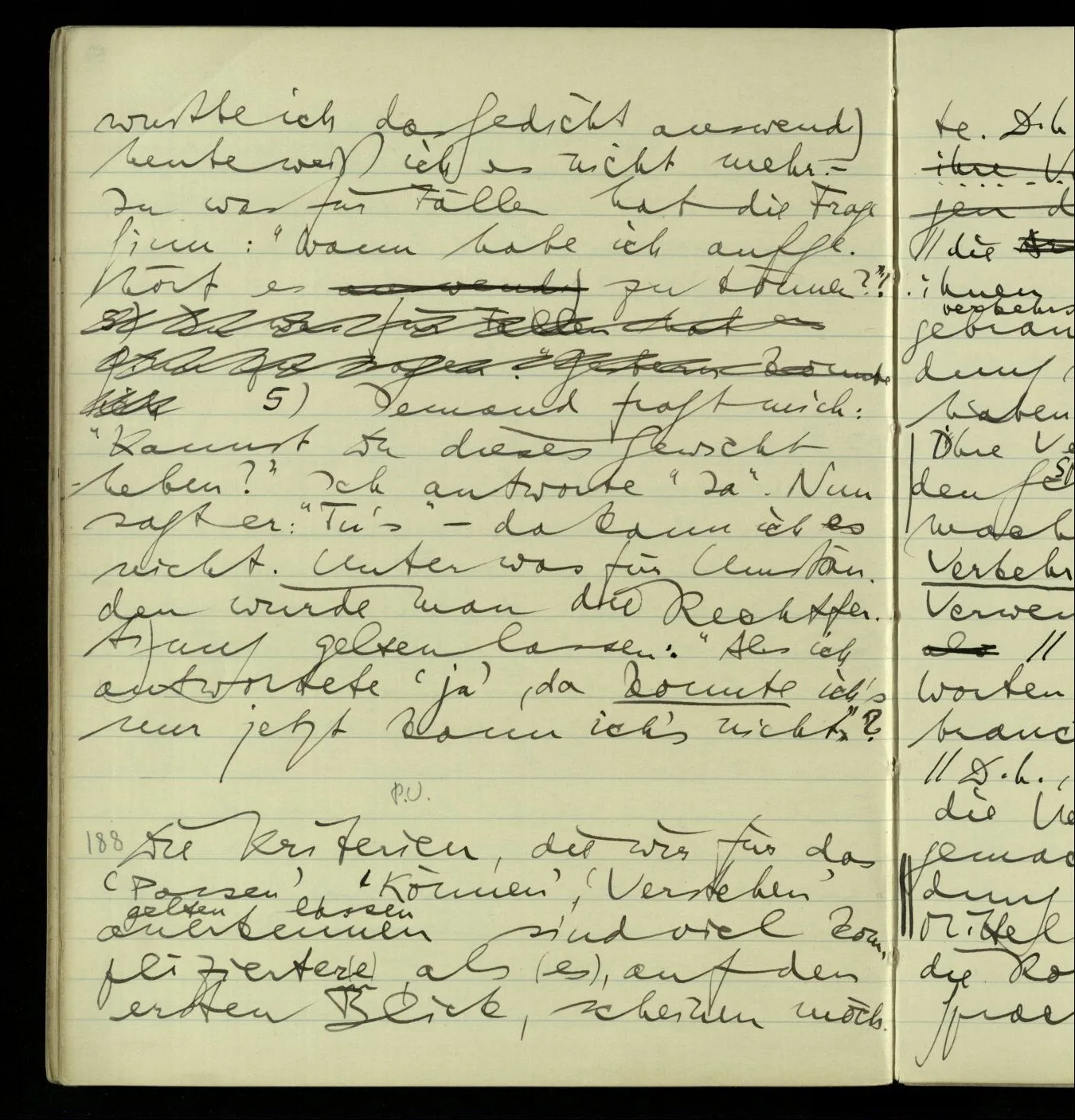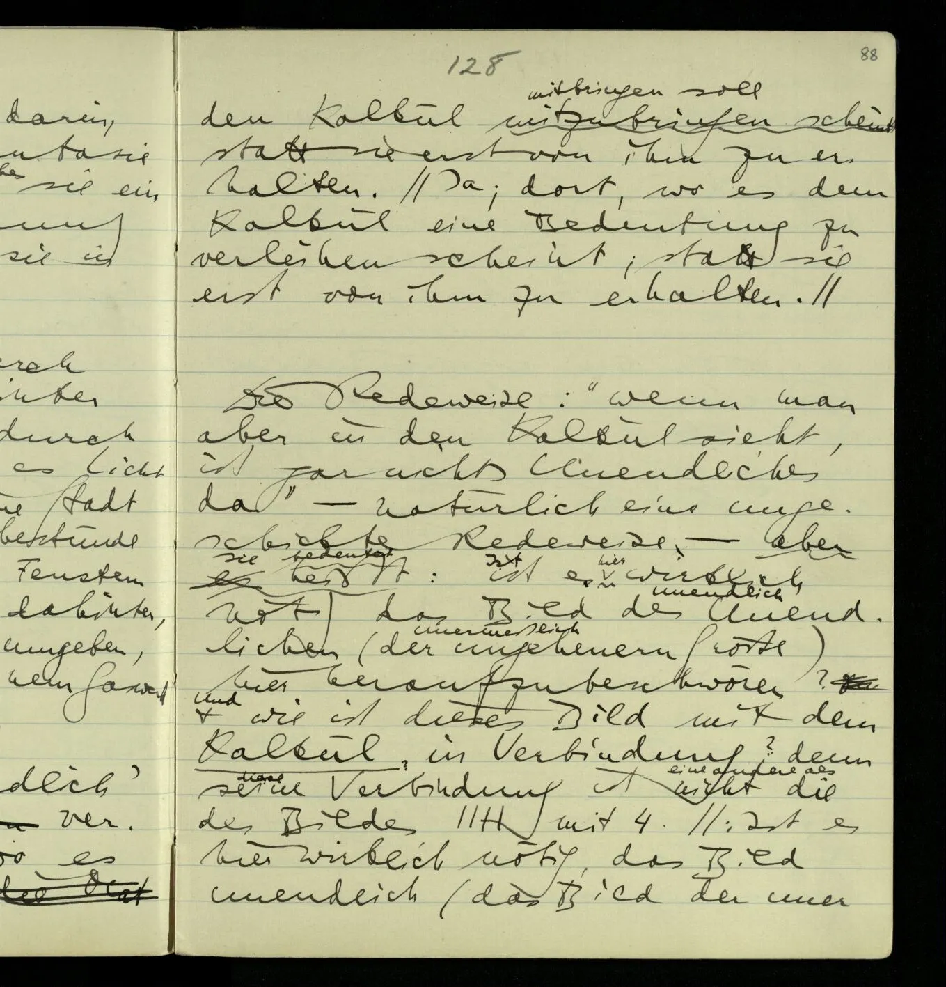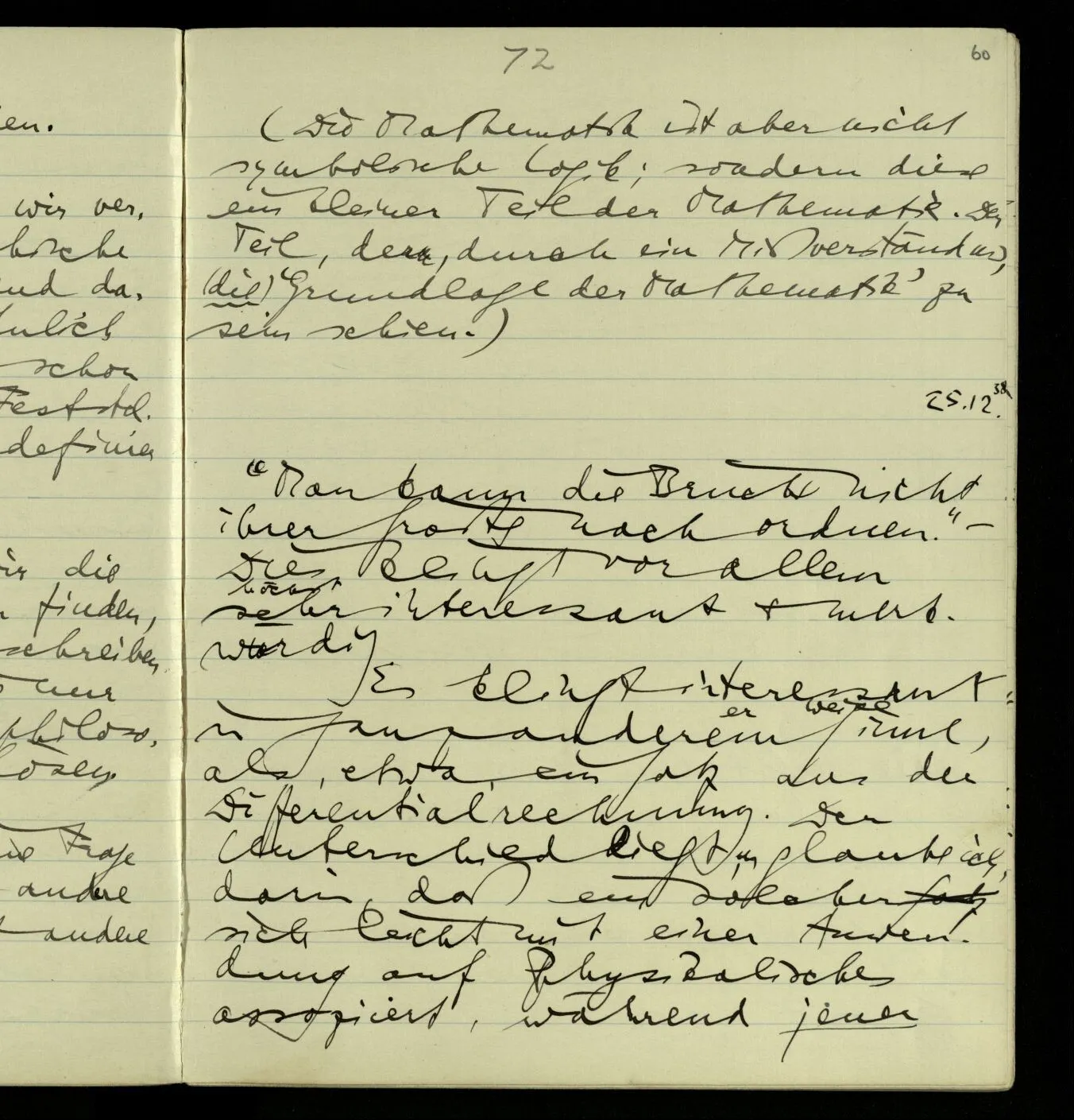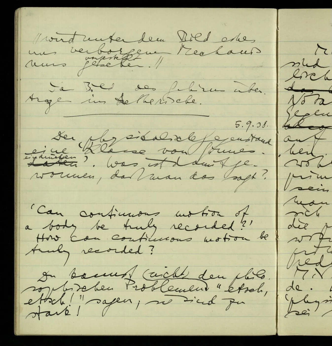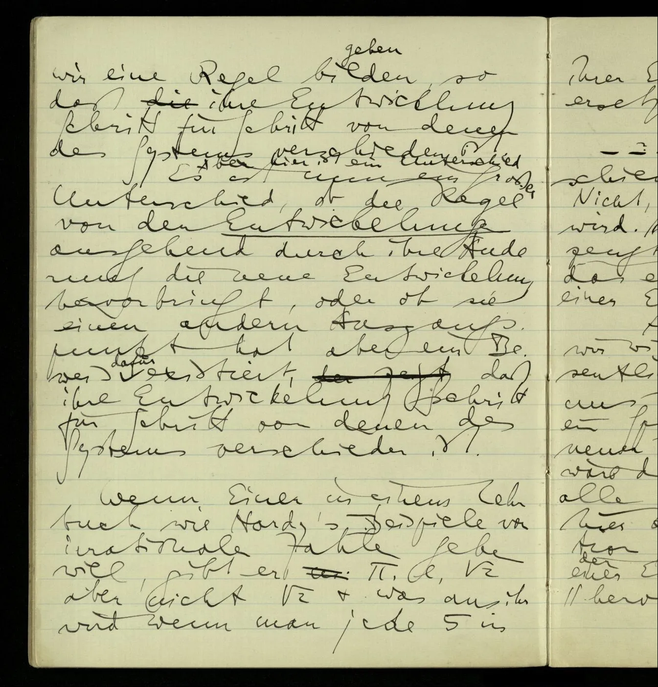 27.04.1938 “Was Du tust, sind doch lauter endliche Operationen.” – Dies ist offenbar ein verdrehtes Argument. Was hast Du Dir denn erwartet? – Nun, irgend etwas Außergewöhnliches. Worauf bist Du denn gekommen? Ich glaube: darauf, daß, was Du unter dem Gesichtspunkt des Unendlichen betrachtest, auch unter dem Gesichtspunkt des Endlichen betrachtet werden kann. Beinahe könnte man so sagen: “Warum fällst Du bei diesen Zeichen in Ekstase?”
