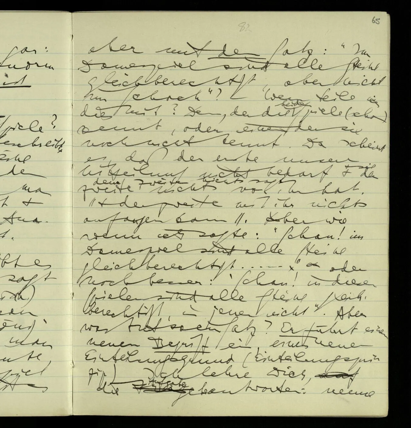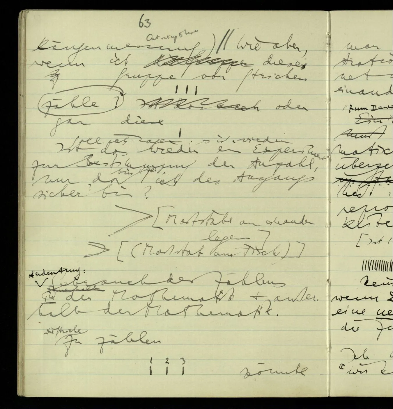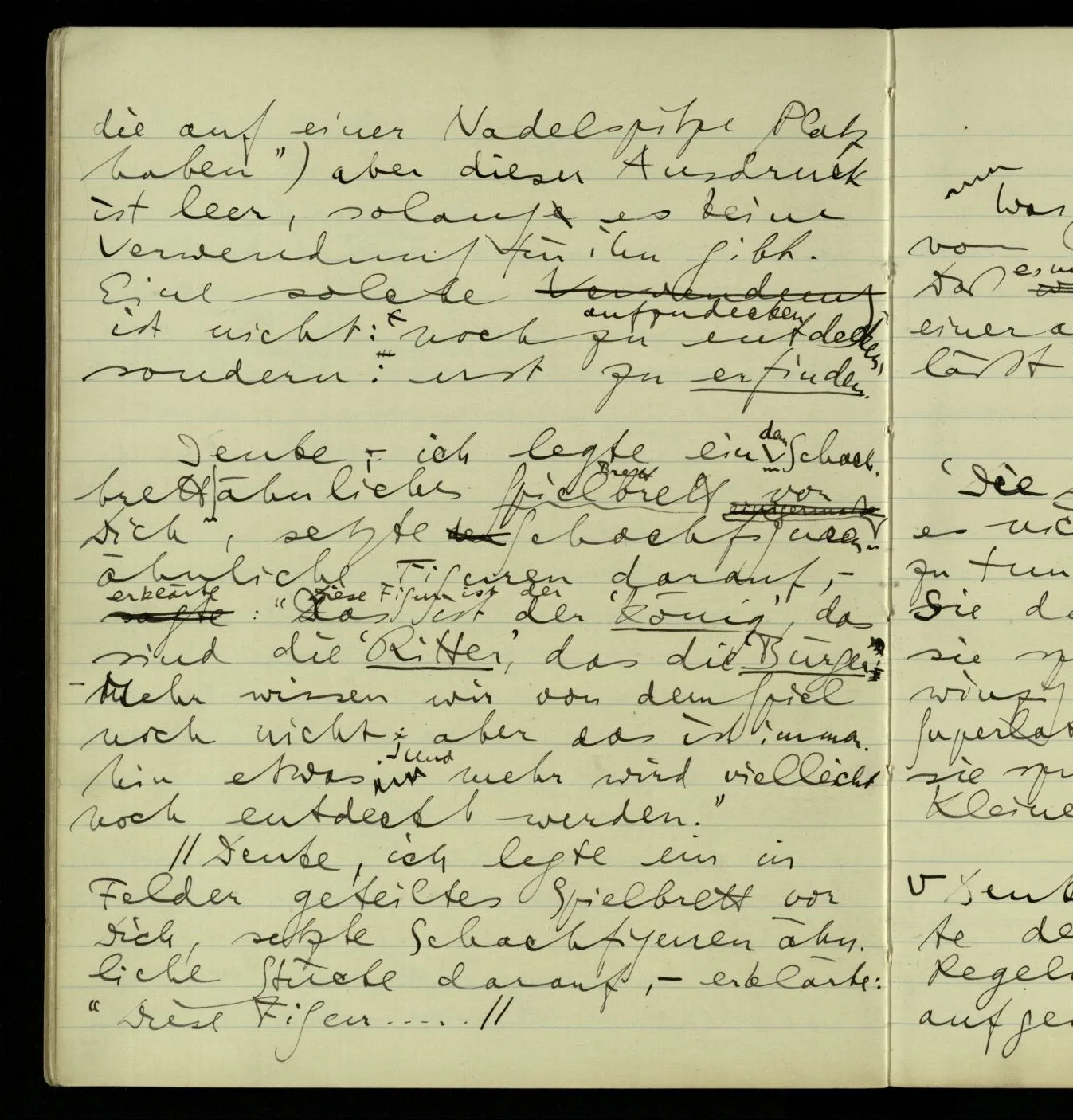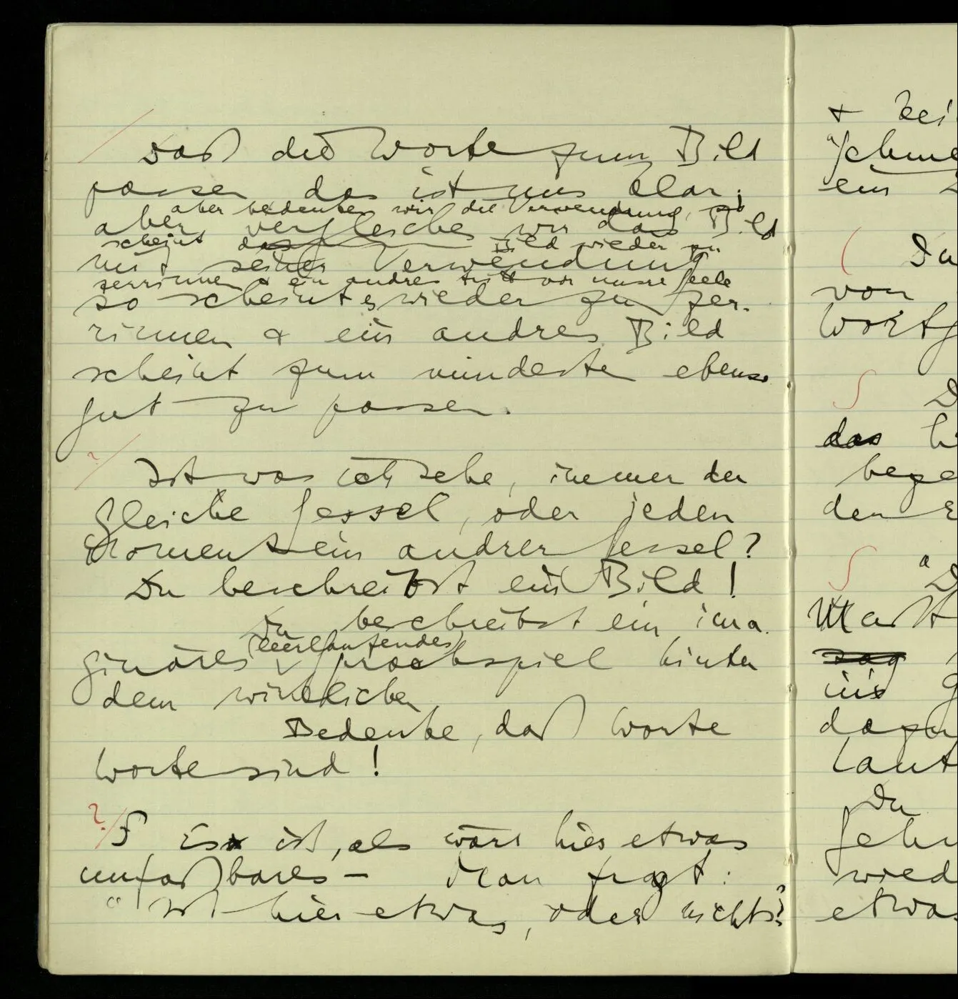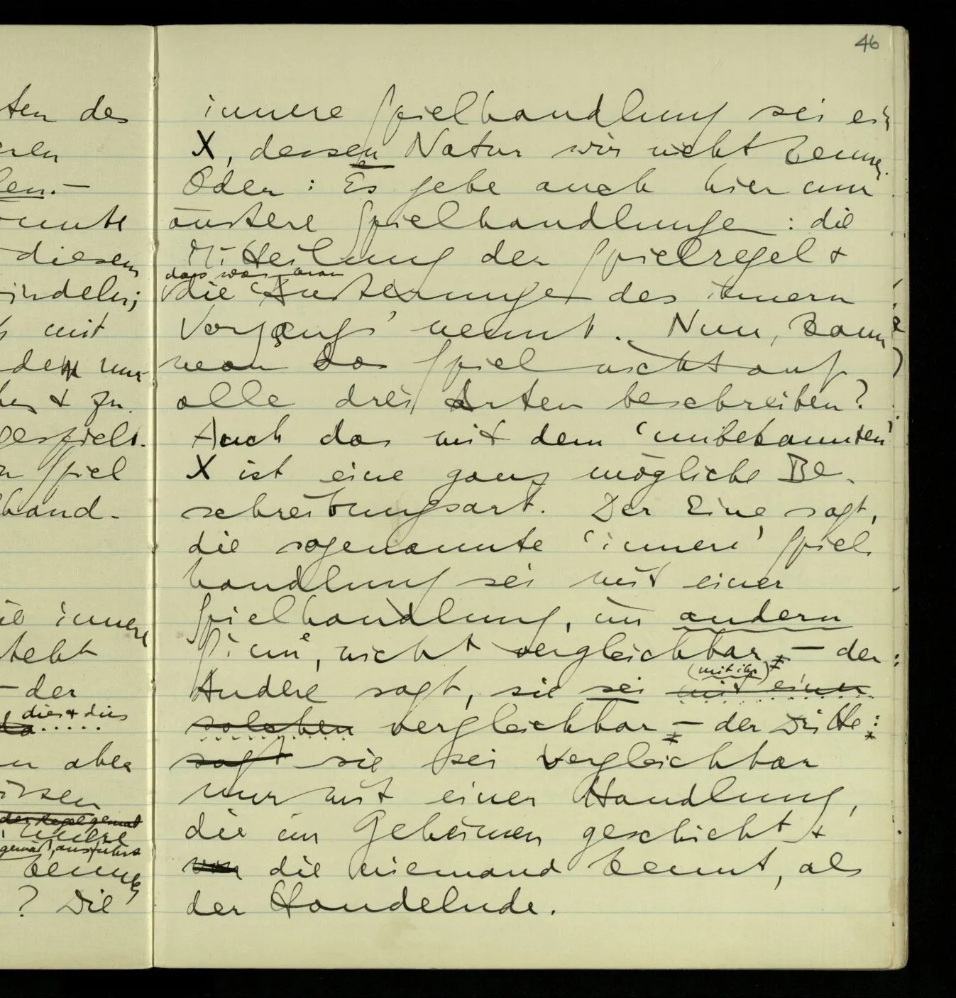 27.04.1938 “Was Du tust, sind doch lauter endliche Operationen.” – Dies ist offenbar ein verdrehtes Argument. Was hast Du Dir denn erwartet? – Nun, irgend etwas Außergewöhnliches. Worauf bist Du denn gekommen? Ich glaube: darauf, daß, was Du unter dem Gesichtspunkt des Unendlichen betrachtest, auch unter dem Gesichtspunkt des Endlichen betrachtet werden kann. Beinahe könnte man so sagen: “Warum fällst Du bei diesen Zeichen in Ekstase?”