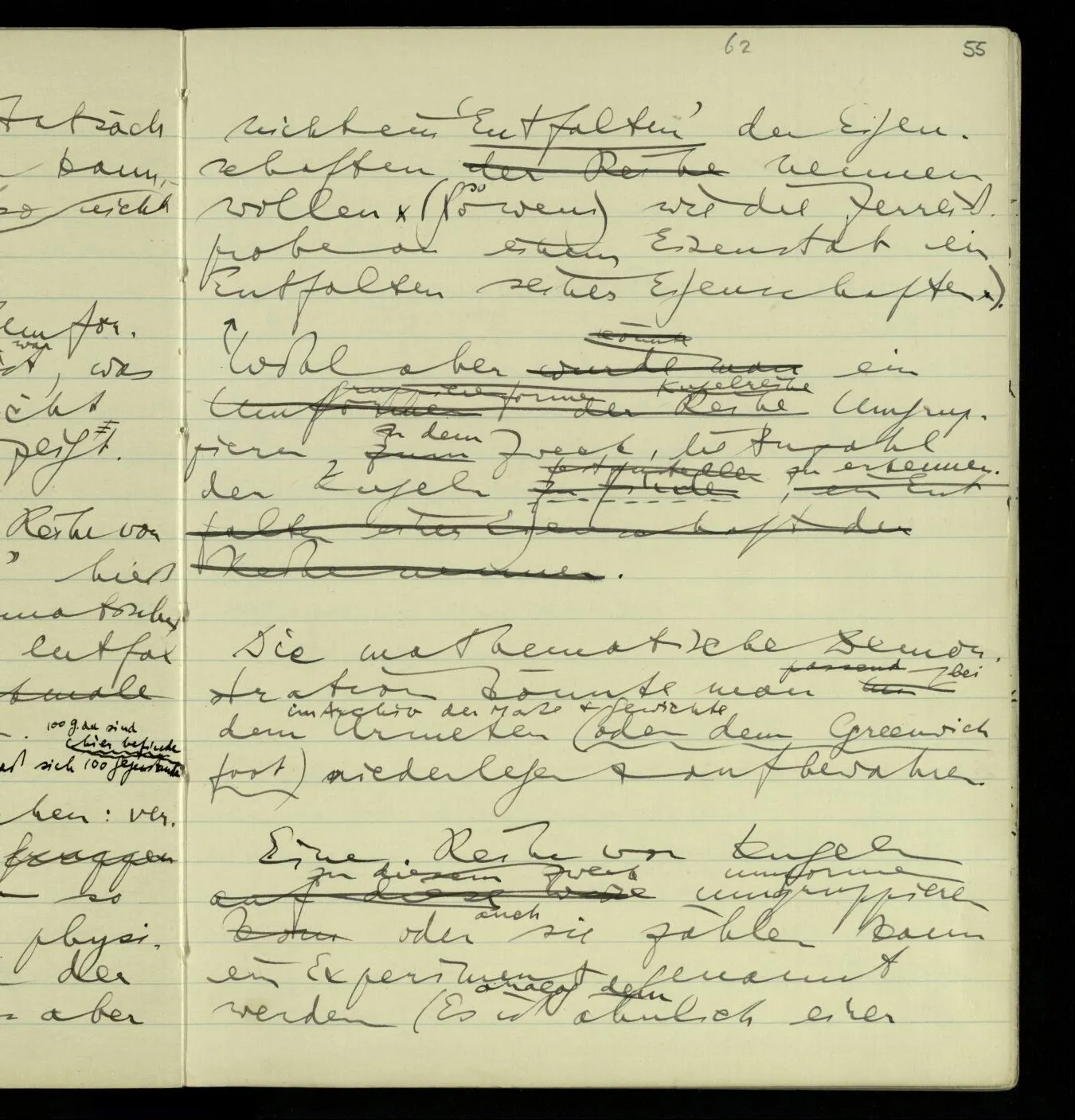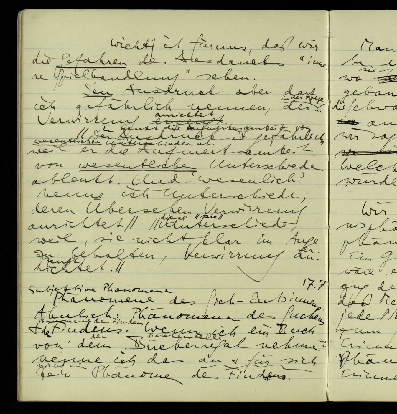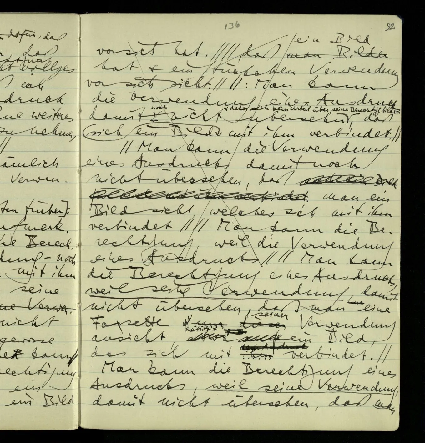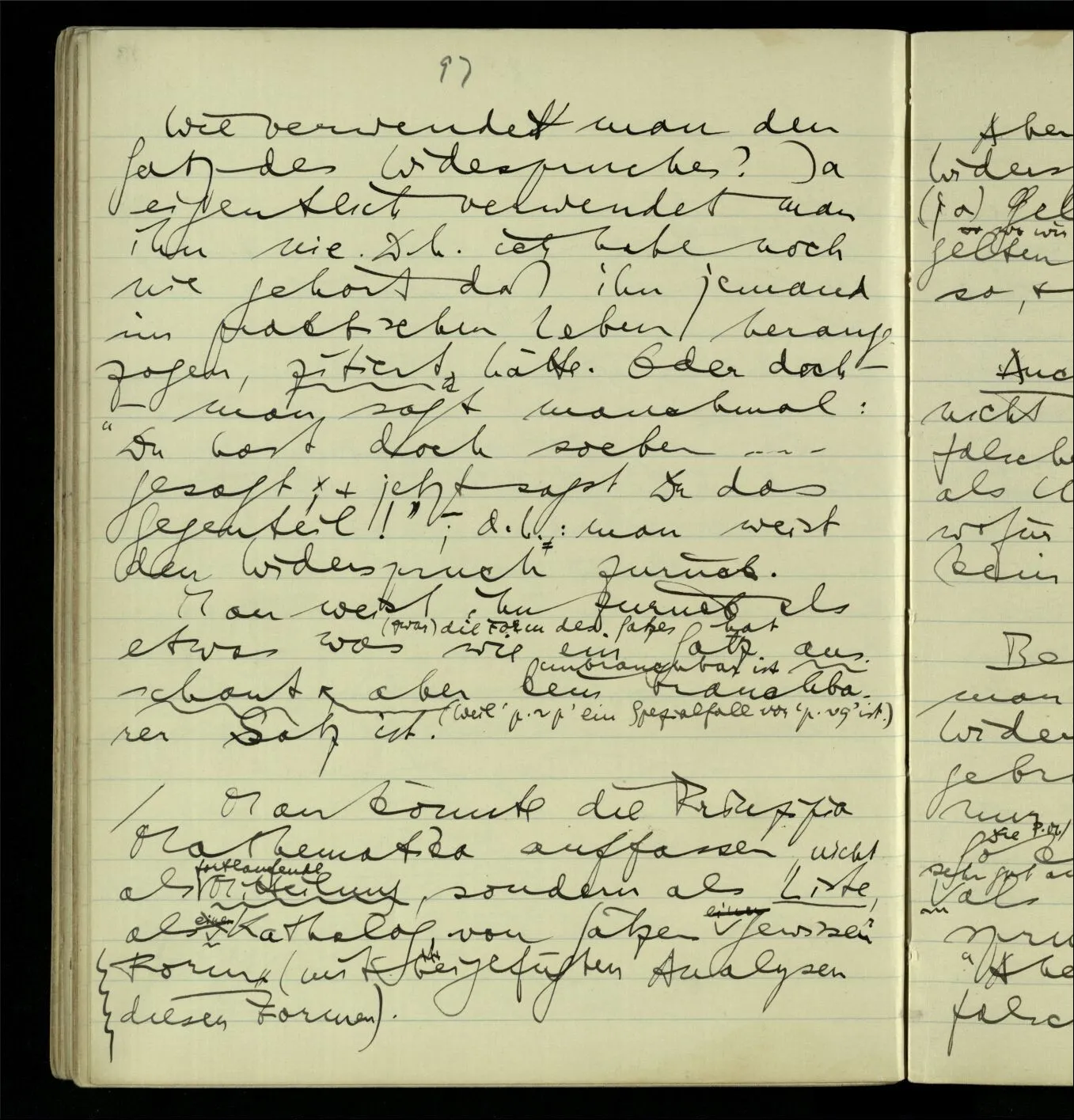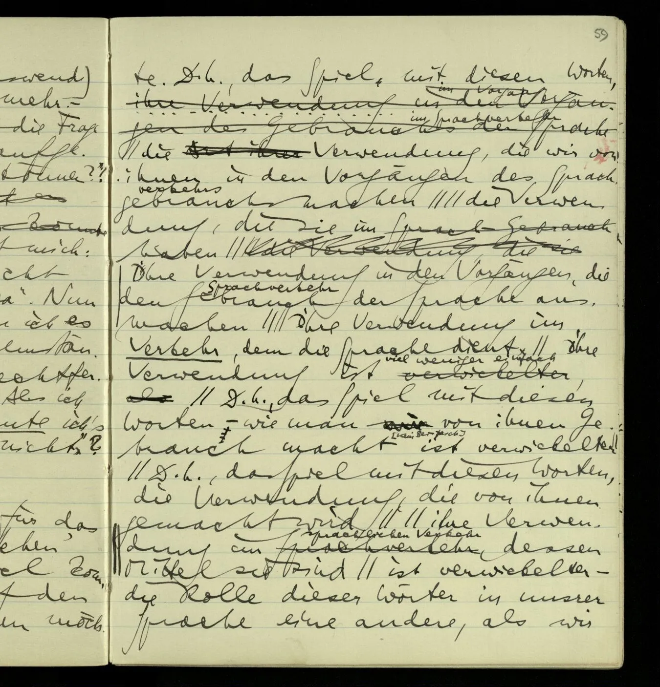 27.04.1938 “Was Du tust, sind doch lauter endliche Operationen.” – Dies ist offenbar ein verdrehtes Argument. Was hast Du Dir denn erwartet? – Nun, irgend etwas Außergewöhnliches. Worauf bist Du denn gekommen? Ich glaube: darauf, daß, was Du unter dem Gesichtspunkt des Unendlichen betrachtest, auch unter dem Gesichtspunkt des Endlichen betrachtet werden kann. Beinahe könnte man so sagen: “Warum fällst Du bei diesen Zeichen in Ekstase?”