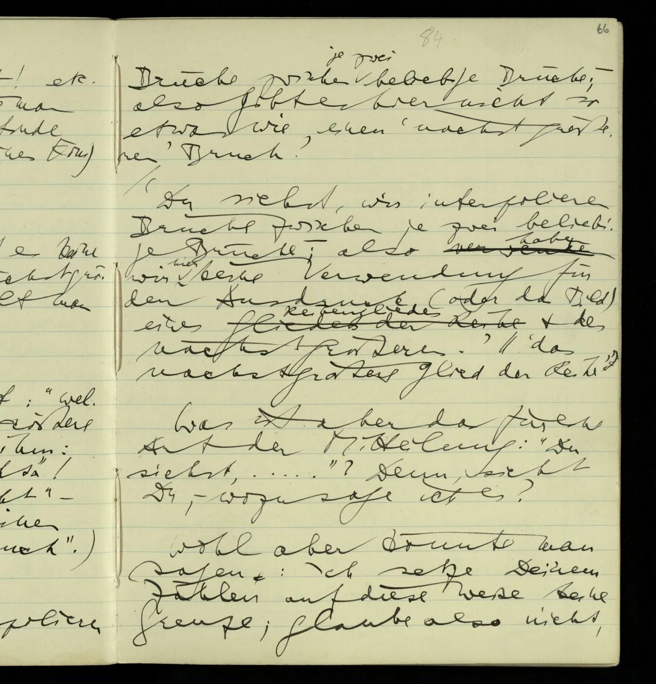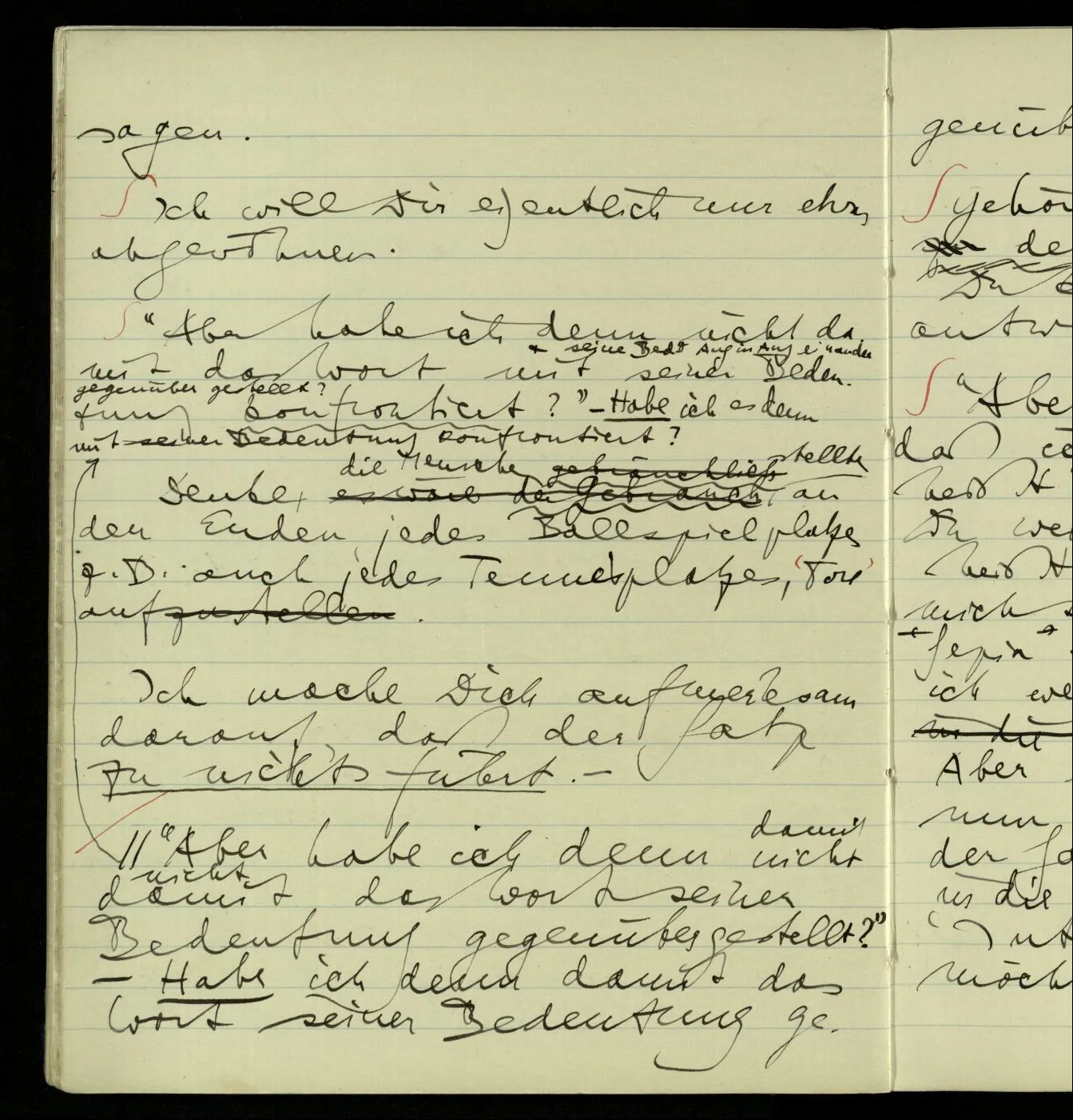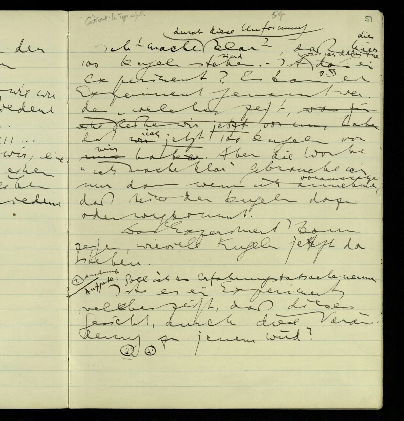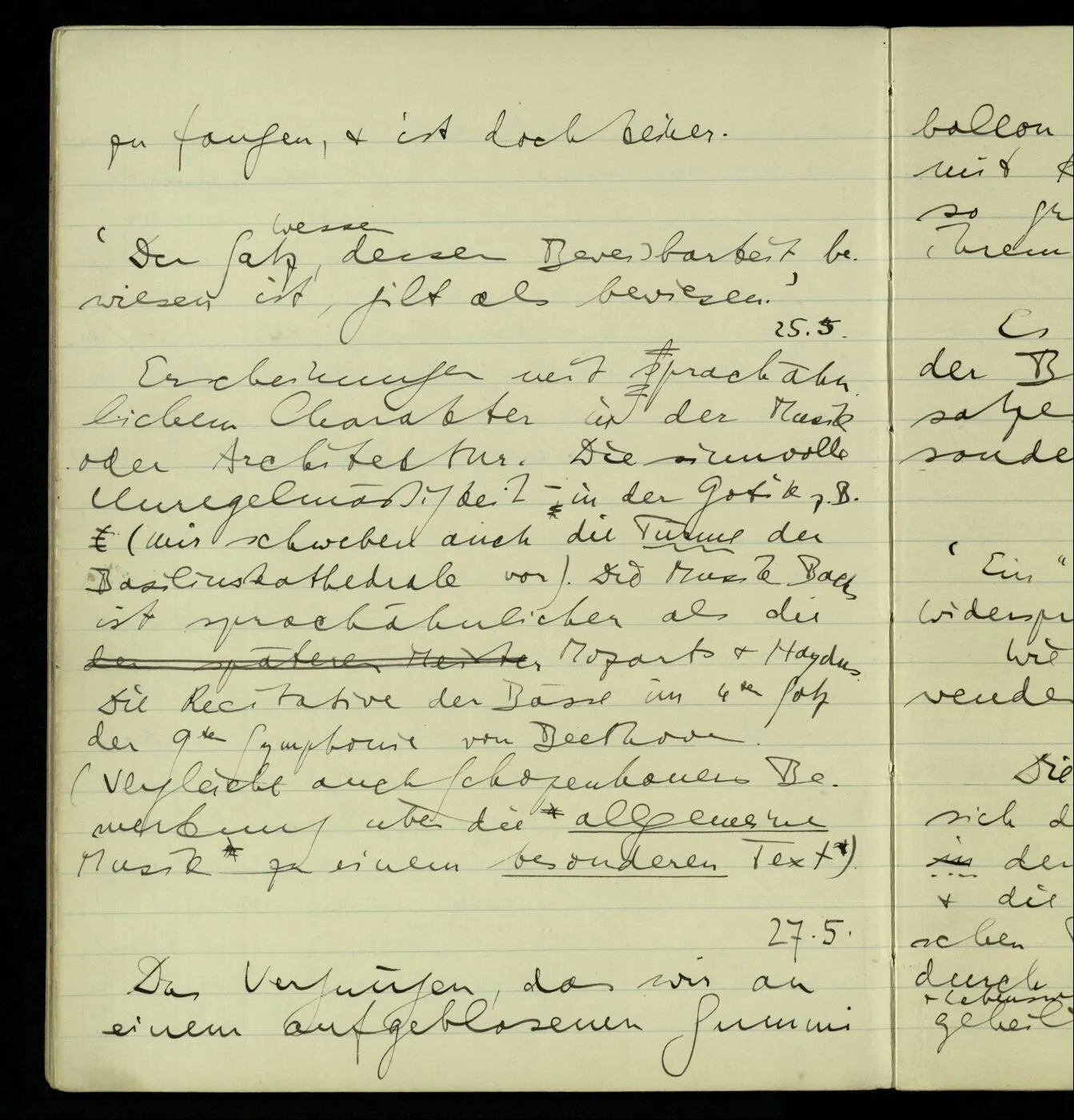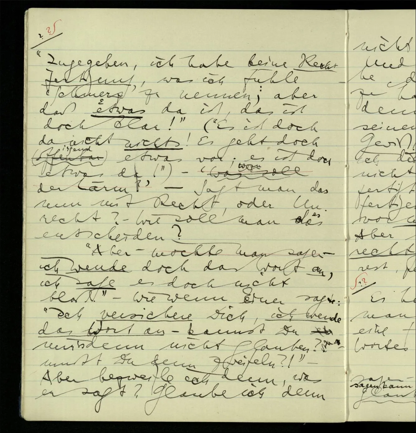 27.04.1938 “Was Du tust, sind doch lauter endliche Operationen.” – Dies ist offenbar ein verdrehtes Argument. Was hast Du Dir denn erwartet? – Nun, irgend etwas Außergewöhnliches. Worauf bist Du denn gekommen? Ich glaube: darauf, daß, was Du unter dem Gesichtspunkt des Unendlichen betrachtest, auch unter dem Gesichtspunkt des Endlichen betrachtet werden kann. Beinahe könnte man so sagen: “Warum fällst Du bei diesen Zeichen in Ekstase?”