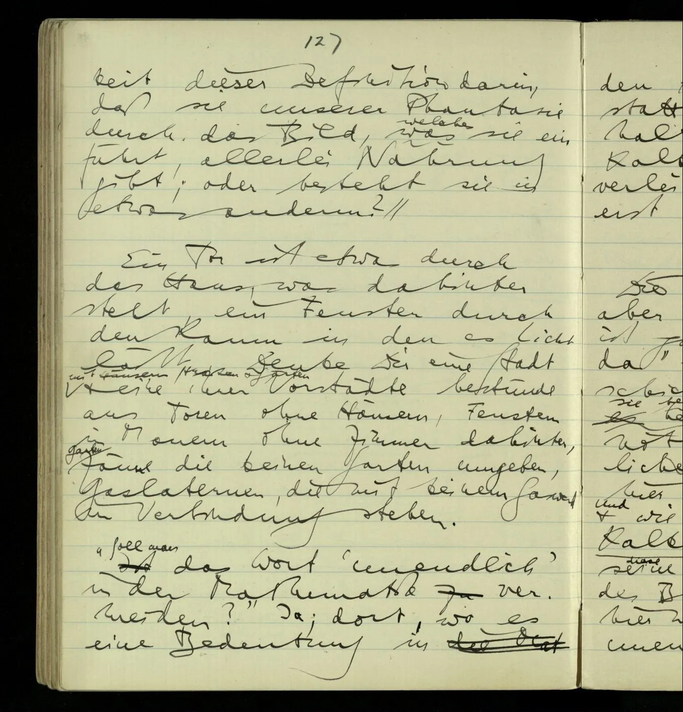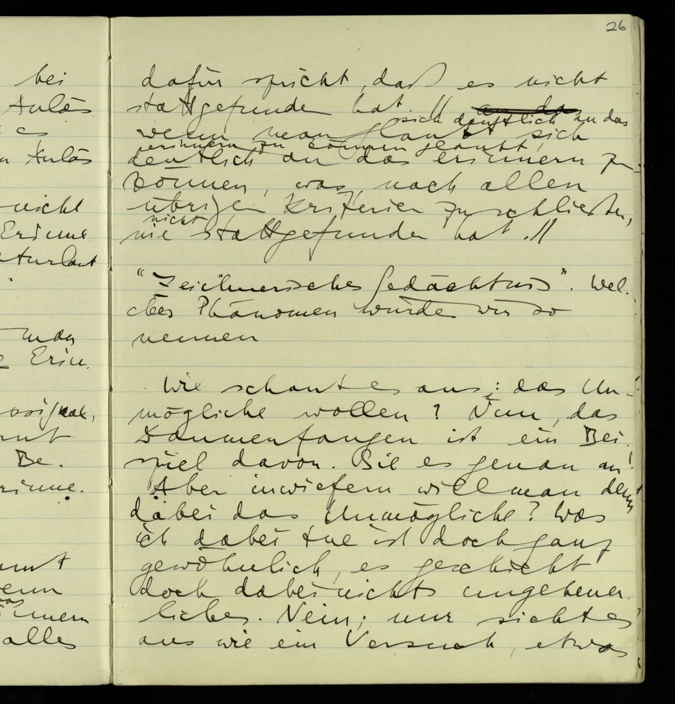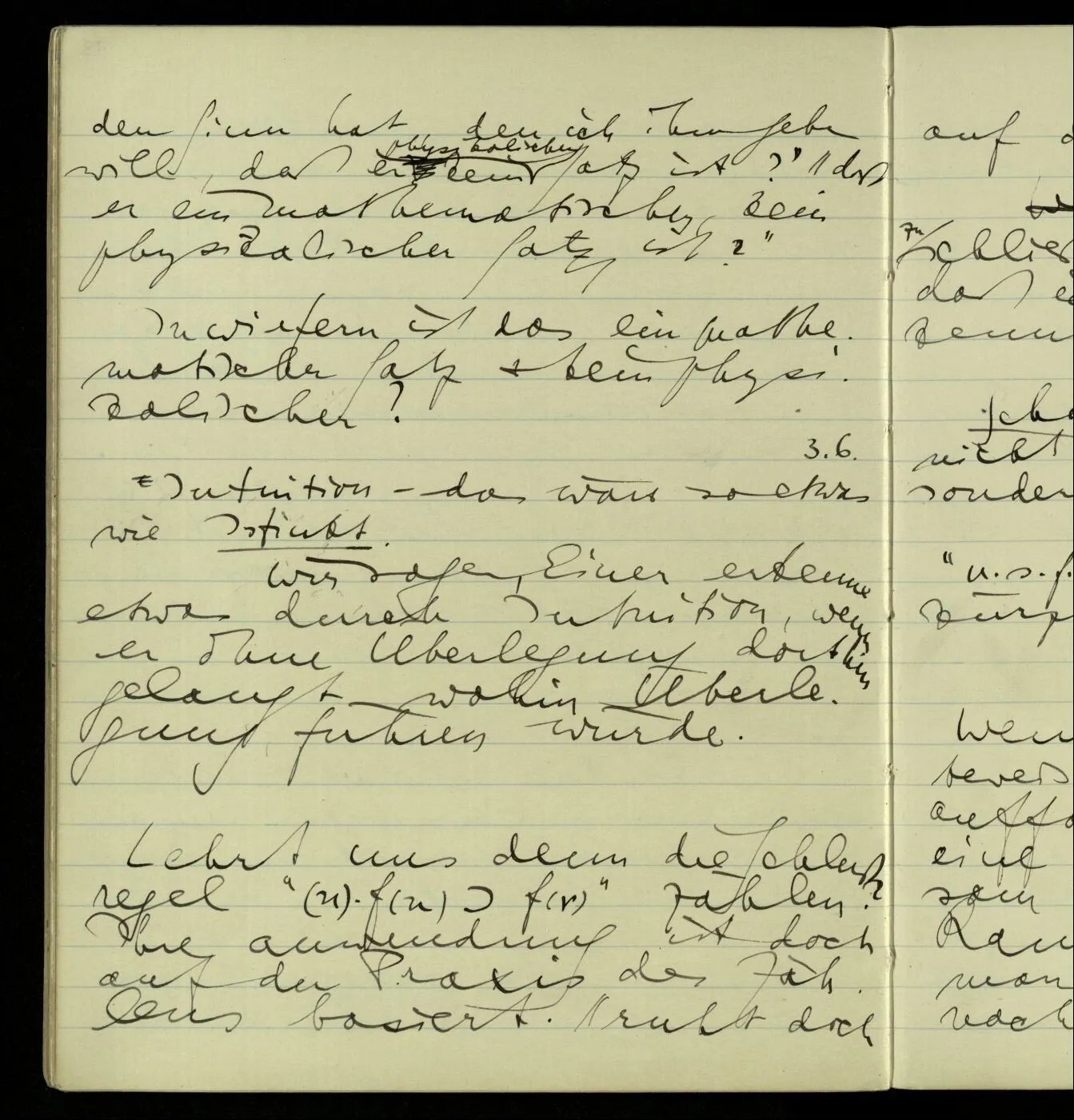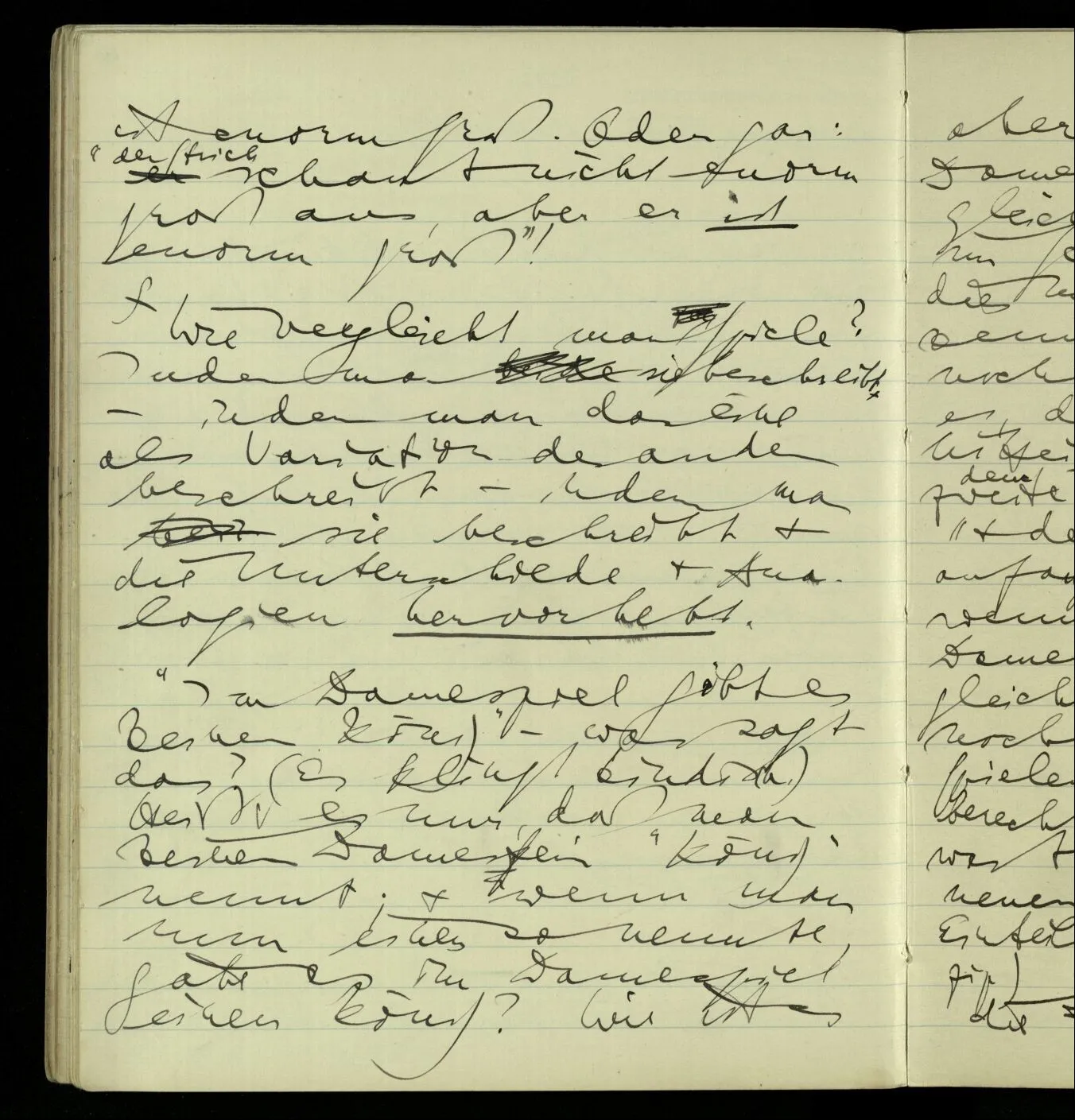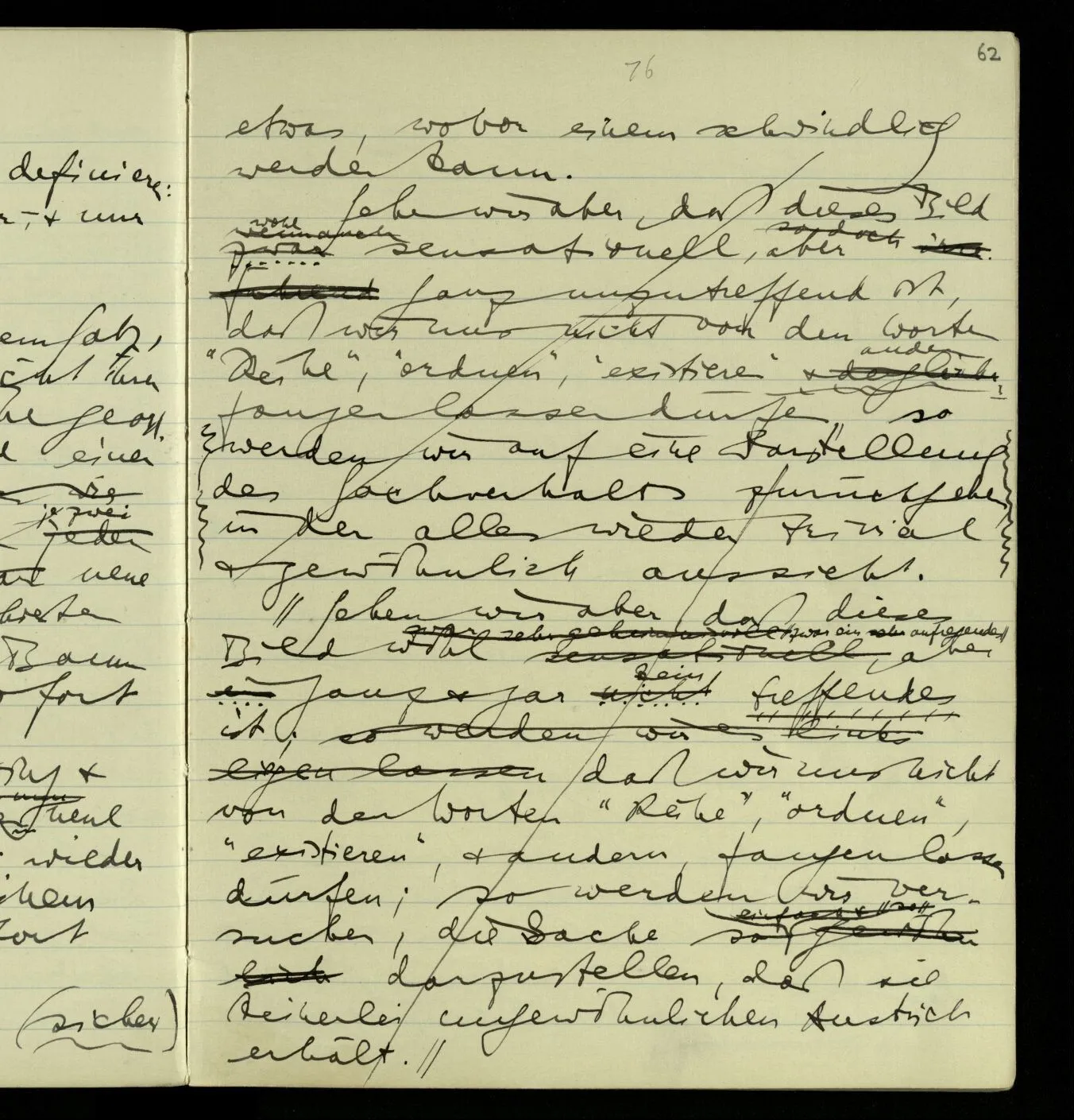27.04.1938 “Was Du tust, sind doch lauter endliche Operationen.” – Dies ist offenbar ein verdrehtes Argument. Was hast Du Dir denn erwartet? – Nun, irgend etwas Außergewöhnliches. Worauf bist Du denn gekommen? Ich glaube: darauf, daß, was Du unter dem Gesichtspunkt des Unendlichen betrachtest, auch unter dem Gesichtspunkt des Endlichen betrachtet werden kann. Beinahe könnte man so sagen: “Warum fällst Du bei diesen Zeichen in Ekstase?”