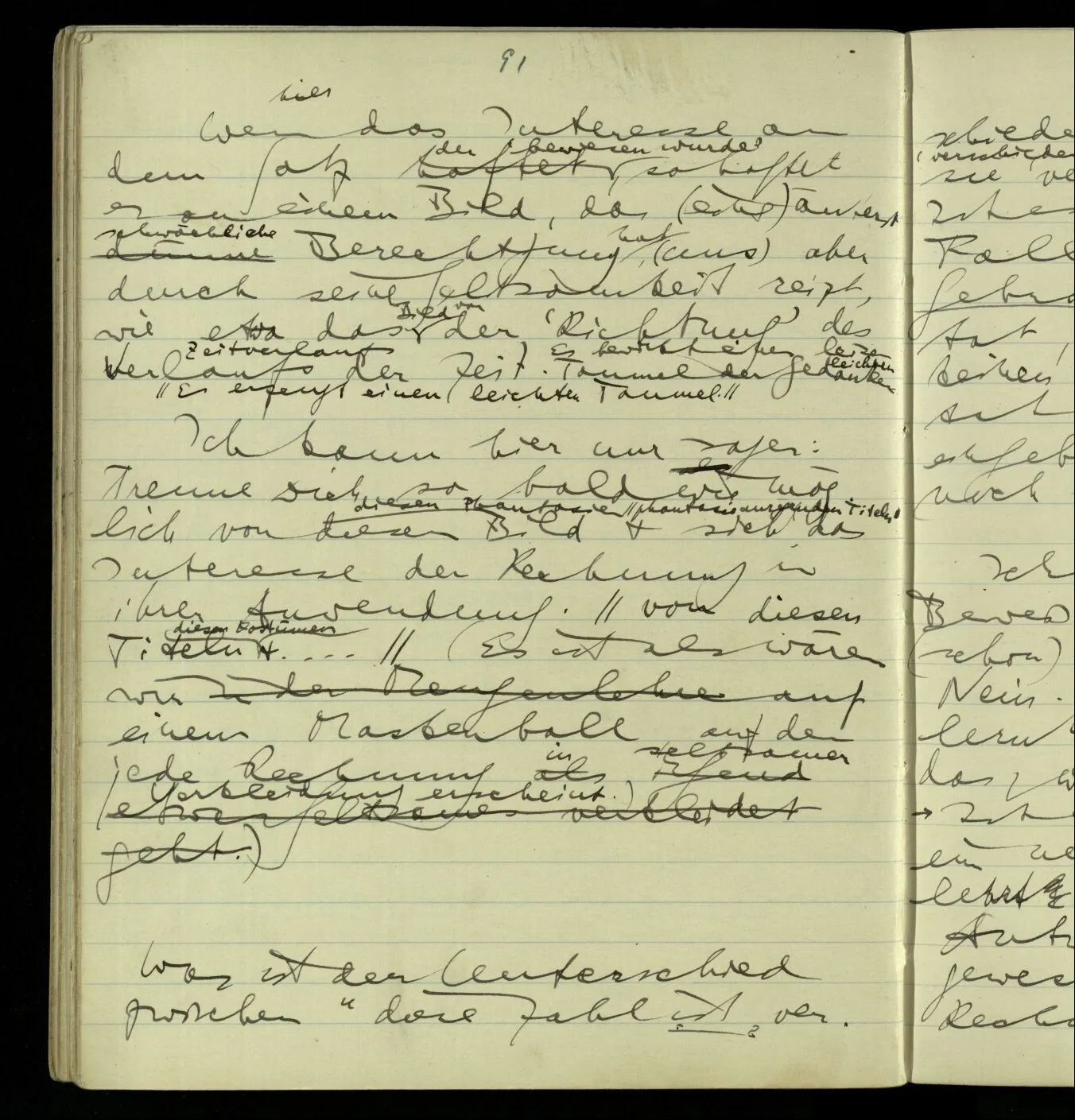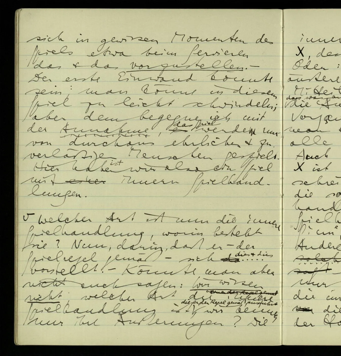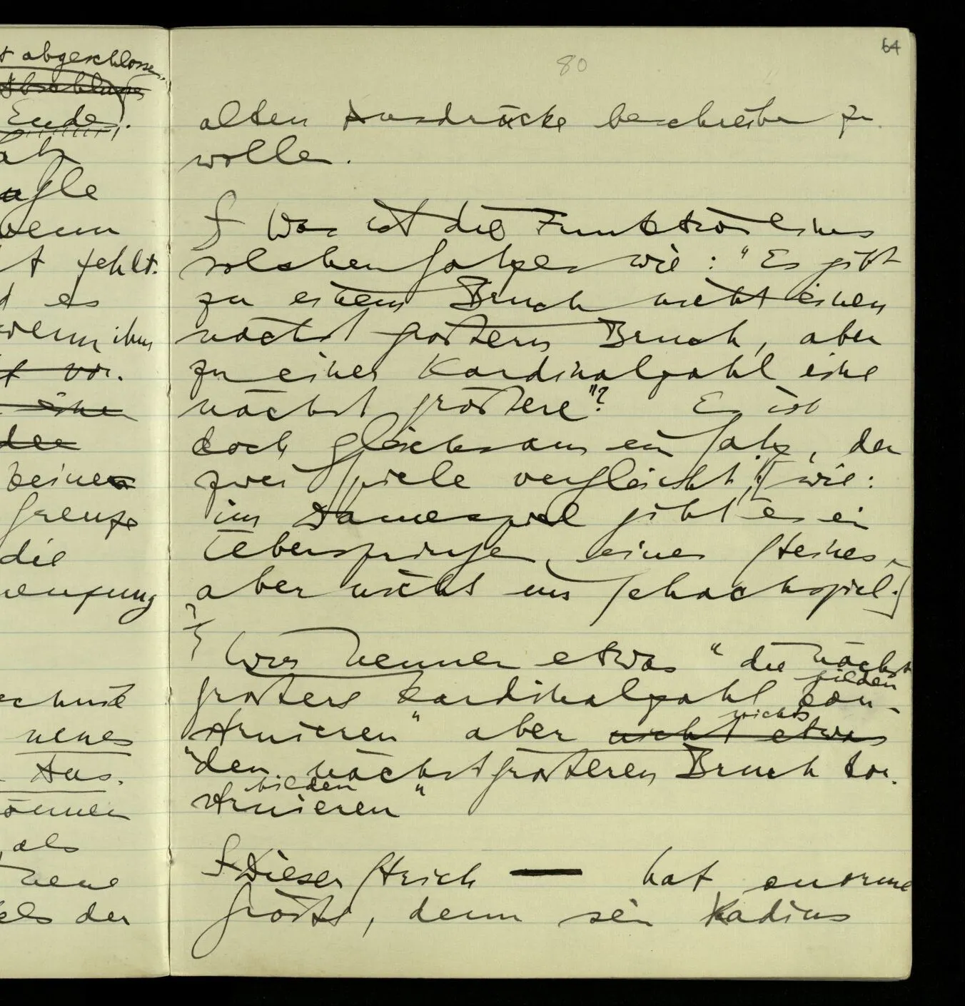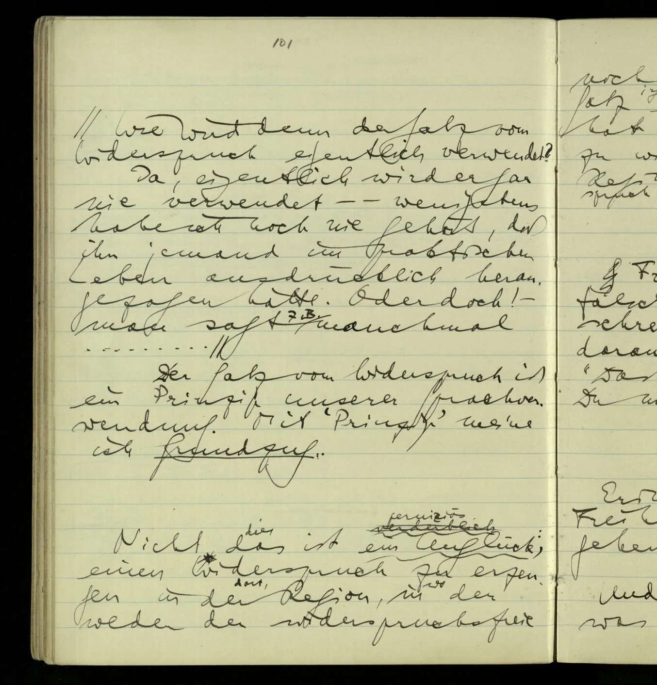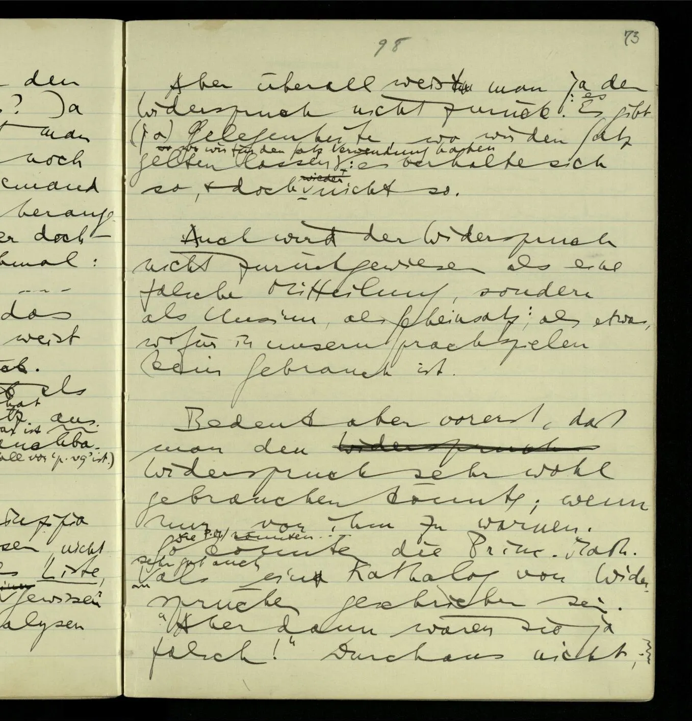 27.04.1938 “Was Du tust, sind doch lauter endliche Operationen.” – Dies ist offenbar ein verdrehtes Argument. Was hast Du Dir denn erwartet? – Nun, irgend etwas Außergewöhnliches. Worauf bist Du denn gekommen? Ich glaube: darauf, daß, was Du unter dem Gesichtspunkt des Unendlichen betrachtest, auch unter dem Gesichtspunkt des Endlichen betrachtet werden kann. Beinahe könnte man so sagen: “Warum fällst Du bei diesen Zeichen in Ekstase?”