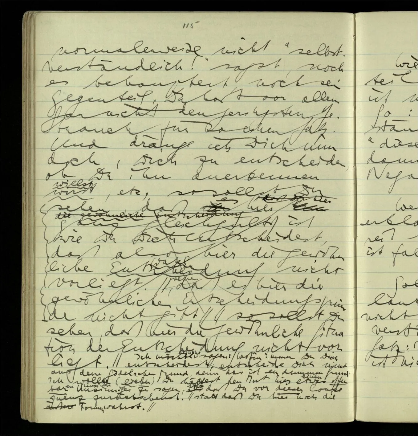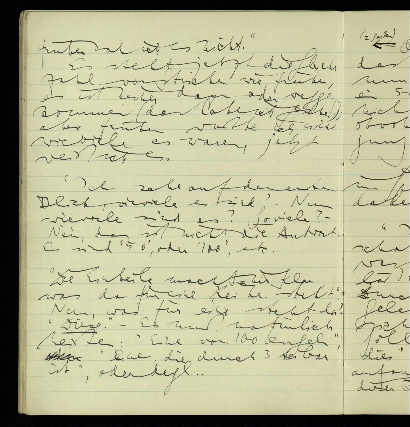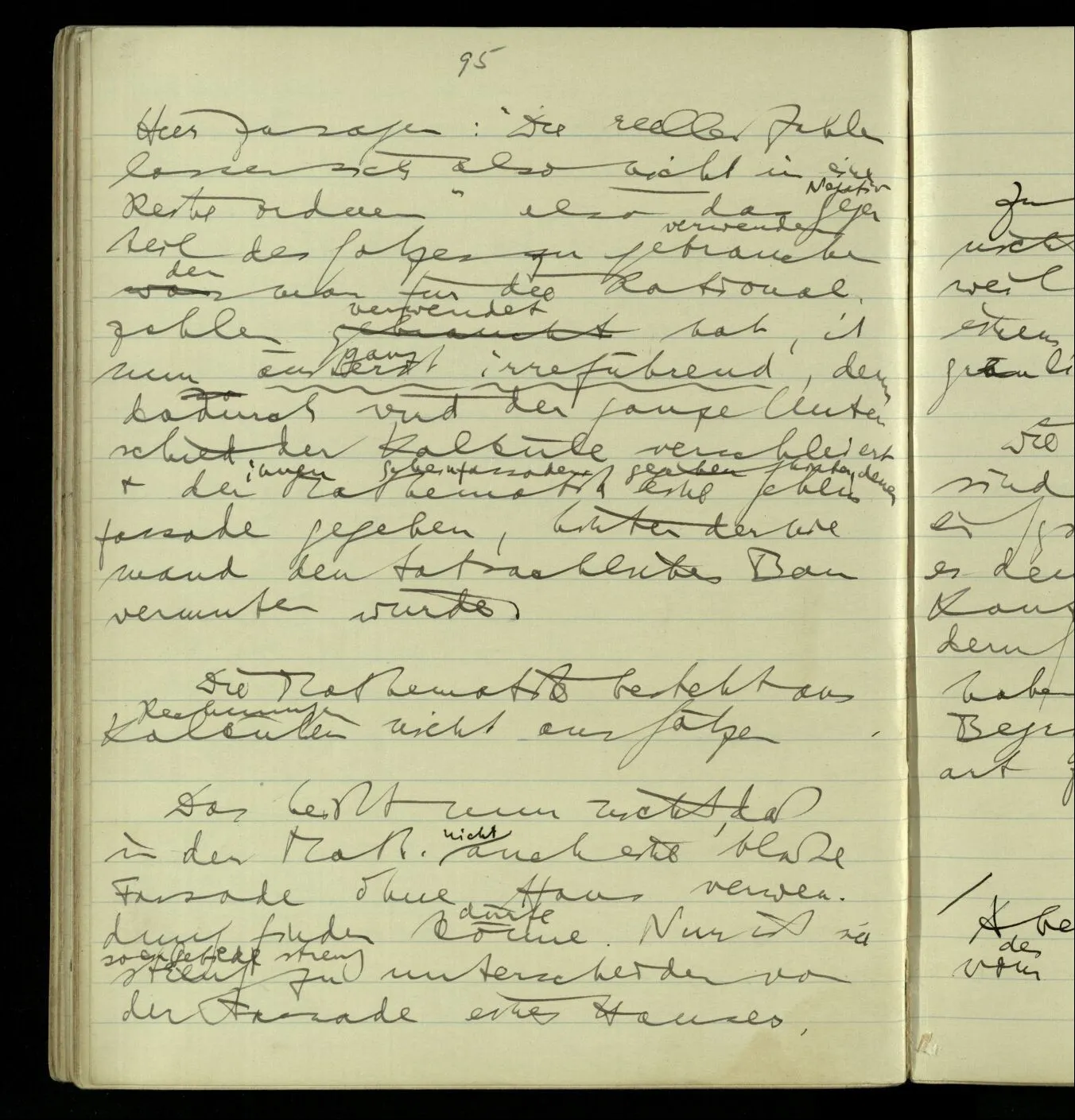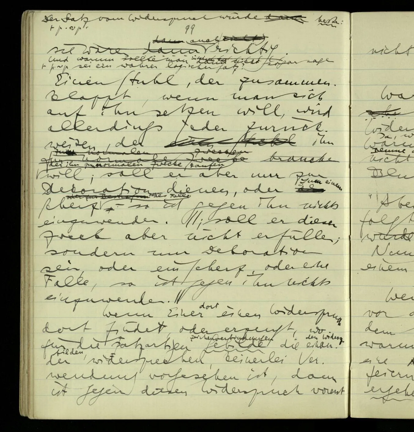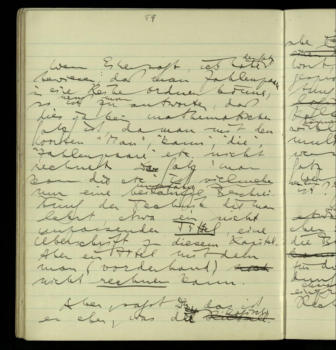 27.04.1938 “Was Du tust, sind doch lauter endliche Operationen.” – Dies ist offenbar ein verdrehtes Argument. Was hast Du Dir denn erwartet? – Nun, irgend etwas Außergewöhnliches. Worauf bist Du denn gekommen? Ich glaube: darauf, daß, was Du unter dem Gesichtspunkt des Unendlichen betrachtest, auch unter dem Gesichtspunkt des Endlichen betrachtet werden kann. Beinahe könnte man so sagen: “Warum fällst Du bei diesen Zeichen in Ekstase?”
