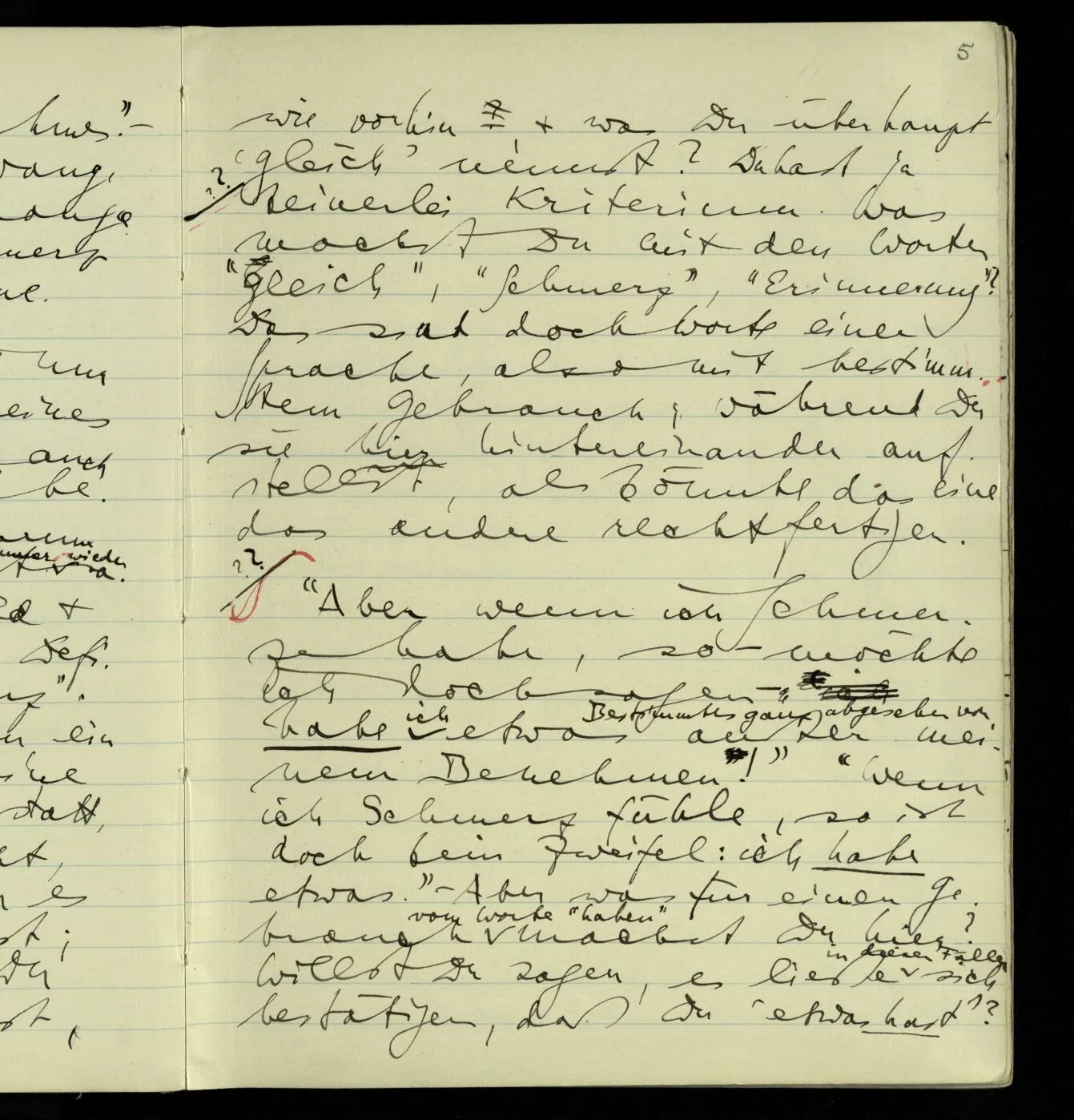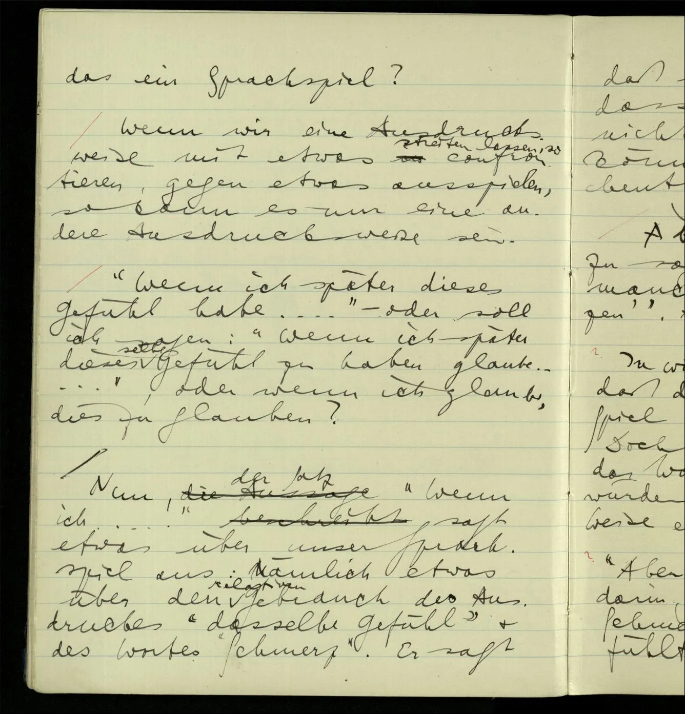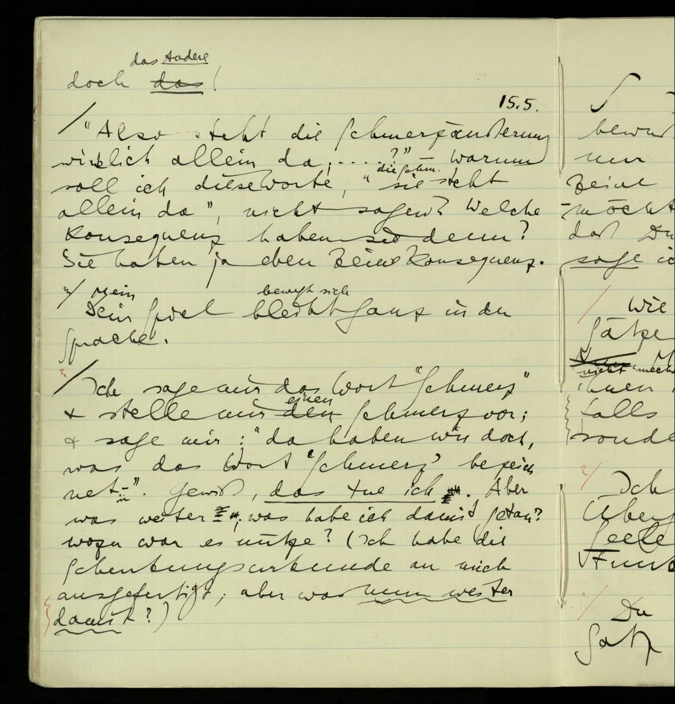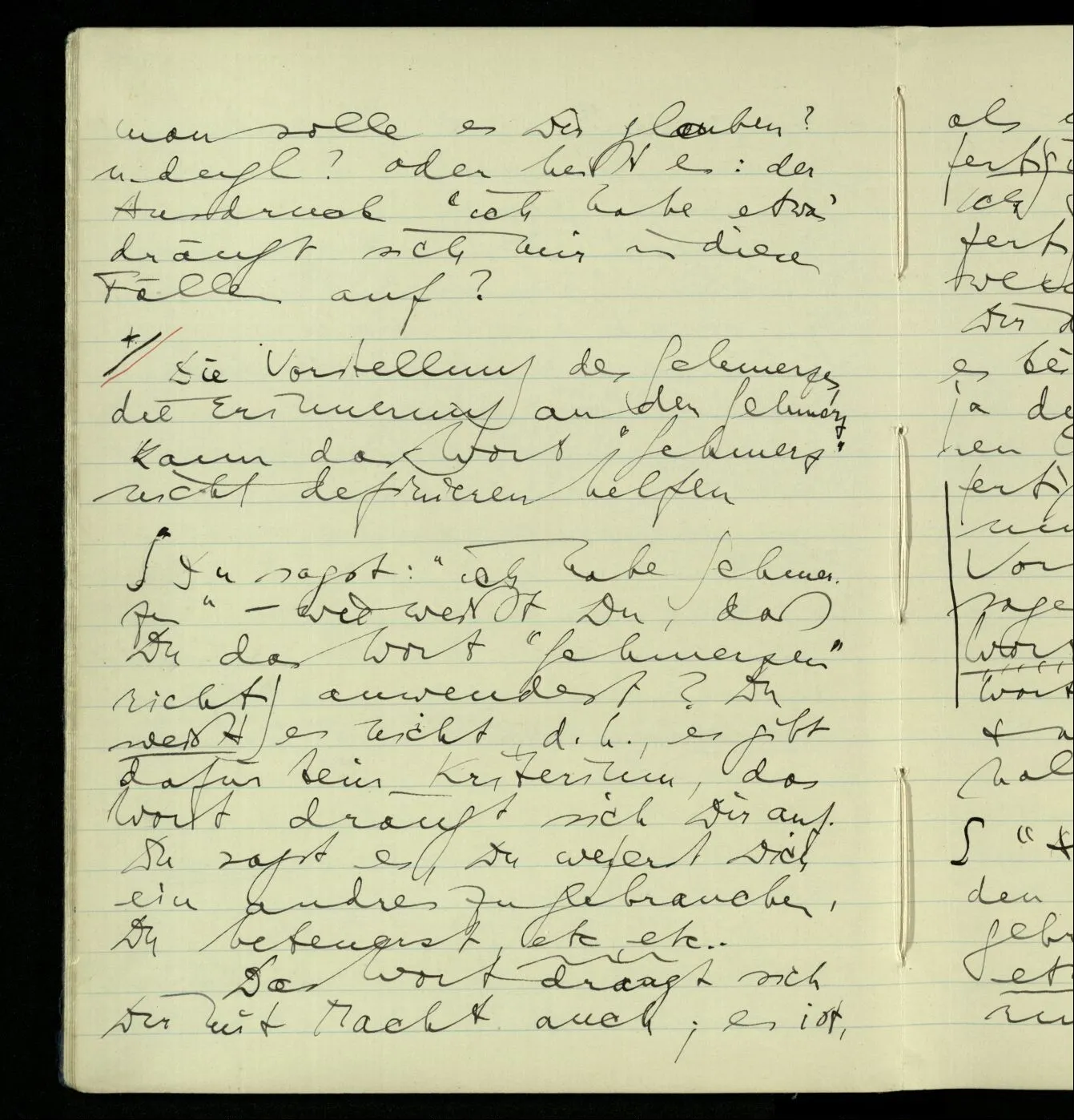 Es ist uns als schauten wir unsern Schmerz an & sagten: “Das ist doch offenbar etwas”, als läsen wir dies von der Natur des Schmerzes ab, während wir nur zu einer andern Form der Ausdrucksweise unsrer gewöhnlichen Sprache zurückkehren. Wir lesen die eine Ausdrucksform von der andern ab nicht einen Satz von einem Faktum.