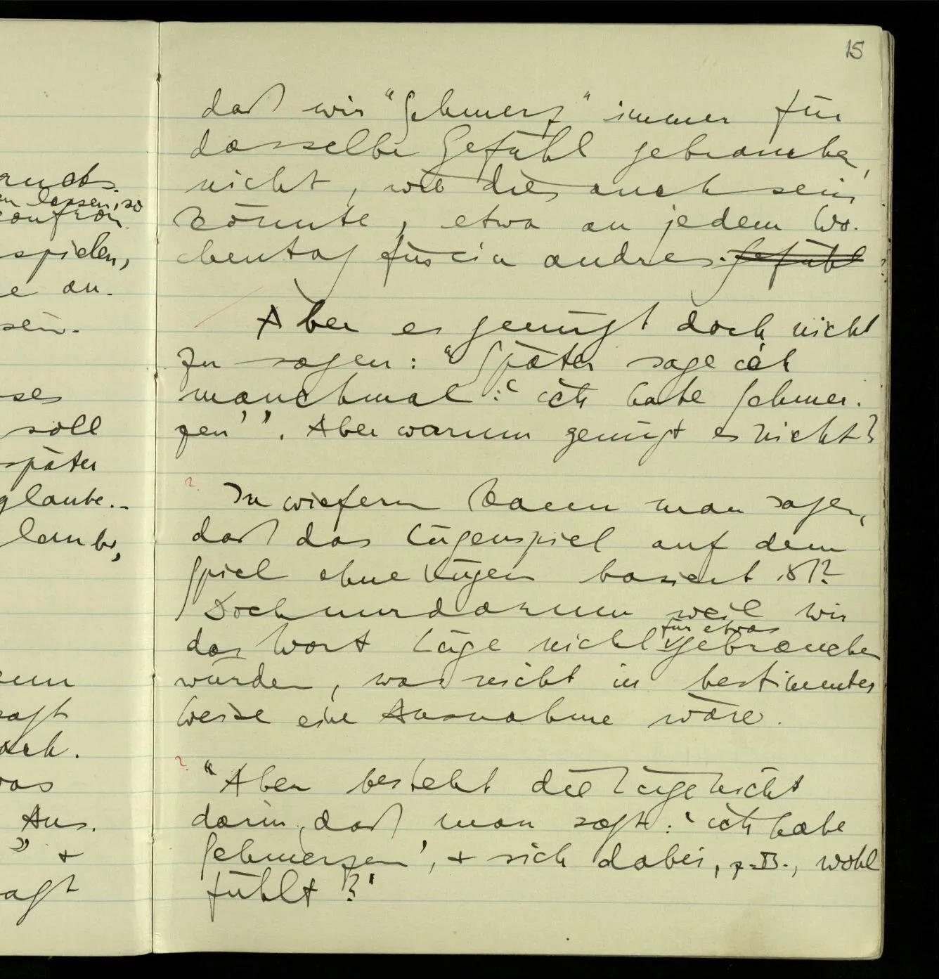 “Aber wenn ich Schmerzen habe, so – möchte ich doch sagen – habe ich etwas außer meinem Benehmen!” “Wenn ich Schmerz fühle, so ist doch kein Zweifel: ich habe etwas.” – Aber was für einen Gebrauch vom Worte “haben” machst Du hier? Willst Du sagen, es ließe in diesen Fällen sich bestätigen, daß Du ‘etwas hast’? man solle es Dir glauben? u. dergl.? oder heißt es: der Ausdruck ‘ich habe etwas’ drängt sich mir in diesen Fällen auf?