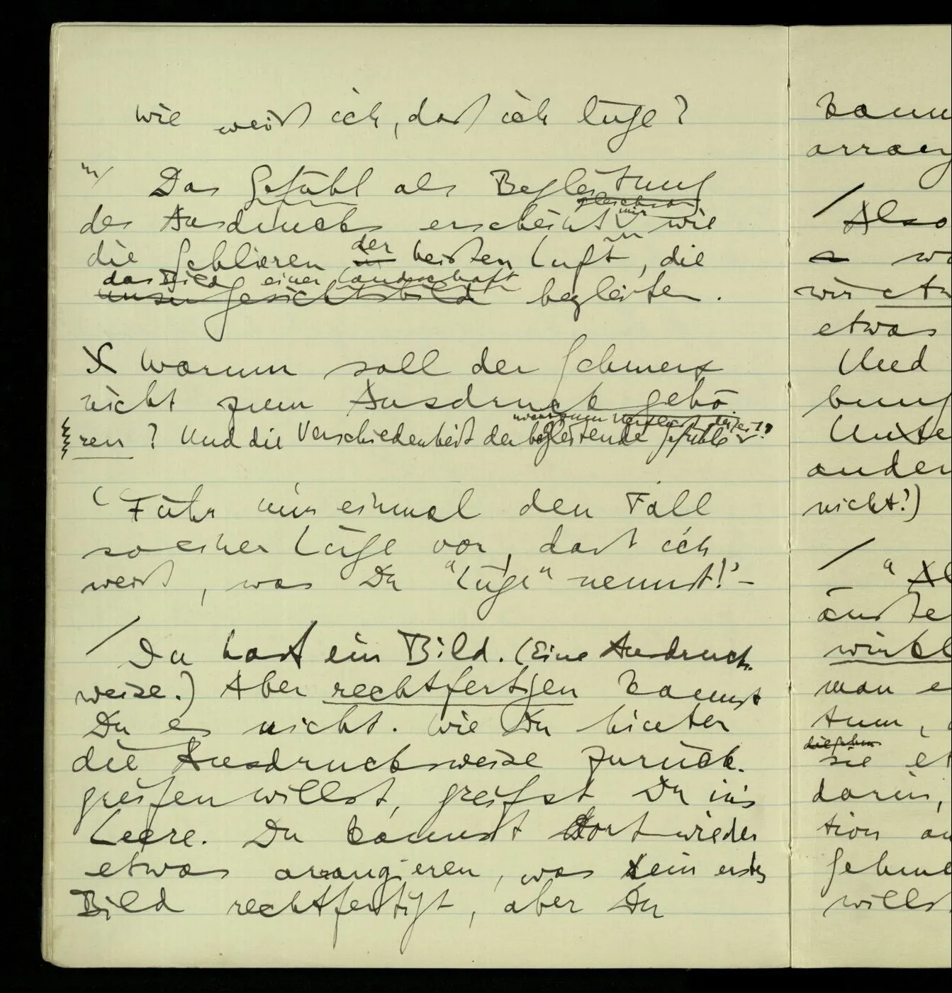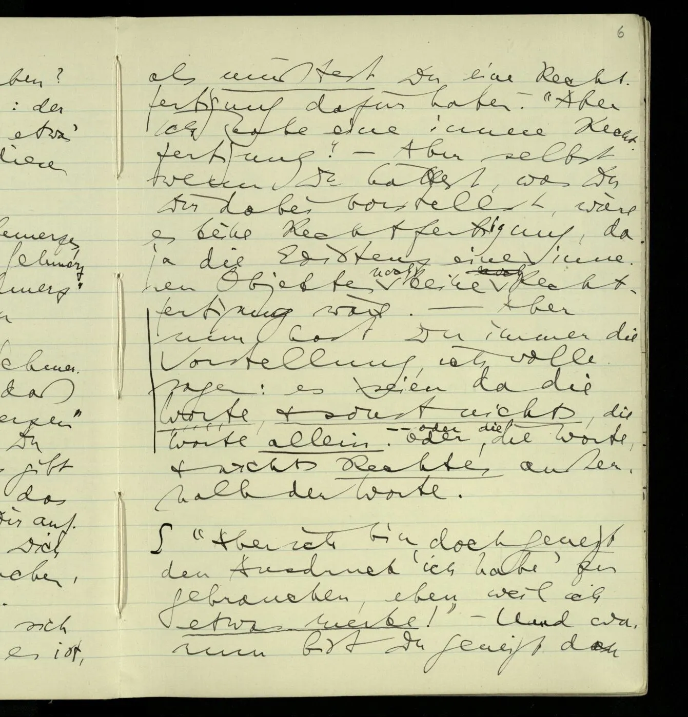 Du sagst: “ich habe Schmerzen” – wie weißt Du, daß Du das Wort “Schmerzen” richtig anwendest? Du weißt es nicht, d.h., es gibt dafür kein Kriterium, das Wort drängt sich Dir auf. Du sagst es, Du weigerst Dich ein andres zu gebrauchen, Du beteuerst, etc., etc. Das Wort drängt sich Dir mit Macht auf; es ist, als müßtest Du eine Rechtfertigung dafür haben. – “Aber ich habe eine innere Rechtfertigung.” – Aber selbst wenn Du hättest, was Du Dir dabei vorstellst, wäre es keine Rechtfertigung, da ja die Existenz eines inneren Objektes noch keine Rechtfertigung wäre. – Aber nun hast Du immer die Vorstellung, ich wolle sagen: es seien da die Worte, & sonst nichts, die Worte allein. Oder, die Worte, & nichts Rechtes außerhalb der Worte.