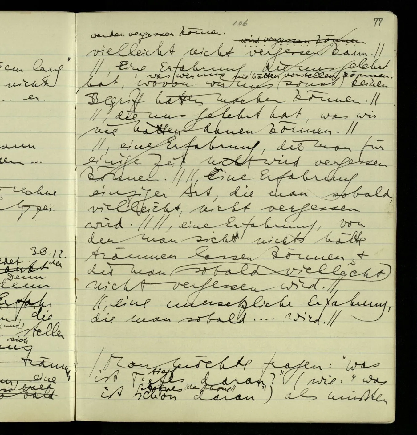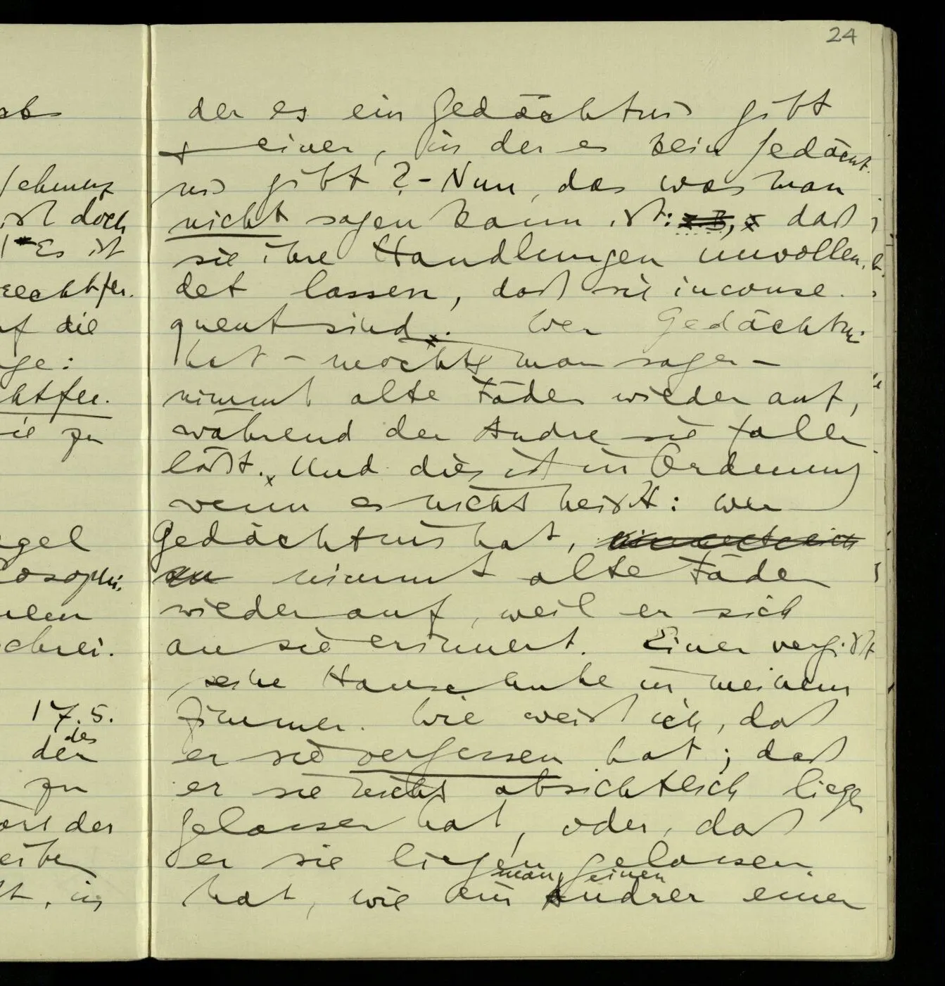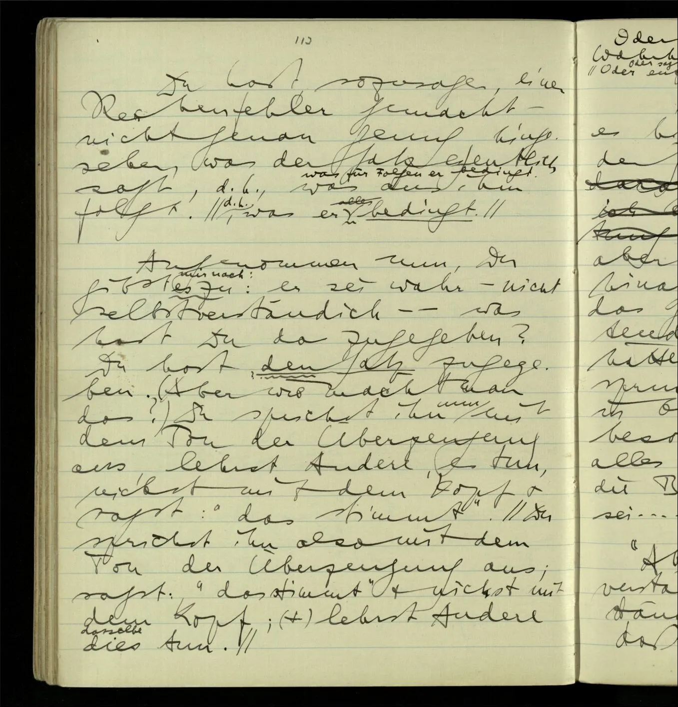 08.05.1938 Was heißt “etwas wissen”? Man bedenkt nicht, welch große Bedeutung es haben kann, sich etwas zu sagen. Weiß ich, wie ich mich in dem & dem Falle benommen habe? In einem Sinne, ja; ich war ja bei Bewußtsein; aber macht es nun keinen Unterschied wenn ich mir sage, oder gar aufschreibe, wie sich die Sache zugetragen hat?