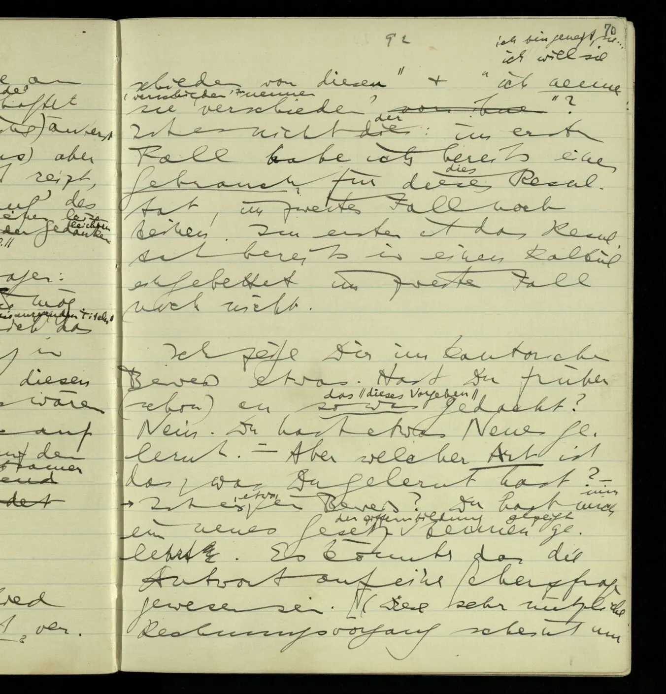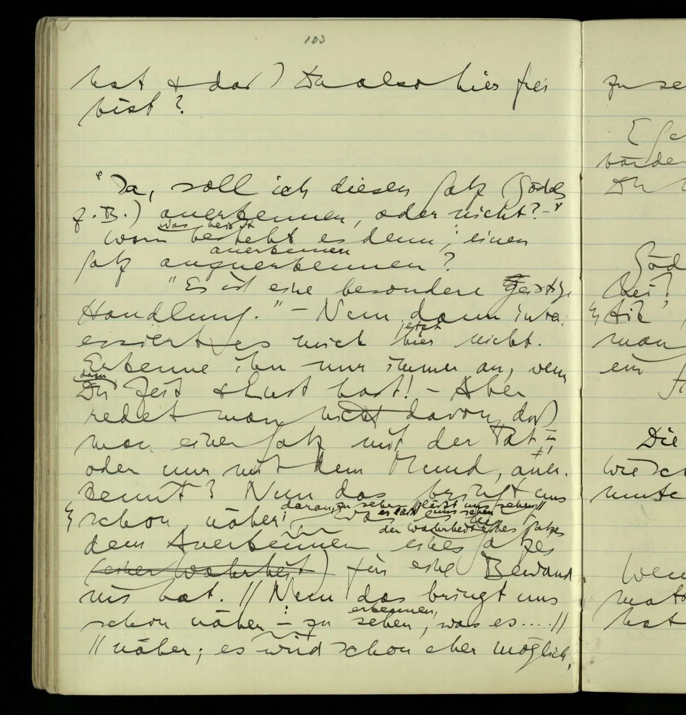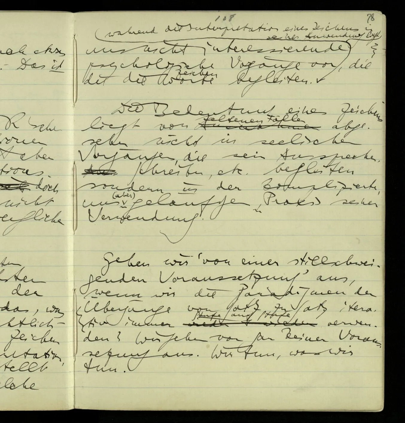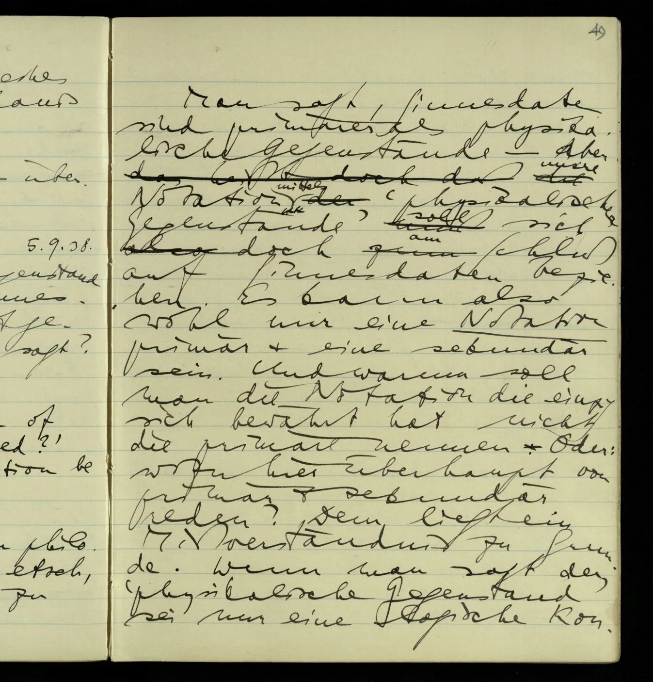 08.05.1938 Was heißt “etwas wissen”? Man bedenkt nicht, welch große Bedeutung es haben kann, sich etwas zu sagen. Weiß ich, wie ich mich in dem & dem Falle benommen habe? In einem Sinne, ja; ich war ja bei Bewußtsein; aber macht es nun keinen Unterschied wenn ich mir sage, oder gar aufschreibe, wie sich die Sache zugetragen hat?