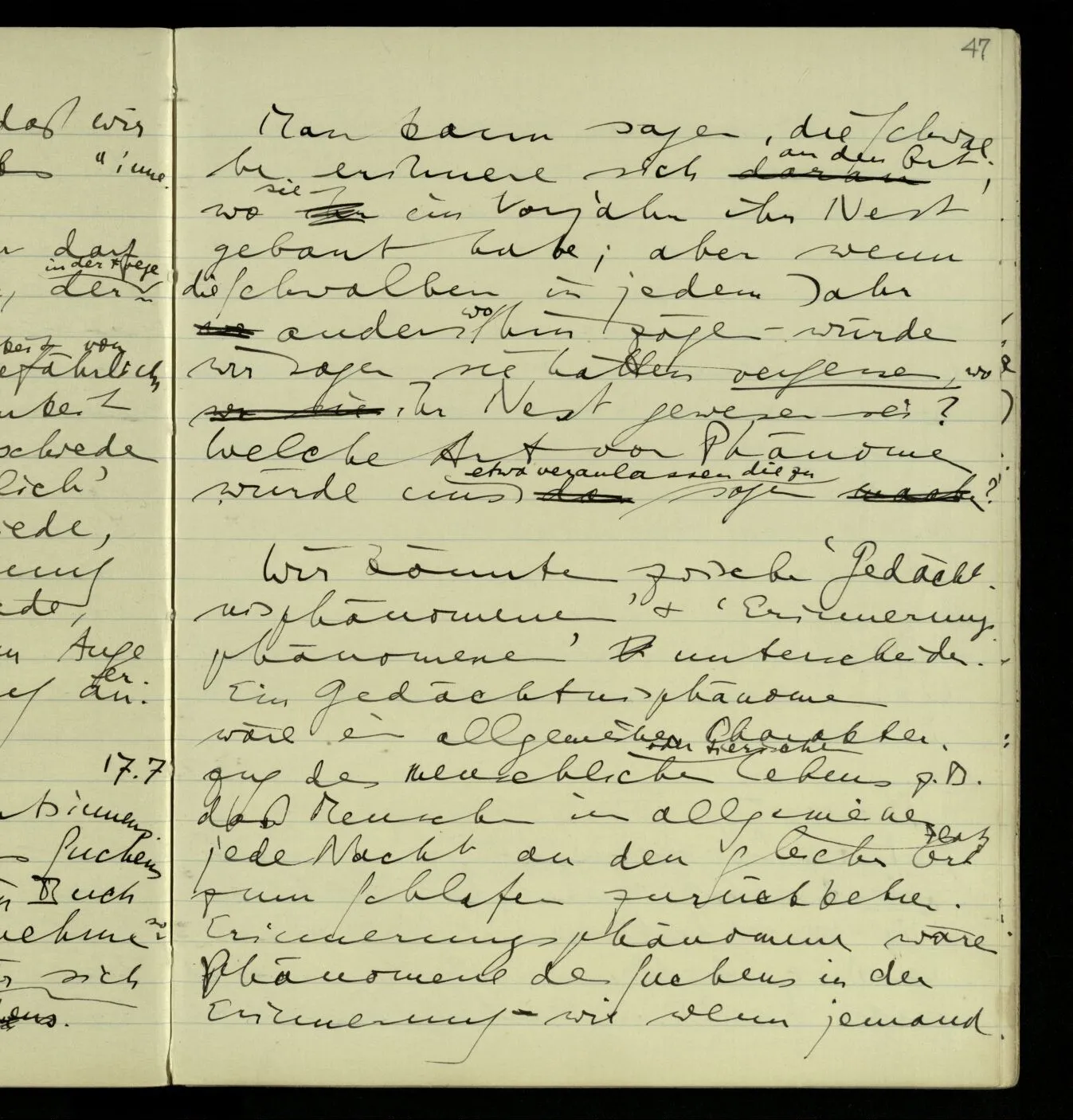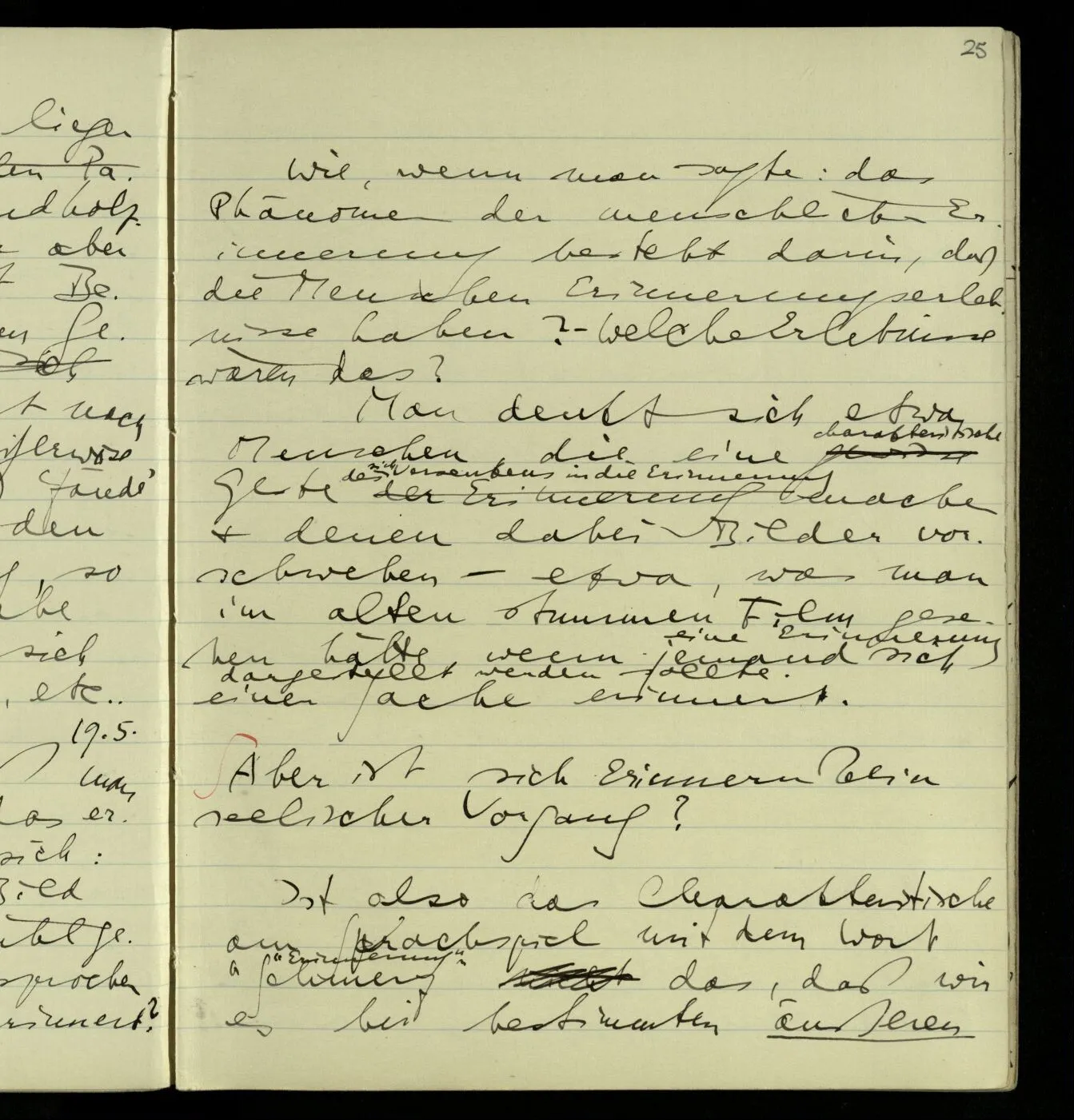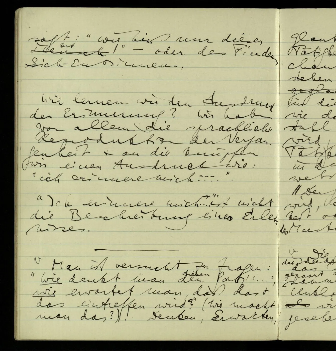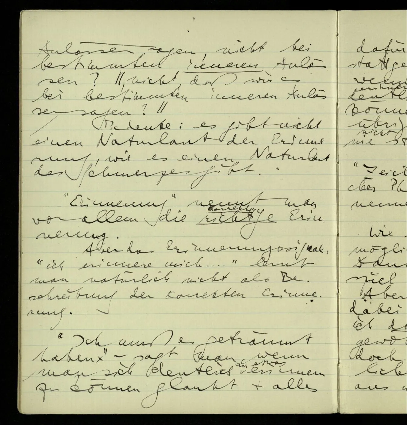 Wie sieht das Phänomen des menschlichen Erinnerns aus? Nun, es beschreibt Einer was war, als wäre es noch gegenwärtig; so sieht es wenigstens aus, wenn ein Kind die Ausdrücke der Vergangenheit lernt. Dabei macht man eine bestimmte Art von Geste oder auch Miene (Geste, Miene, Tonfall der Erinnerung). Von einem Erinnerungserlebnis ist gar keine Rede.