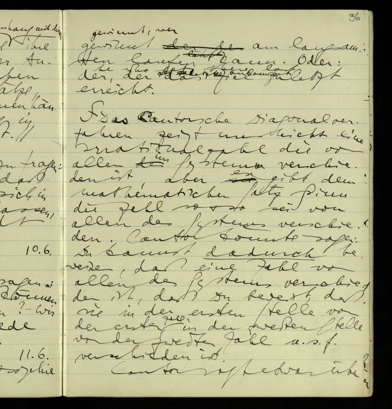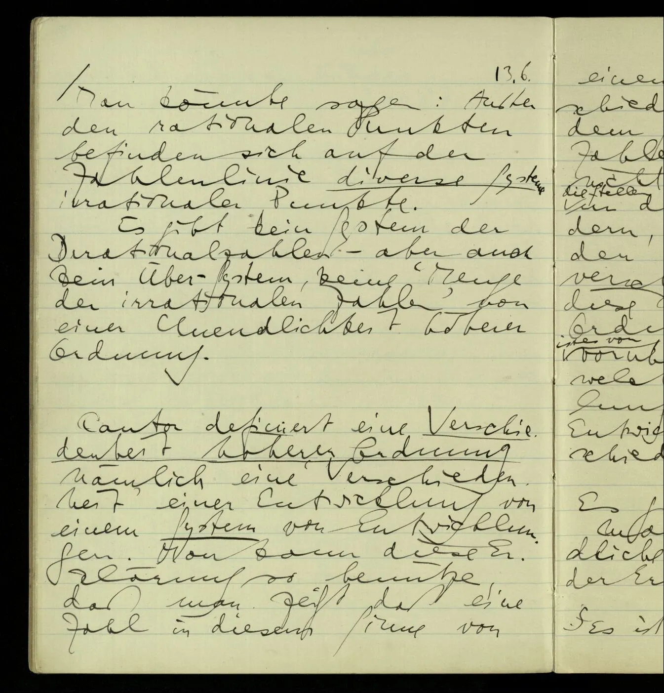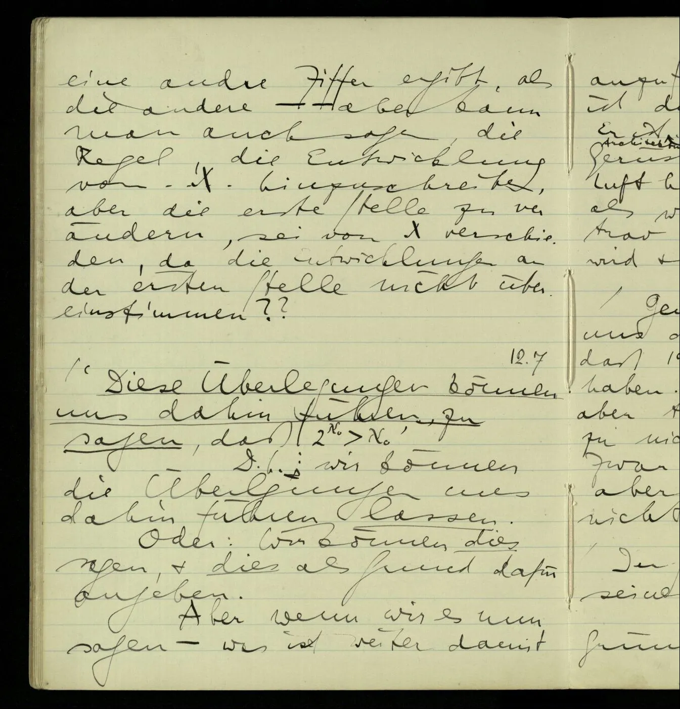 03.01.1939 Man könnte sagen, daß der Cantorsche Beweis zeige, daß man keine Vorstellung von einem System der unendlichen Dezimalbrüche habe; wie man ursprünglich annehmen möchte, wegen der Ähnlichkeit der Schreibweise mit der der Kardinalzahlen.