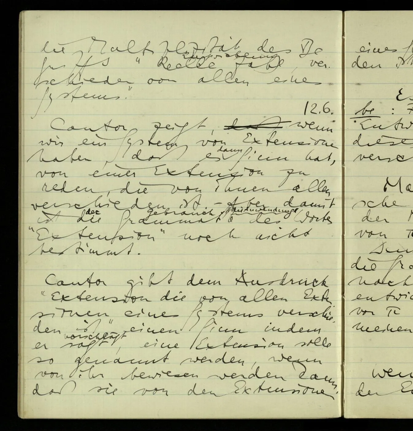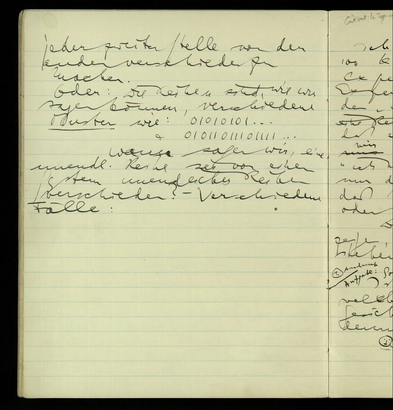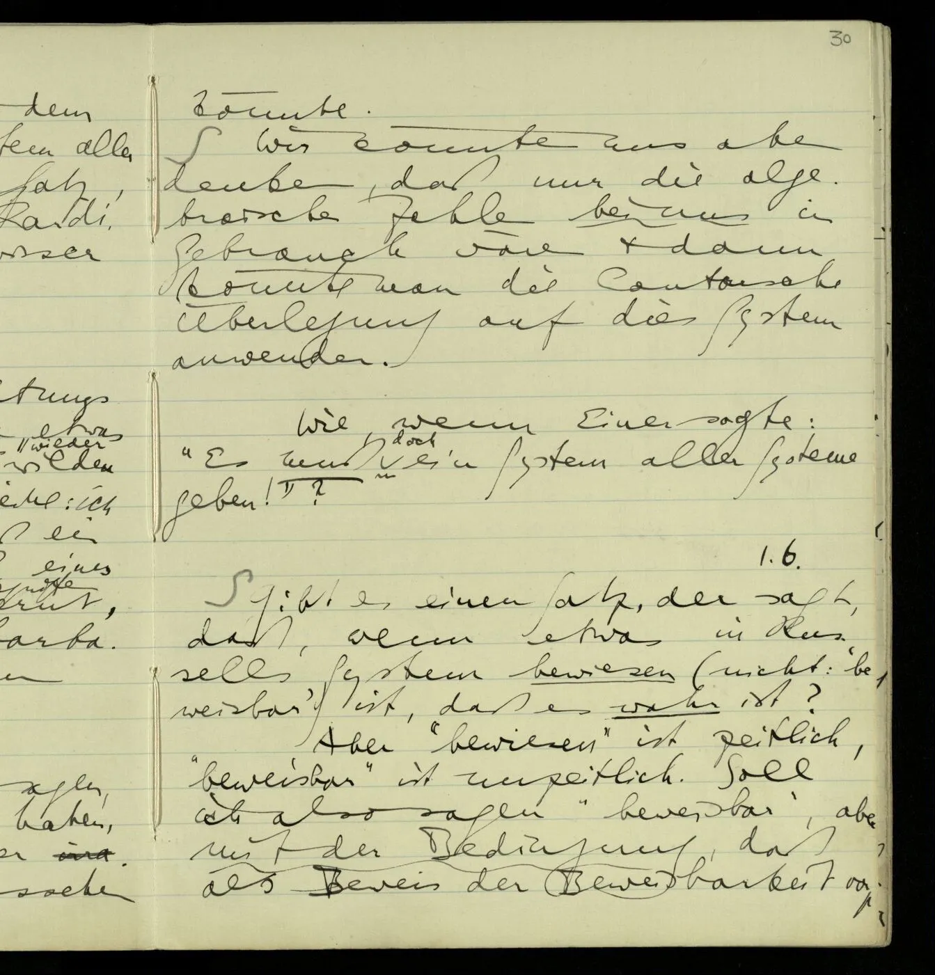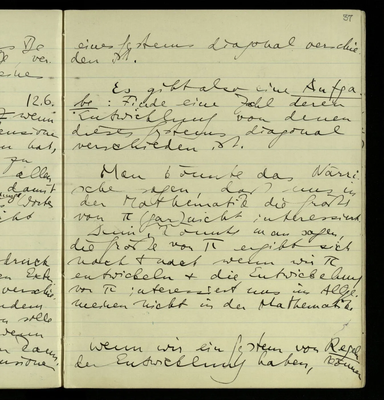 03.01.1939 Man könnte sagen, daß der Cantorsche Beweis zeige, daß man keine Vorstellung von einem System der unendlichen Dezimalbrüche habe; wie man ursprünglich annehmen möchte, wegen der Ähnlichkeit der Schreibweise mit der der Kardinalzahlen.