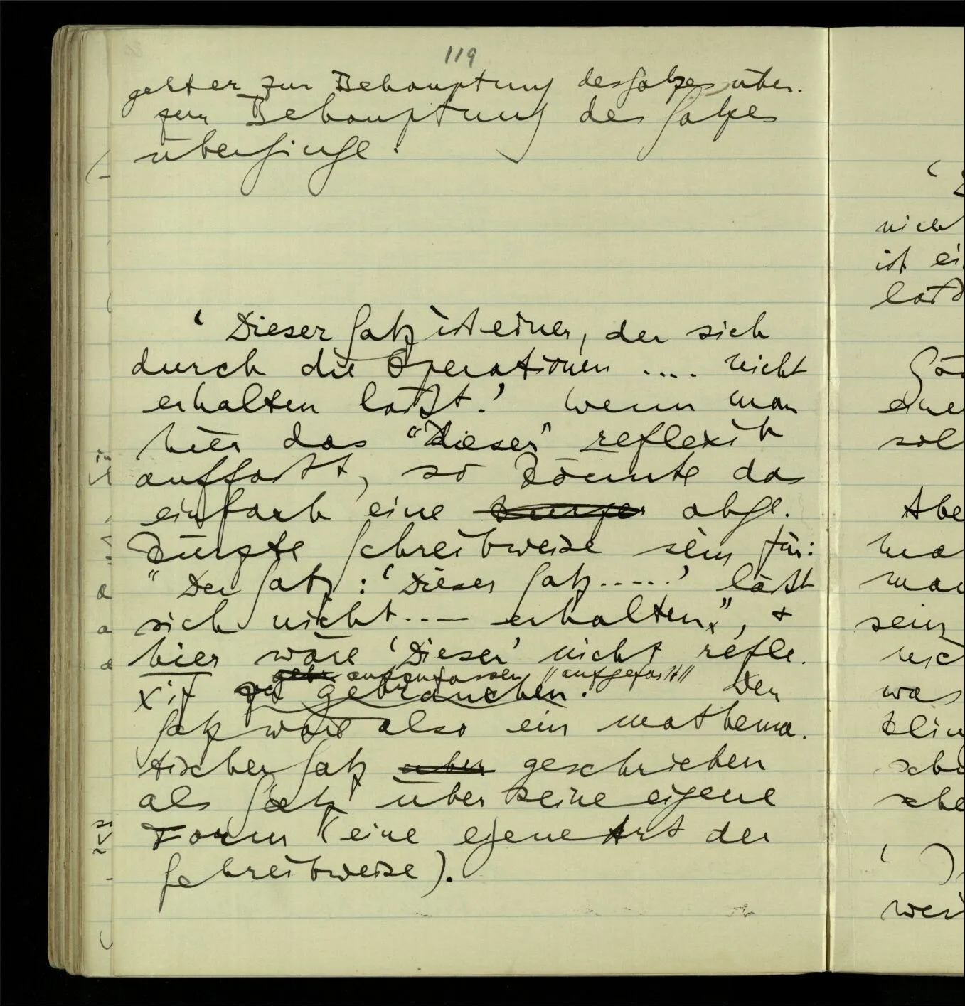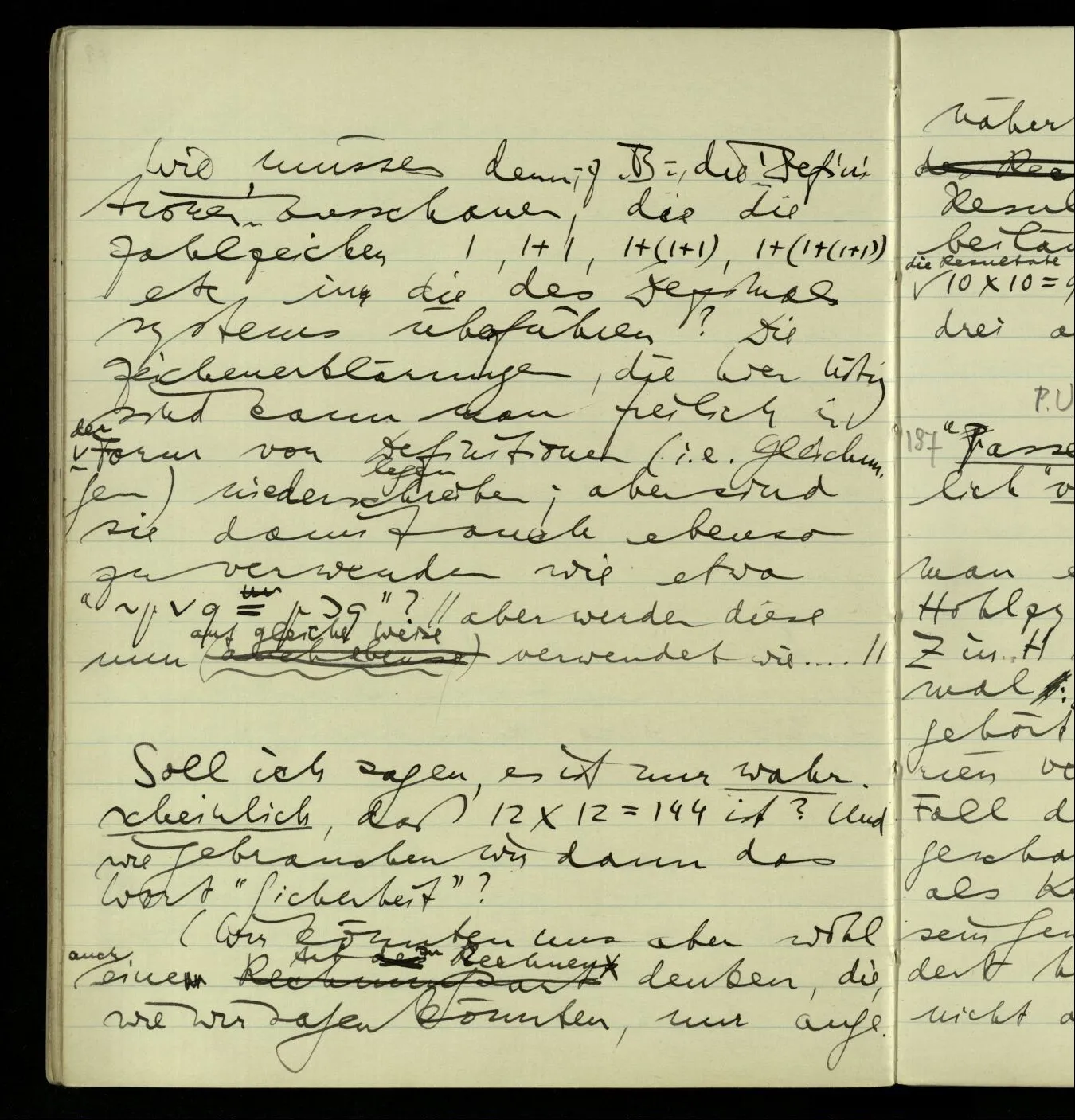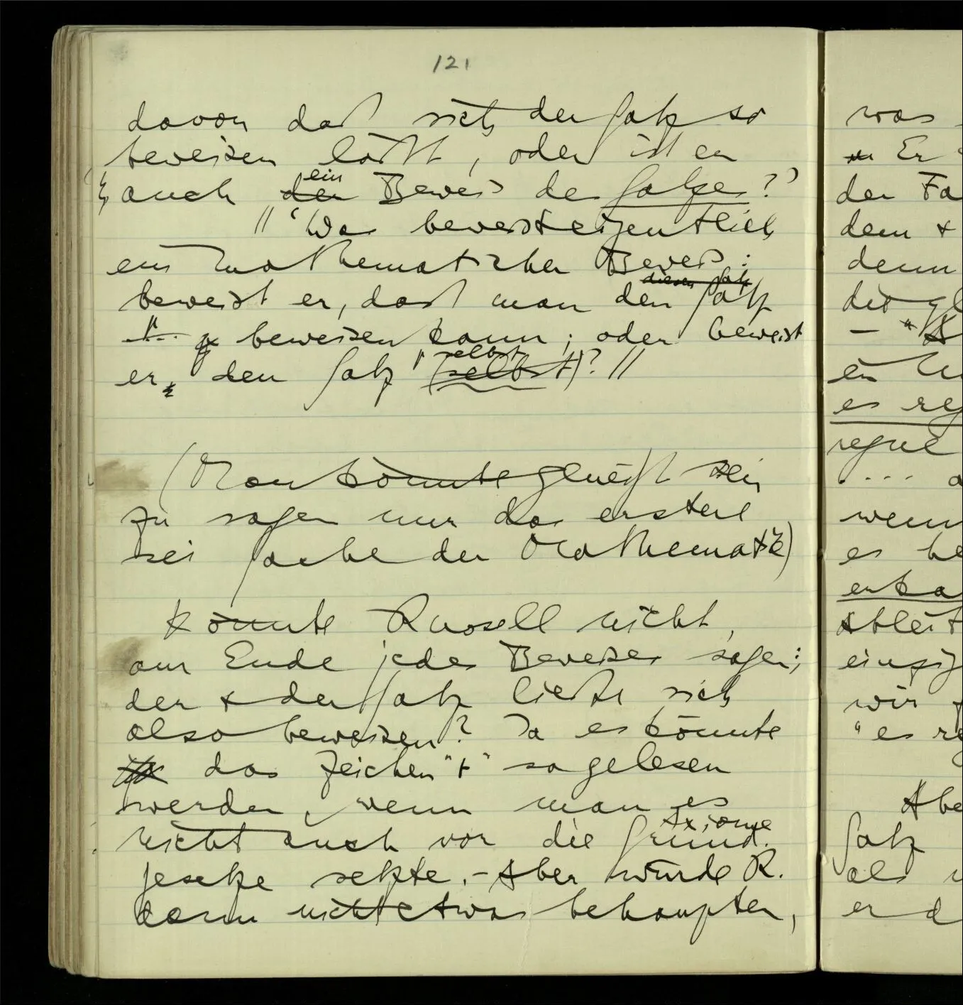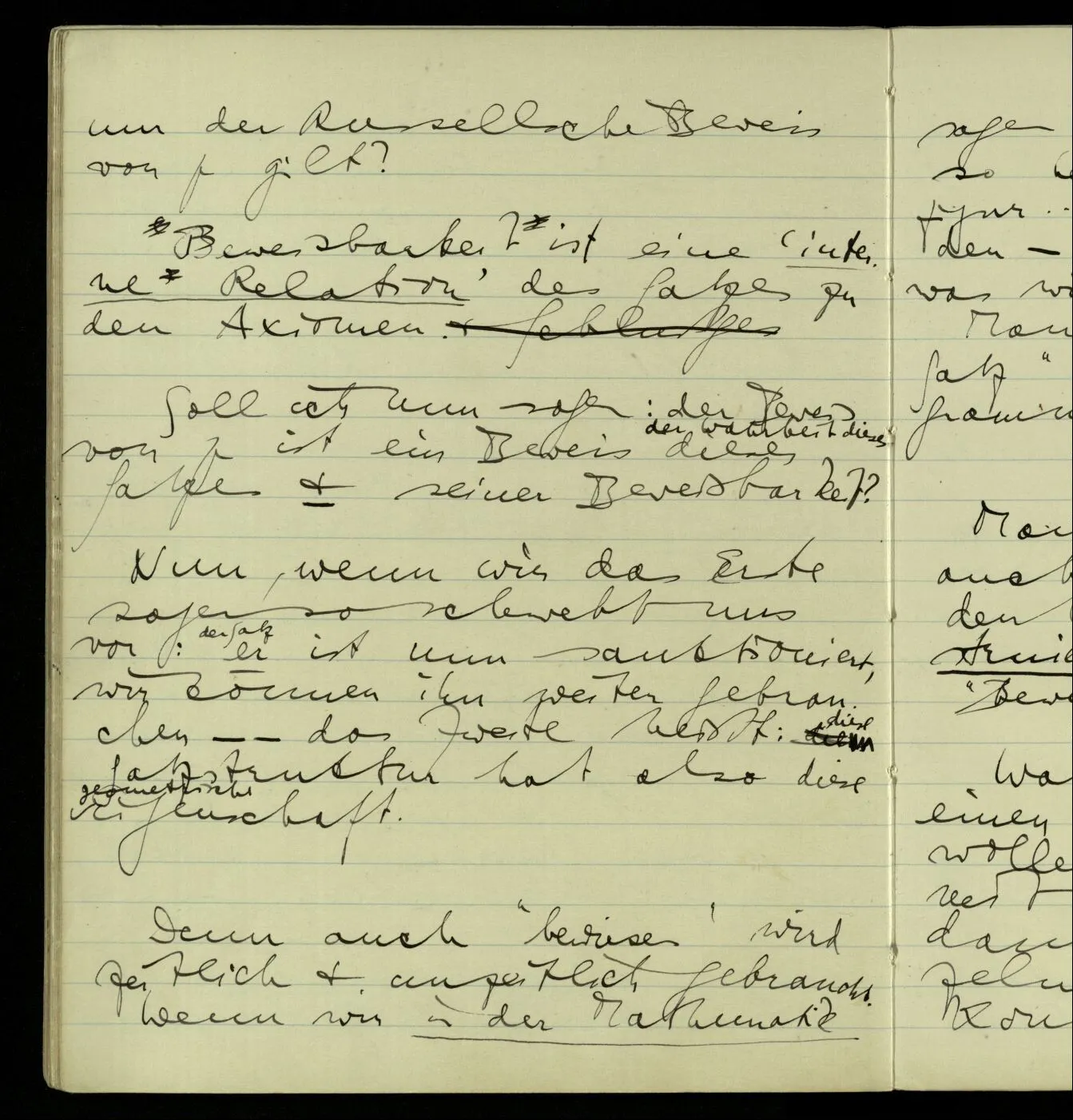 Aber wenn mir (nun) Einer mitteilt, … sei eine bei R. beweisbare Struktur – kann ich da nicht mit R’s Zustimmung folgern, daß … richtig ist? Doch; Russell könnte diesen Übergang vollziehen (ich meine, den Übergang vom Satz ‘⊢ ξ ist beweisbar’ zu ‘⊢ ξ’), aber nur unter gewissen Bedingungen: nämlich wenn ‘ξ’ bewiesen ist. Wir könnten uns ja denken, daß einer, auf Grund eines Traumes etwa, sagte: “Der Satz… ist beweisbar”; & nun zur Behauptung des Satzes überginge.