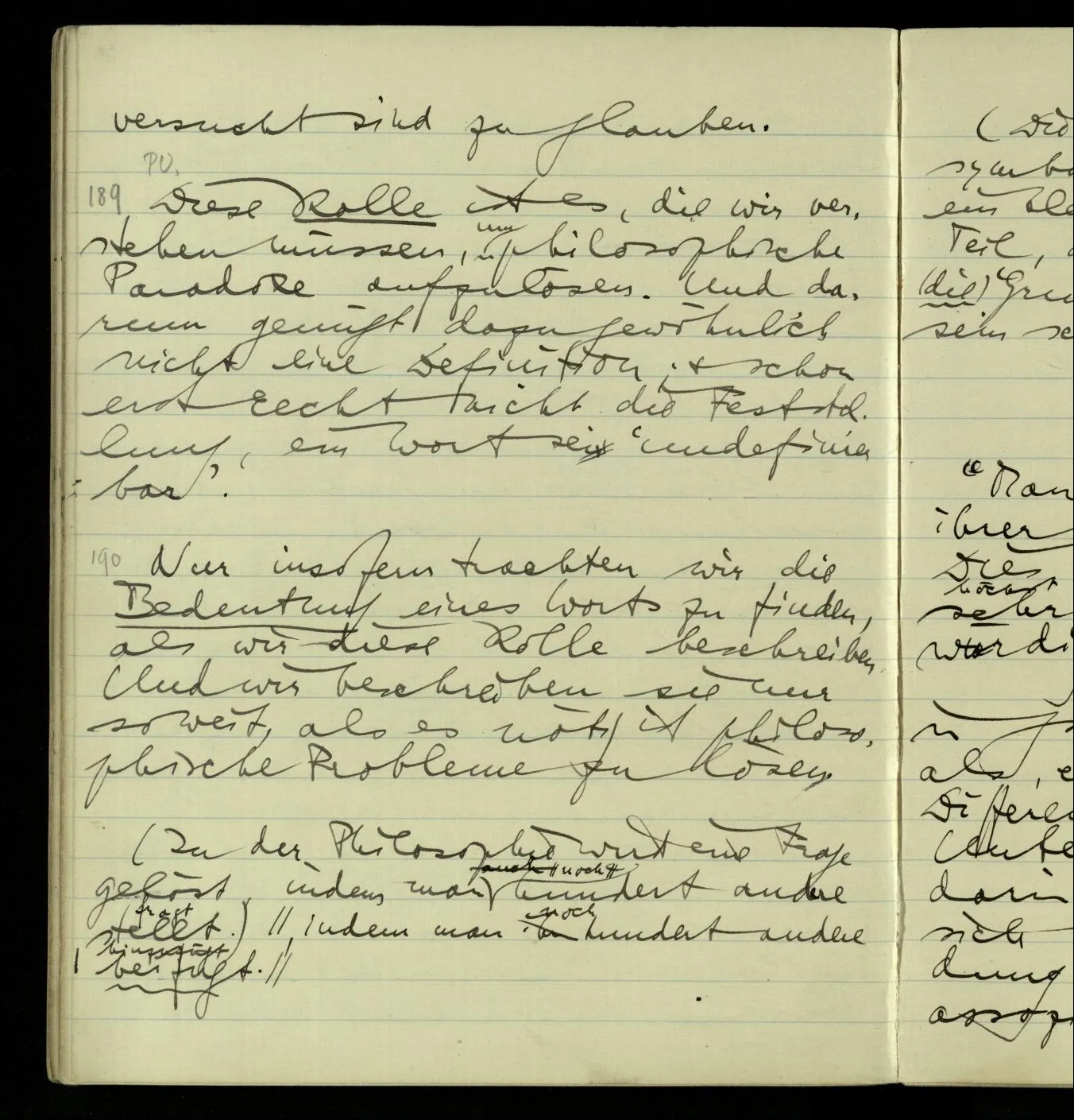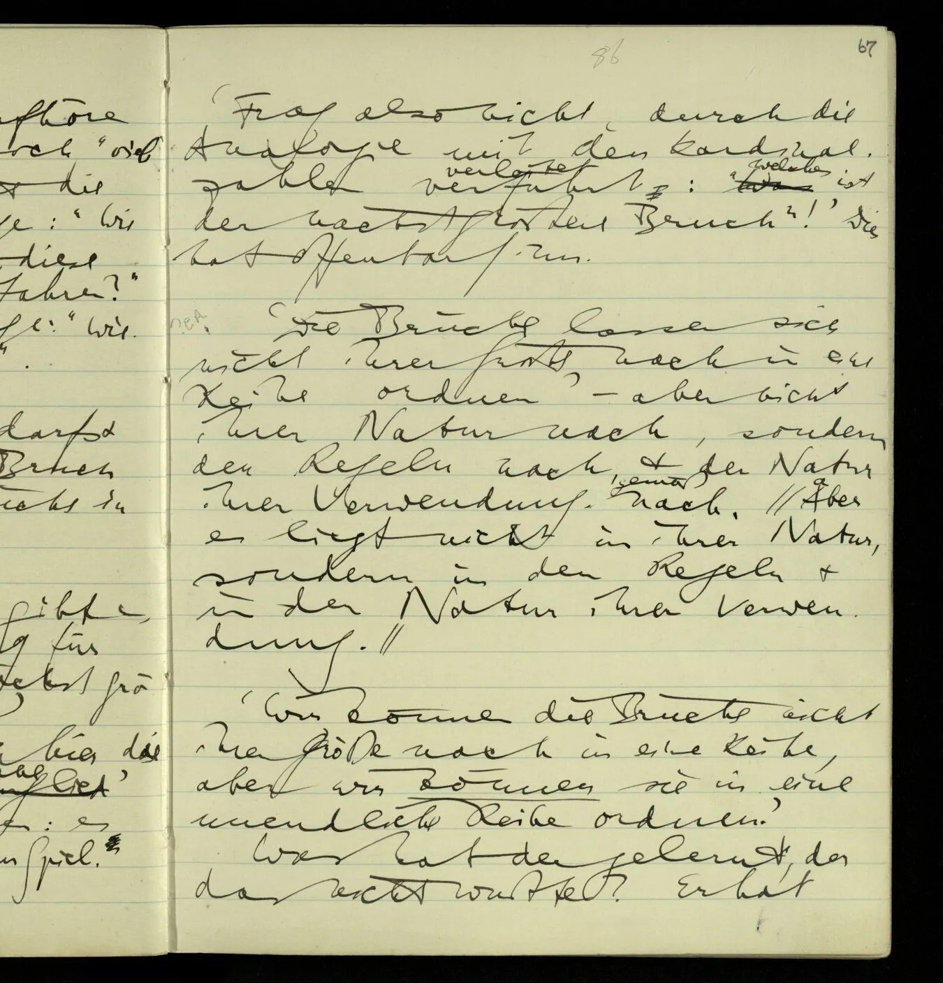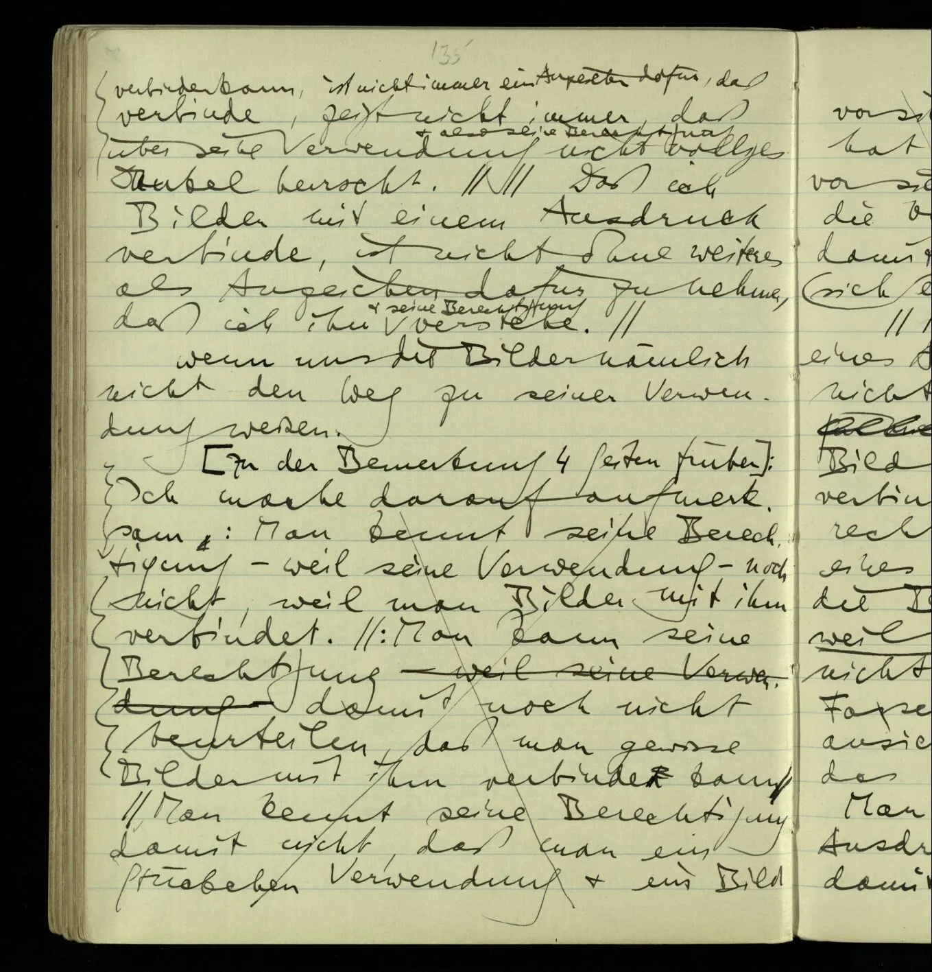 05.01.1939 “Denke Dir alle Stellen der Zahl π in einer Reihe aufgeschrieben. – – Du wirst mir doch nicht sagen, Du verstehst nicht, was ich meine!” – So gut, wie ich verstehe, was es heißt, 1000 Seelen gehen in einen cm³. Daß ich Bilder mit einem Ausdruck Bilder verbinde, ist kein Beweis dafür, daß ich über seine Verwendung nicht völlig im Unklaren bin oder seine Berechtigung beurteilen kann. wenn uns die Bilder nämlich nicht den Weg zu seiner Verwendung weisen. [→ [Zu der Bemerkung 4 Seiten früher]]: Ich mache darauf aufmerksam: Man kennt seine Berechtigung – weil seine Verwendung – noch nicht, weil man Bilder mit ihm verbindet.