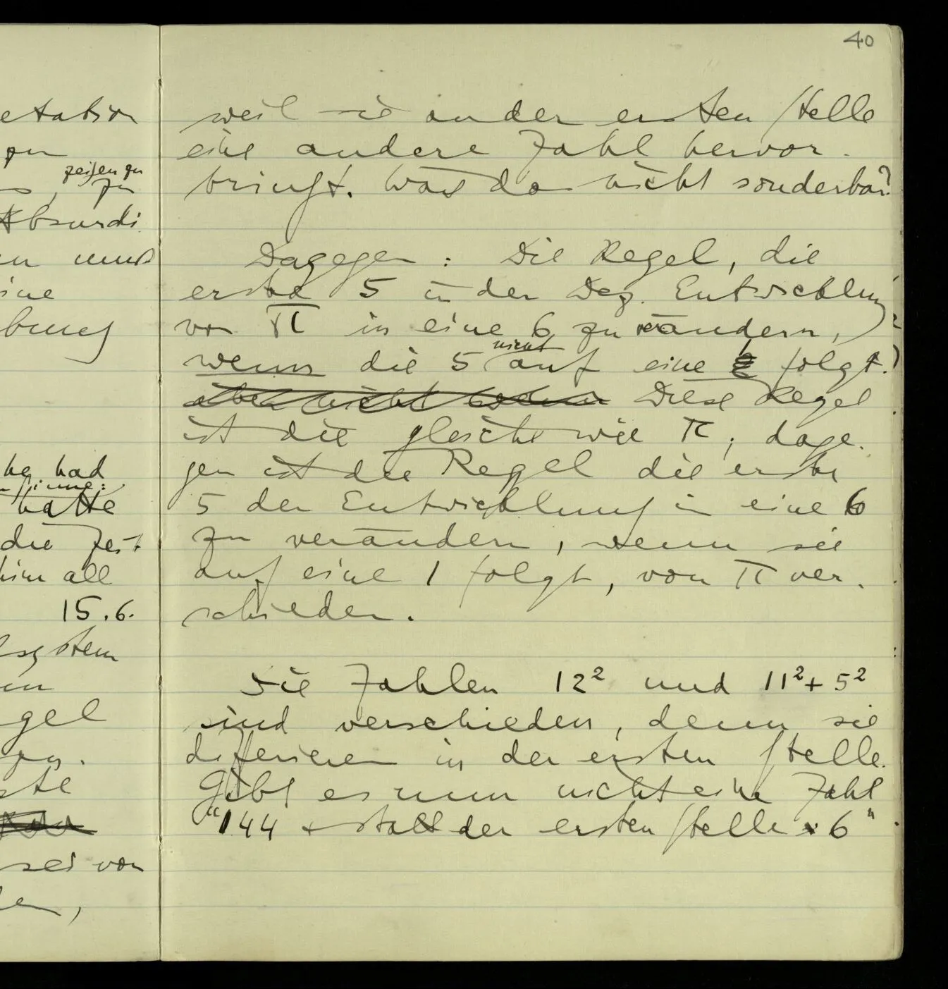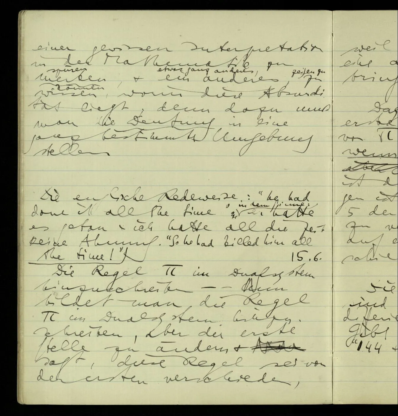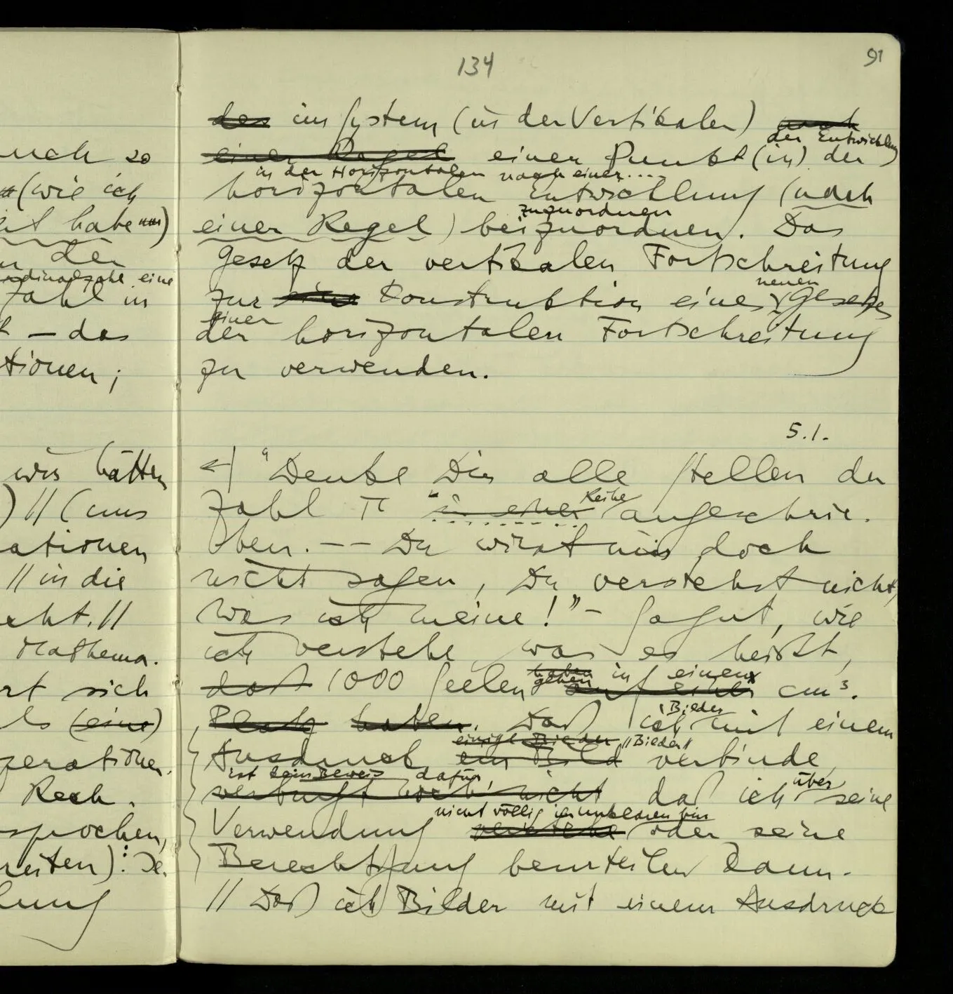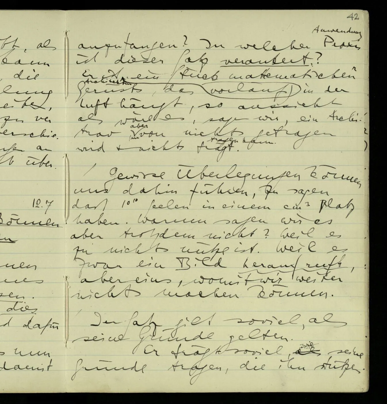 05.01.1939 “Denke Dir alle Stellen der Zahl π in einer Reihe aufgeschrieben. – – Du wirst mir doch nicht sagen, Du verstehst nicht, was ich meine!” – So gut, wie ich verstehe, was es heißt, 1000 Seelen gehen in einen cm³. Daß ich Bilder mit einem Ausdruck Bilder verbinde, ist kein Beweis dafür, daß ich über seine Verwendung nicht völlig im Unklaren bin oder seine Berechtigung beurteilen kann. wenn uns die Bilder nämlich nicht den Weg zu seiner Verwendung weisen. [→ [Zu der Bemerkung 4 Seiten früher]]: Ich mache darauf aufmerksam: Man kennt seine Berechtigung – weil seine Verwendung – noch nicht, weil man Bilder mit ihm verbindet.