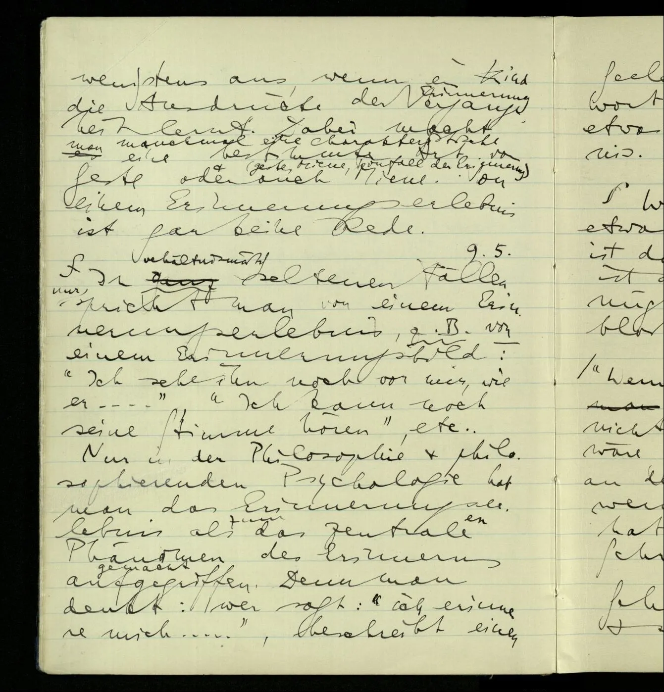 09.05.1938 In verhältnismäßig seltenen Fällen nur, spricht man von einem Erinnerungserlebnis, z.B. von einem Erinnerungsbild: “Ich sehe ihn noch vor mir, wie er …”, “Ich kann noch seine Stimme hören”, etc.. Nur in der Philosophie & philosophierenden Psychologie hat man das Erinnerungserlebnis als das zentrale Phänomen des Erinnerns aufgegriffen. Denn man denkt: wer sagt: “ich erinnere mich …”, beschreibt einen Seelenzustand, & bei diesem Wort denkt man an so etwas wie ein Vorstellungserlebnis.