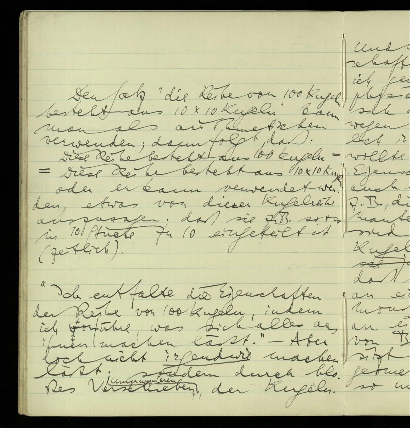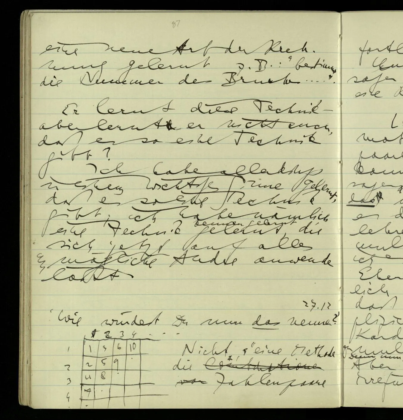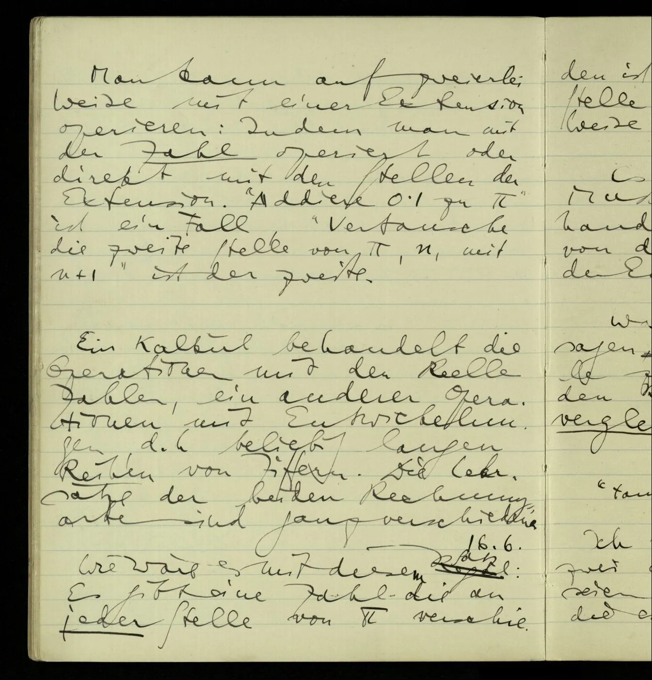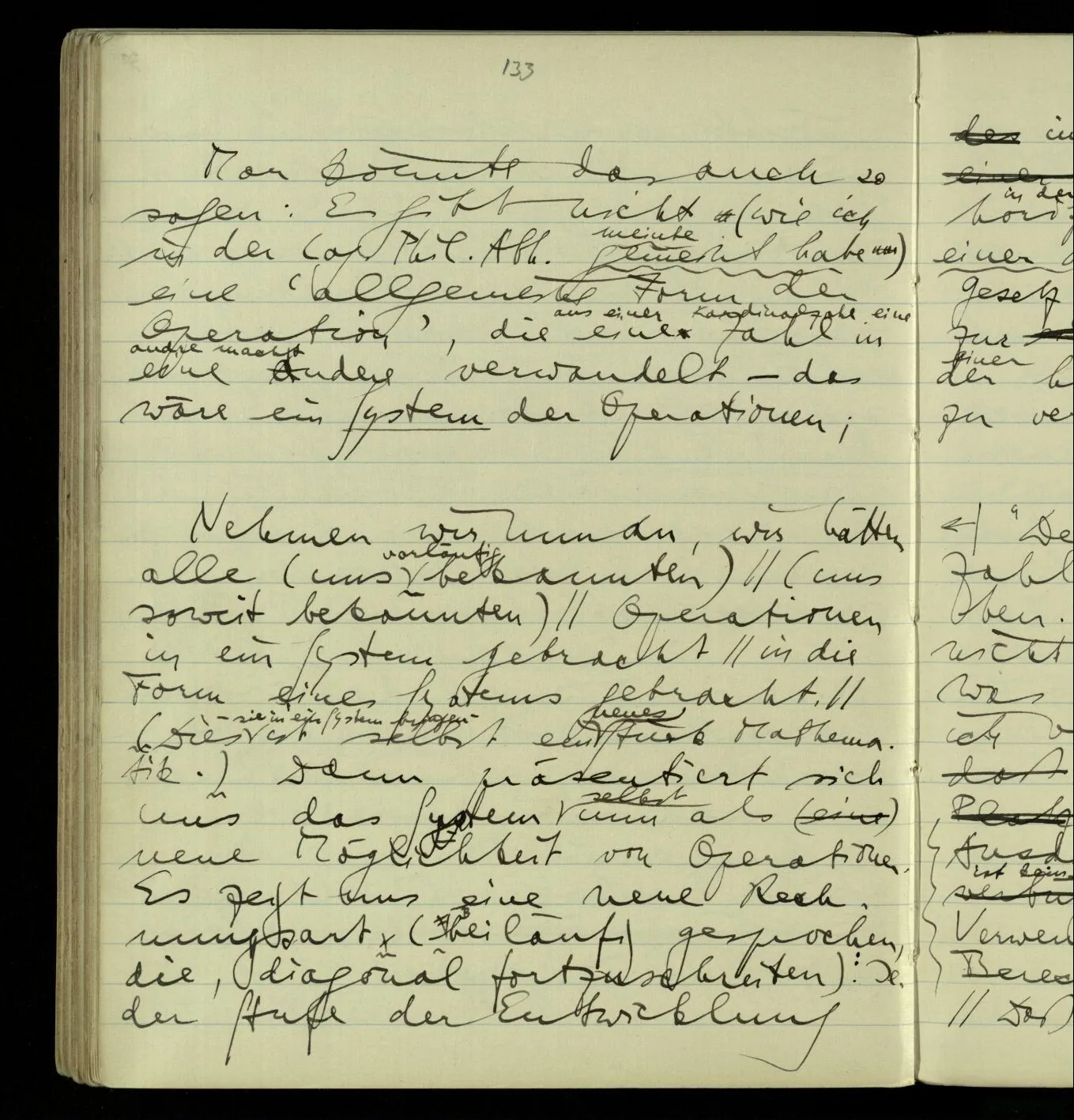 Nehmen wir nun an, wir hätten alle (uns vorläufig bekannten) Operationen in ein System gebracht (Dies – sie in ein System bringen – ist selbst ein neues Stück Mathematik.) Dann präsentiert sich uns das System selbst nun als neue Möglichkeit von Operationen. Es zeigt uns eine neue Rechnungsart. Beiläufig gesprochen, die, diagonal fortzuschreiten. Jeder Stufe der Entwicklung im System (in der Vertikalen) einem Punkt (in) der horizontalen Entwicklung (nach einer Regel) beizuordnen. Das Gesetz der vertikalen Fortschreitung zur Konstruktion eines neuen Gesetzes der horizontalen Fortschreitung zu verwenden.
