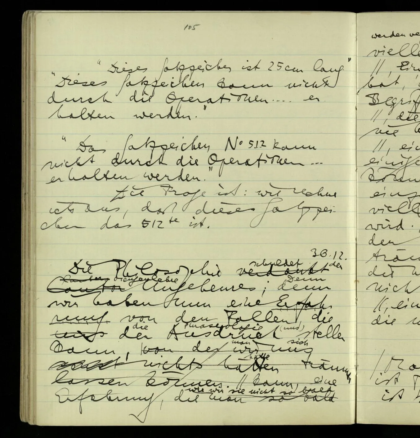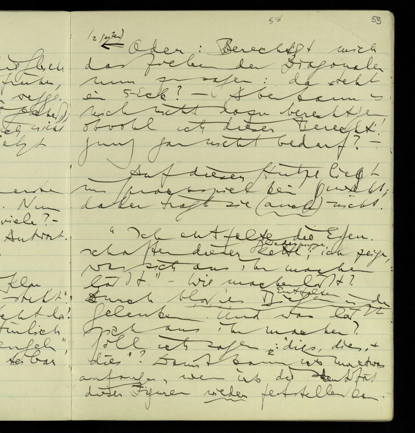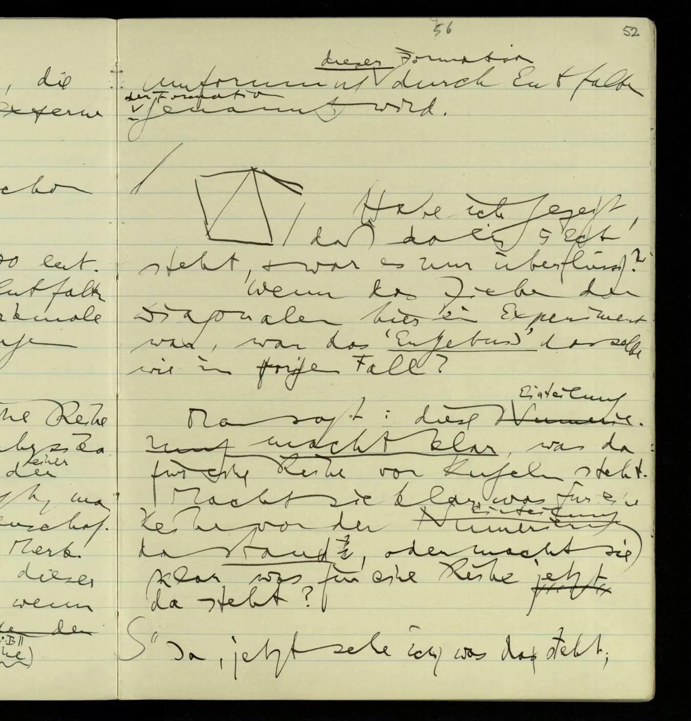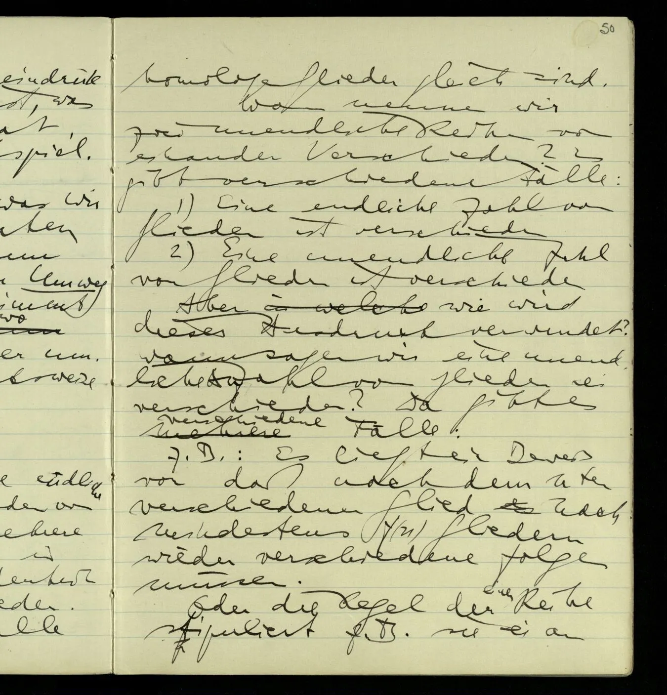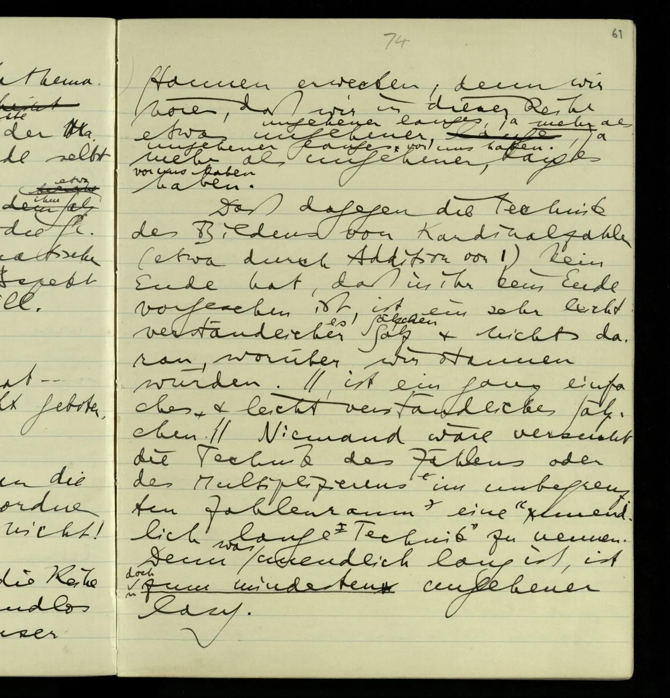 Nehmen wir nun an, wir hätten alle (uns vorläufig bekannten) Operationen in ein System gebracht (Dies – sie in ein System bringen – ist selbst ein neues Stück Mathematik.) Dann präsentiert sich uns das System selbst nun als neue Möglichkeit von Operationen. Es zeigt uns eine neue Rechnungsart. Beiläufig gesprochen, die, diagonal fortzuschreiten. Jeder Stufe der Entwicklung im System (in der Vertikalen) einem Punkt (in) der horizontalen Entwicklung (nach einer Regel) beizuordnen. Das Gesetz der vertikalen Fortschreitung zur Konstruktion eines neuen Gesetzes der horizontalen Fortschreitung zu verwenden.