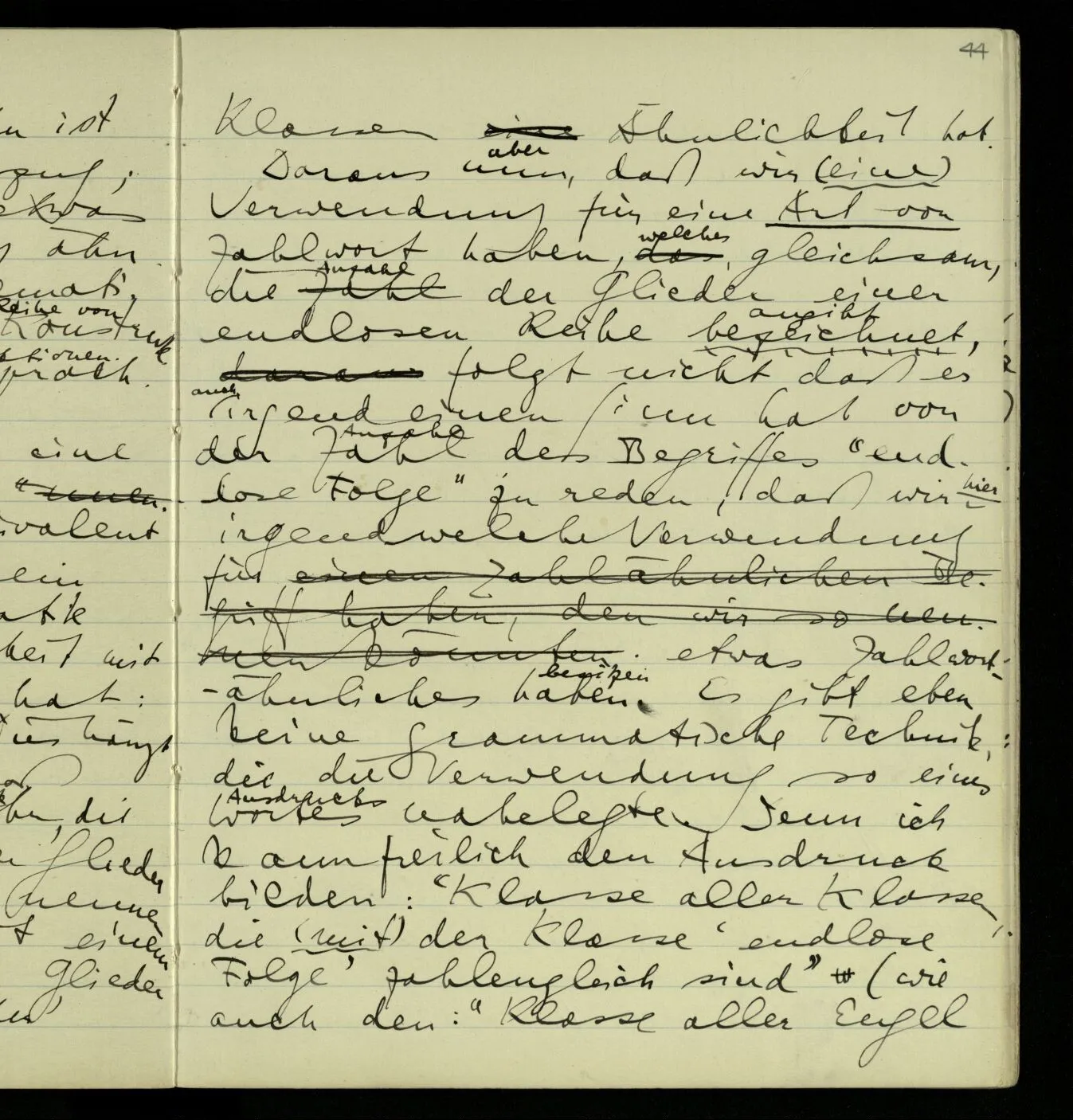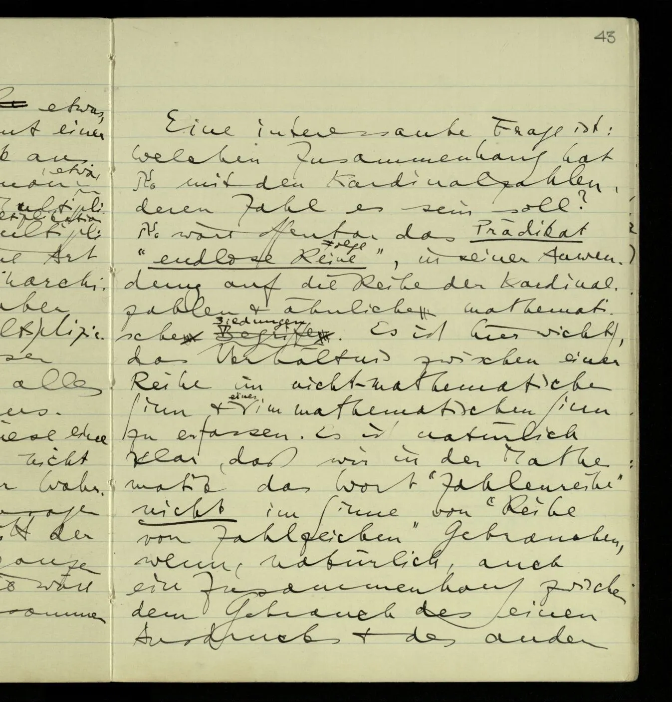 “Nun, ich spreche z.B. von der Zahl der Kardinalzahlen, & die ist doch unendlich.” Wir bilden den Ausdruck “Anzahl der Kardinalzahlen” & wir neigen dazu uns darunter etwas wie eine ungeheure Zahl vorzustellen.